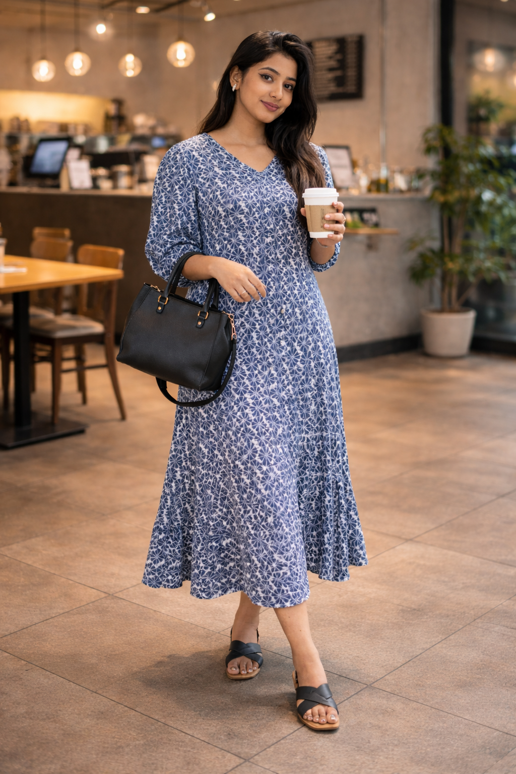 Casual and comfortable hand block printed midi dress with 3/4 sleeves and side pockets. Material:...