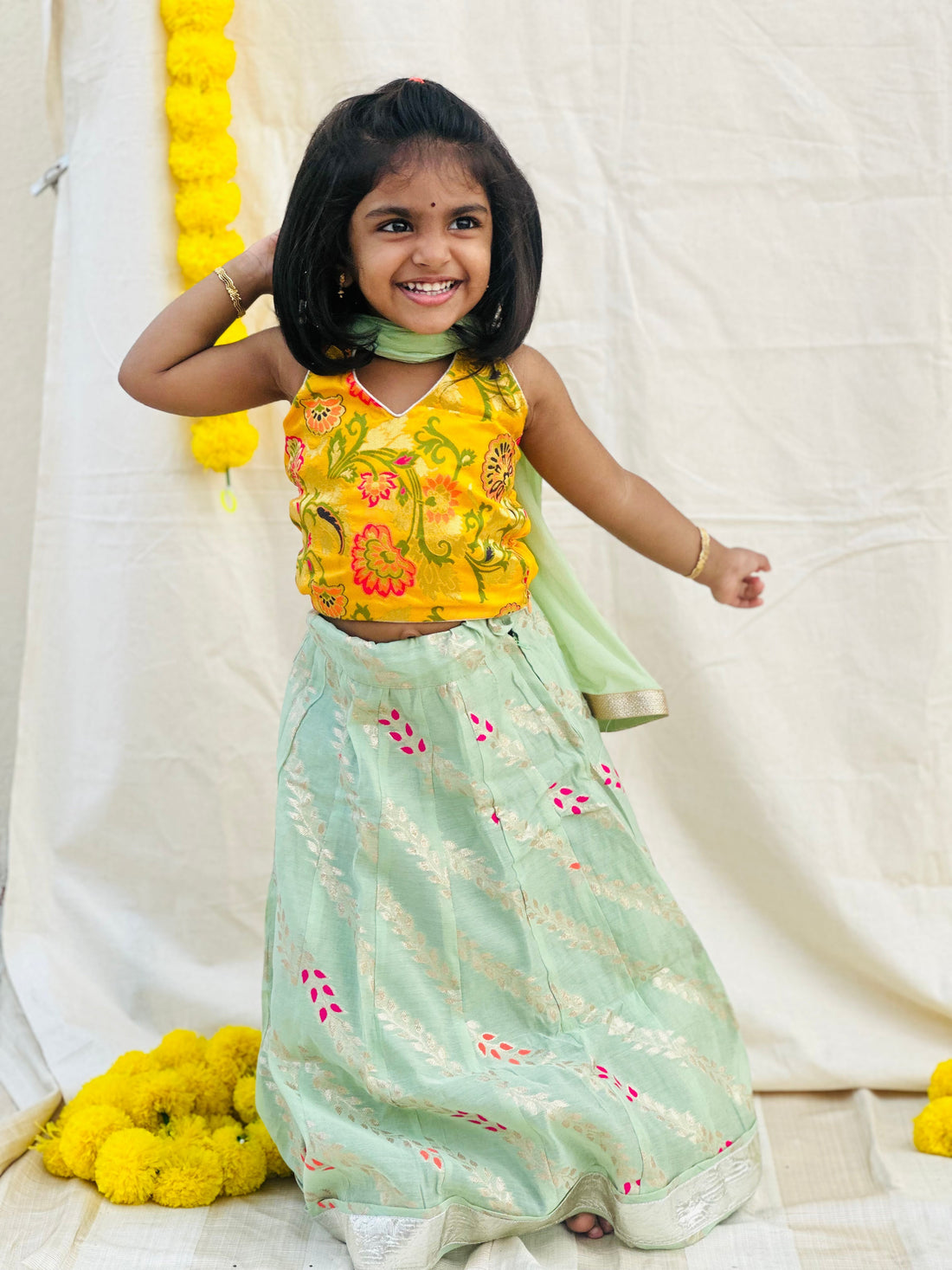 Yellow banarasi halter neck top with pastel green gold leaf chanderi skirt and matching chiffon dupatta. A beautiful 3-piece ethnic...