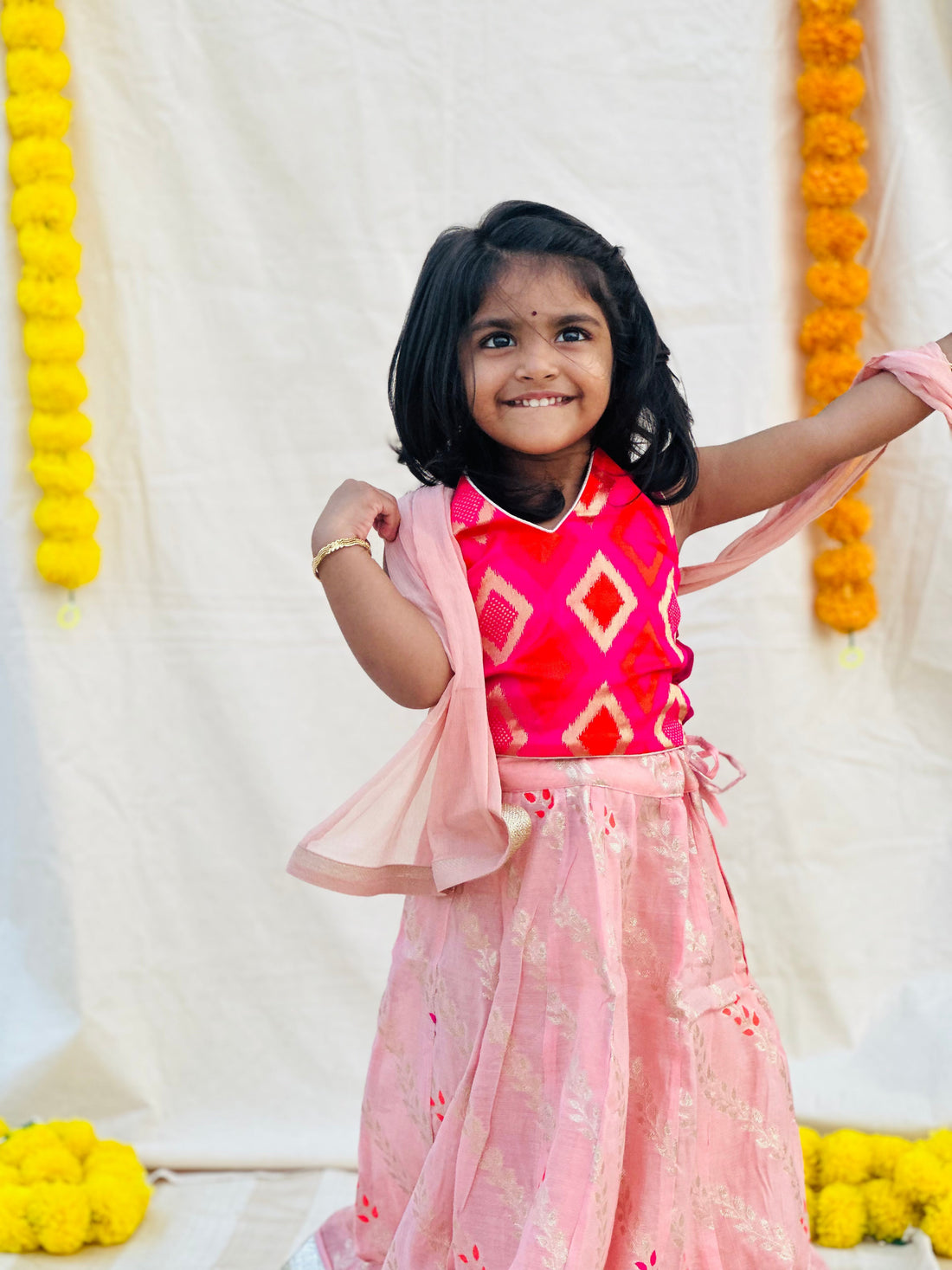 Hot pink brocade halter neck top with peach gold leaf chanderi skirt and peach chiffon dupatta. A beautiful 3-piece ethnic set for your...