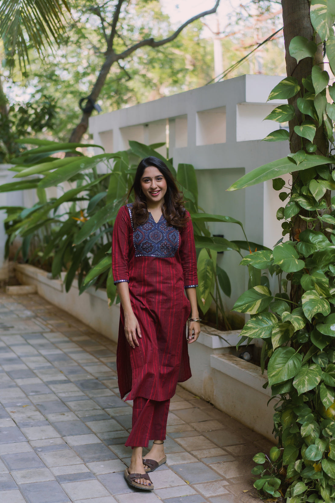 Maroon striped handloom kurta with a beautiful blue Ajrakh patchwork. Lined with mirror lace, this...