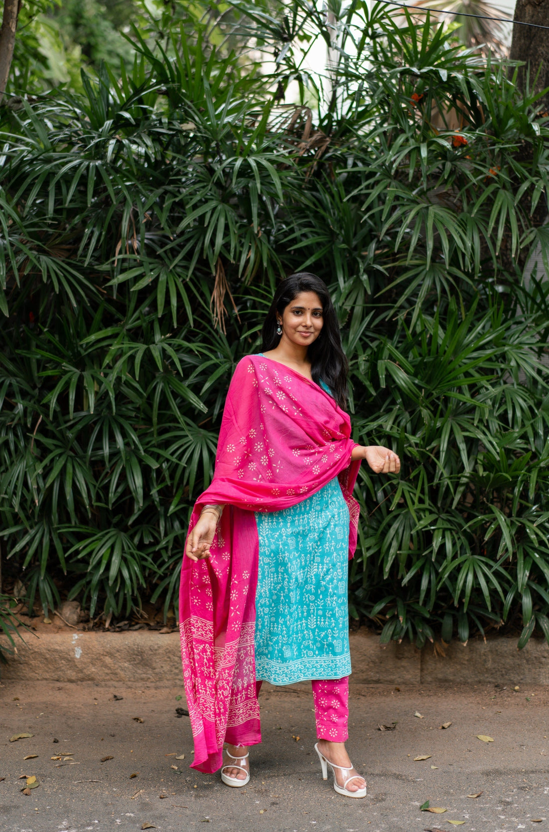 Hand block printed turquoise kurta with quirky Warli prints paired with pink pants and dupatta....