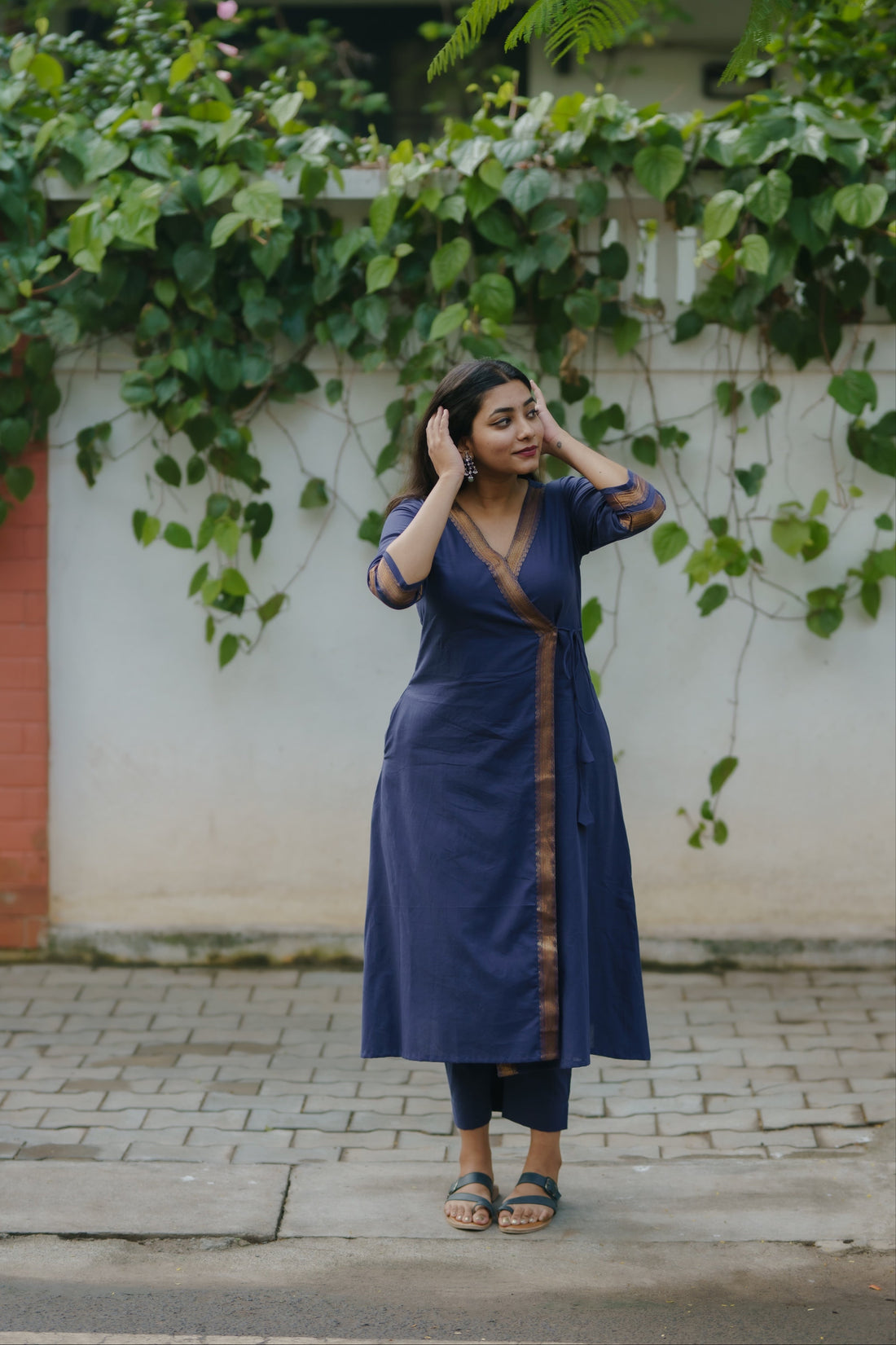 This beautiful navy blue Mangalagiri kurta set effortlessly blends tradition with a modern twist. Made...