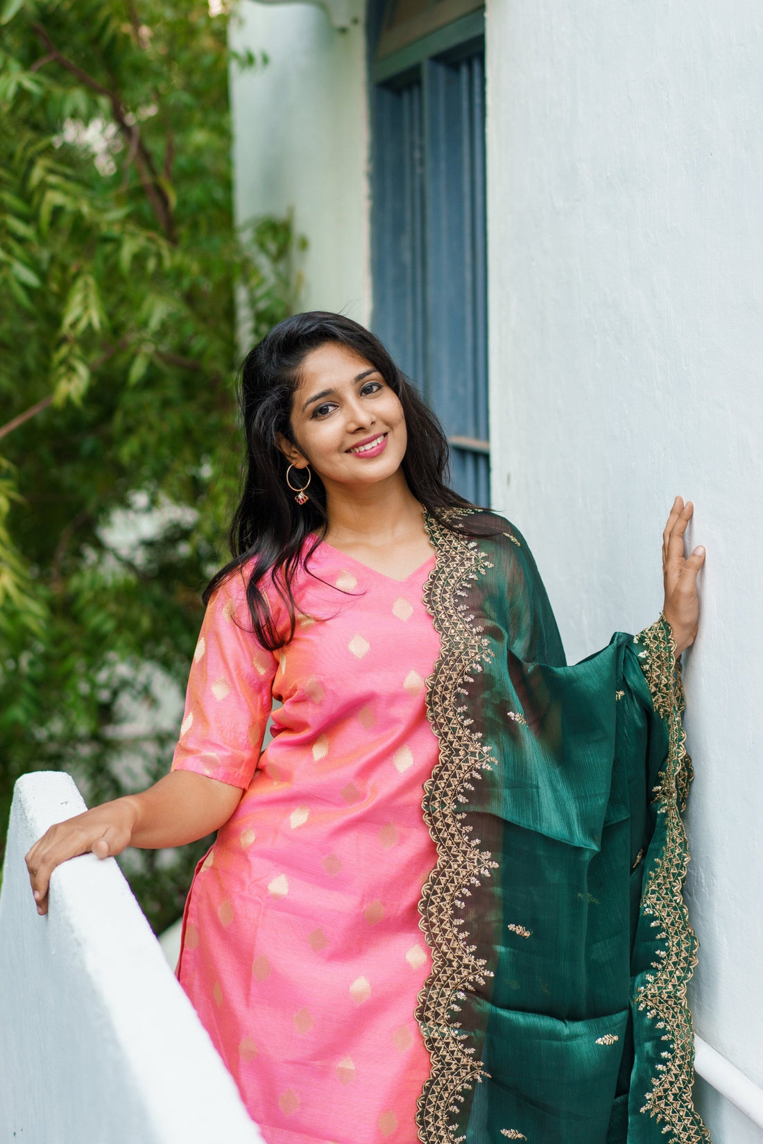 Pretty pink chanderi silk kurta set with gold butta, paired with bottle green cutwork dupatta...