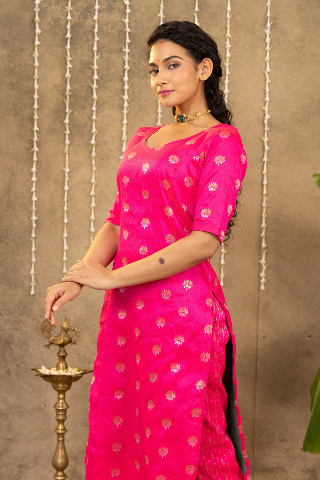 Beautiful fuschia pink handloom silk kurta adorned with dual-tone lotus motifs and striped handloom silk...