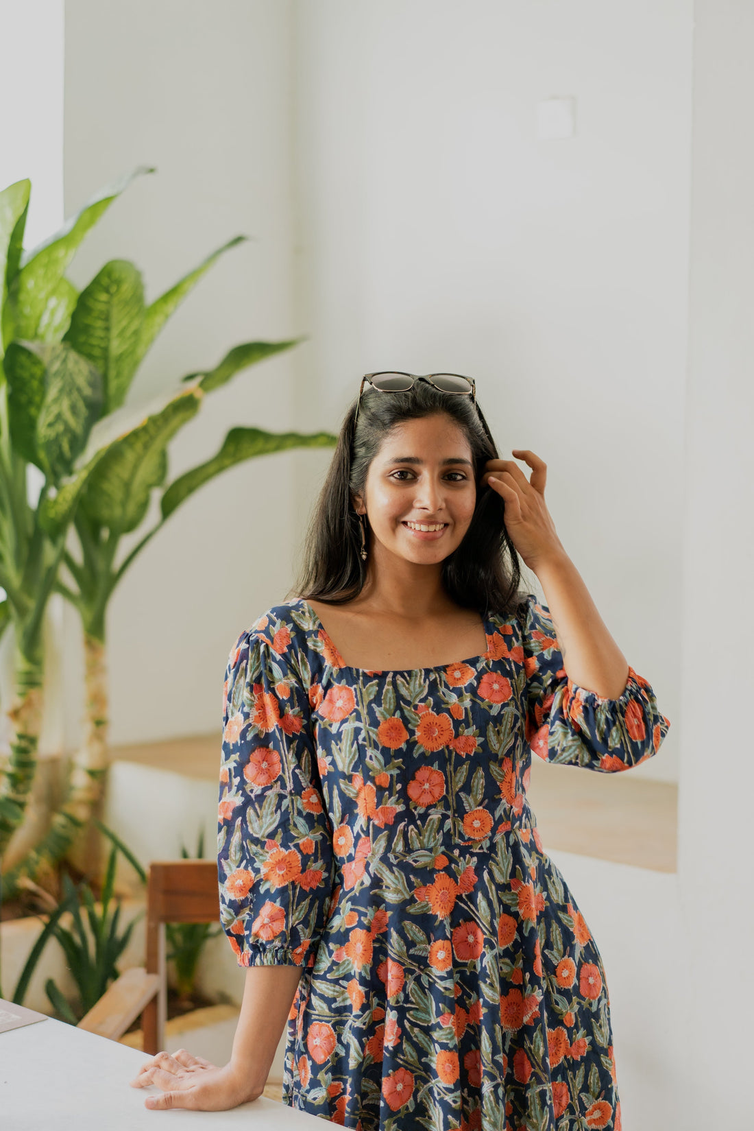 Navy blue and orange floral hand block printed ruffle midi dress. Made from soft, breathable cotton,...