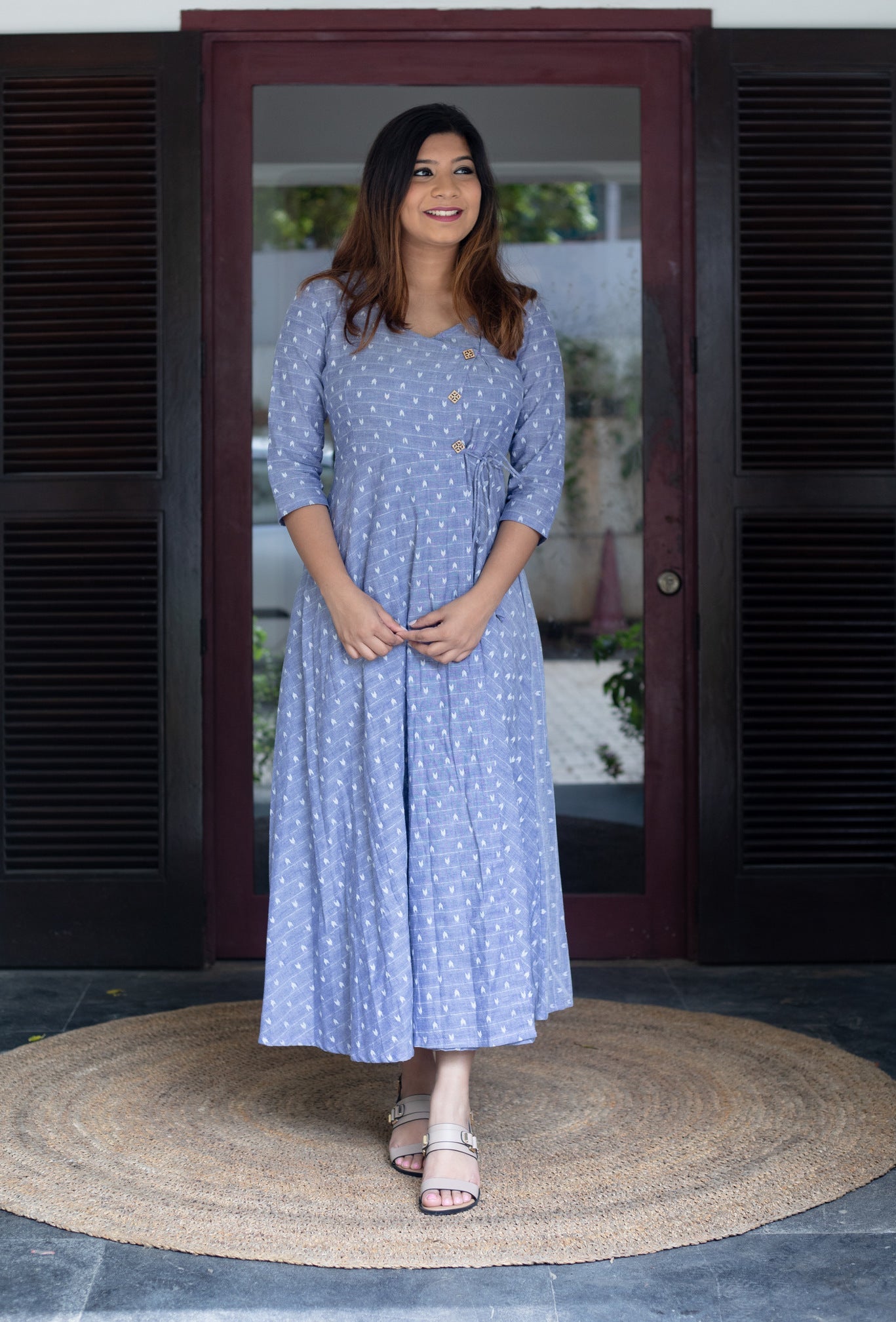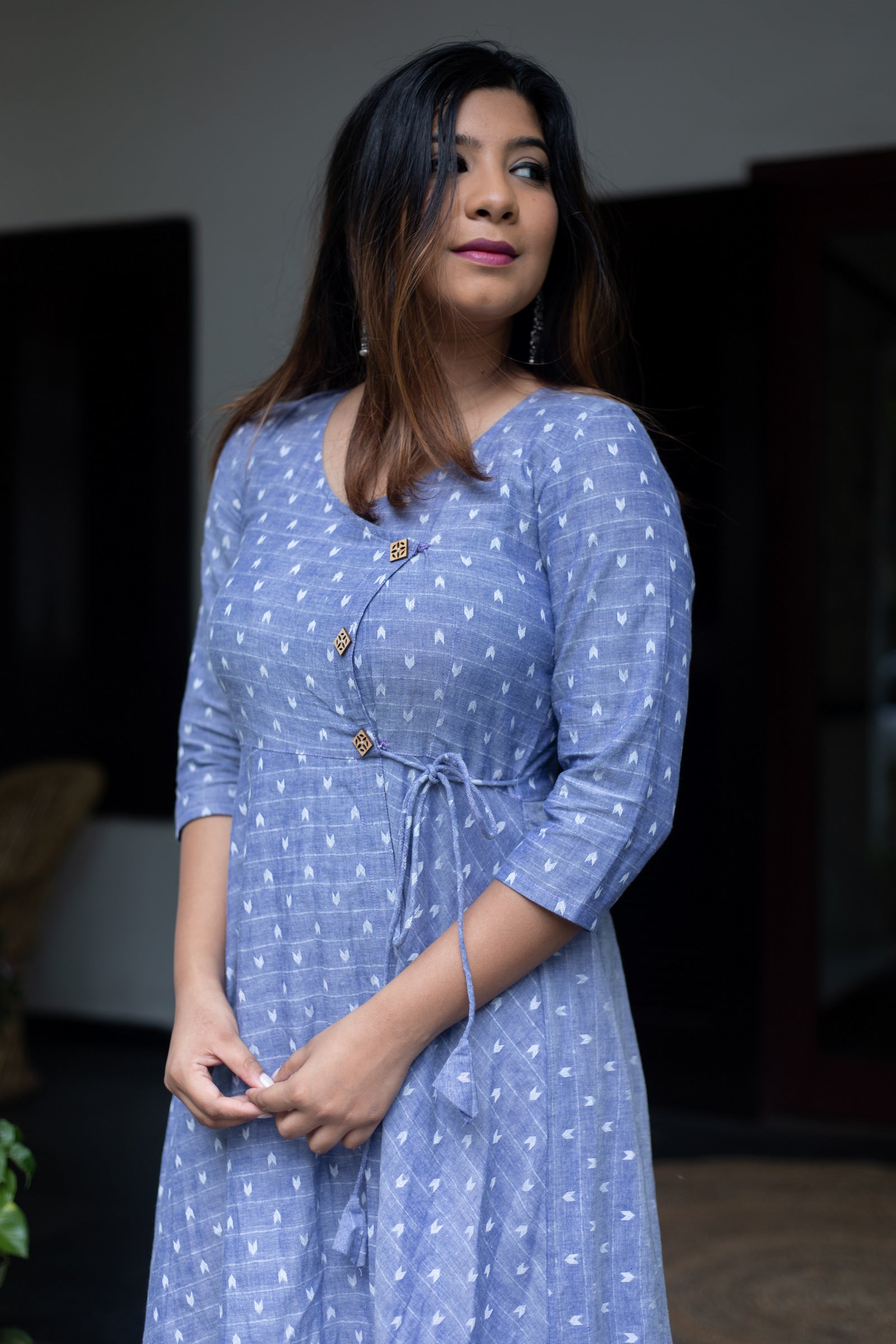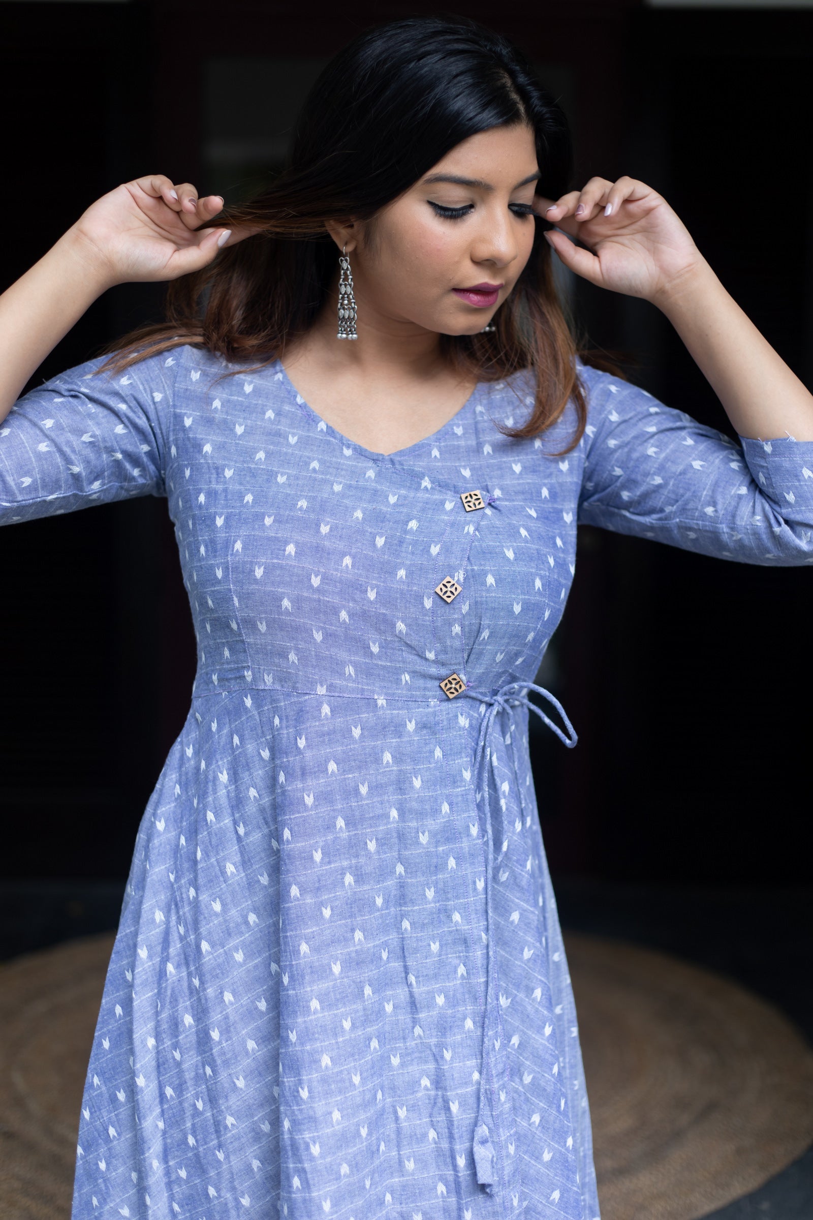 Blue handloom angrakha wrap dress with stylized wooden buttons and tie-up. A smart, casual outfit.