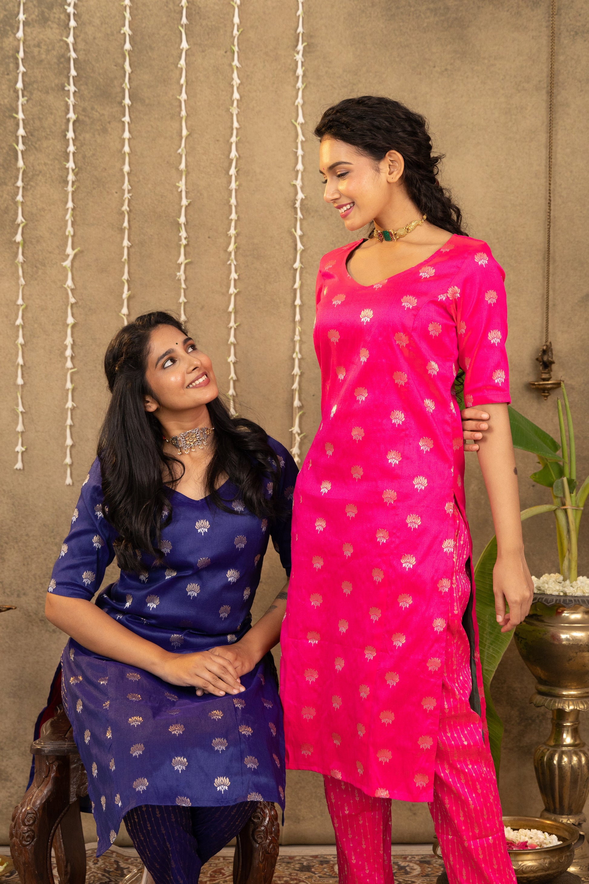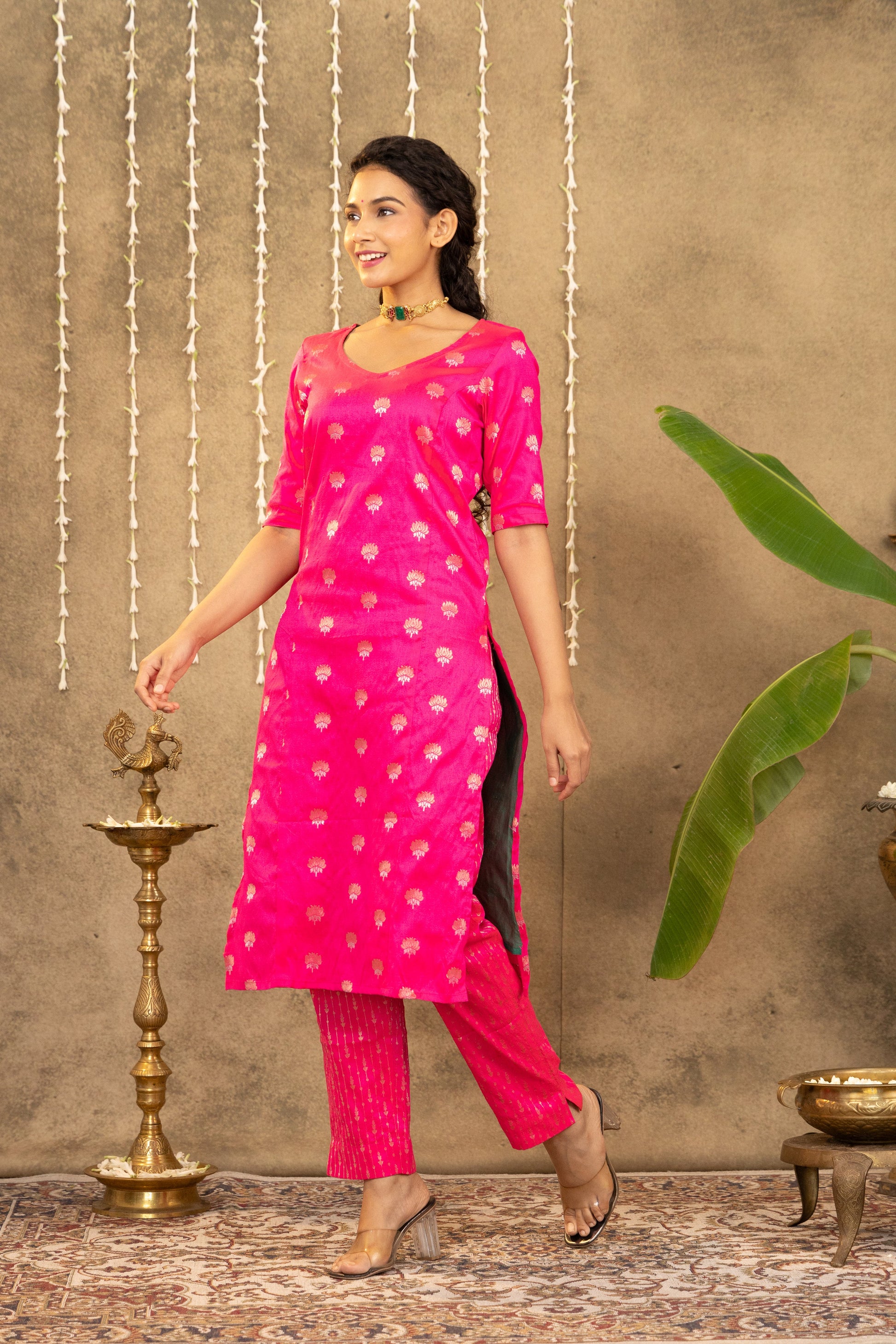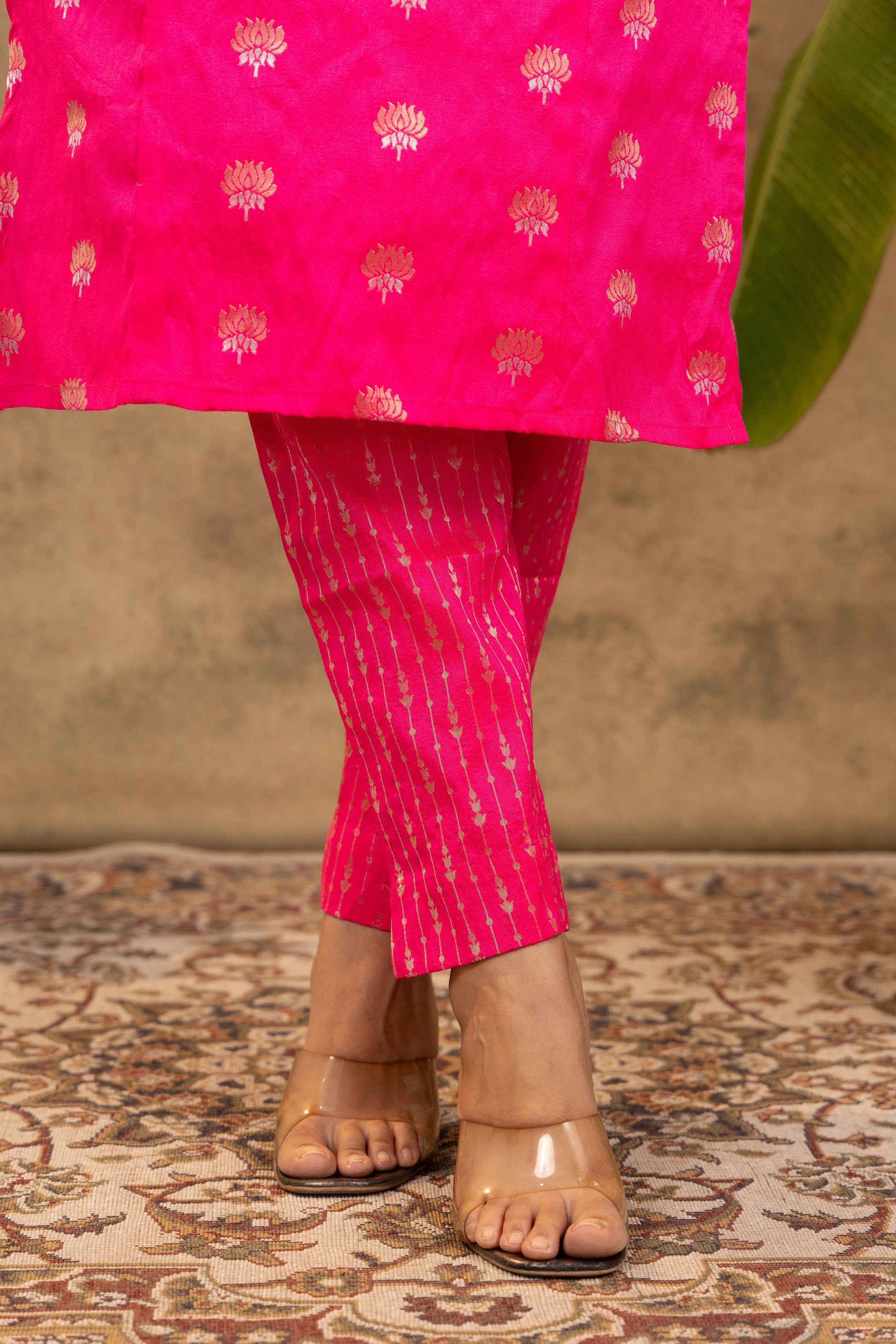 Beautiful fuschia pink handloom silk kurta adorned with dual-tone lotus motifs and striped handloom silk pants. Crafted from the finest fabric, this chic co-ord set is perfect for festive celebrations! Lining provided.