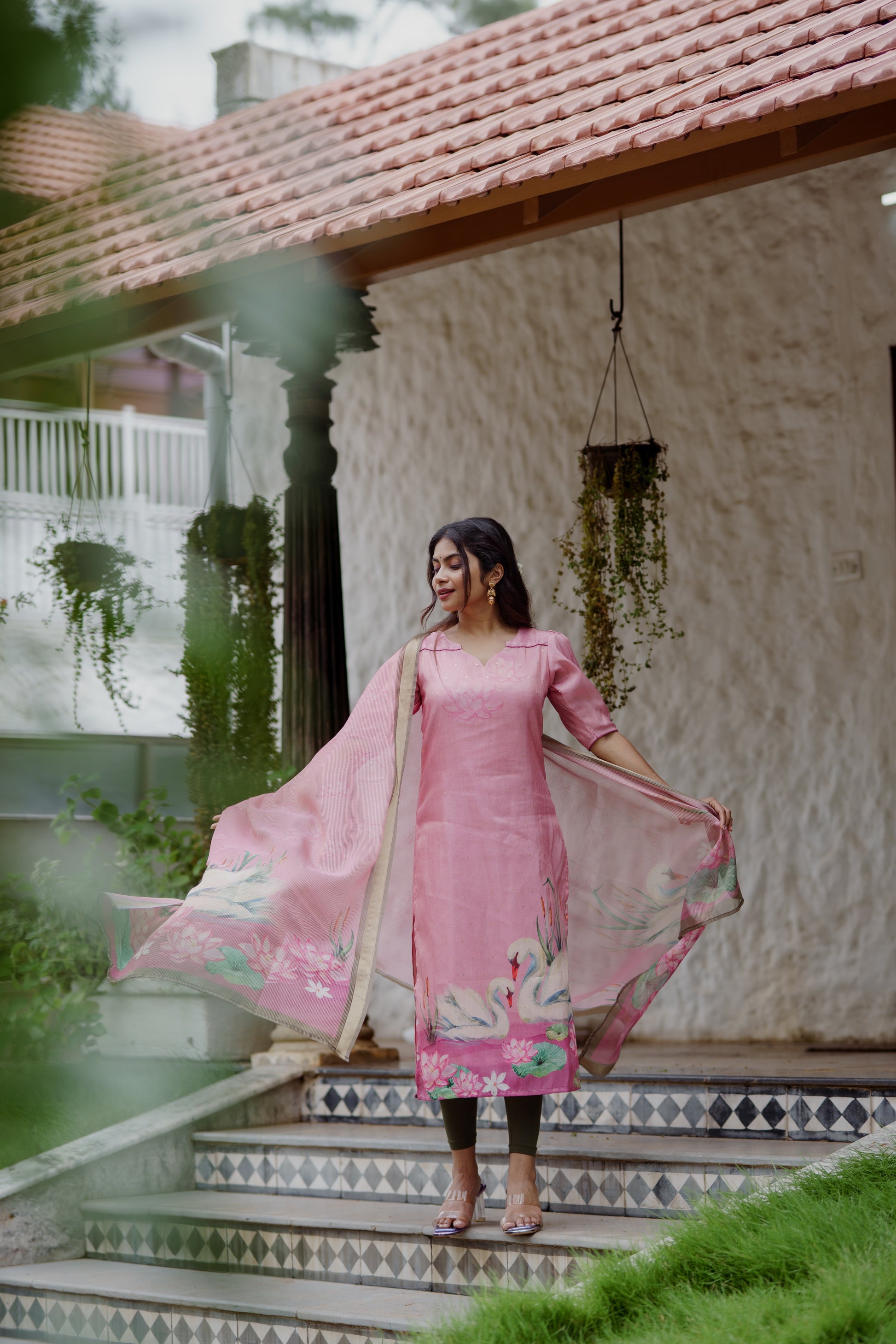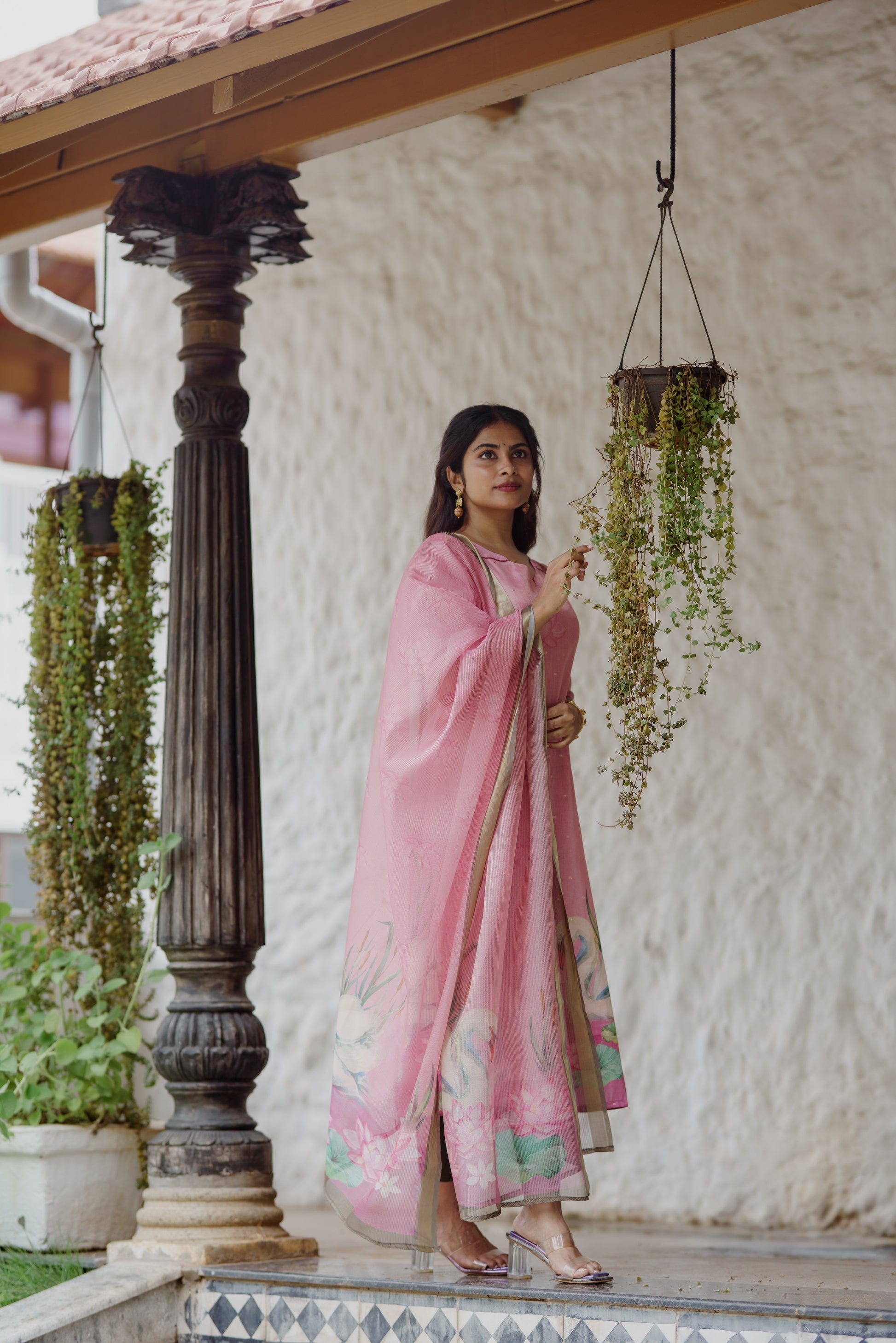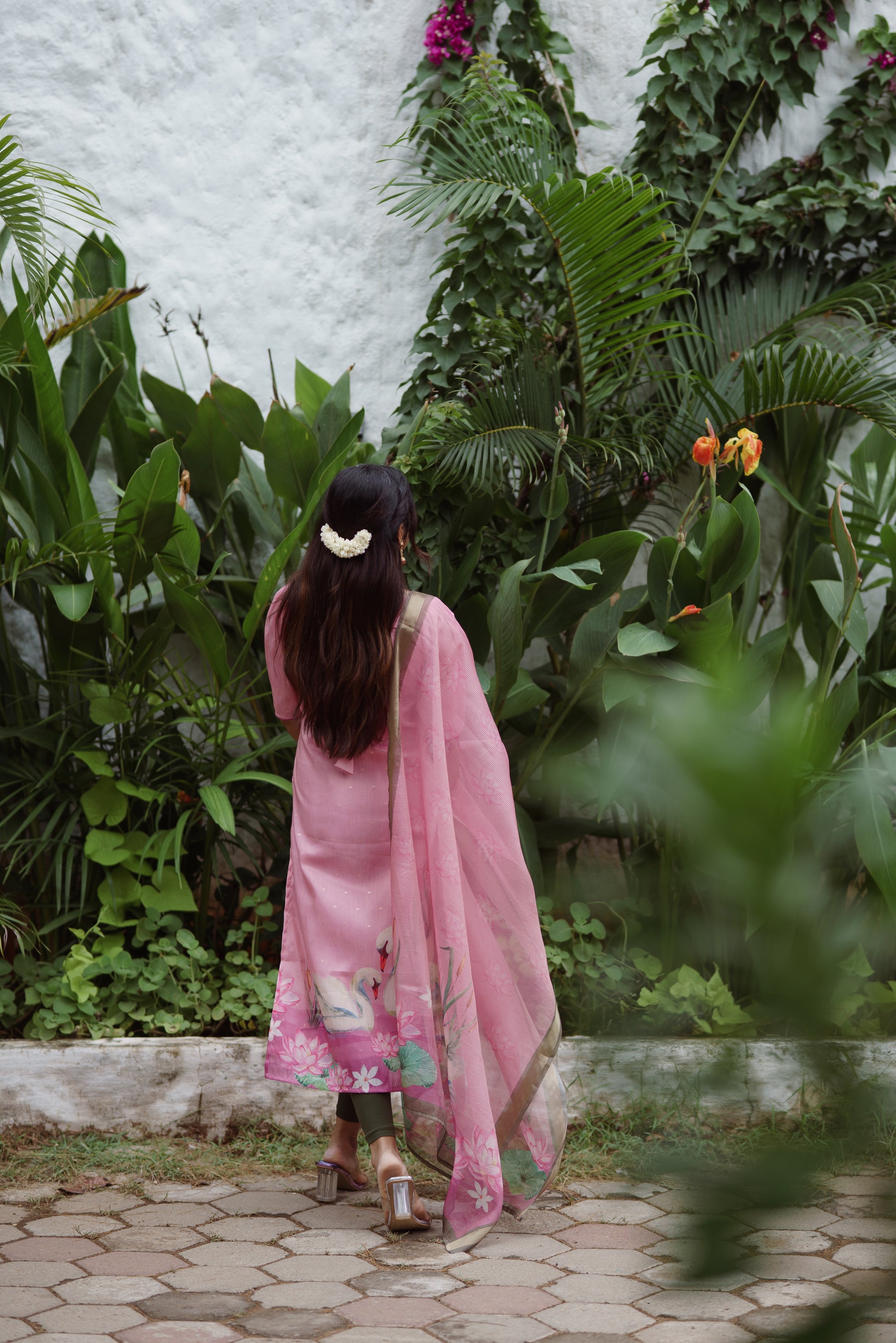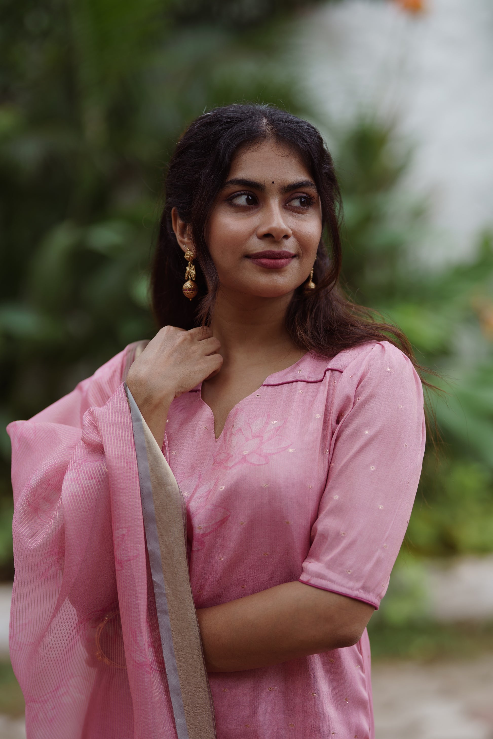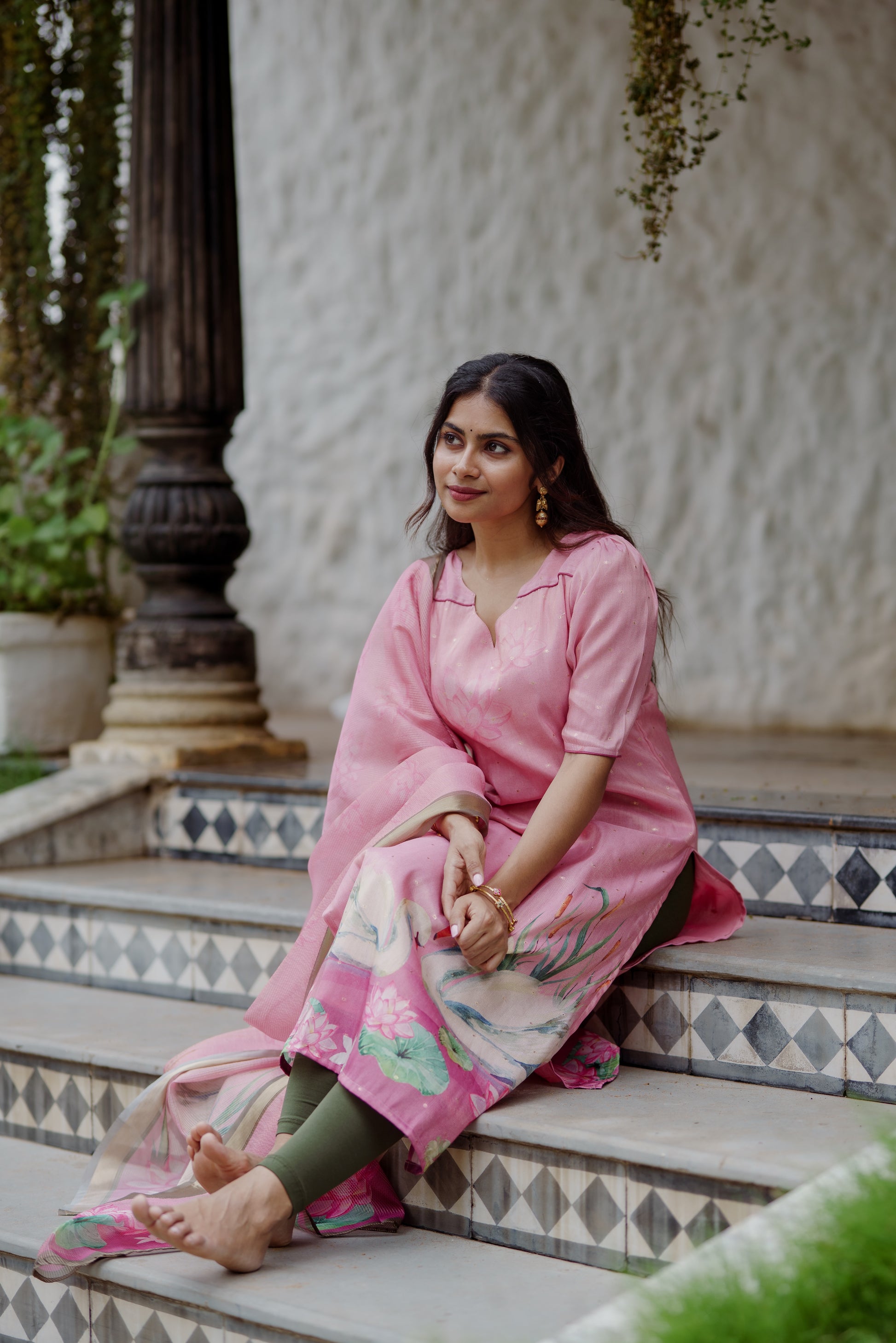 This beautiful pink kurta showcases intricate lotus and swan prints along the hem, enhanced by small buttas scattered elegantly across the fabric. Paired with a Kota dupatta featuring a matching lotus design, it creates a simple yet festive ensemble, perfect for adding subtle sophistication to your celebratory wardrobe.