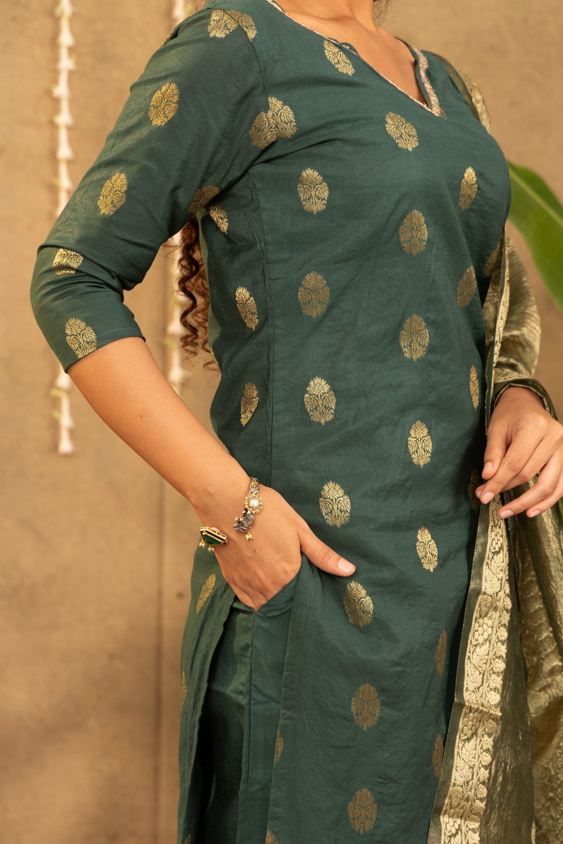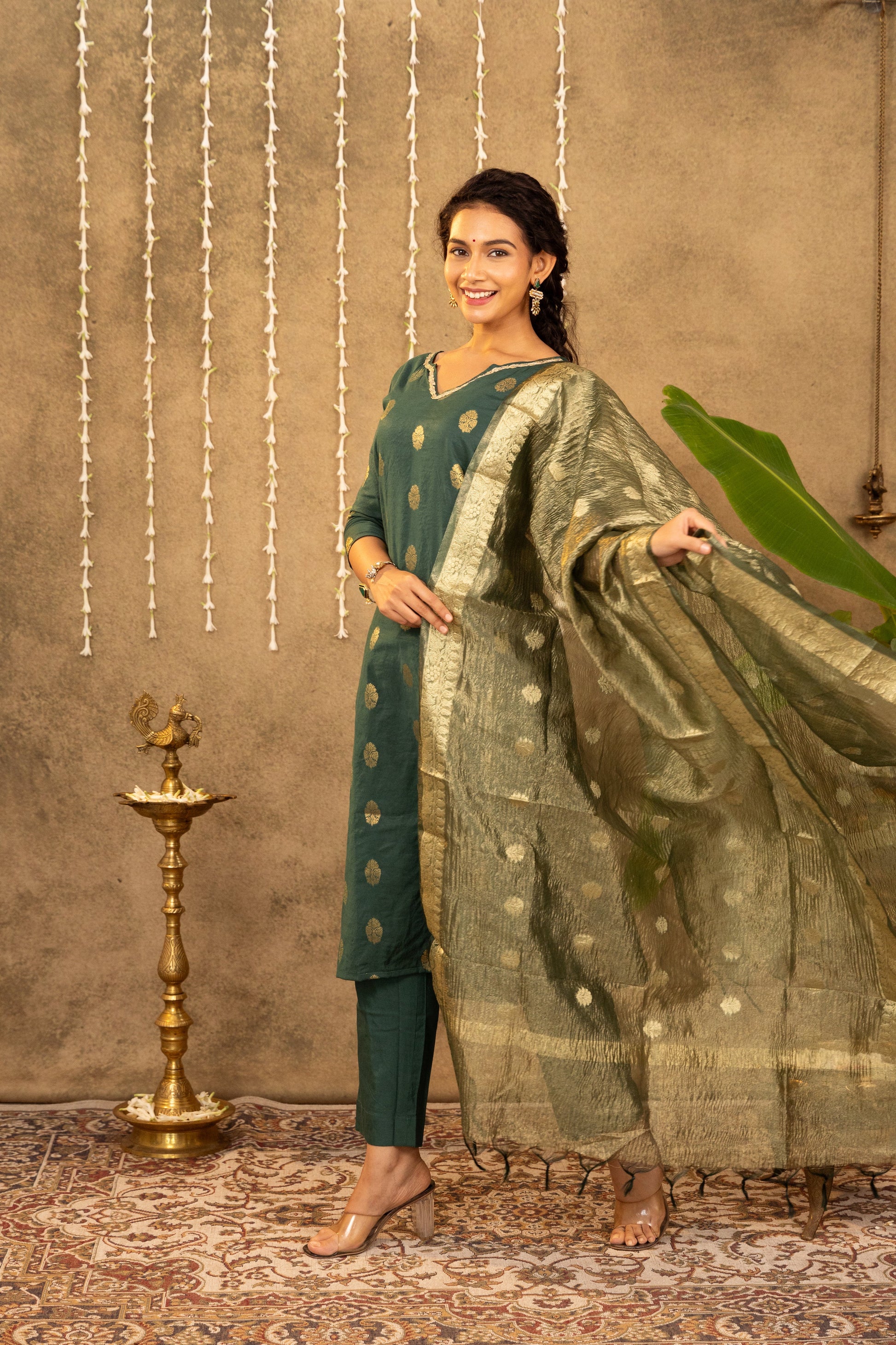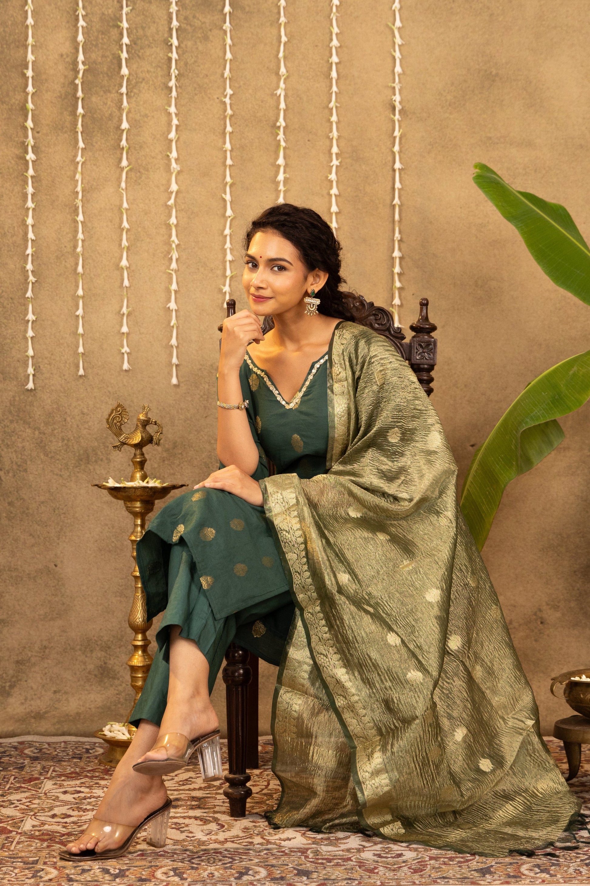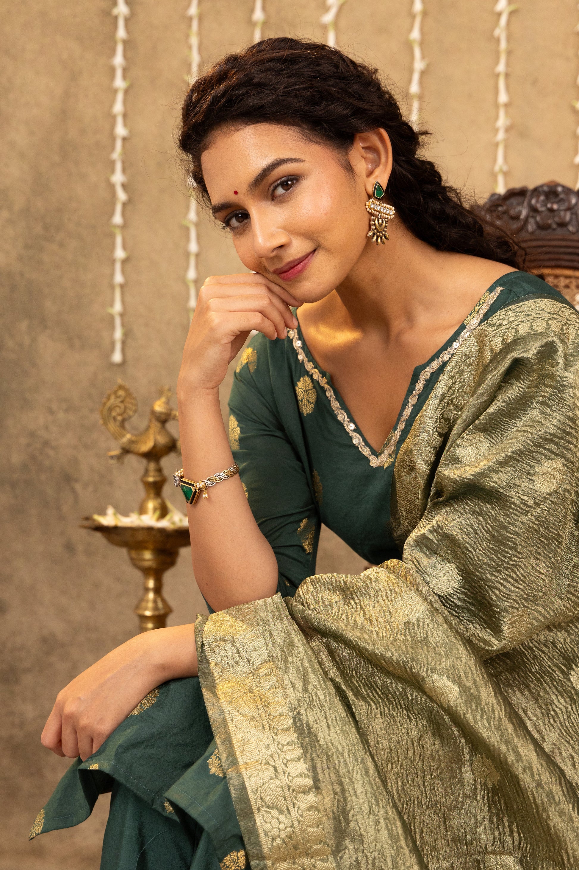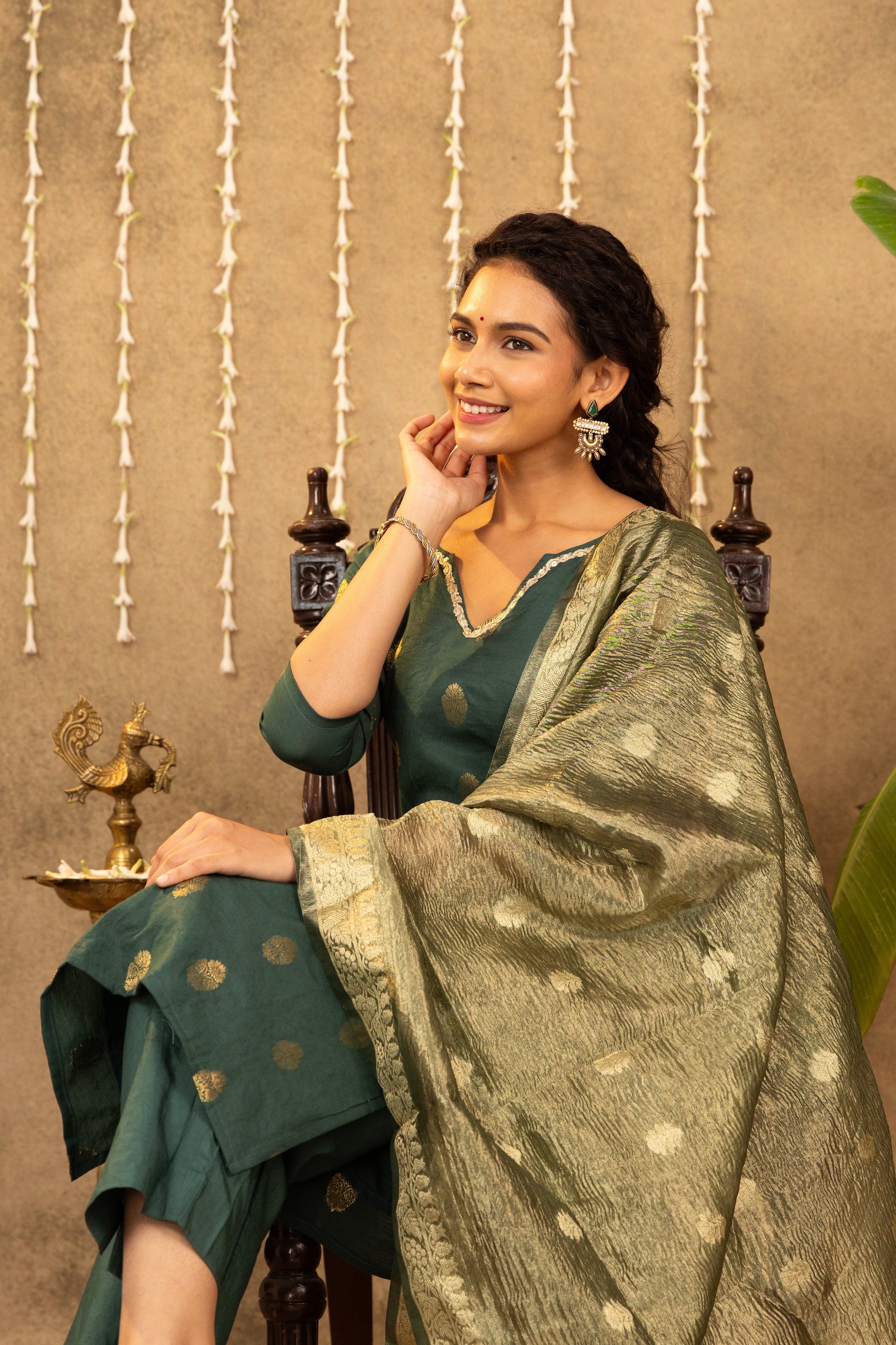 Pretty green cotton silk kurta with gold Mughal motifs, paired with a gorgeous crushed tissue zari dupatta and plain pants. This outfit is perfect for festive celebrations! Lining provided.