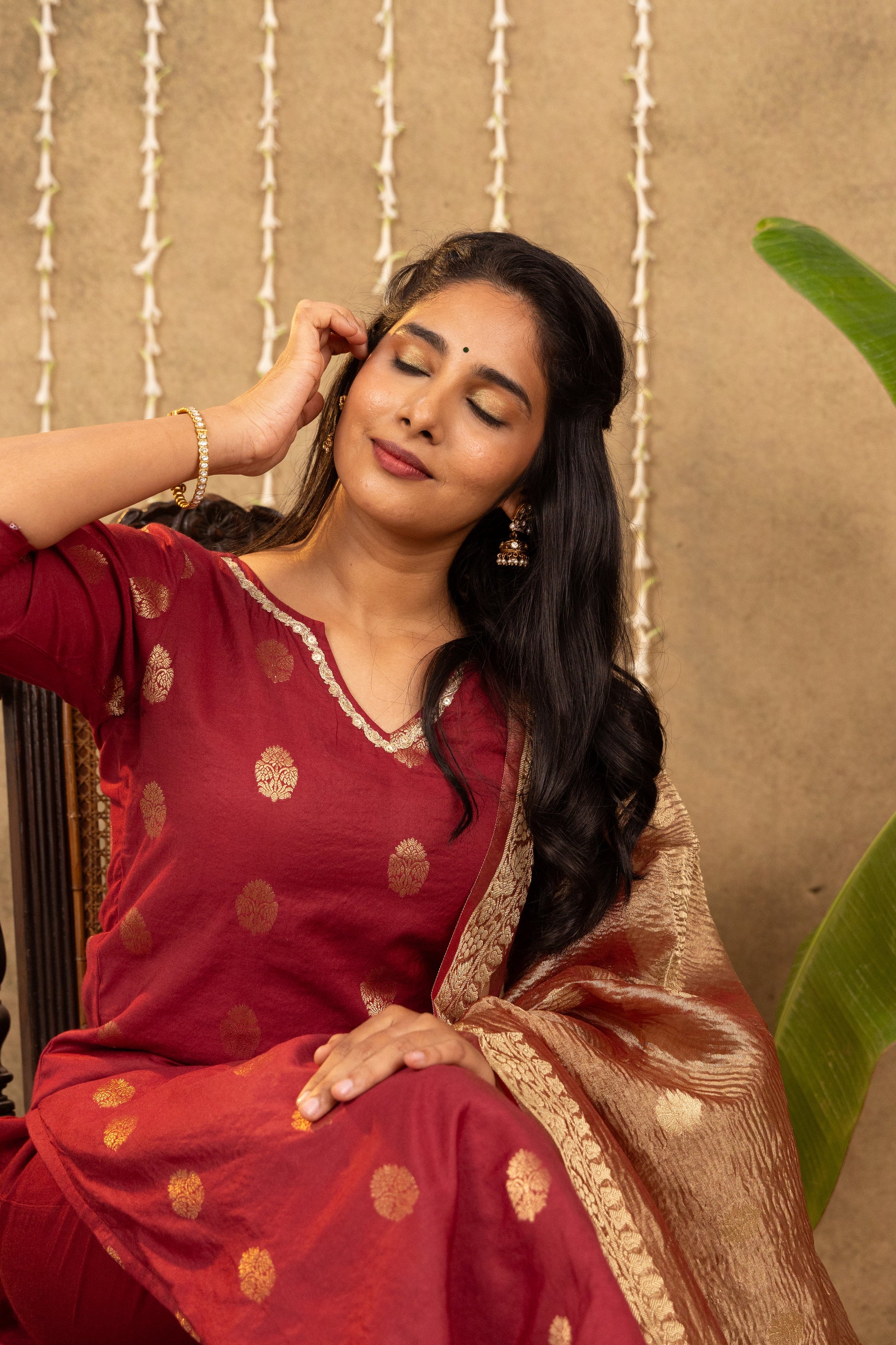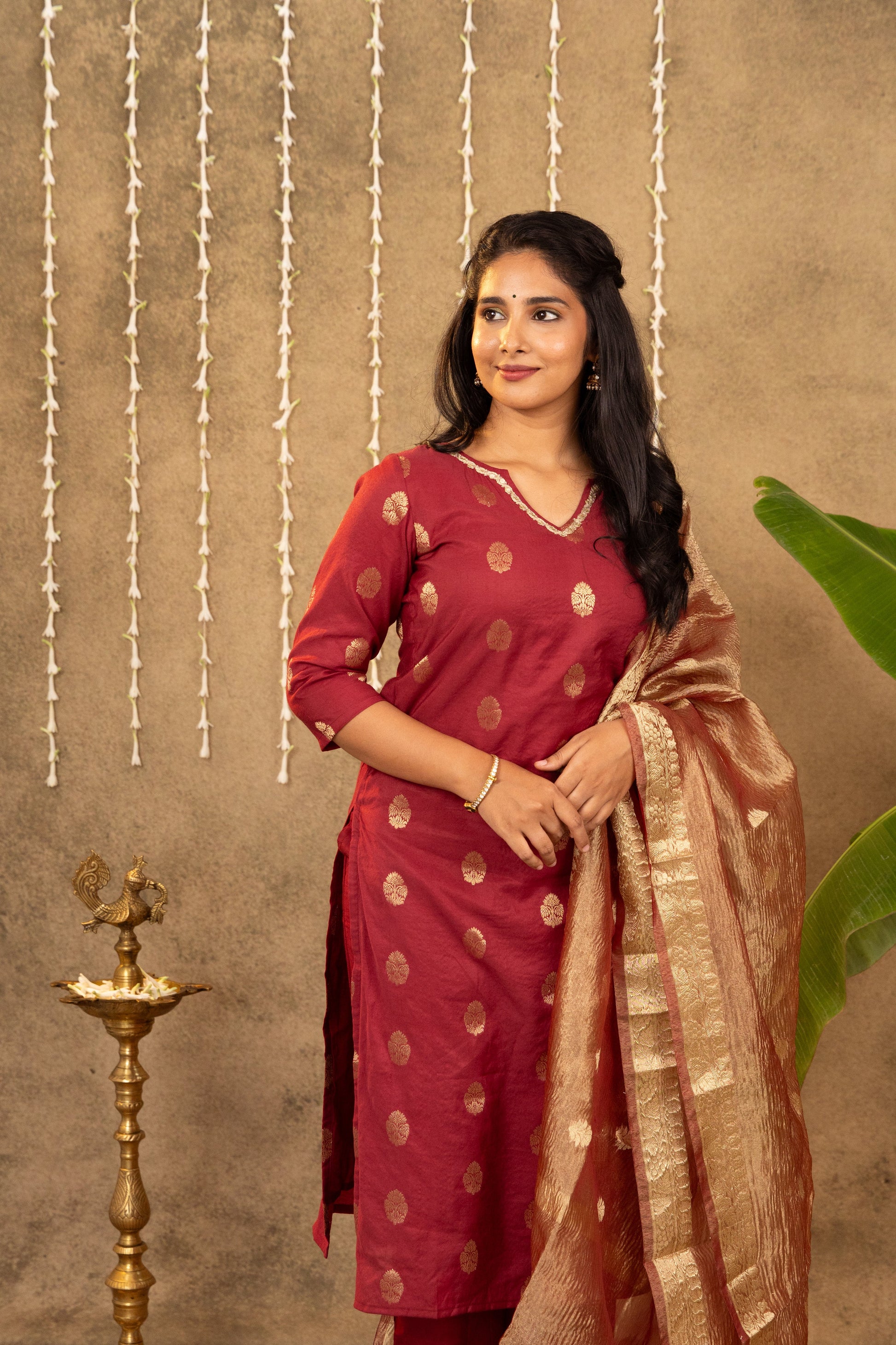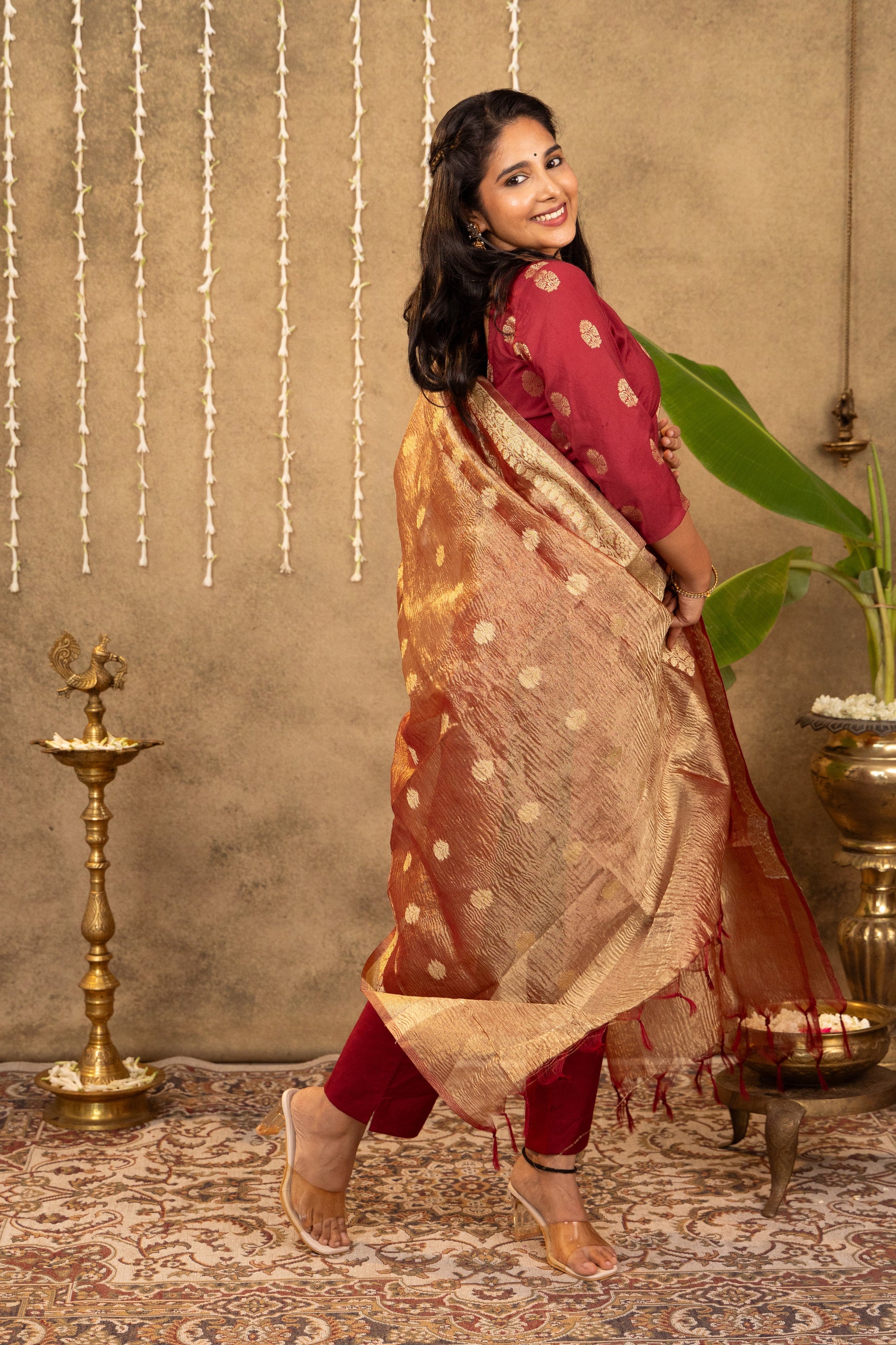 Pretty maroon cotton silk kurta with gold Mughal motifs, paired with a gorgeous crushed tissue zari dupatta and plain pants. This outfit is perfect for festive celebrations! Lining provided.