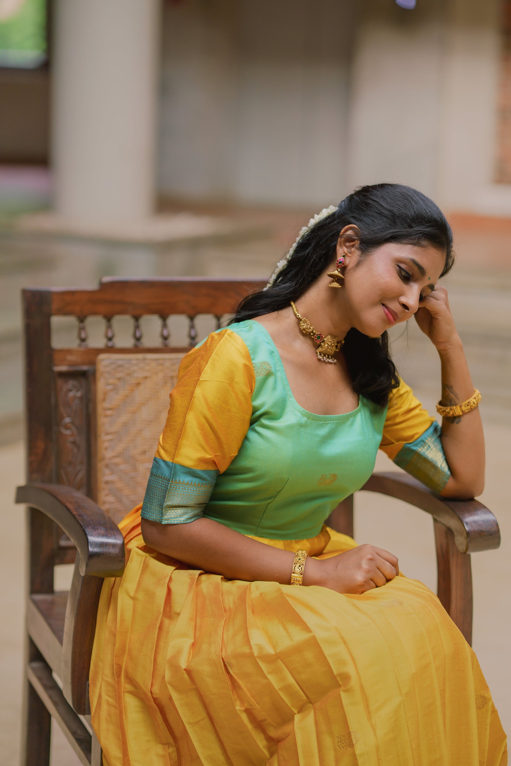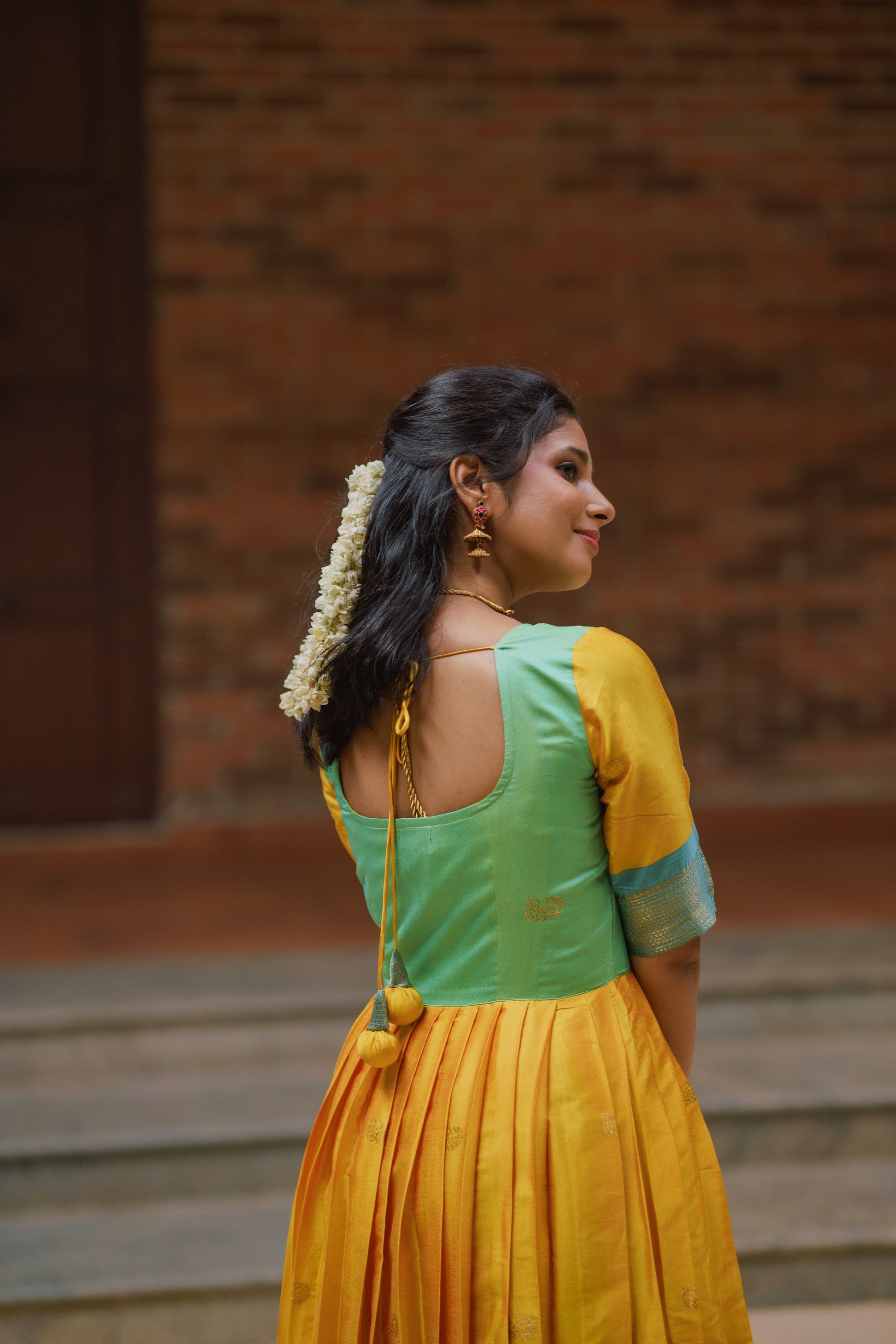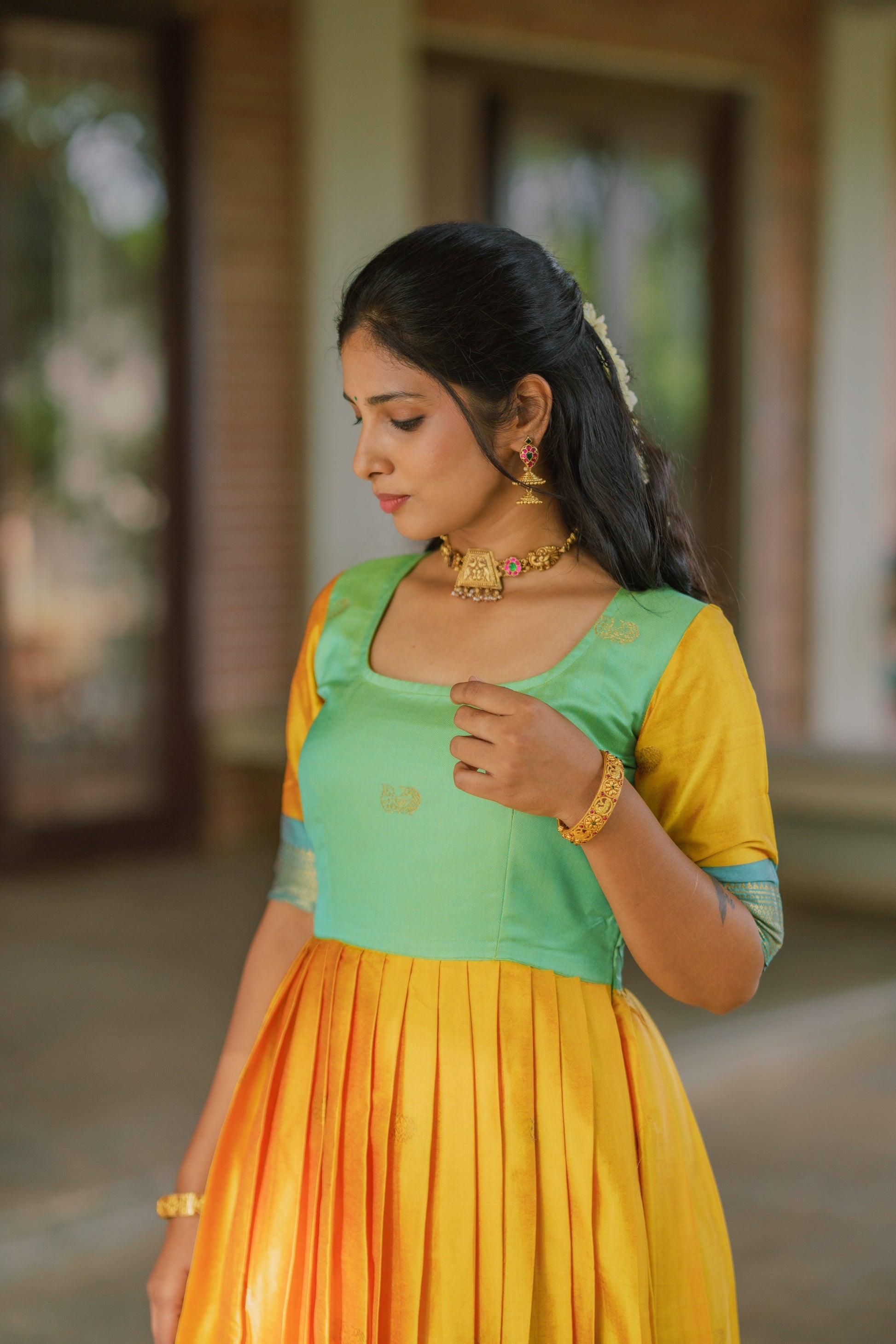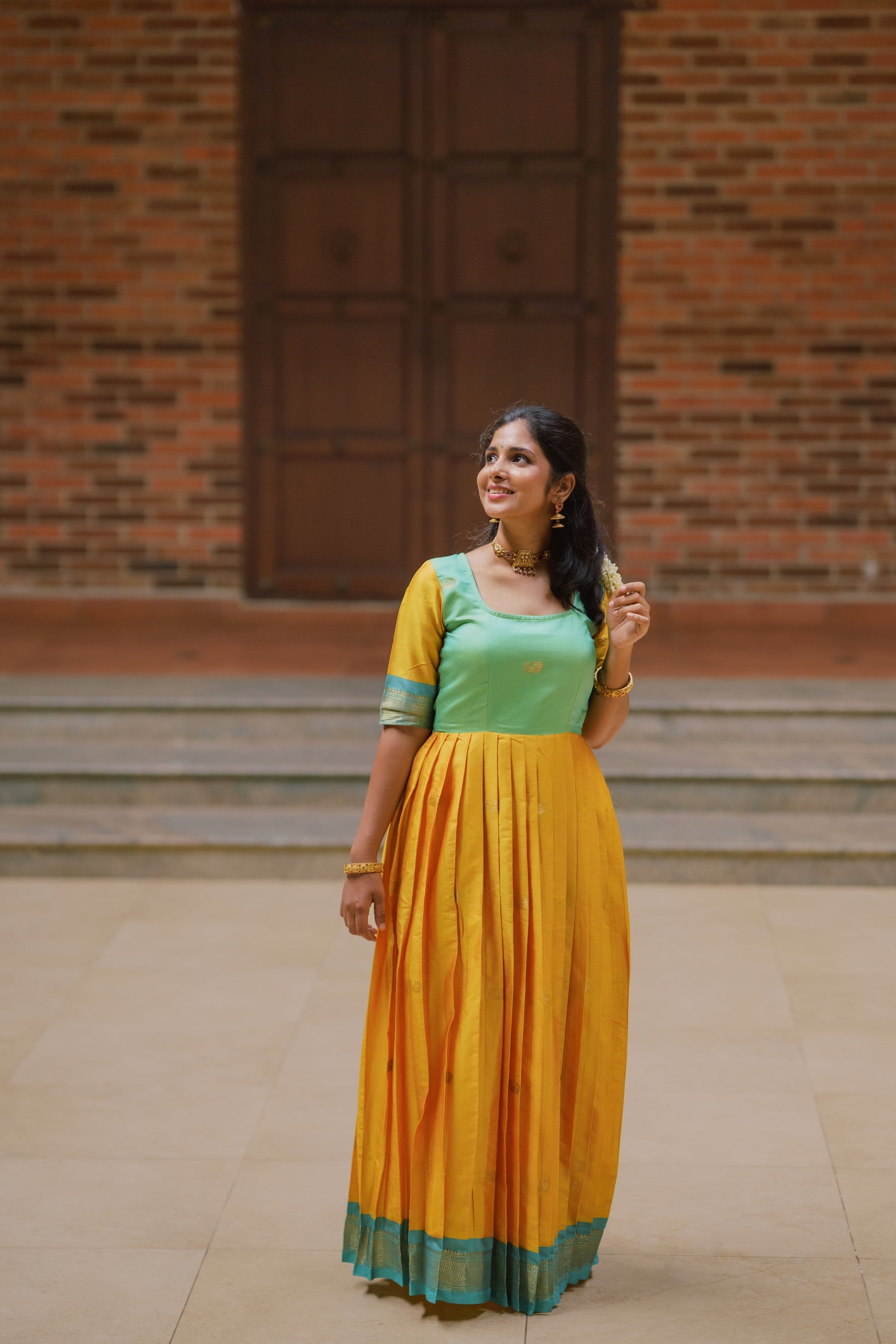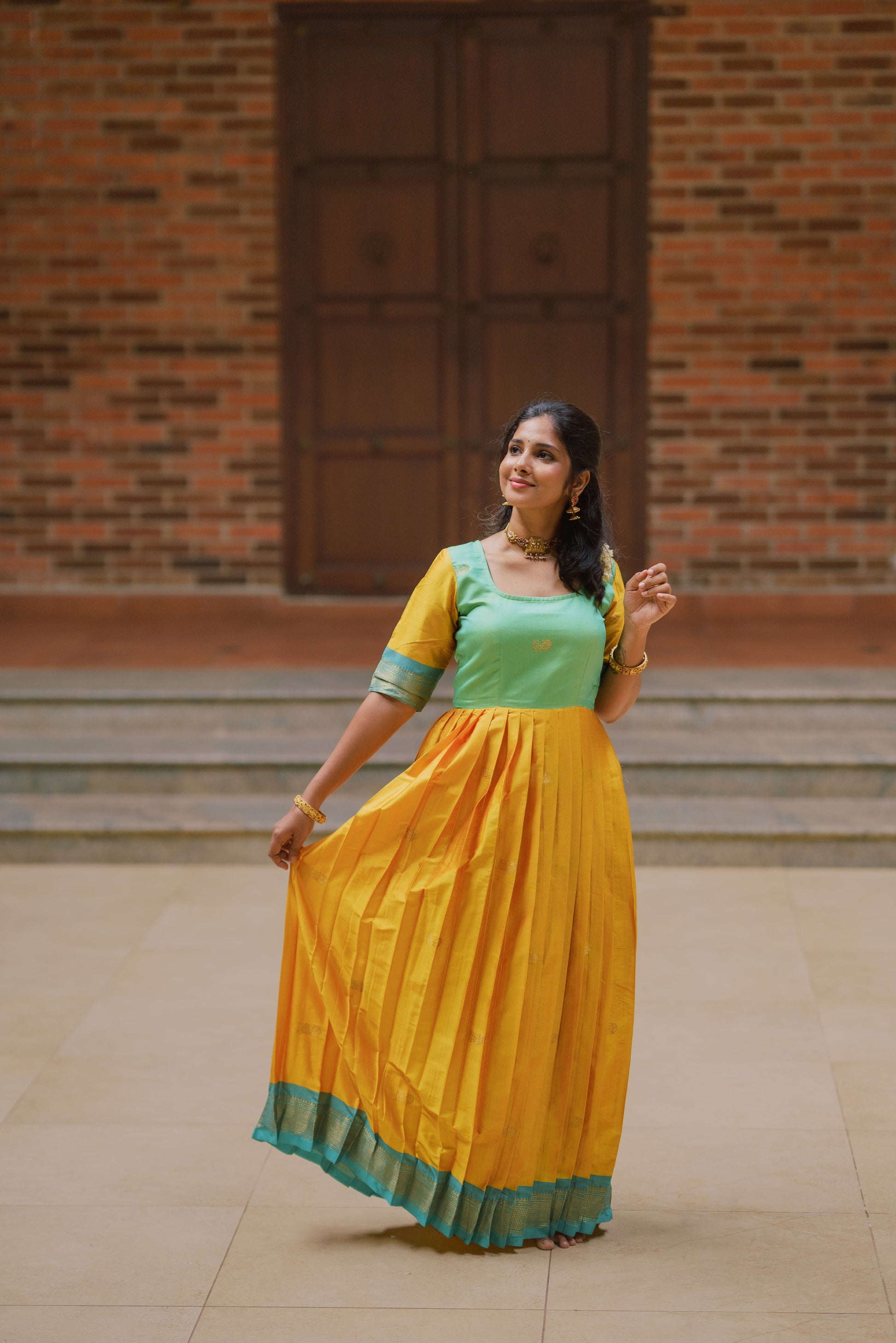 Handwoven semi silk pleated anarkali dress in striking yellow with contrast turquoise zari border and hamsa motifs all over. This timeless traditional piece is a must-have this festive season! Lining provided.