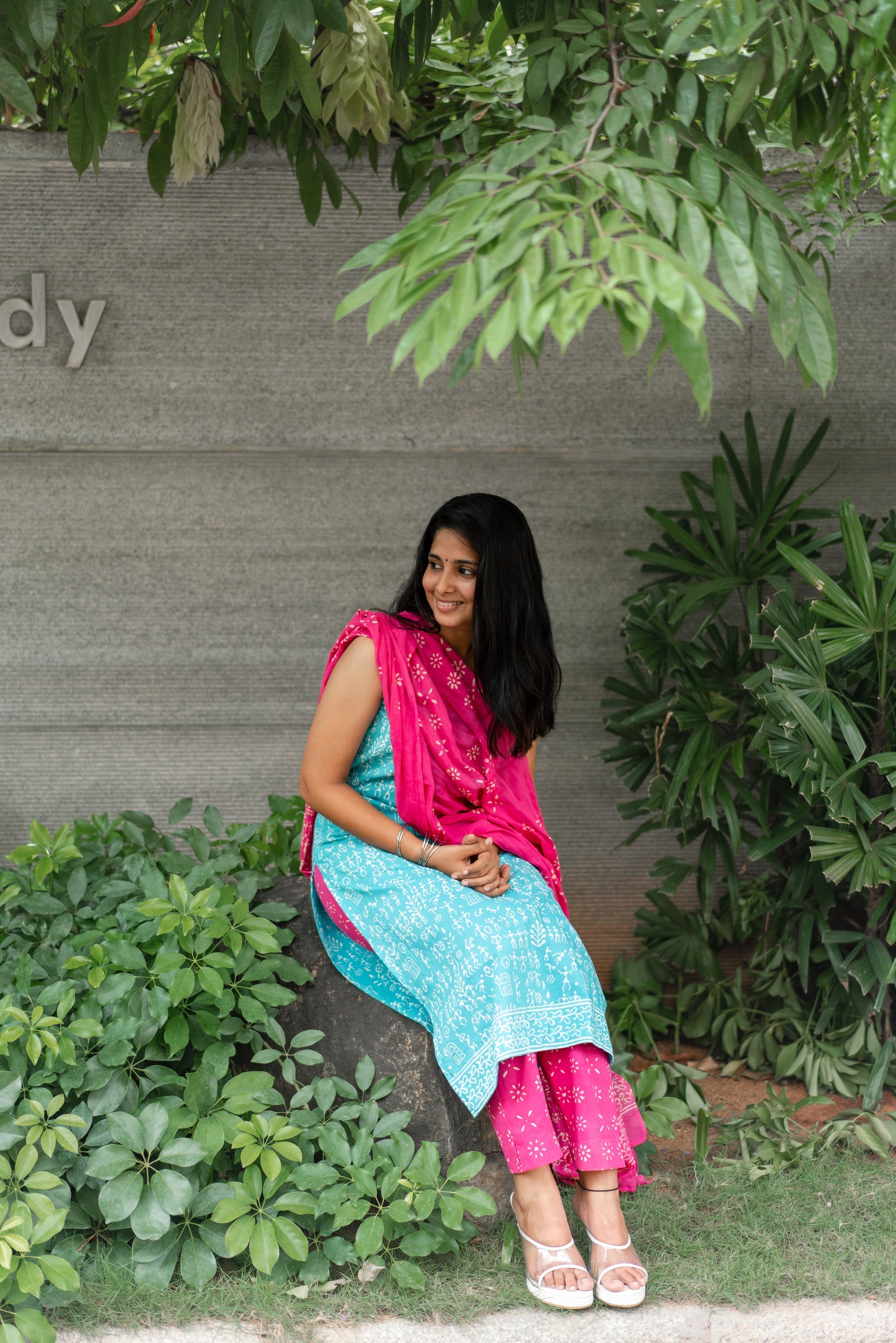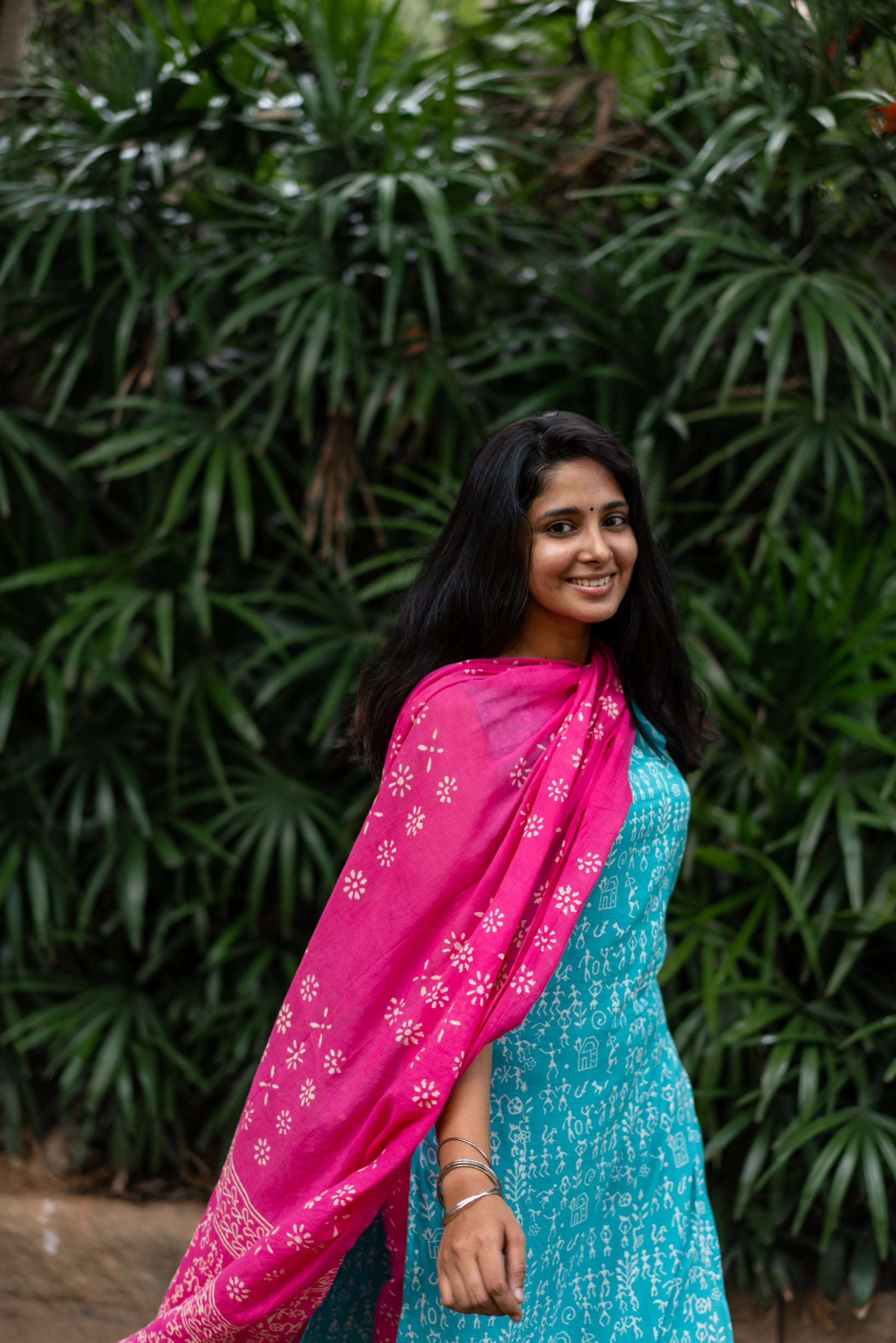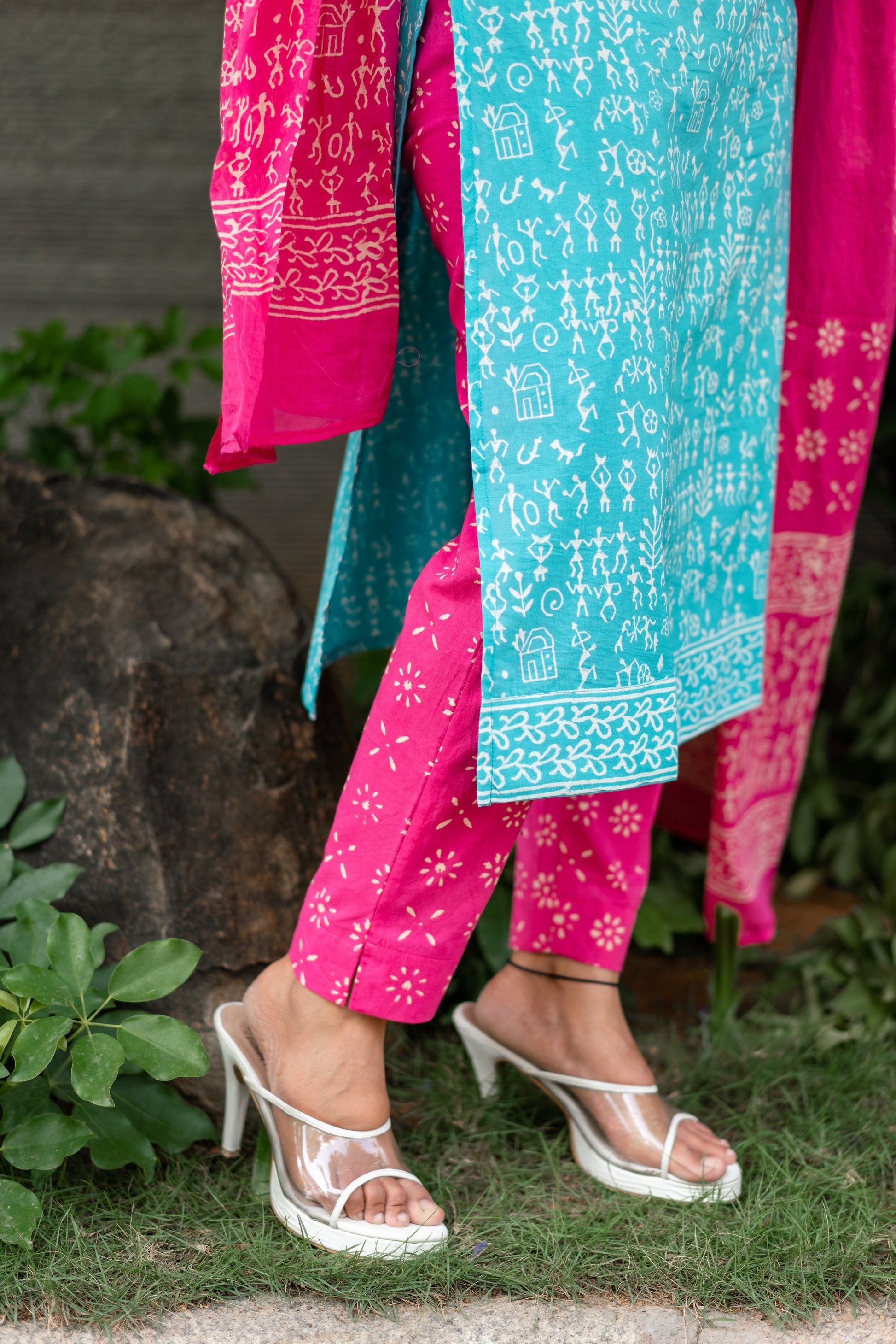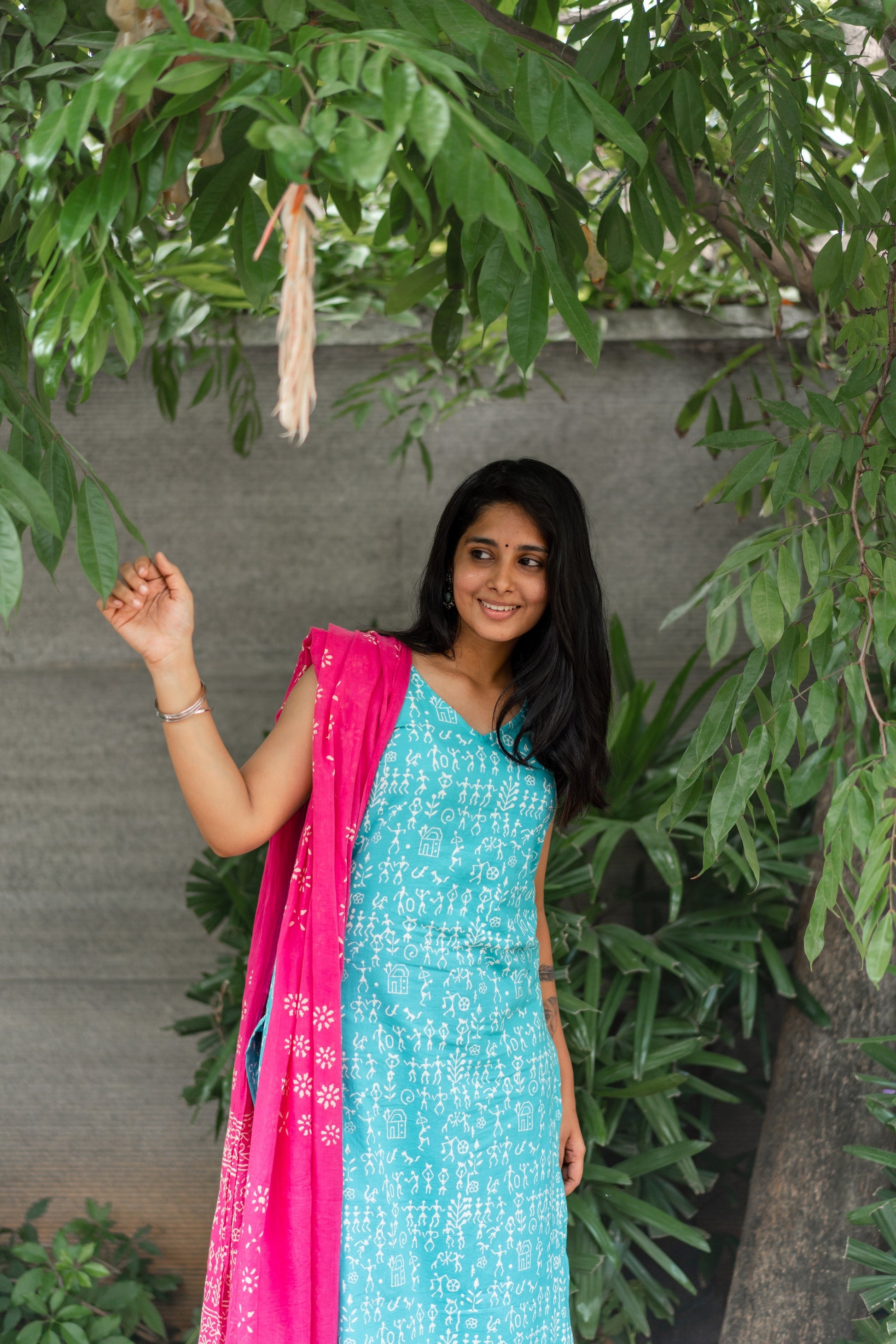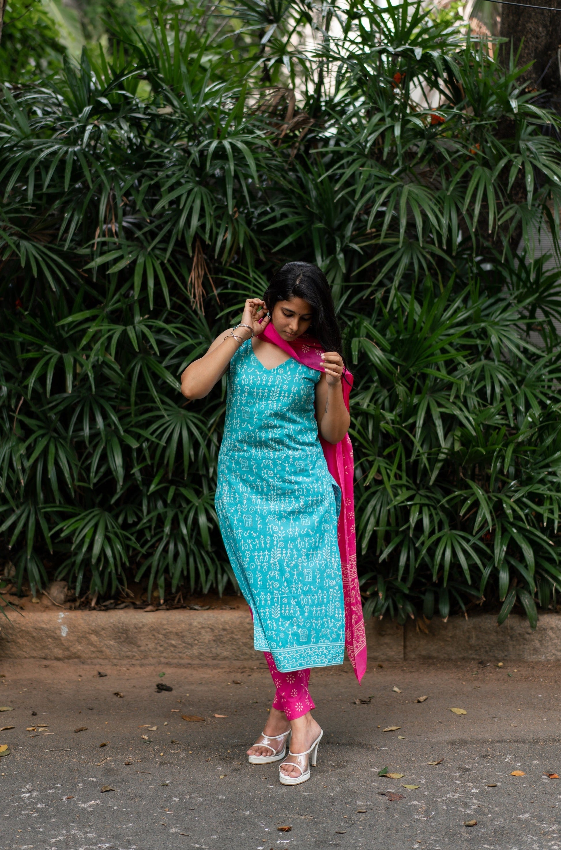 Hand block printed turquoise kurta with quirky Warli prints paired with pink pants and dupatta. Made from soft, breathable cotton, this chic and comfortable outfit is a must-have!