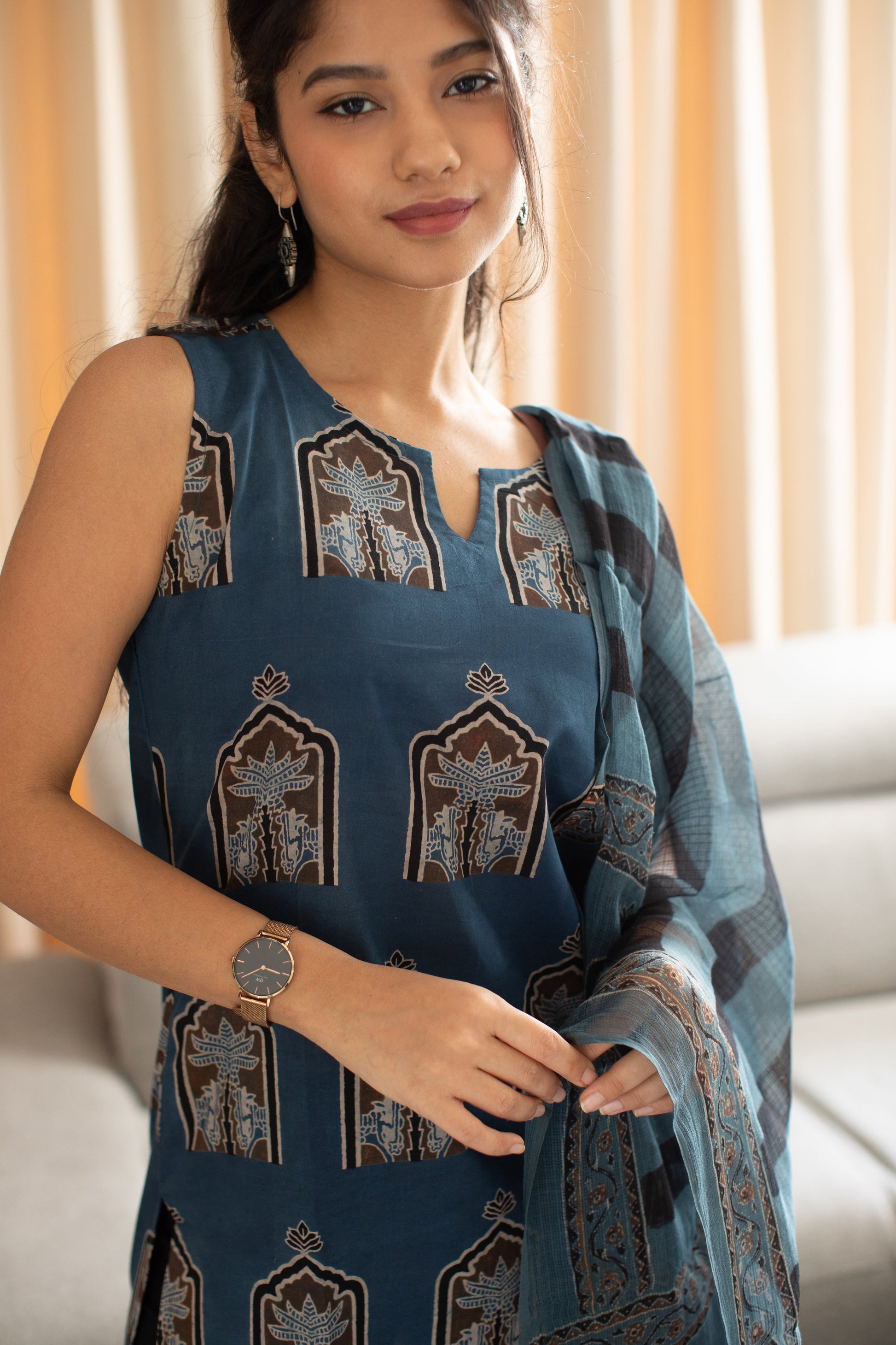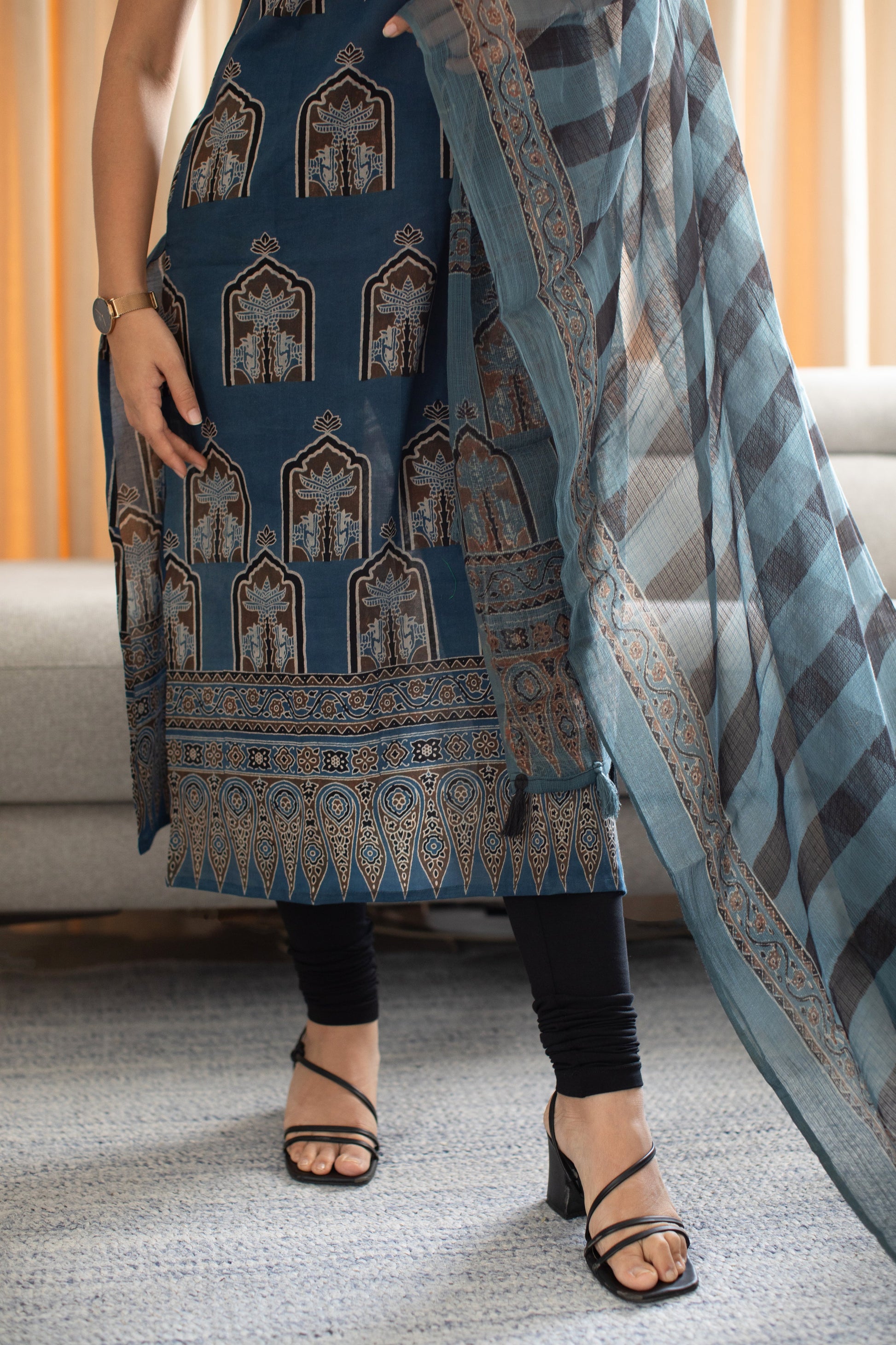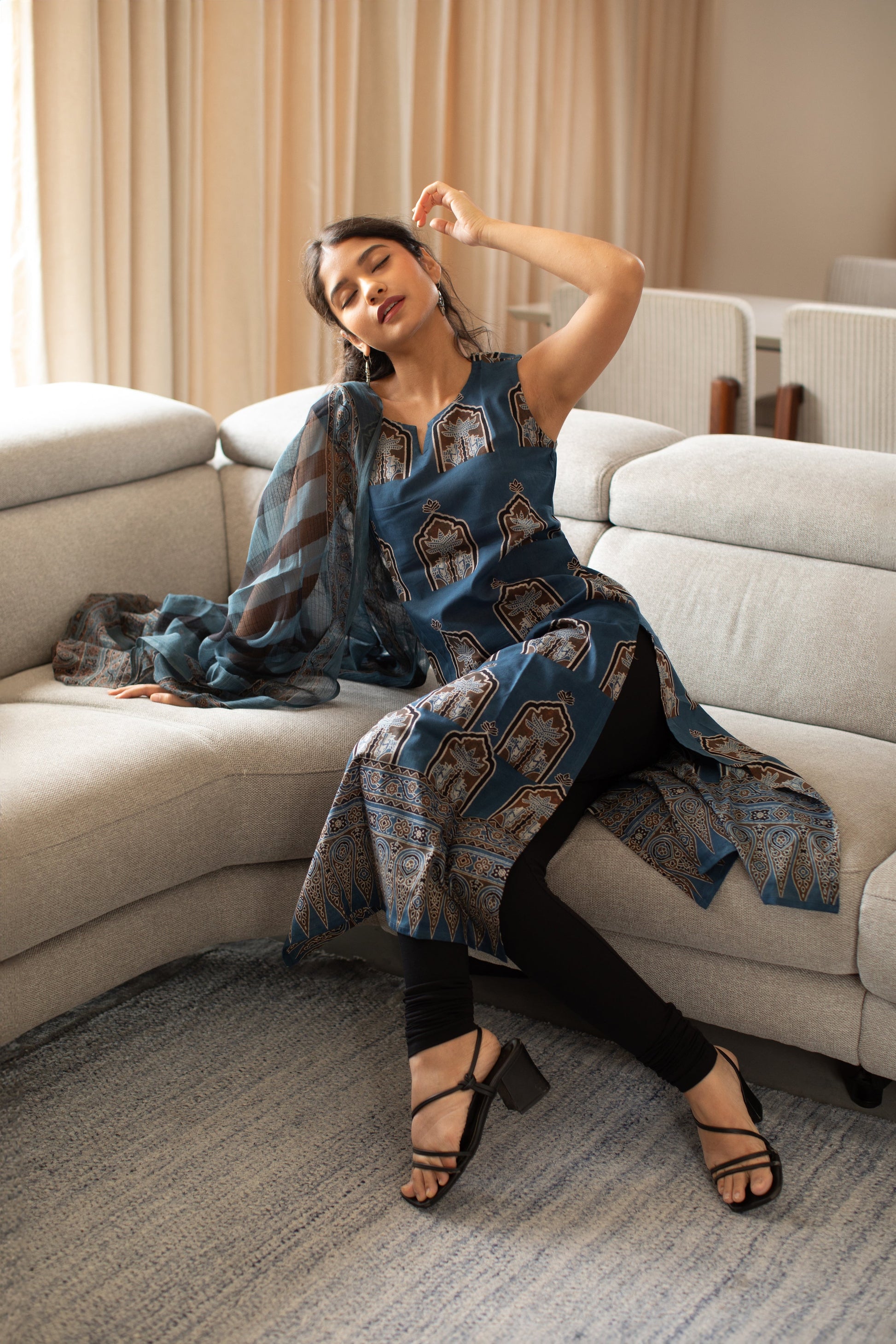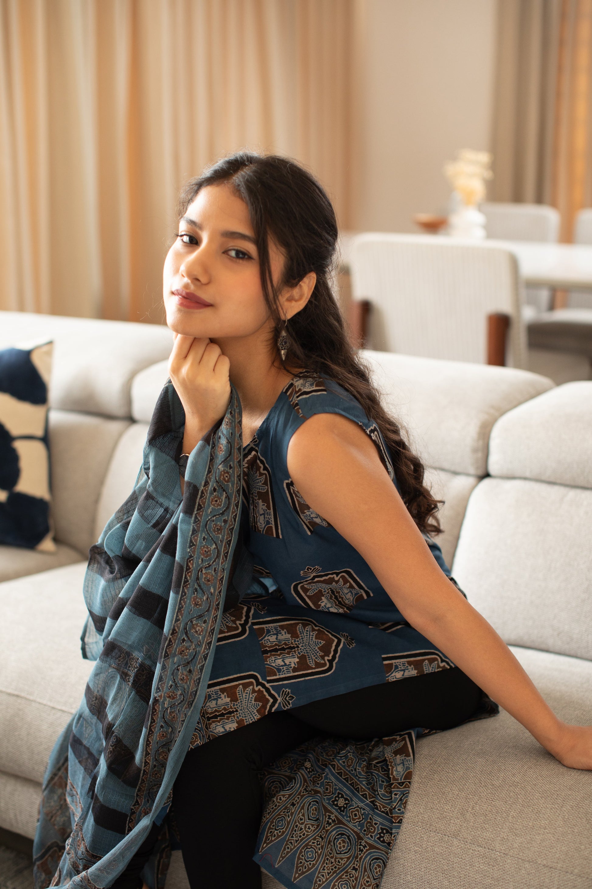 Beautiful blue grey Ajrakh kurta with Pichwai prints, paired with a striped Kota Ajrakh dupatta. Made from soft, breathable cotton, this chic and comfortable college/work outfit is a must-have! This product is a consists of kurta and dupatta only.