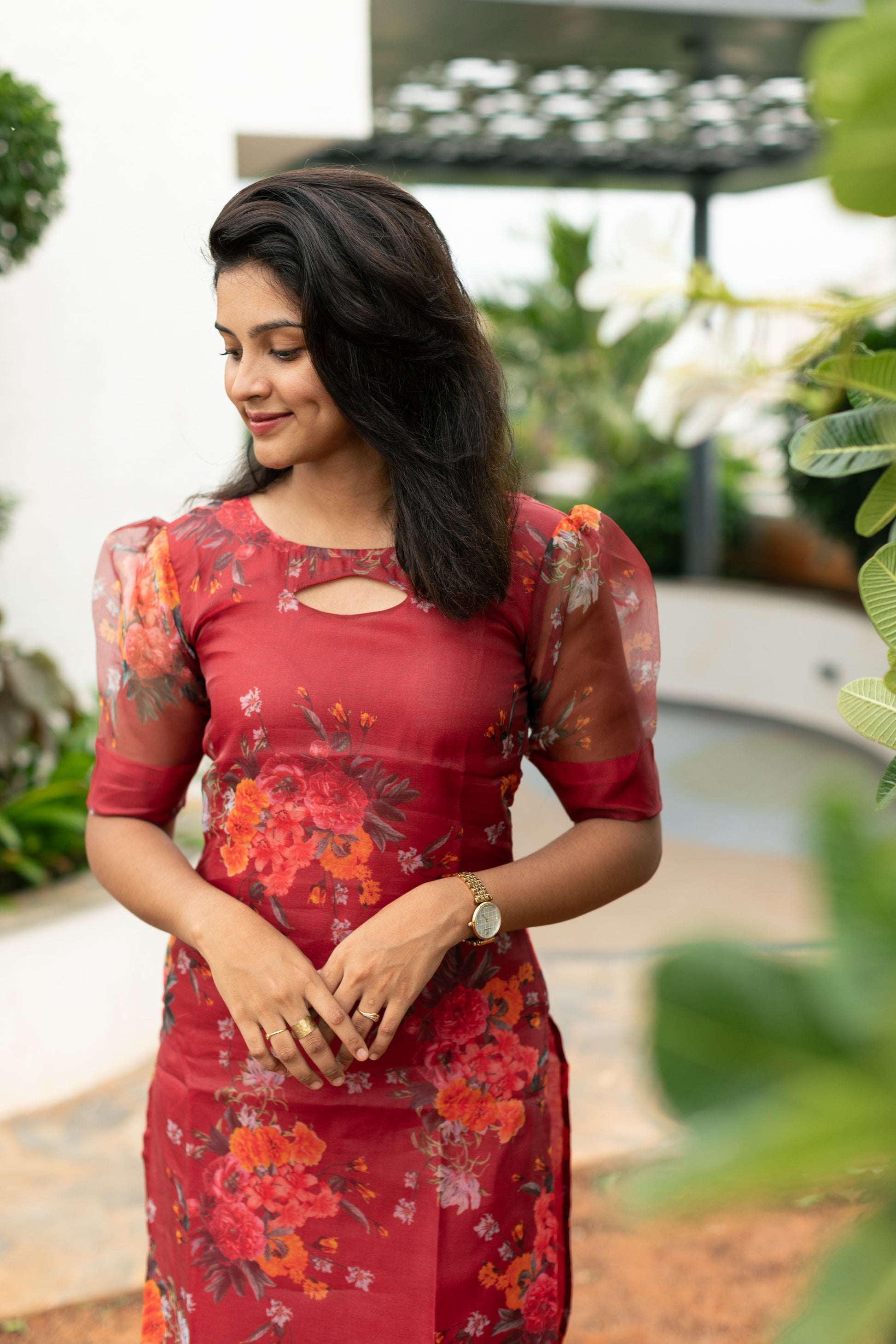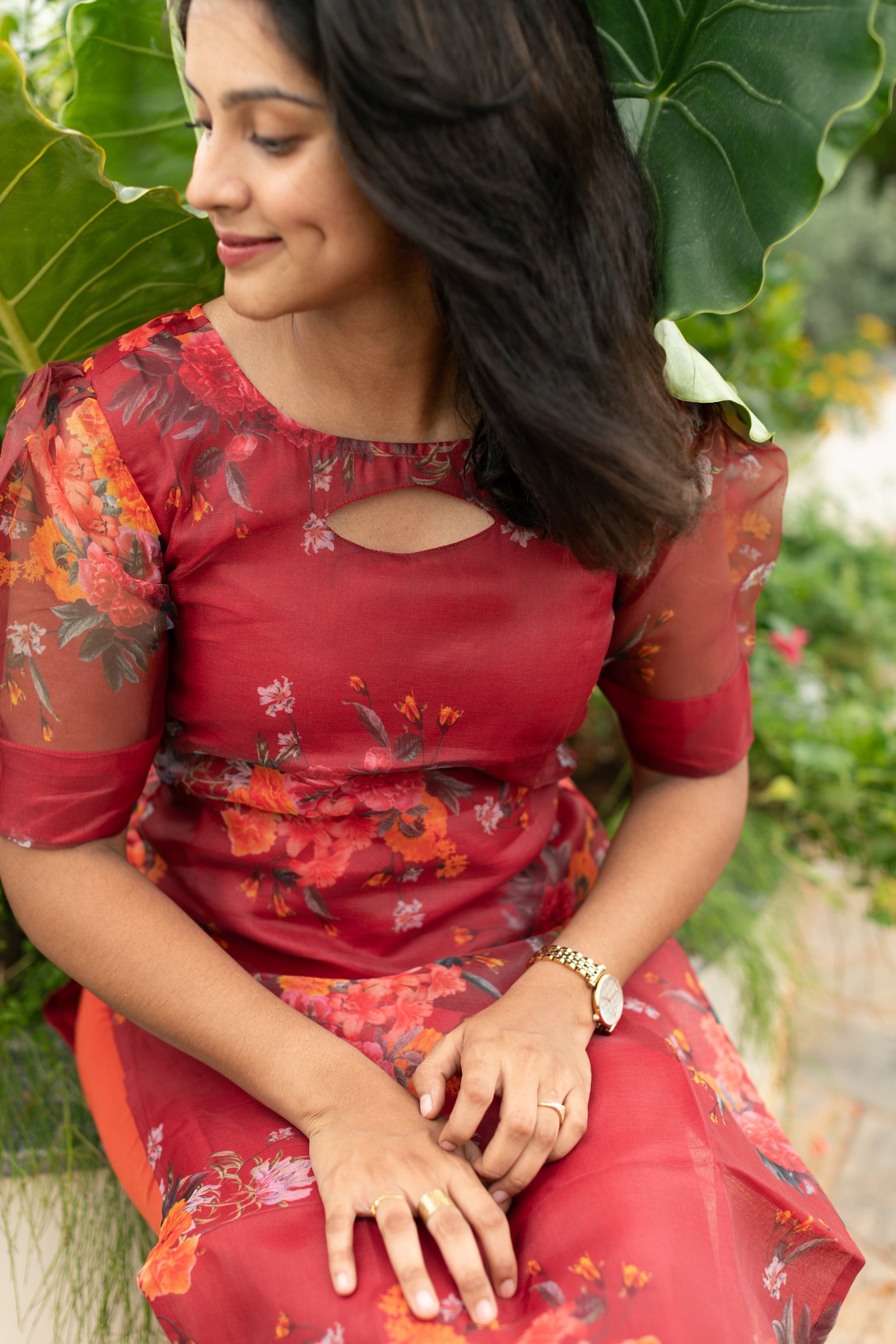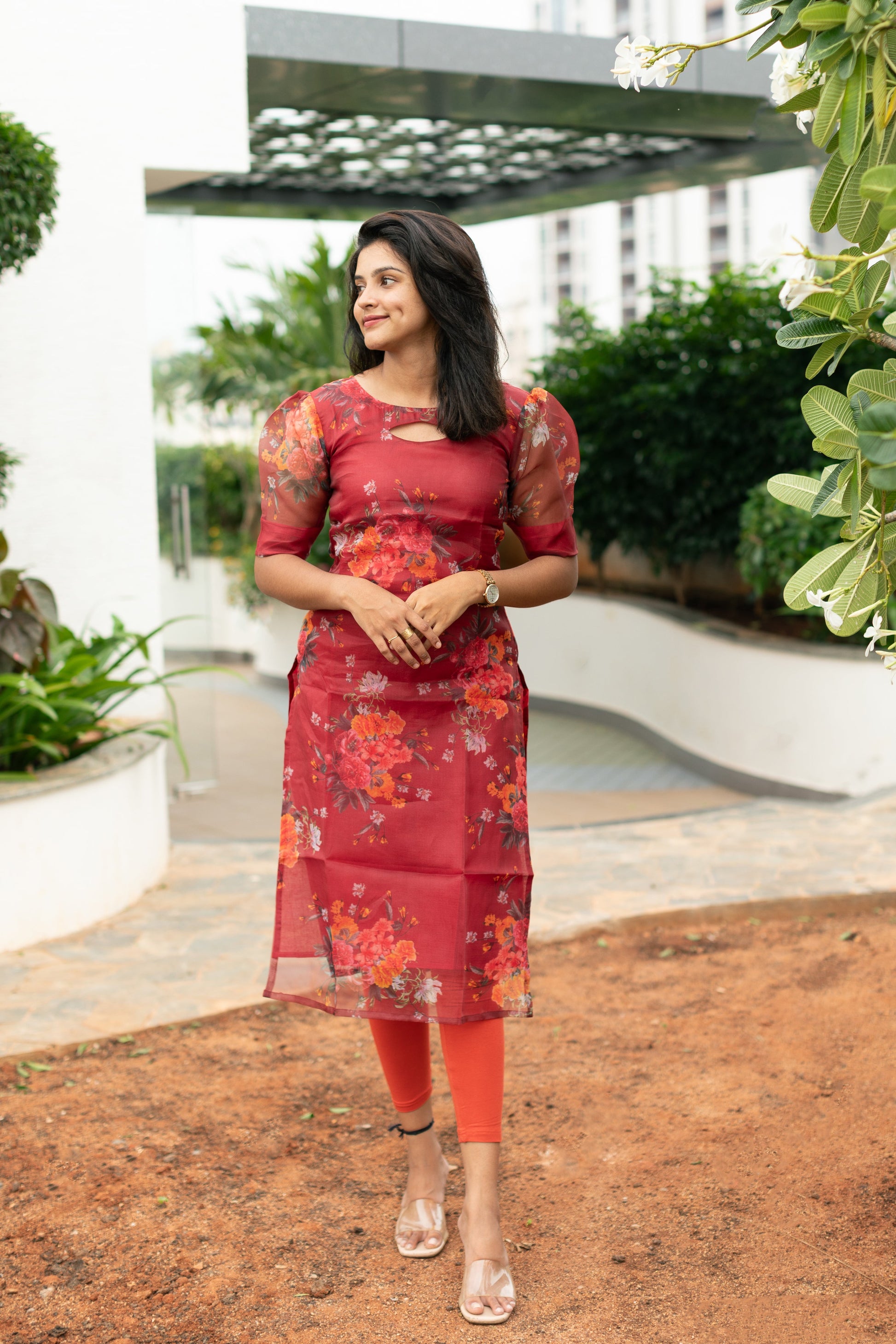 Maroon floral organza kurta. A comfortable and chic college/workwear outfit.