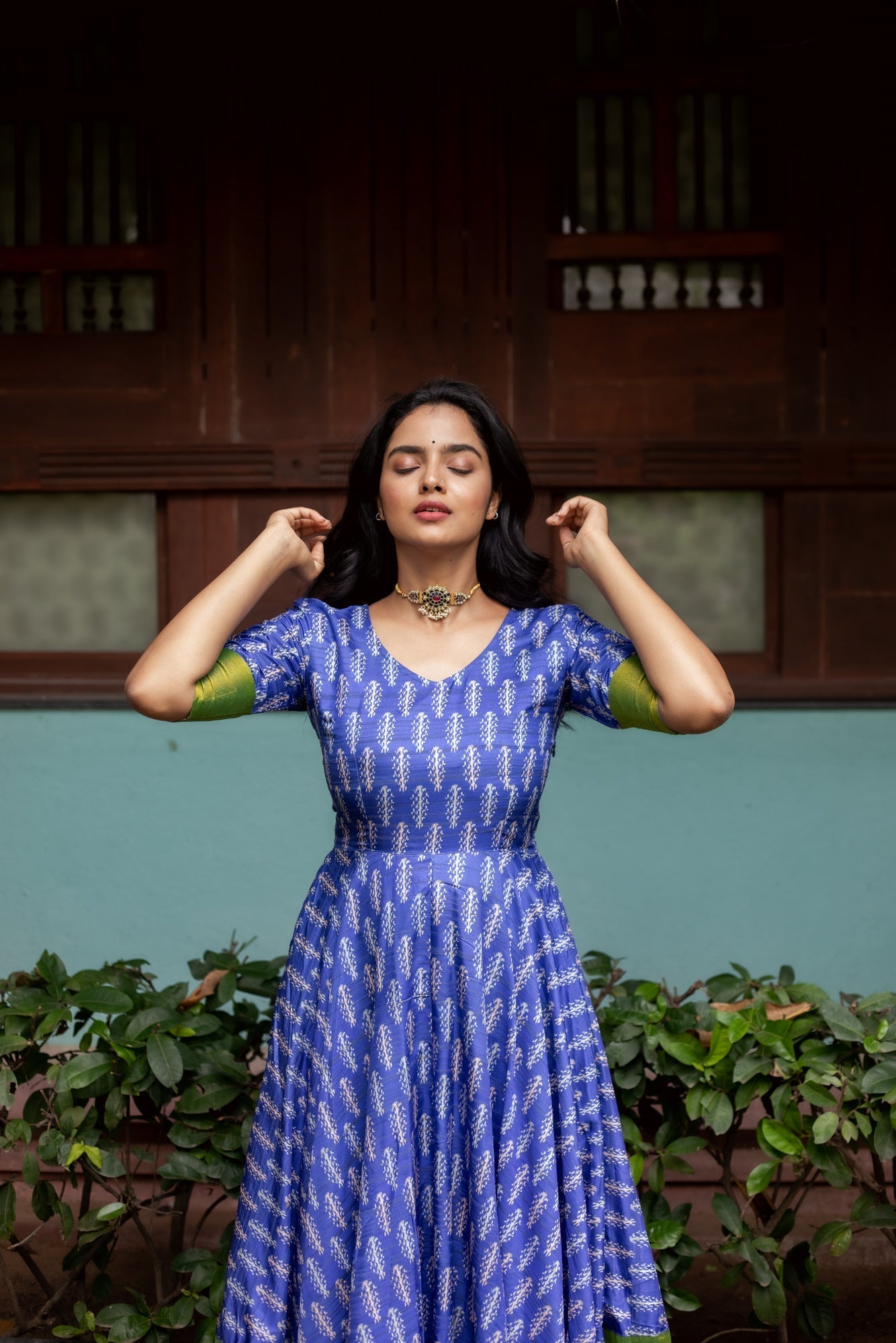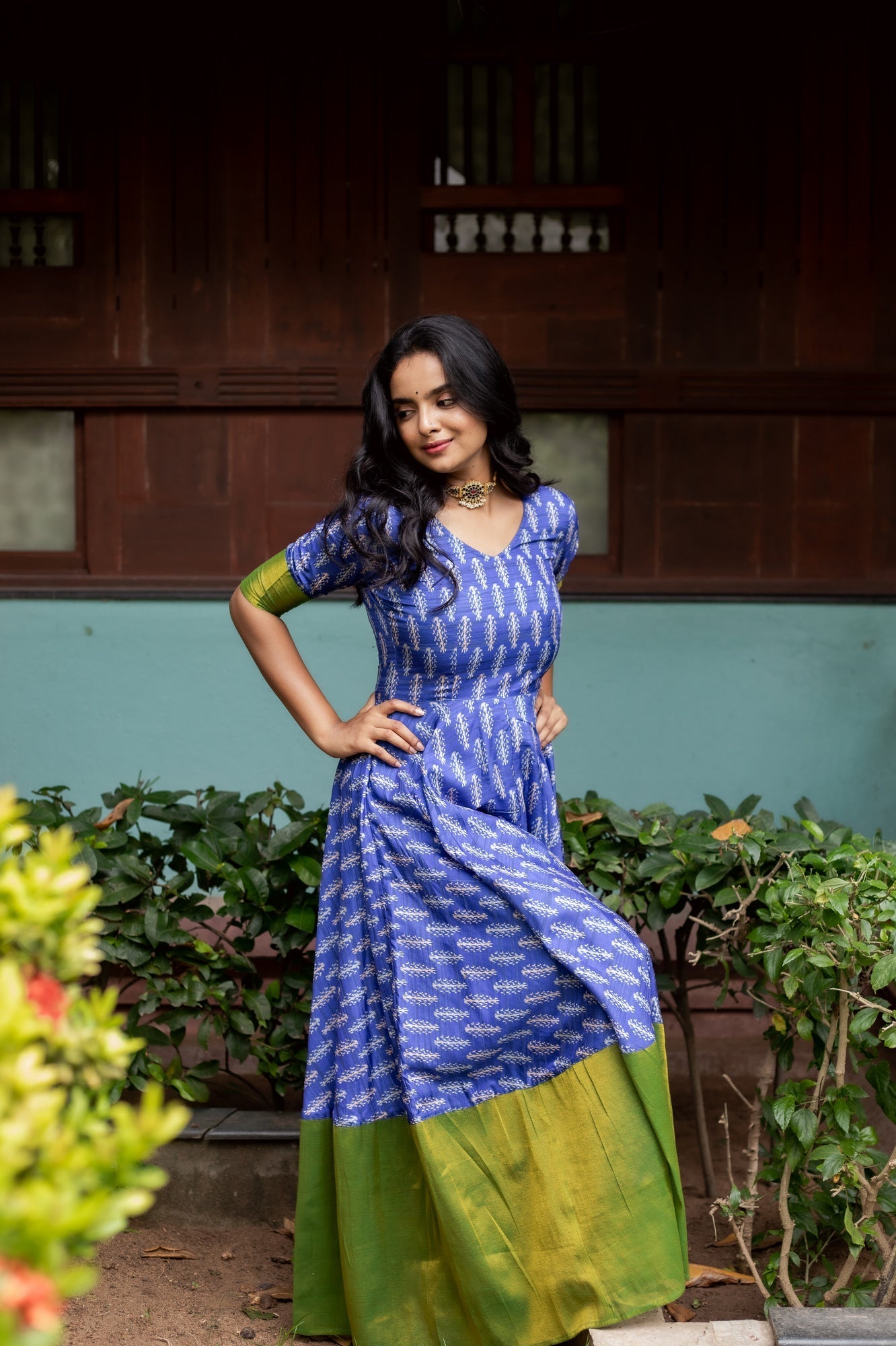 Soft silk Ikat dress with a beautiful tissue border. Made in the flattering fit-and-flare silhouette, this dress is perfect for your festivities and can be worn all season long. Lining provided.