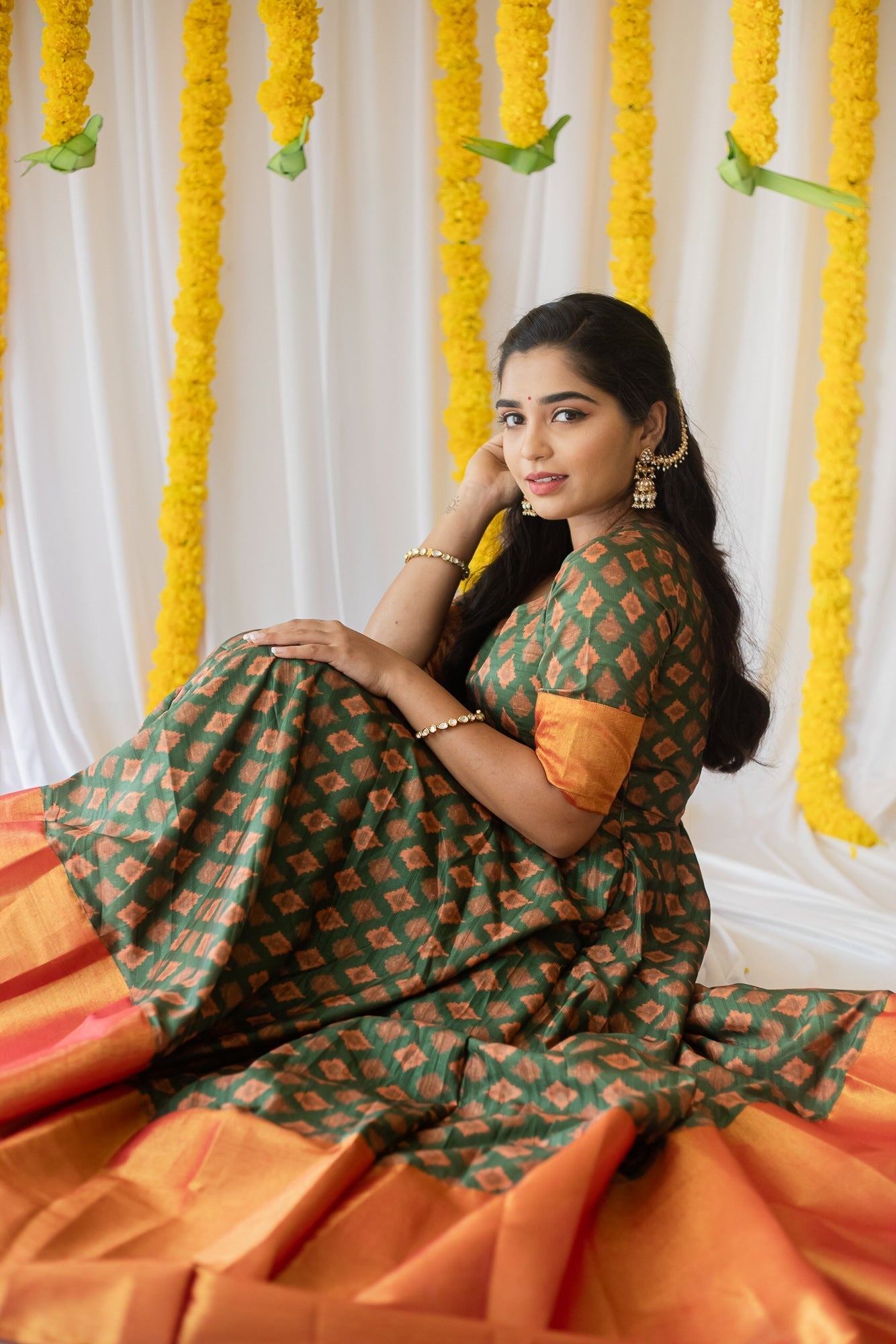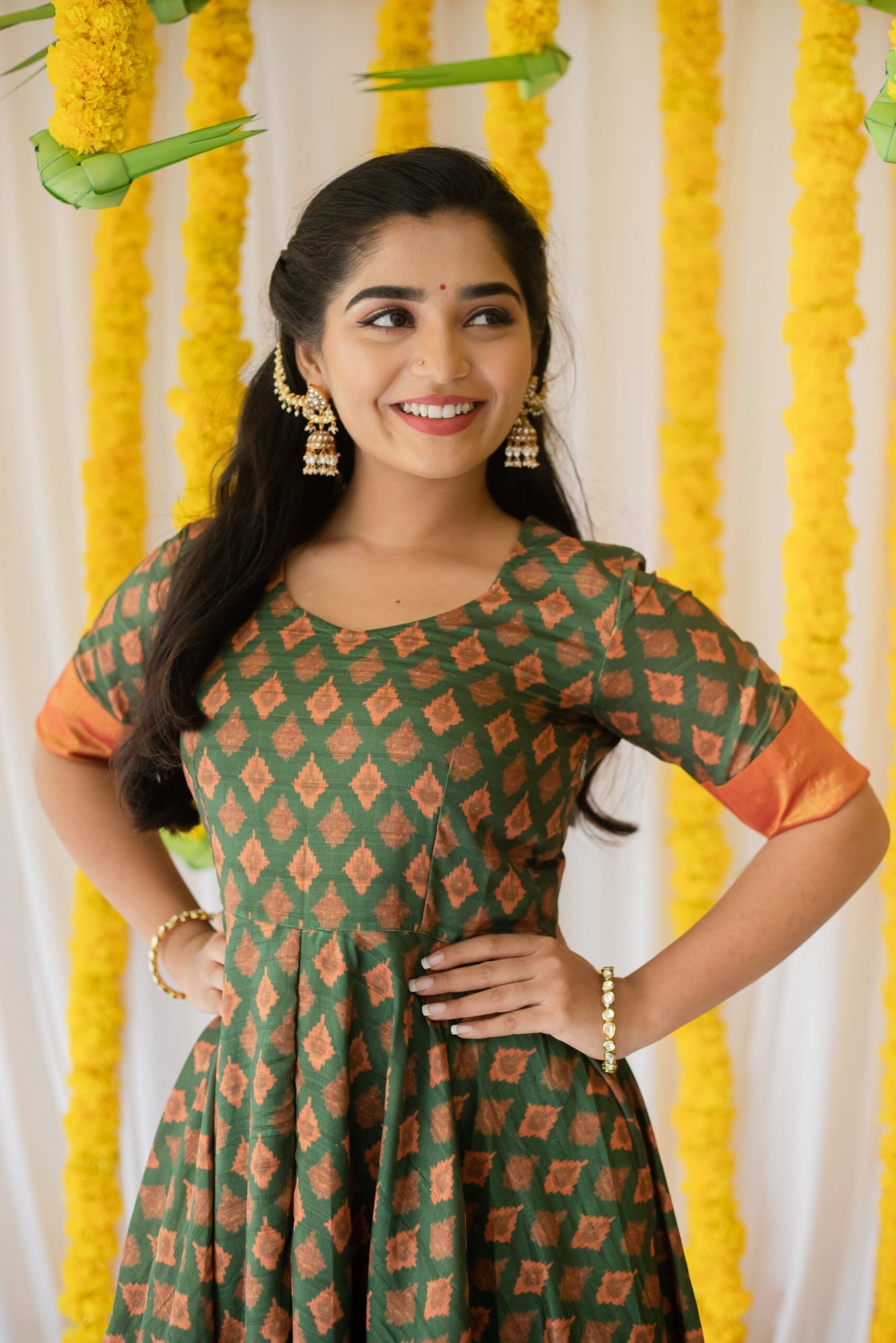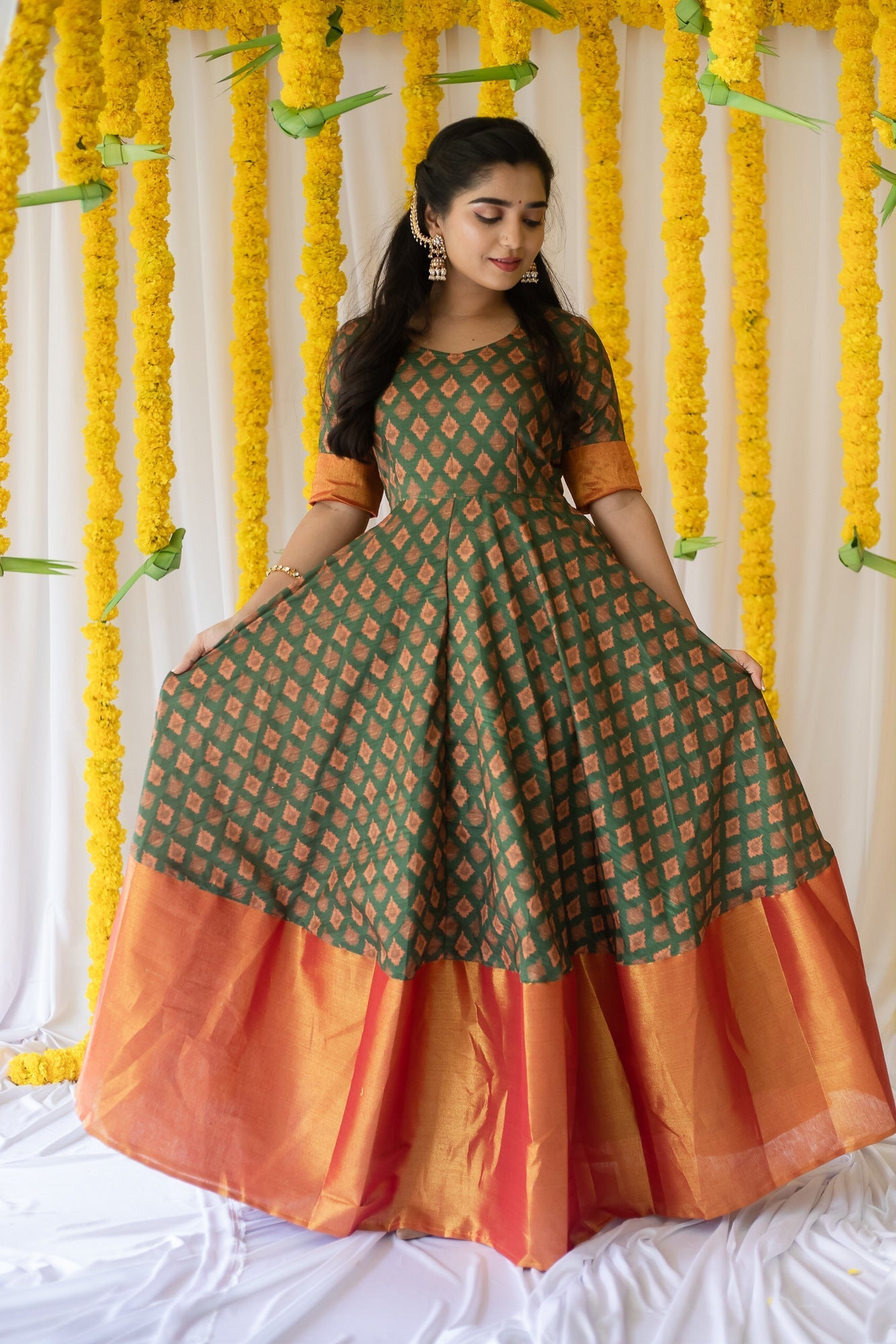 Soft silk Ikat dress with a beautiful tissue border. Made in the flattering fit-and-flare silhouette, this dress is perfect for your festivities and can be worn all season long. Lining provided.