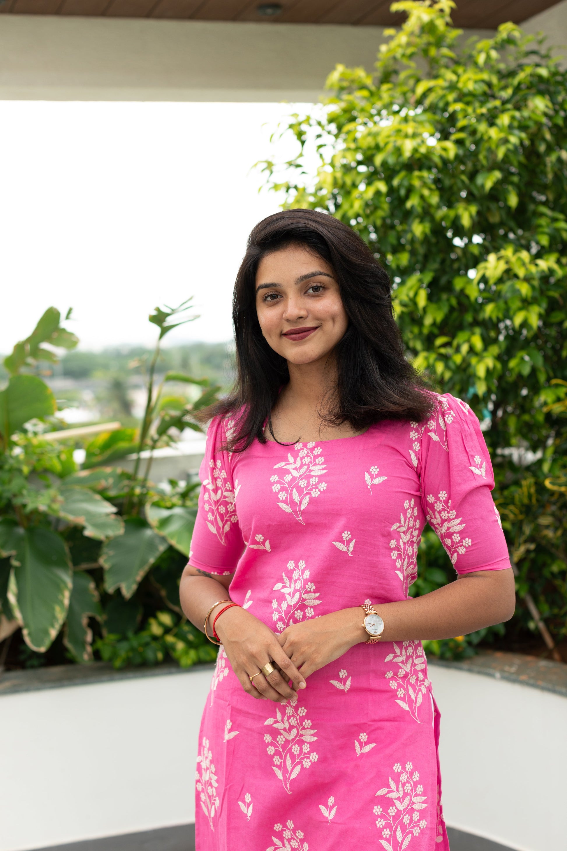 Pretty pink cotton kurta with floral embroidery. A comfortable and chic college/workwear outfit.