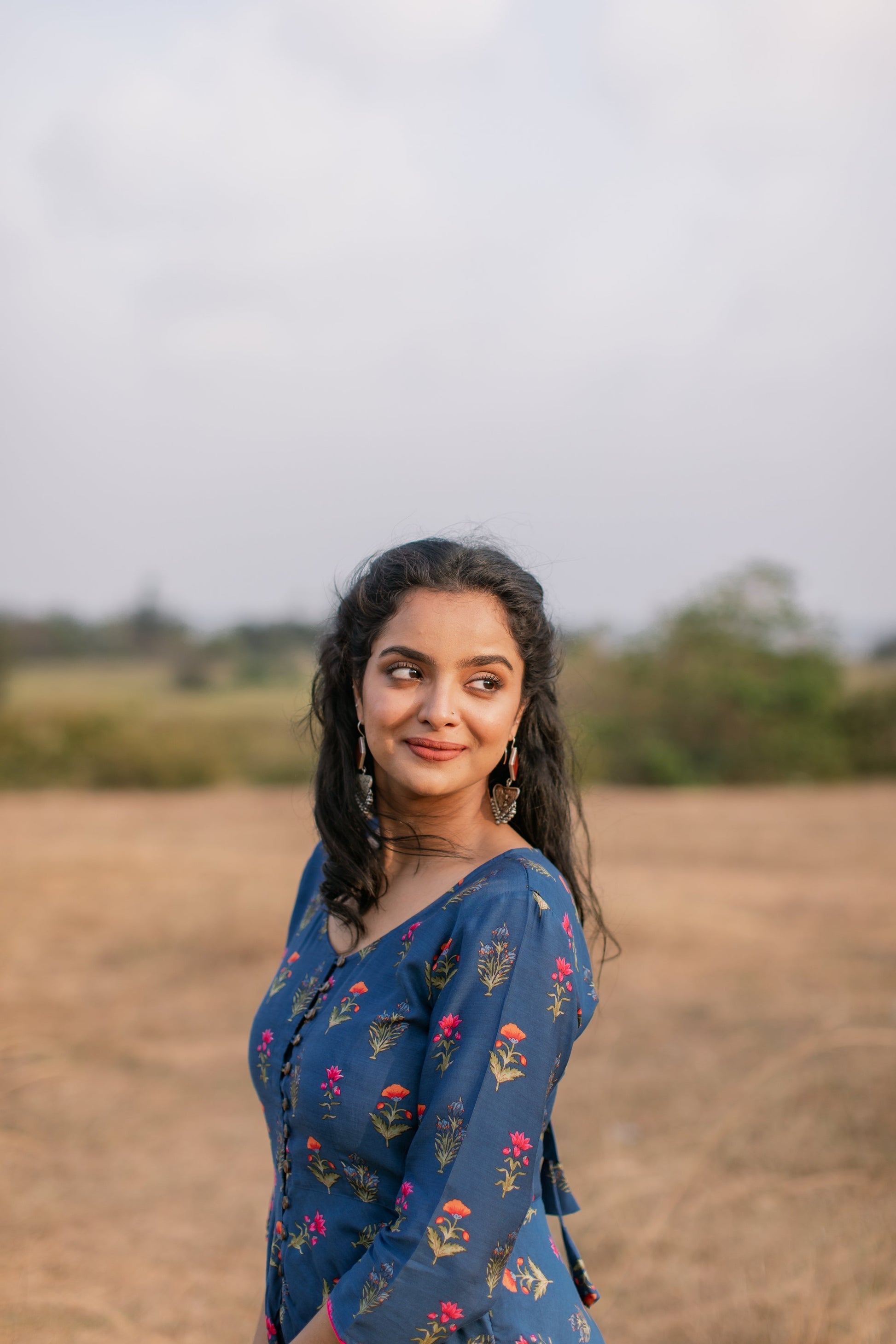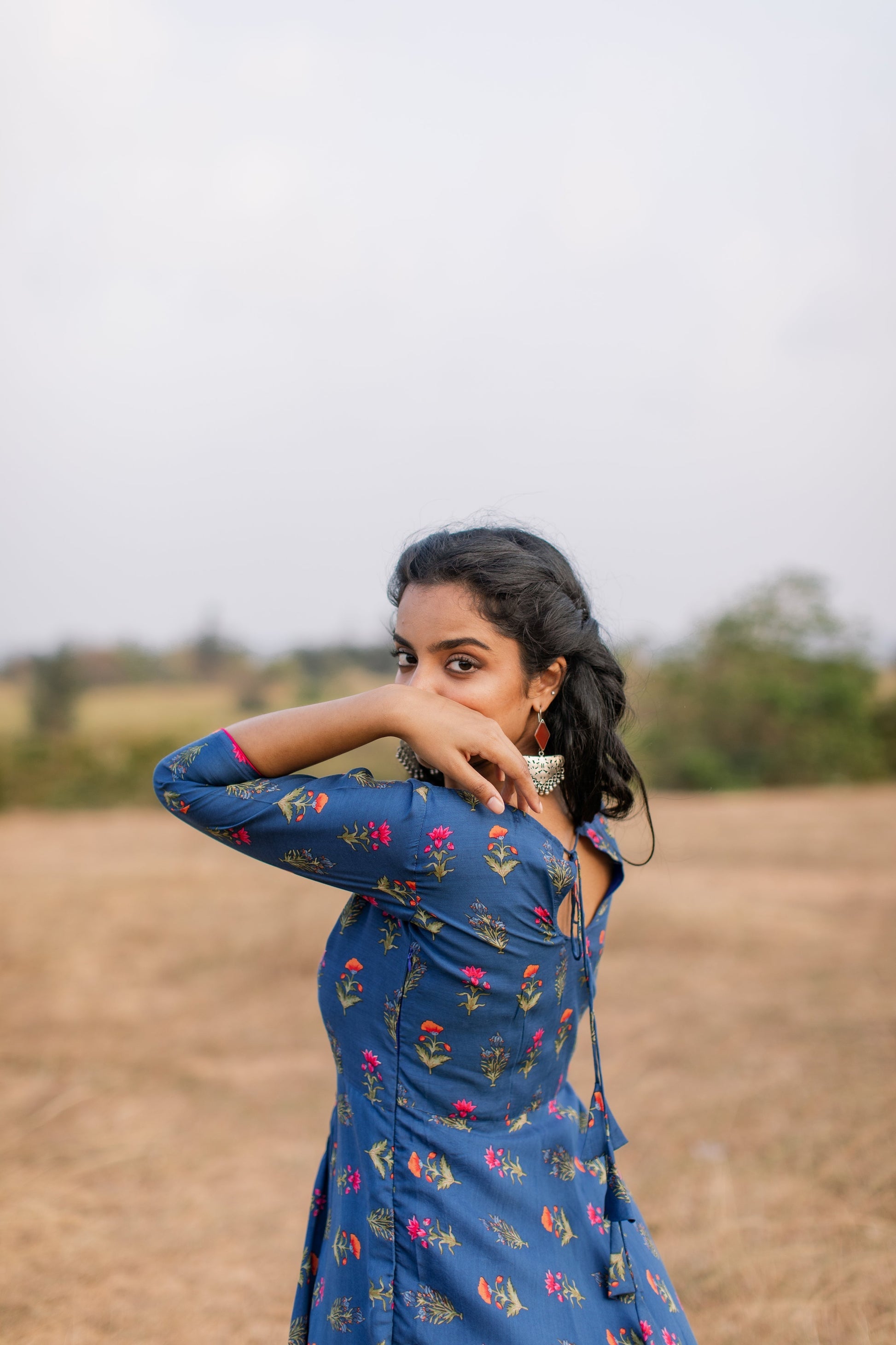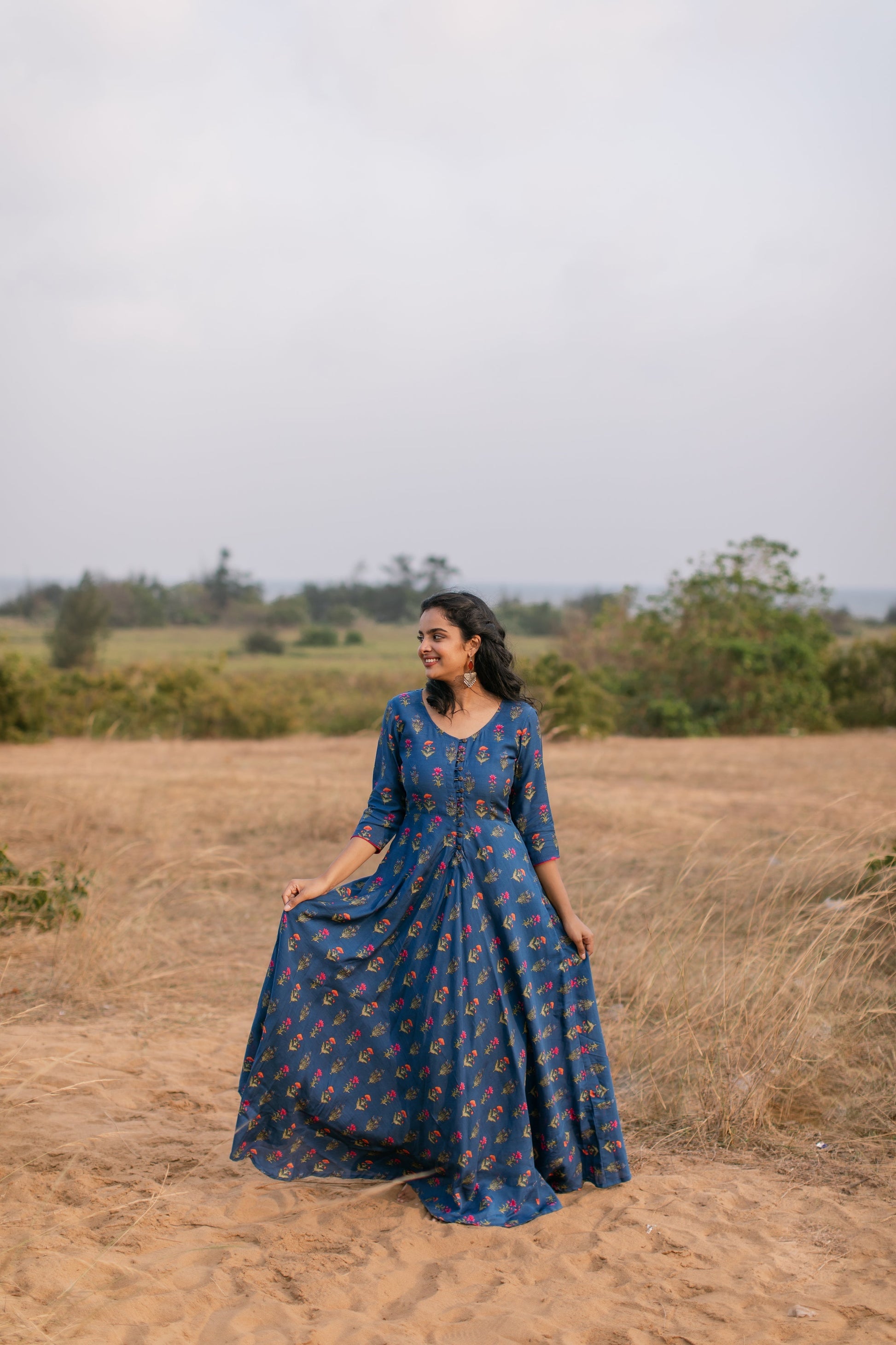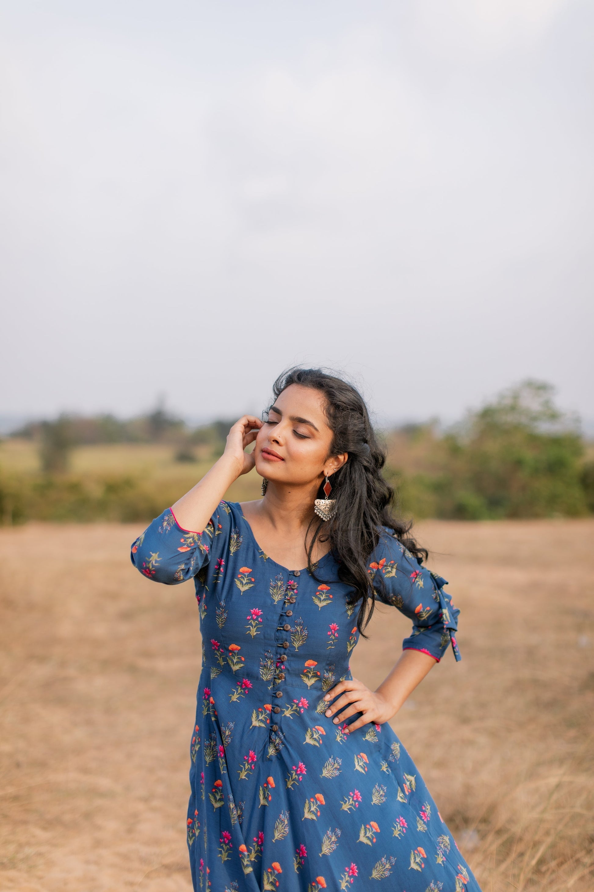 Beautiful Prussian blue floral dress in classic fit-and-flare silhouette. A light and flouncy dress that flatters your figure in all the right ways. Lining provided.