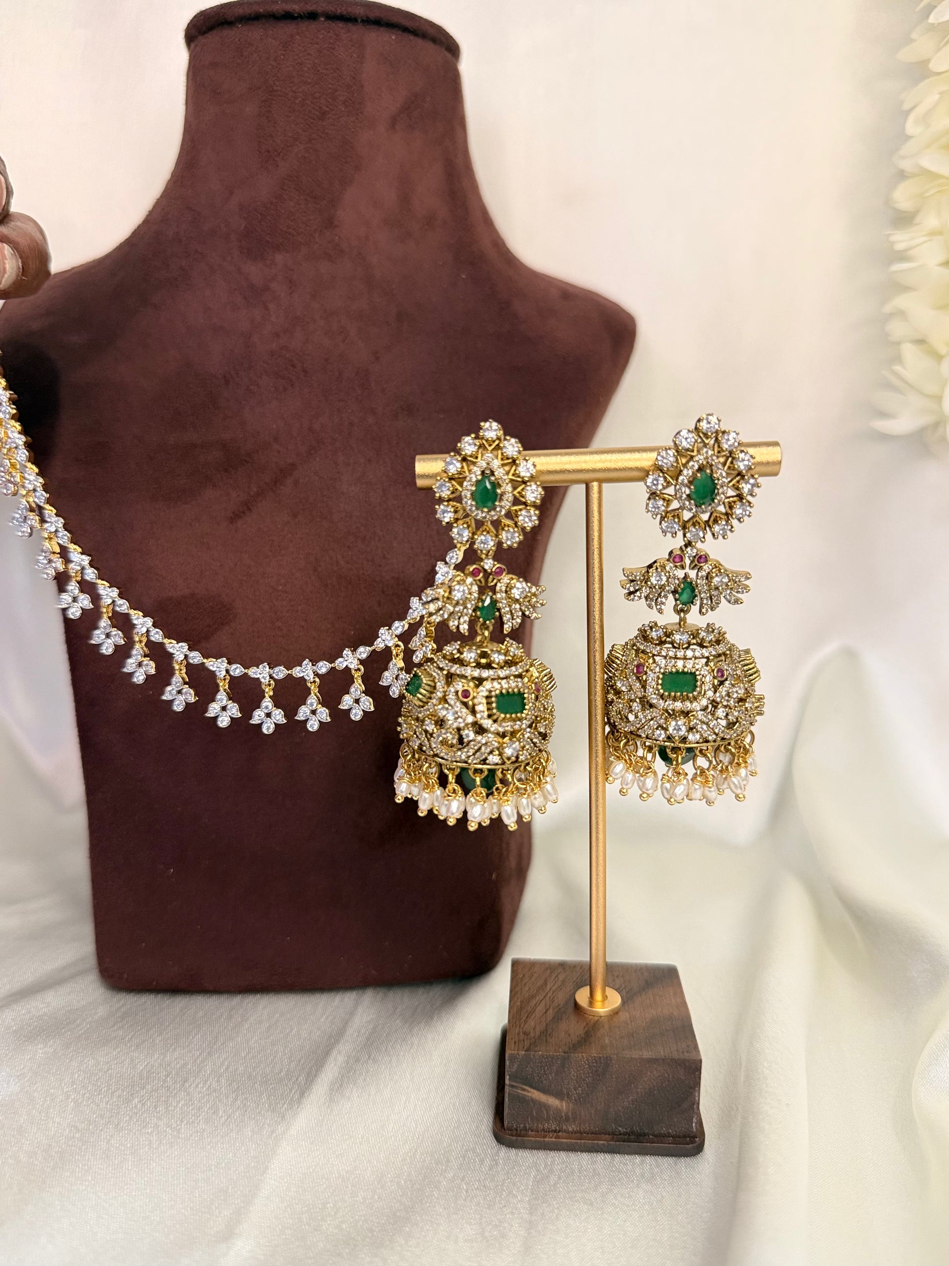 A show-stopping bridal jhumka set adorned with emerald-toned stones and sparkling white AD stone embellishments. The dome jhumkas feature layered pearl hangings for dramatic movement.