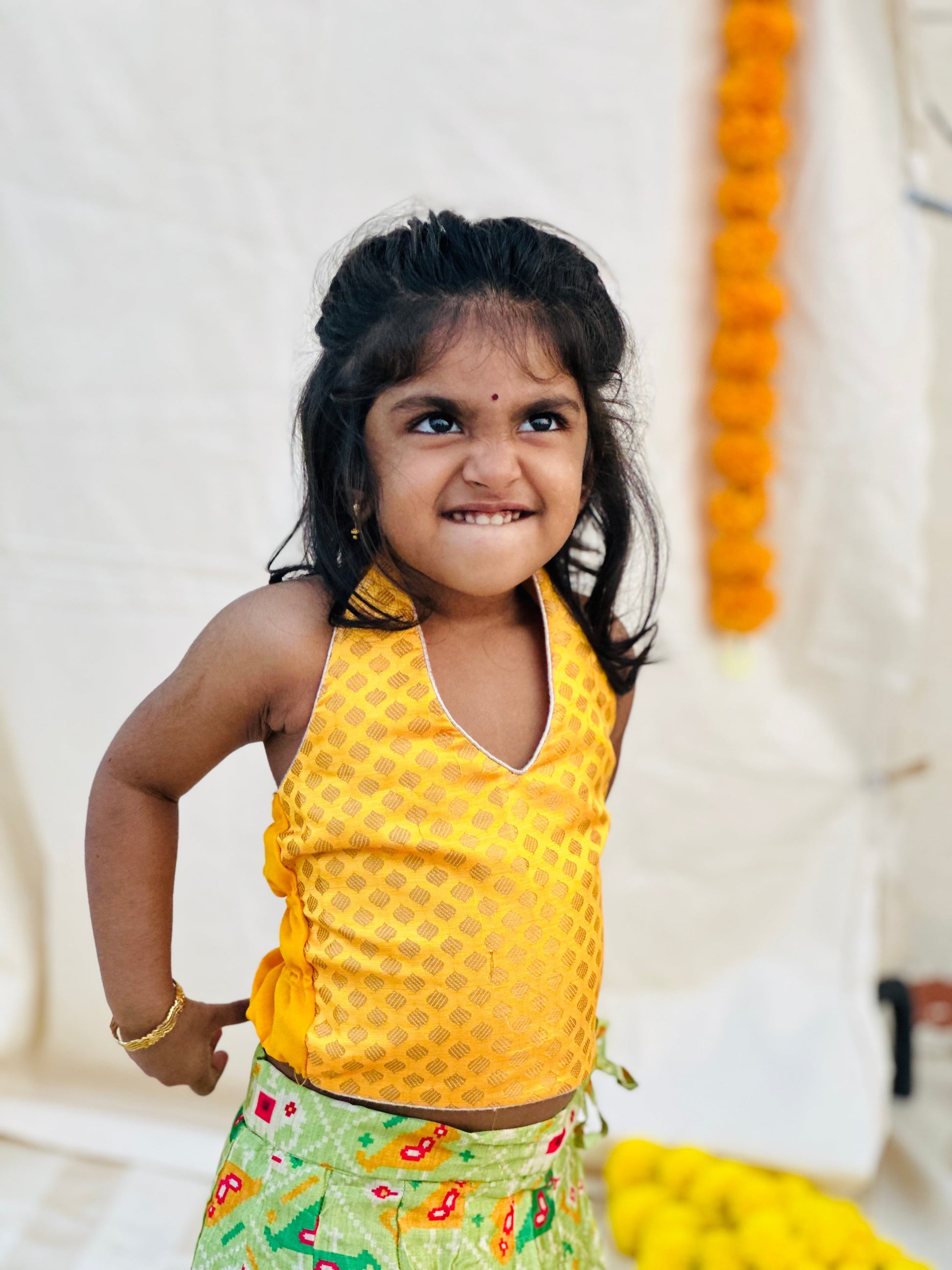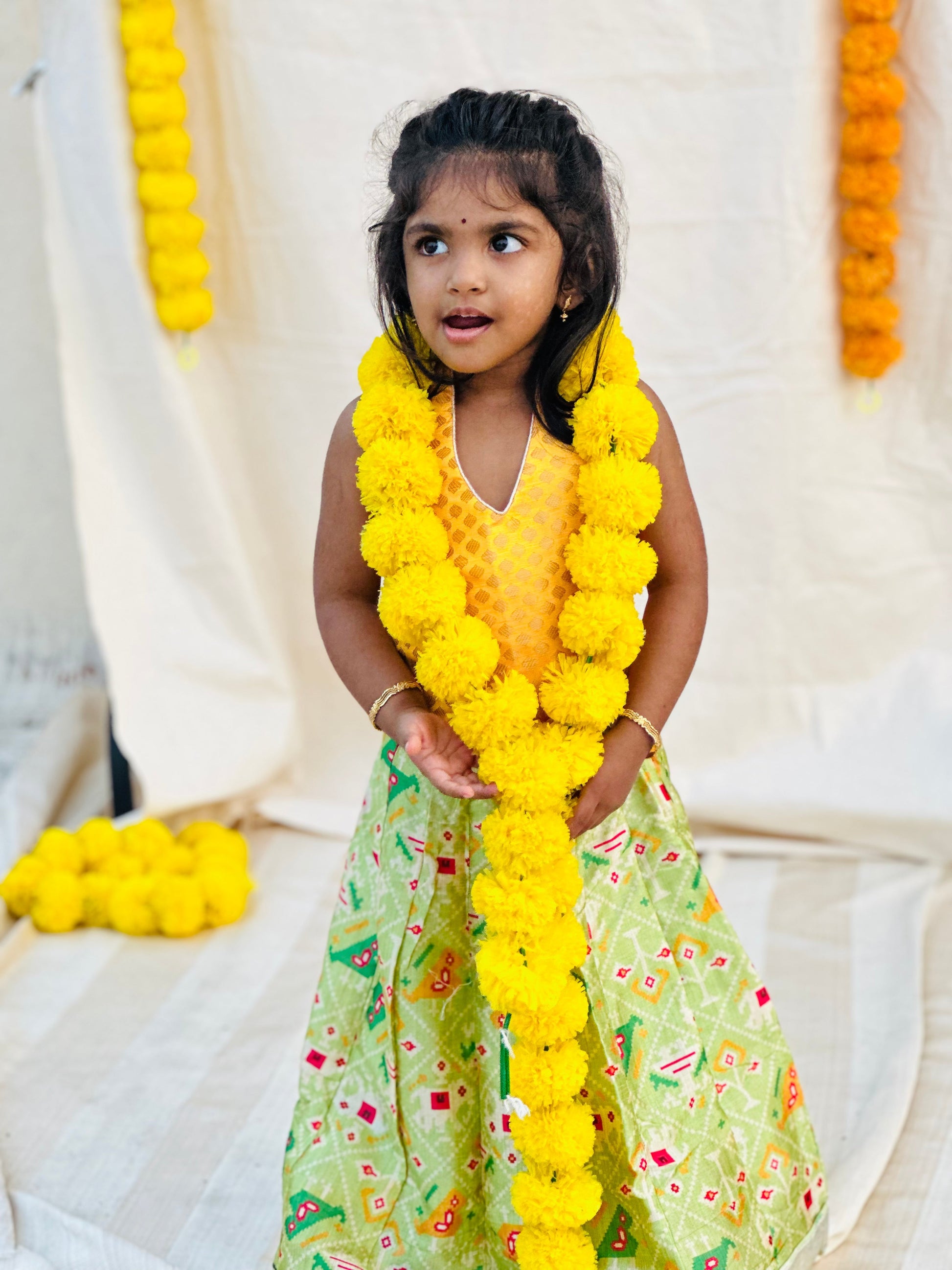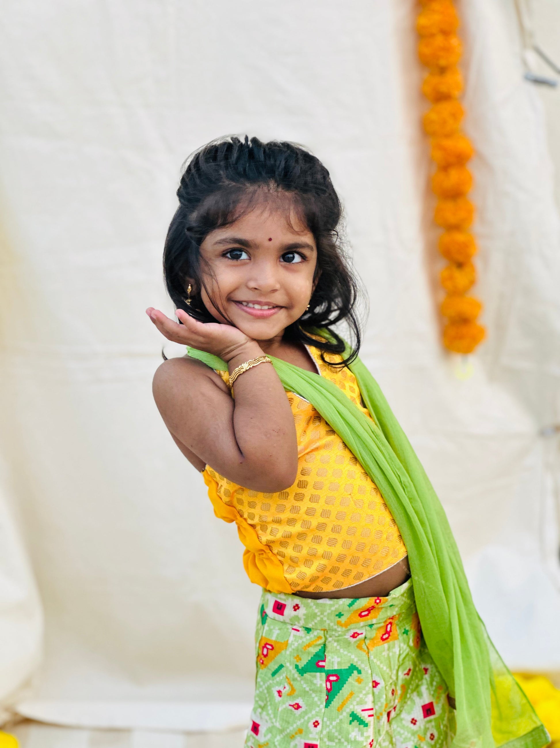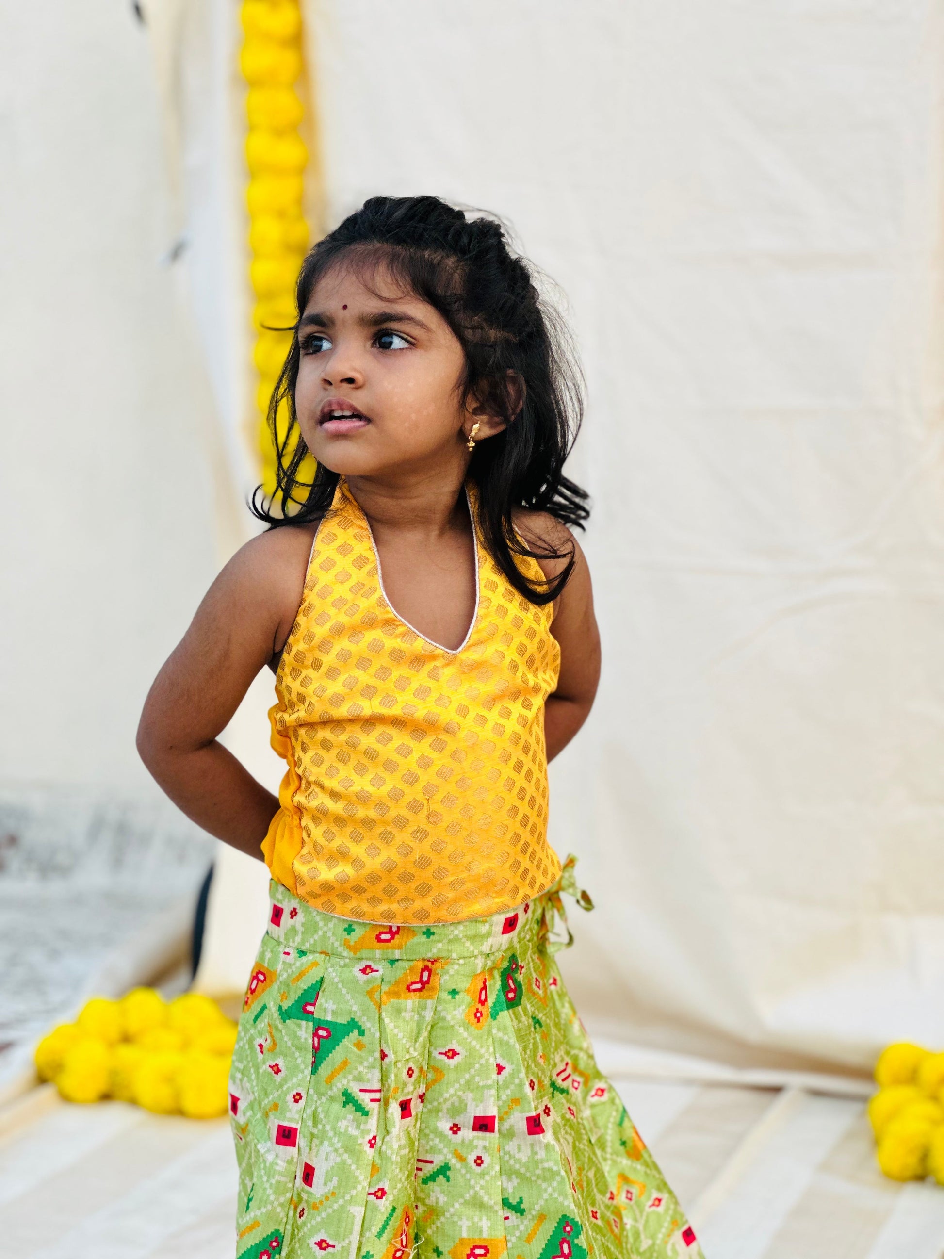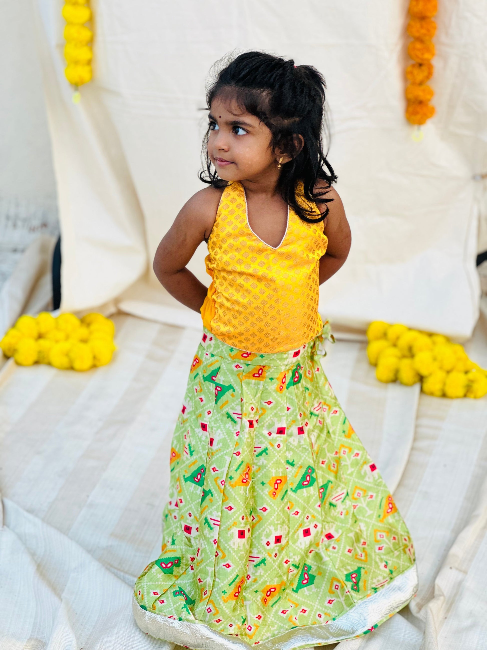 Yellow brocade halter neck top with green patola silk skirt and green chiffon dupatta. A beautiful 3-piece ethnic set for your little princess! Lining provided.