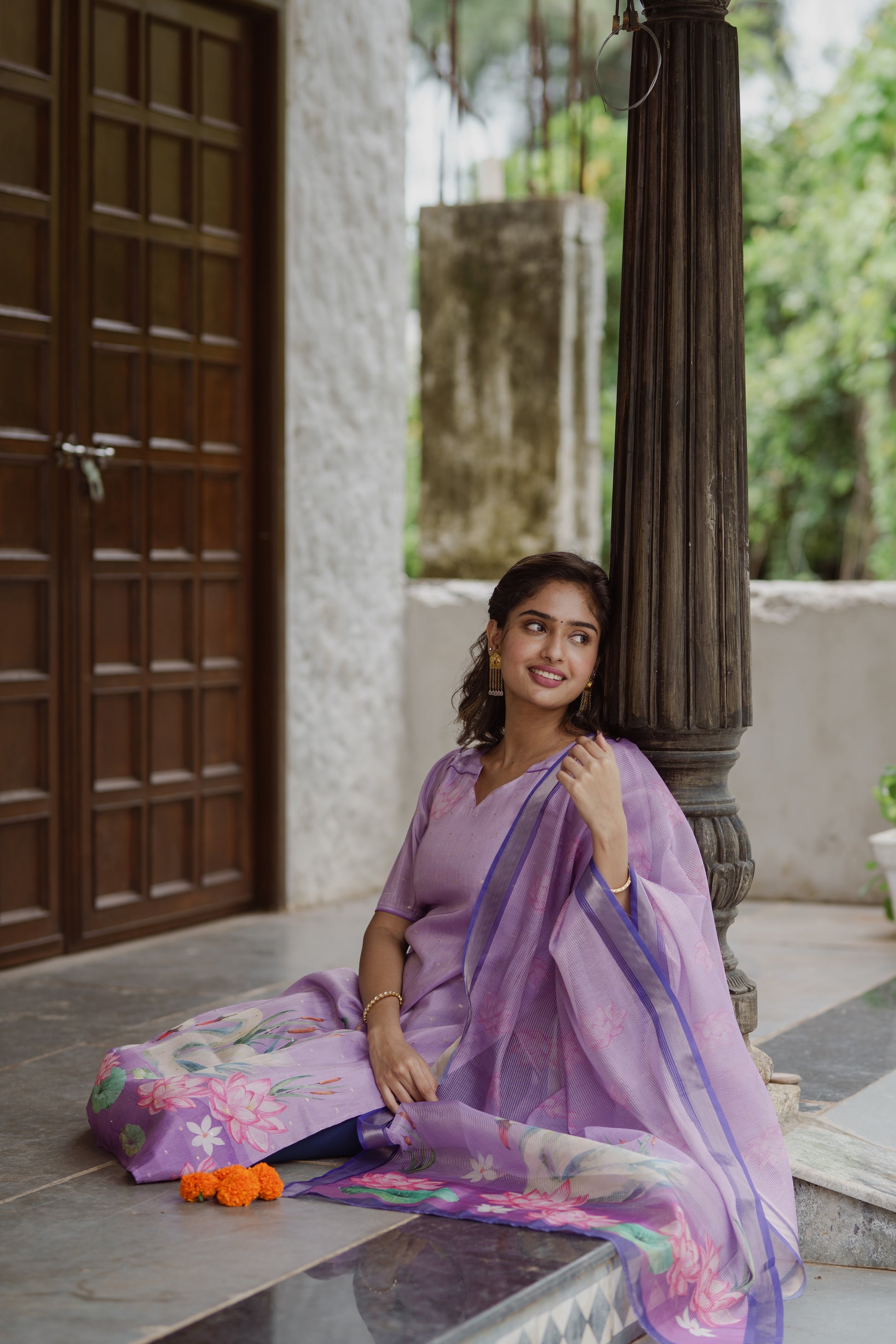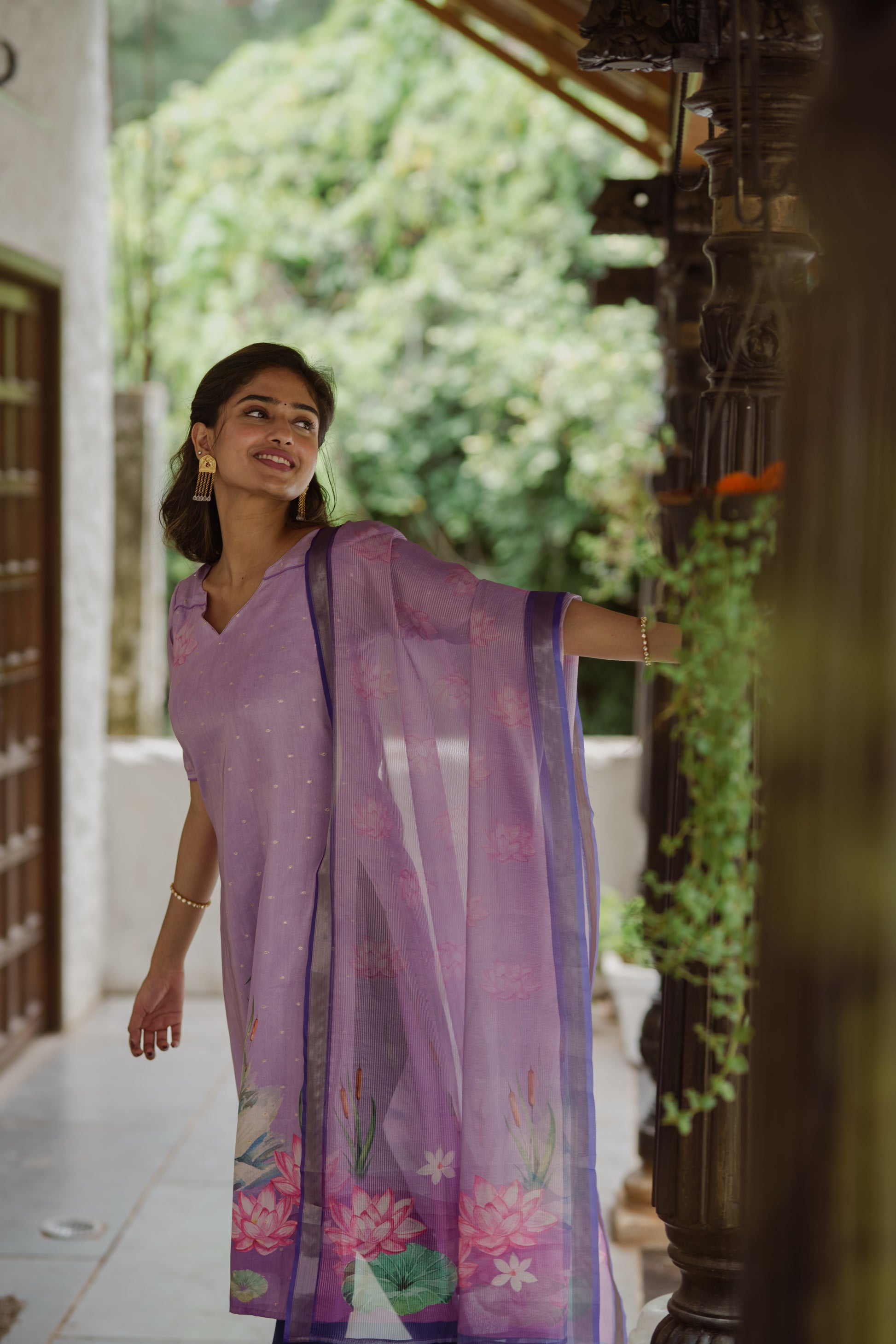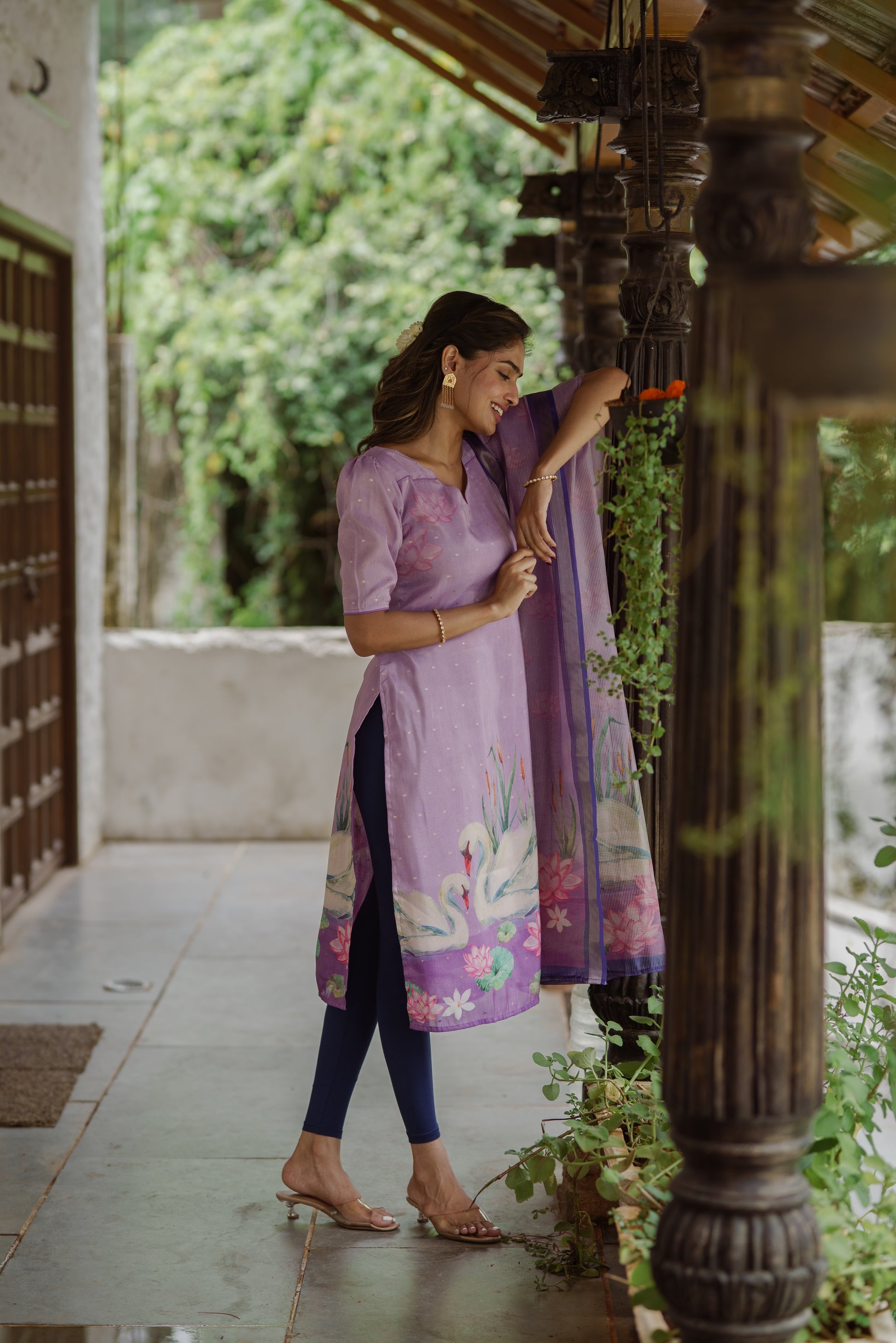 This beautiful lavender kurta showcases intricate lotus and swan prints along the hem, enhanced by small buttas scattered elegantly across the fabric. Paired with a Kota dupatta featuring a matching lotus design, it creates a simple yet festive ensemble, perfect for adding subtle sophistication to your celebratory wardrobe.