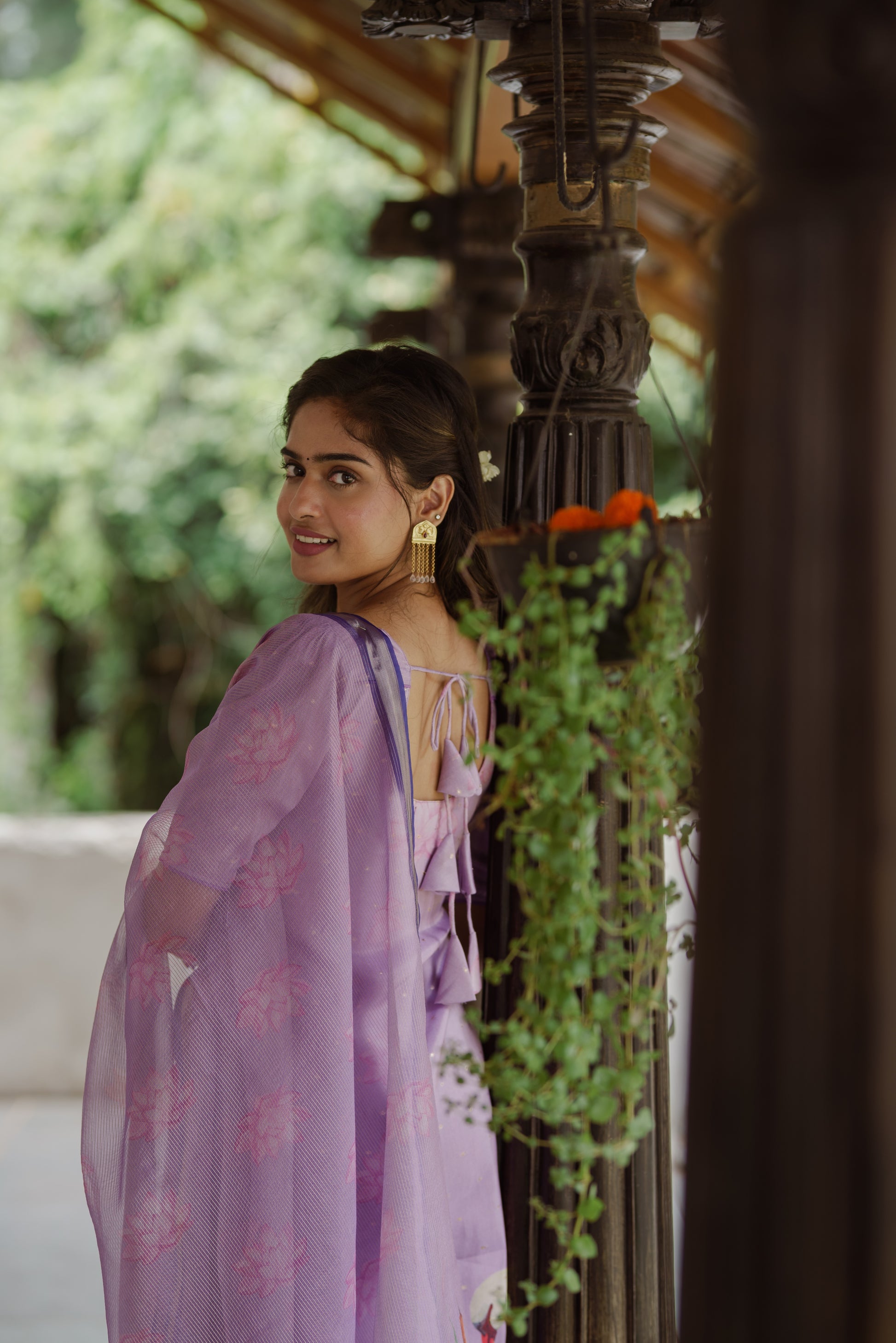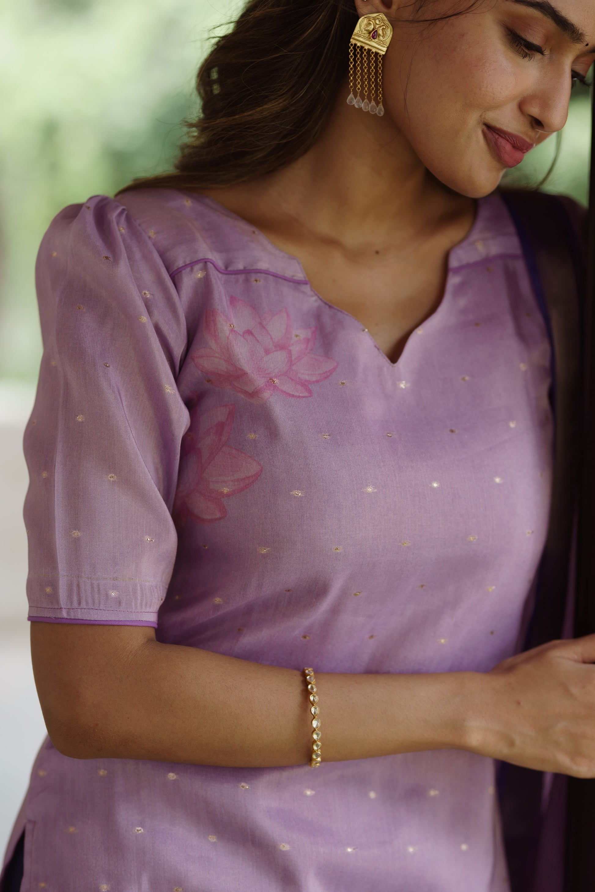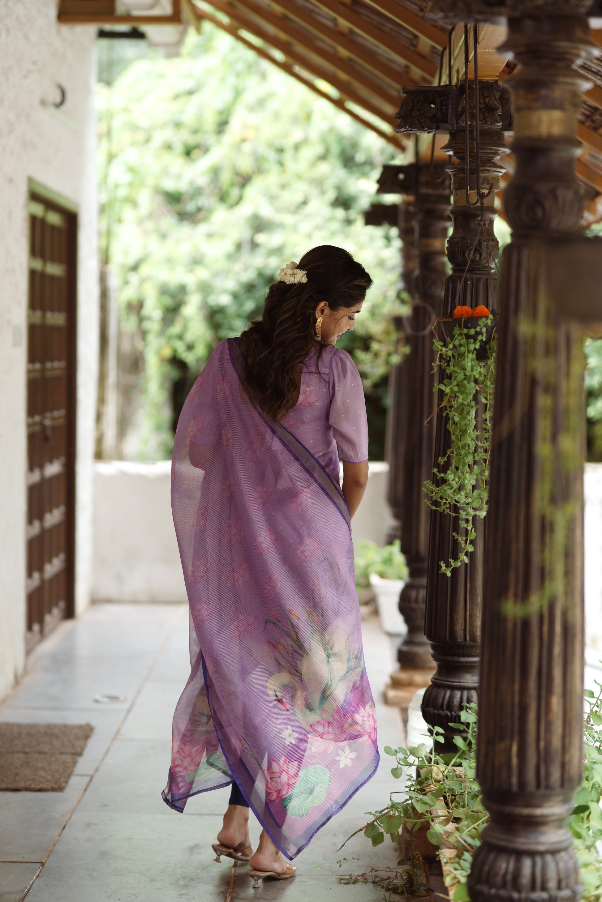 This beautiful lavender kurta showcases intricate lotus and swan prints along the hem, enhanced by small buttas scattered elegantly across the fabric. Paired with a Kota dupatta featuring a matching lotus design, it creates a simple yet festive ensemble, perfect for adding subtle sophistication to your celebratory wardrobe.