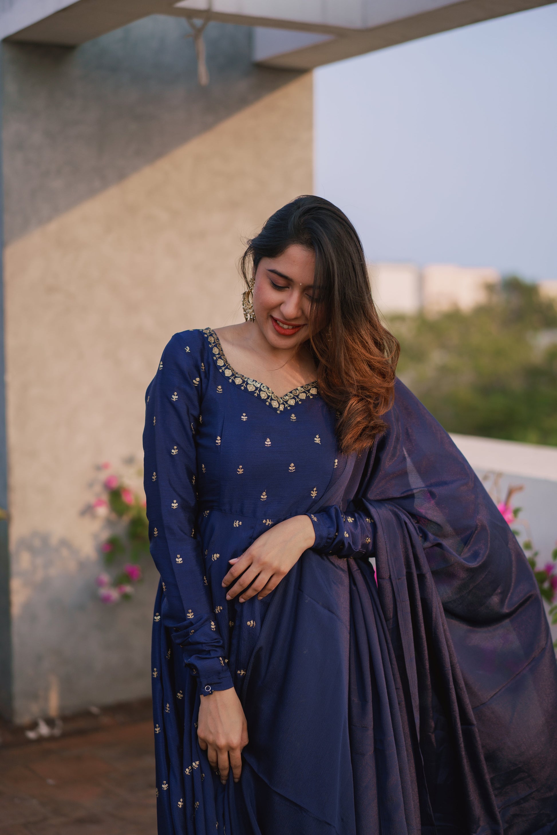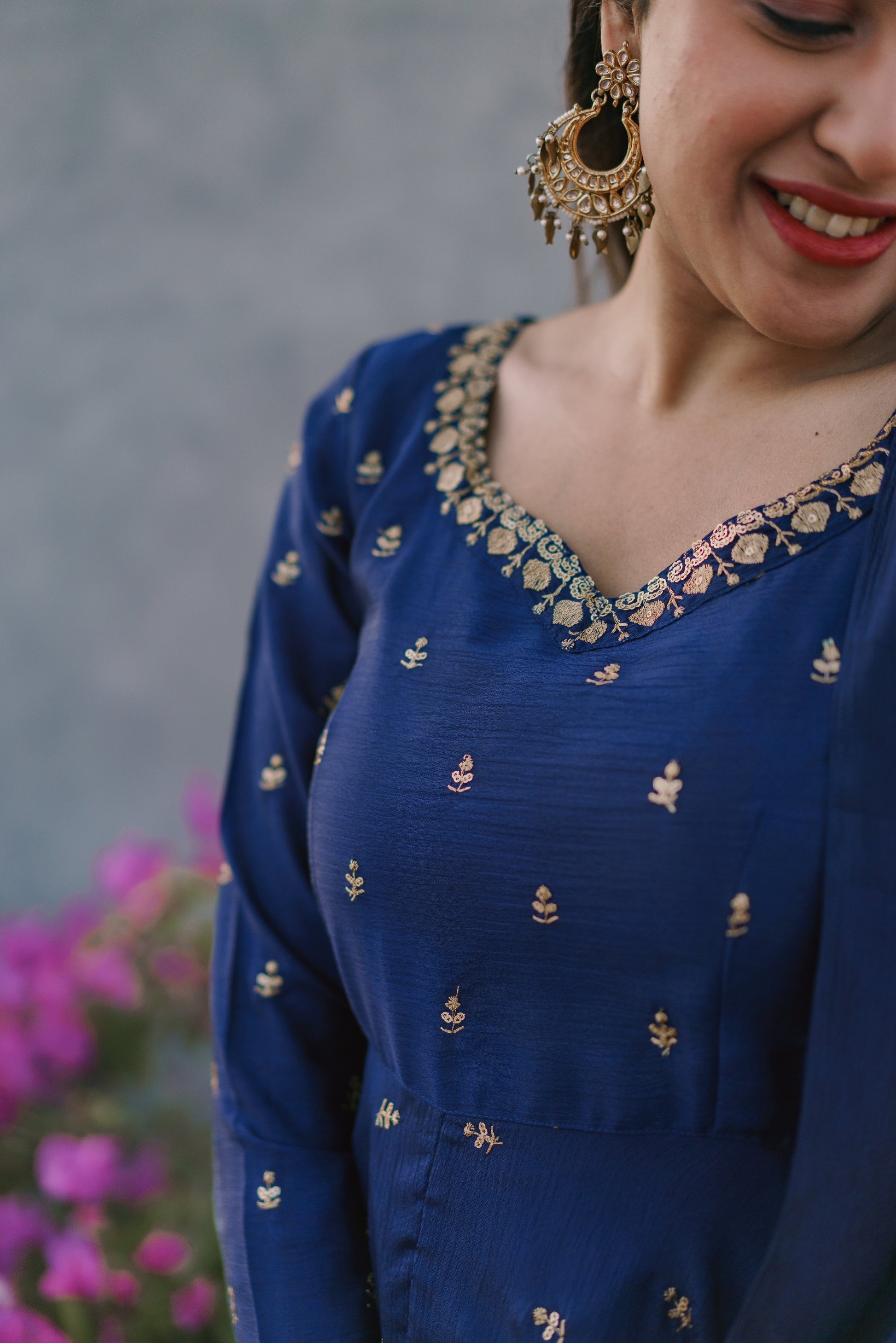 Beautiful ink blue chinon dress with gold embroidery along the sweetheart neckline and small gold buttas embroidered all over the body; made in our classic fit-and-flare silhouette. Pair it with a plain chinon dupatta and you're good to go. Lining provided.