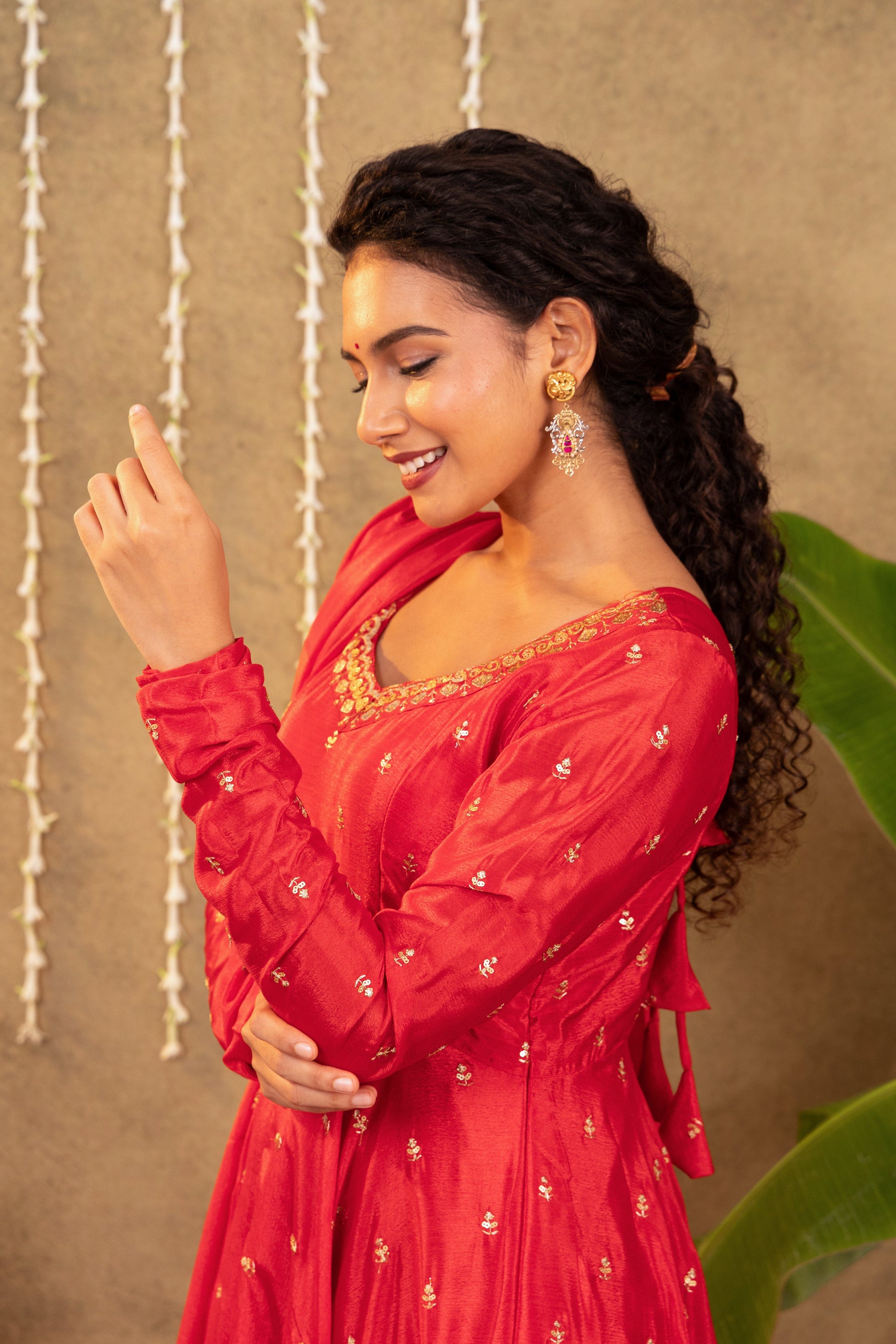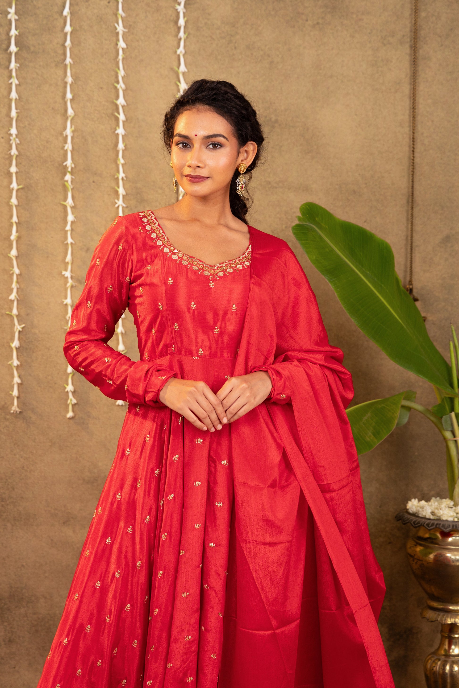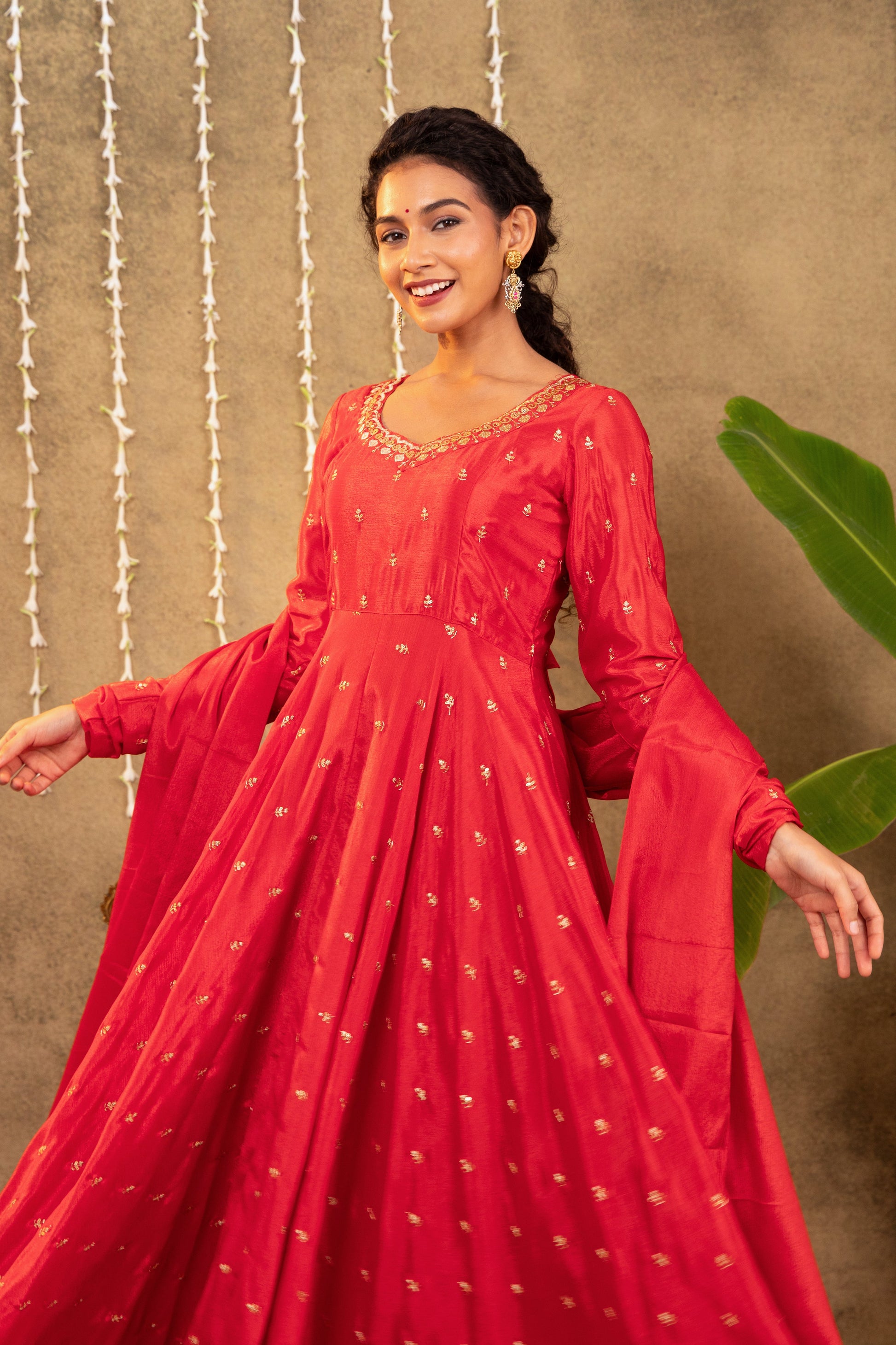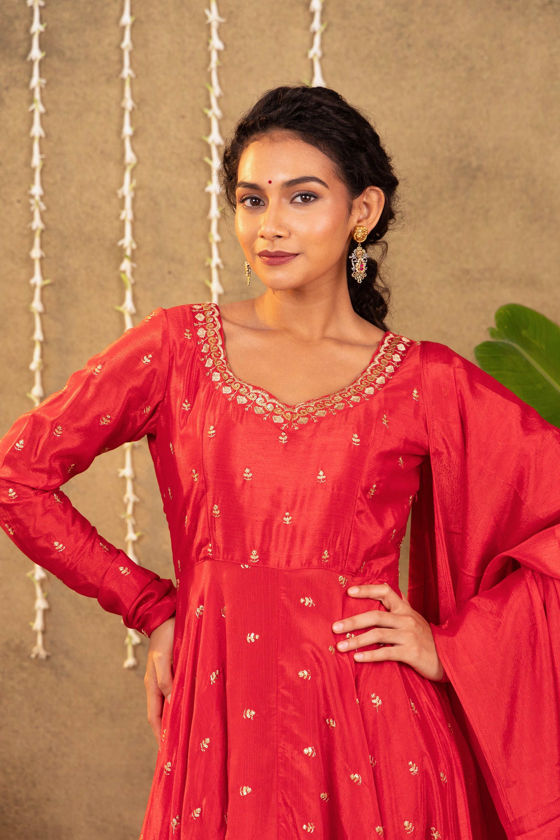 Striking red chinon dress with gold embroidery along the sweetheart neckline and small gold buttas embroidered all over the body; made in our classic fit-and-flare silhouette. Pair it with a plain chinon dupatta and you're good to go. Lining provided.