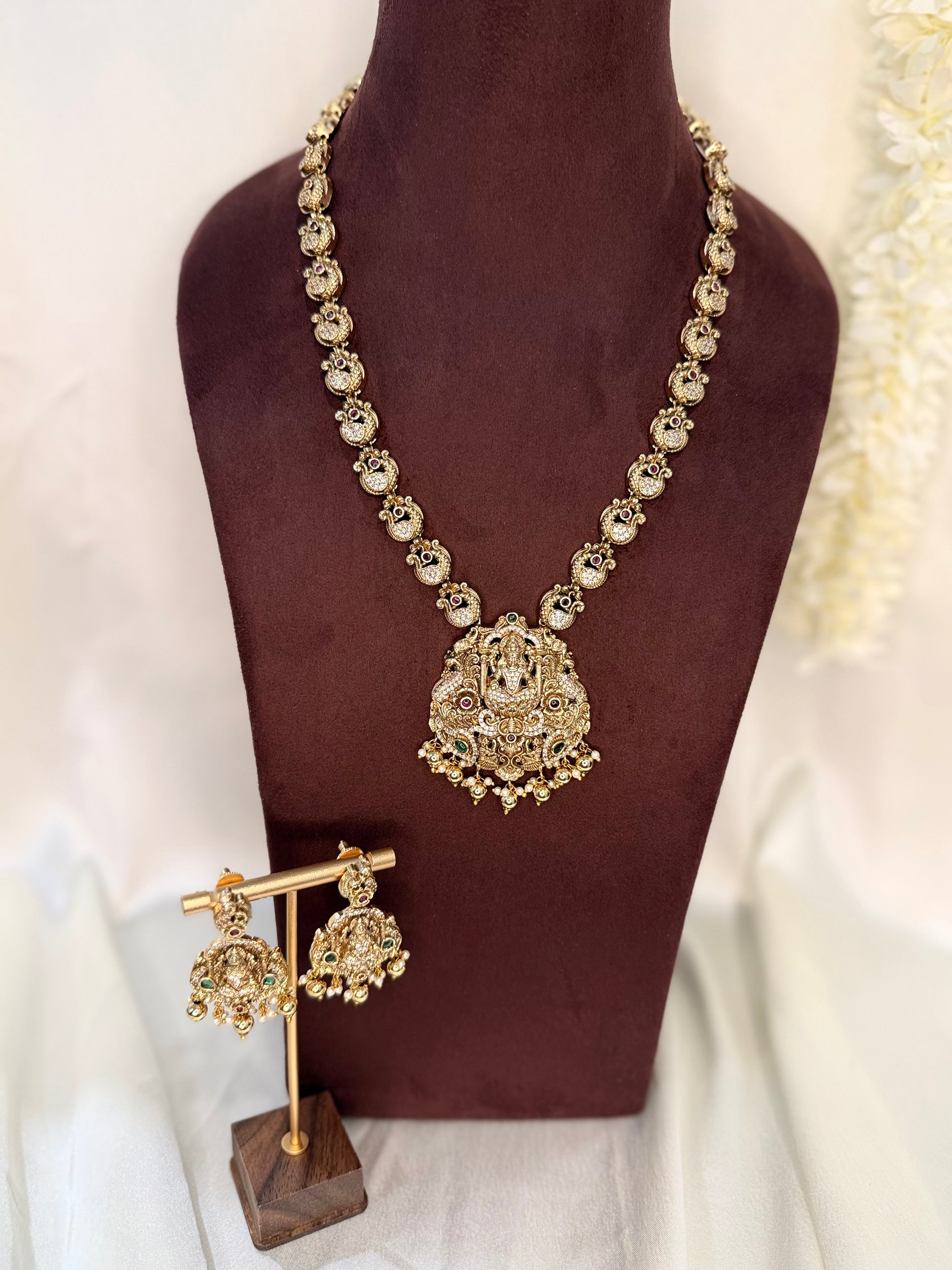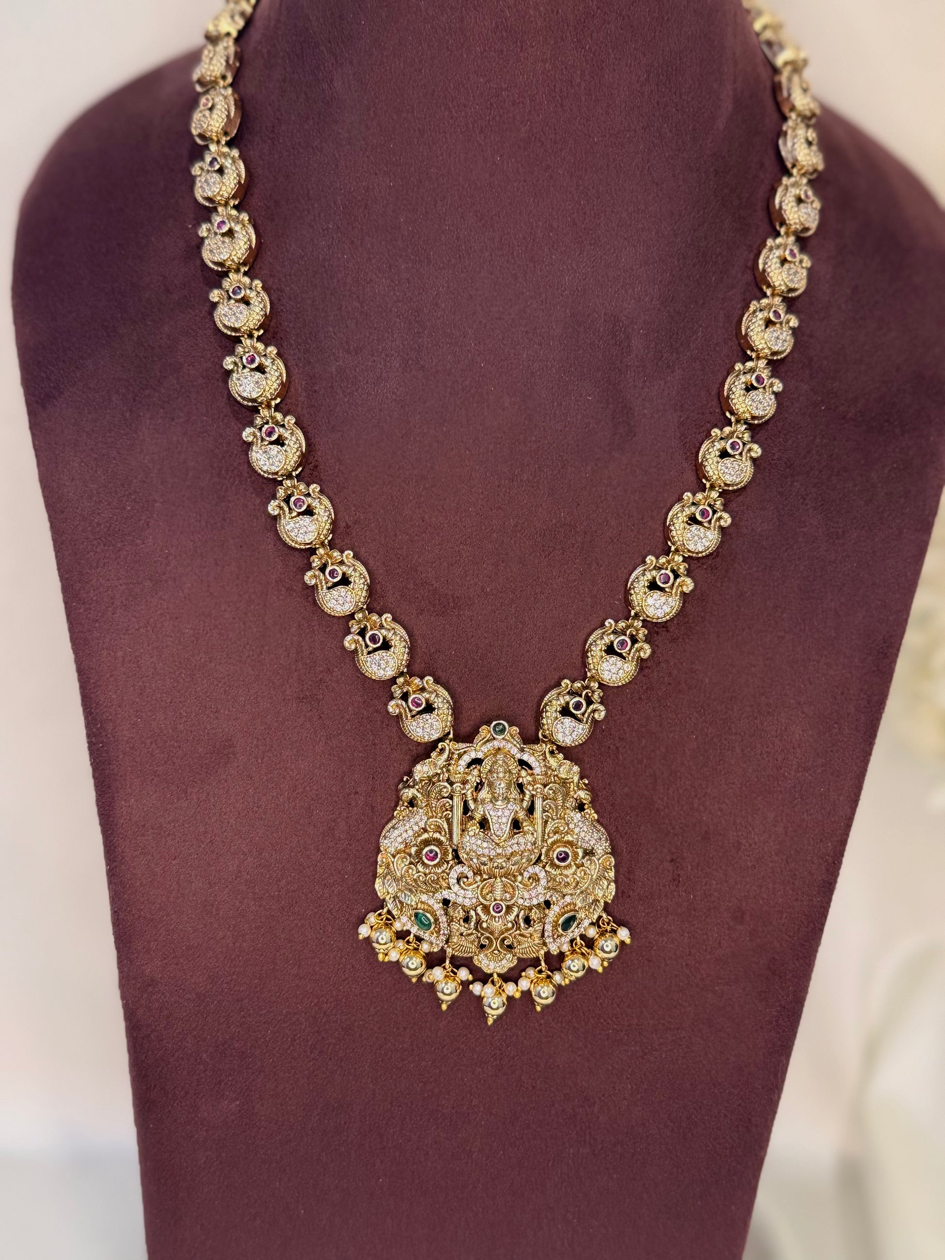 A timeless ode to tradition, this exquisite temple haram features intricately crafted motifs throughout the chain, culminating in a grand goddess pendant adorned with delicate pearl drops and subtle stone accents.