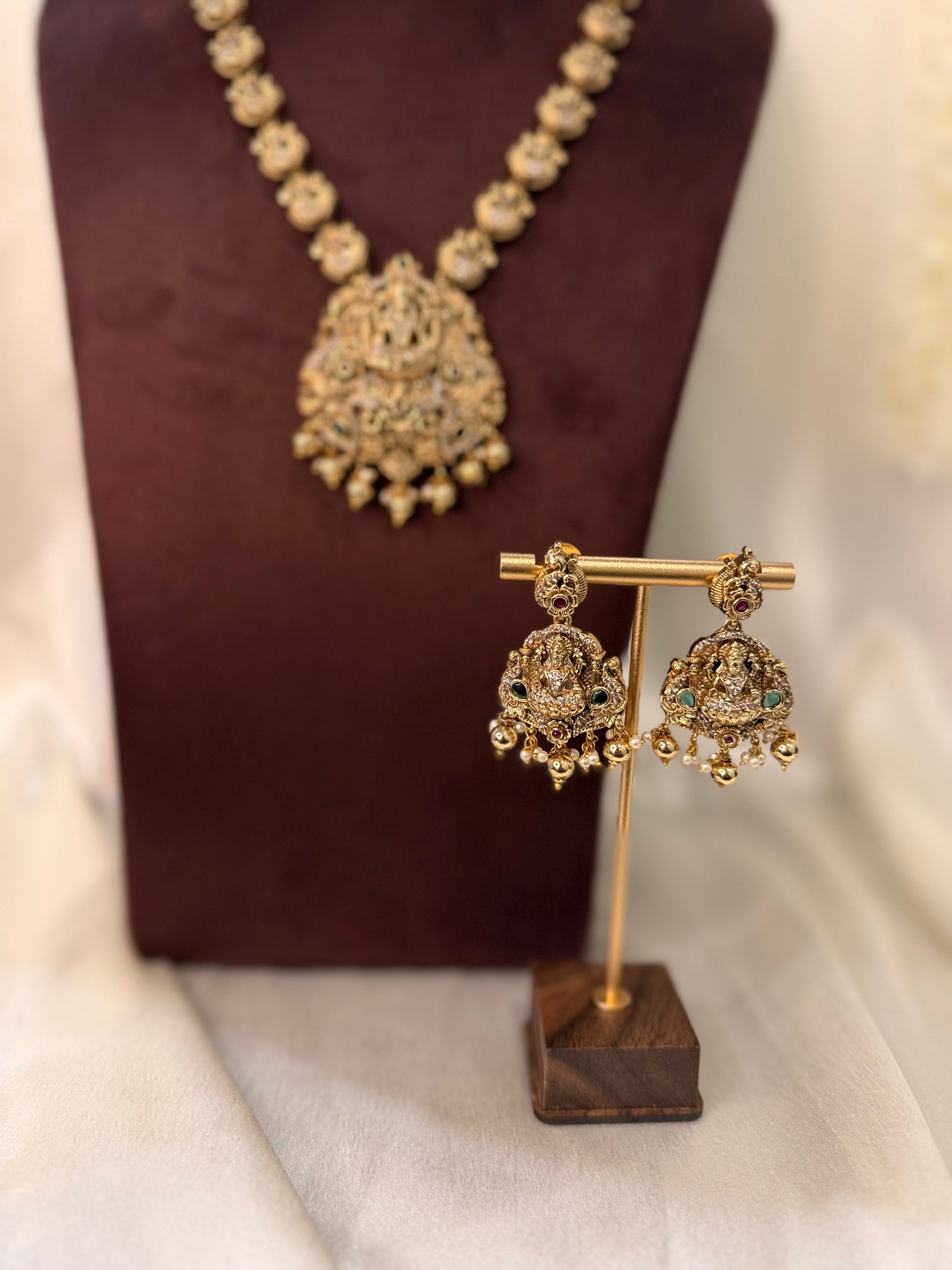 Paired with matching earrings, this set is perfect for weddings, festive occasions, and bridal wear. The antique gold finish gives it a rich, heirloom-inspired appeal.
