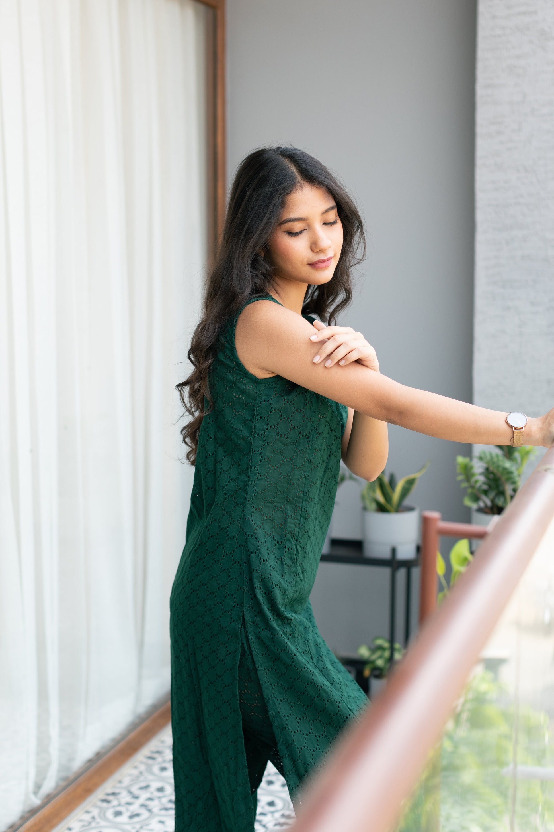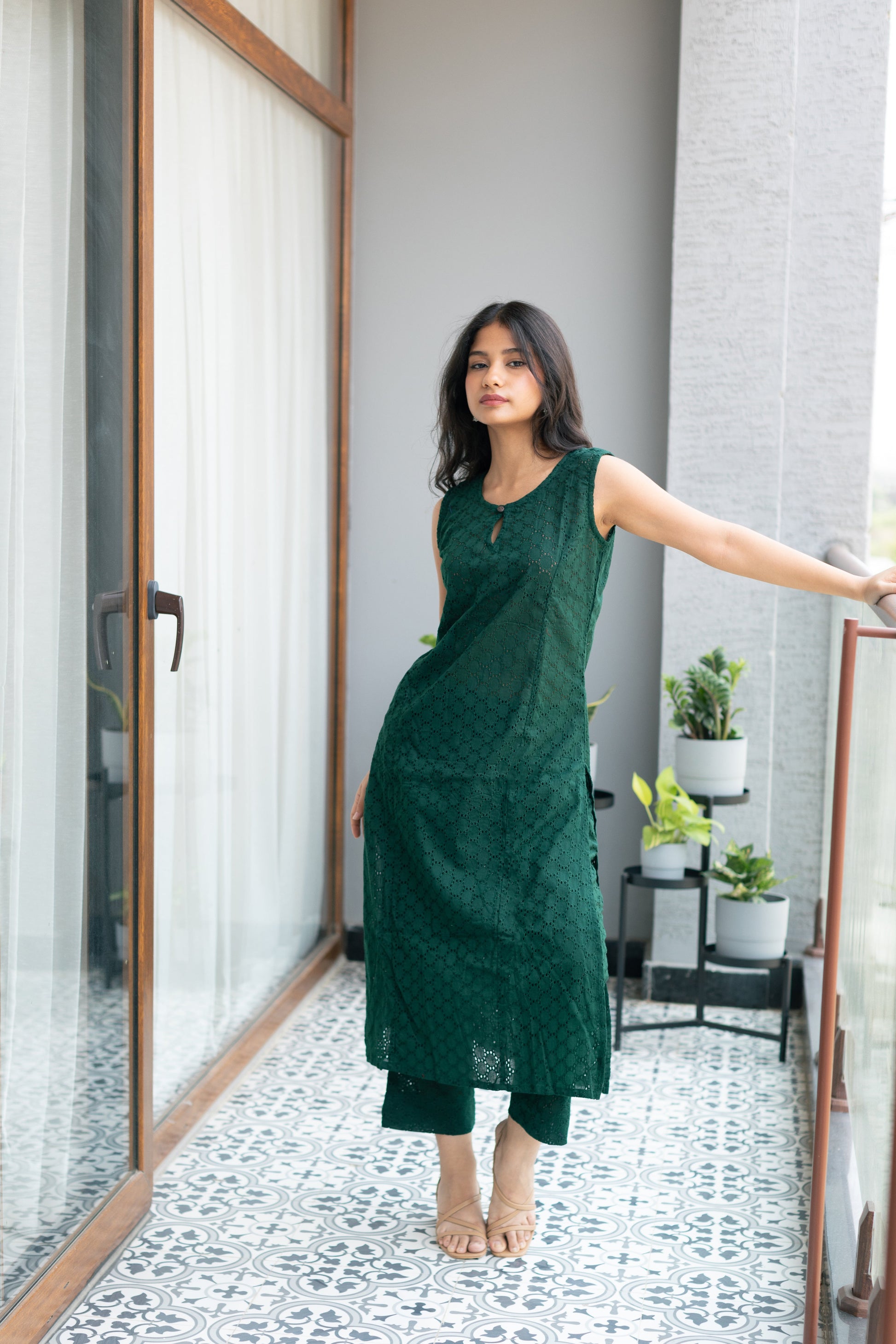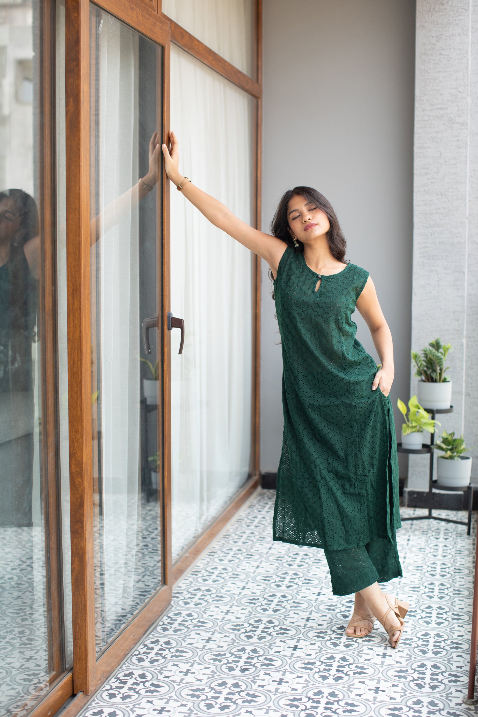 Pretty bottle green hakoba kurta with matching pants made from soft, breathable cotton. A chic and comfortable college/work outfit! Lining will be provided in the top till waistline.
