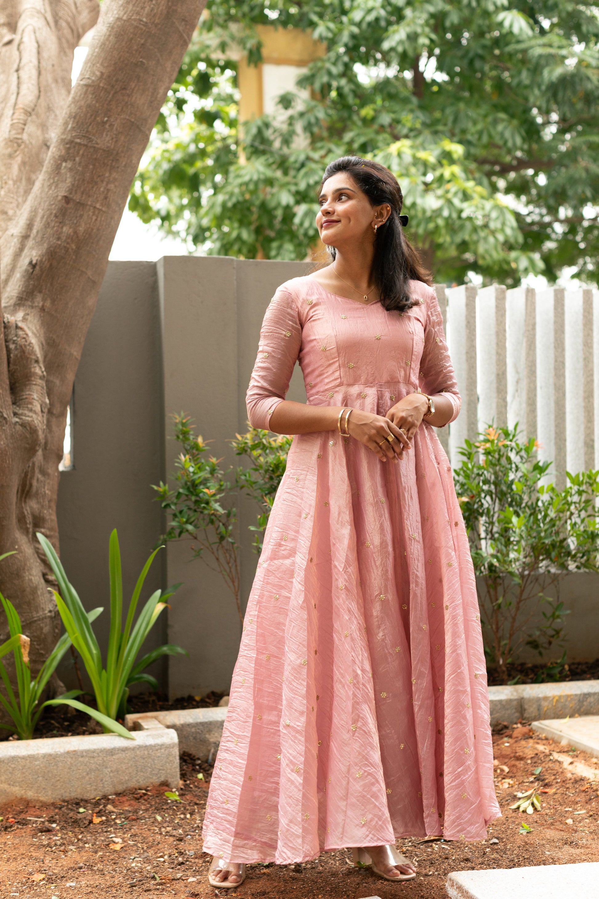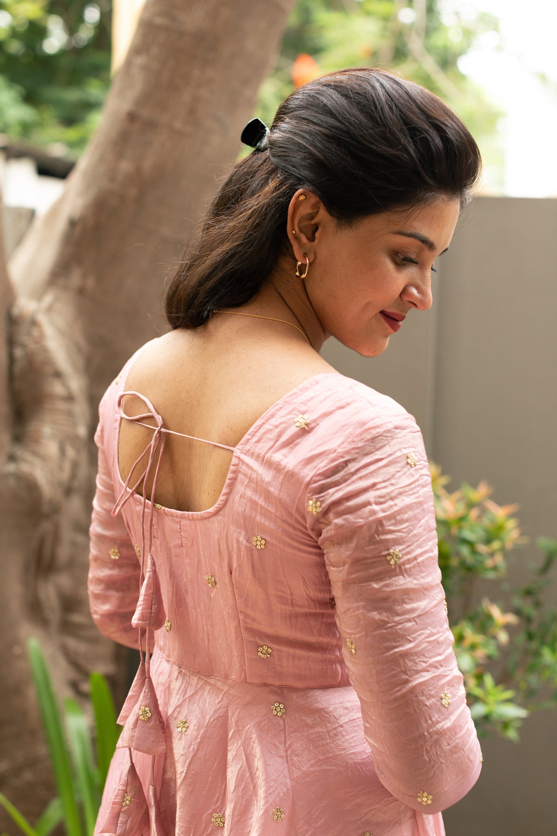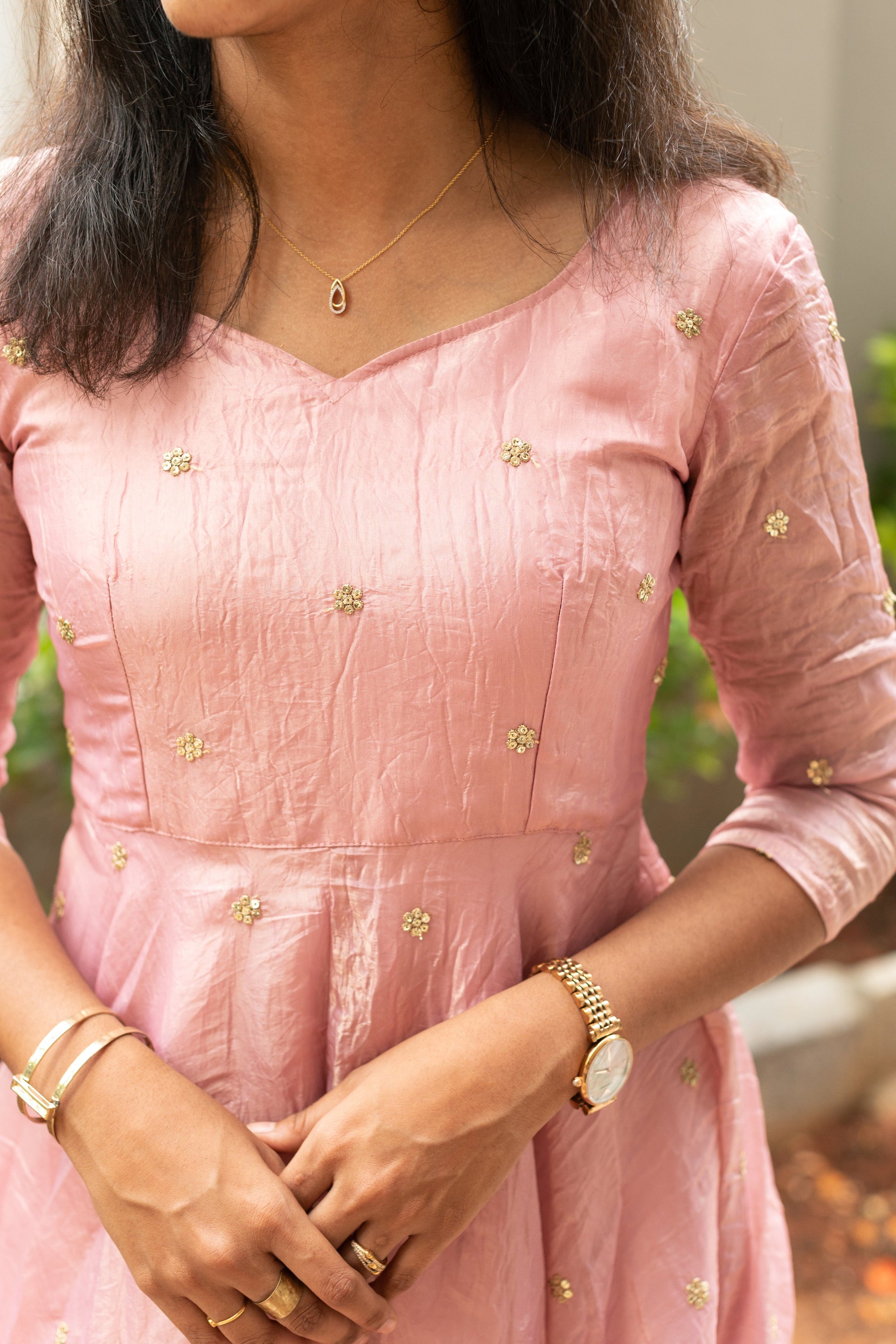 Beautiful baby pink crushed tissue dress with small gold buttas embroidered all over the body; made in our classic fit-and-flare silhouette. Lining provided.