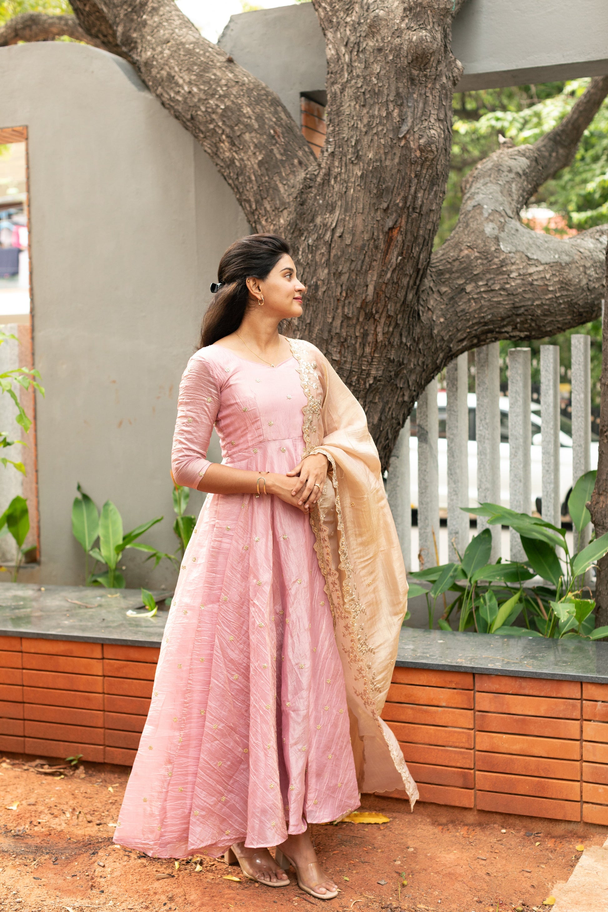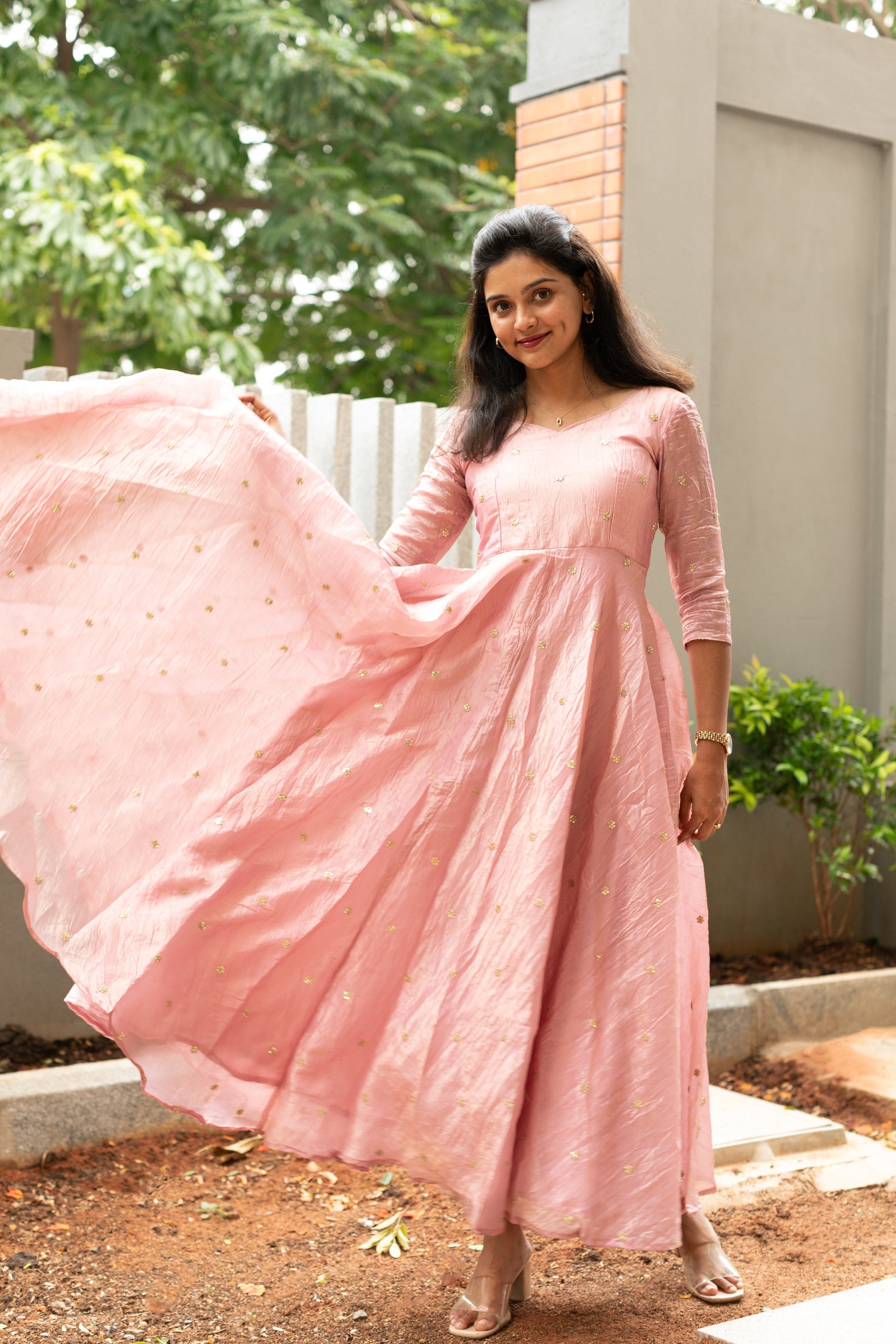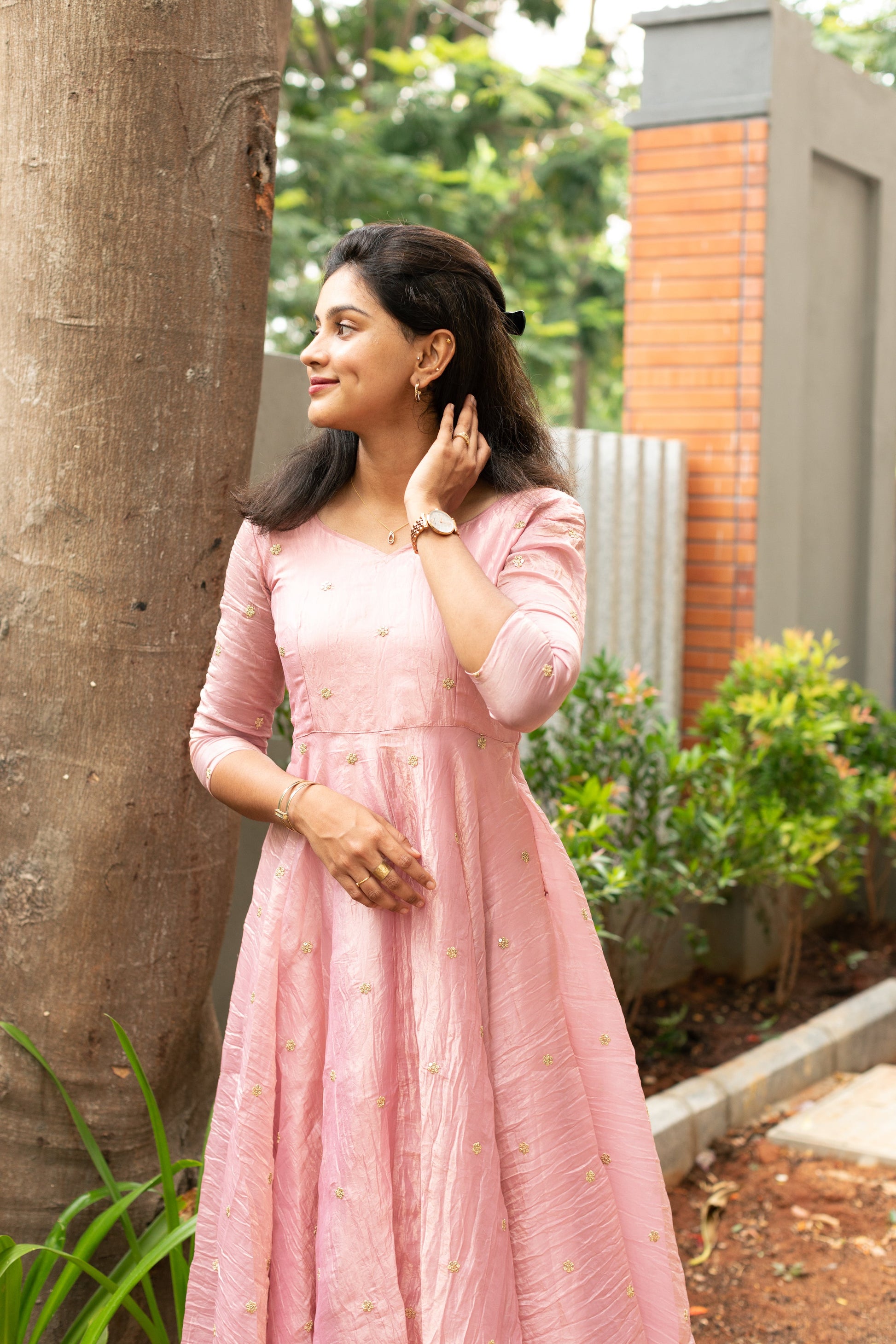 Beautiful baby pink crushed tissue dress with small gold buttas embroidered all over the body; made in our classic fit-and-flare silhouette. Lining provided.