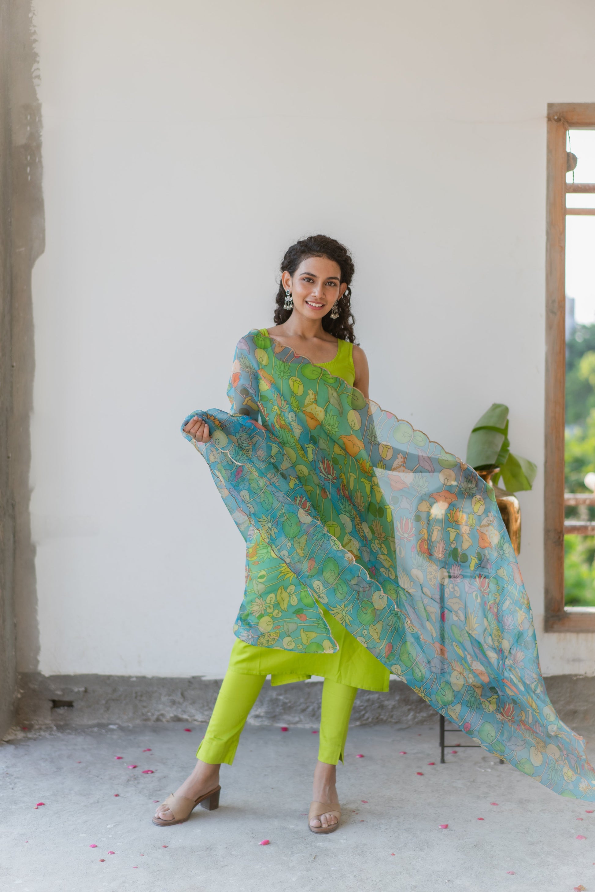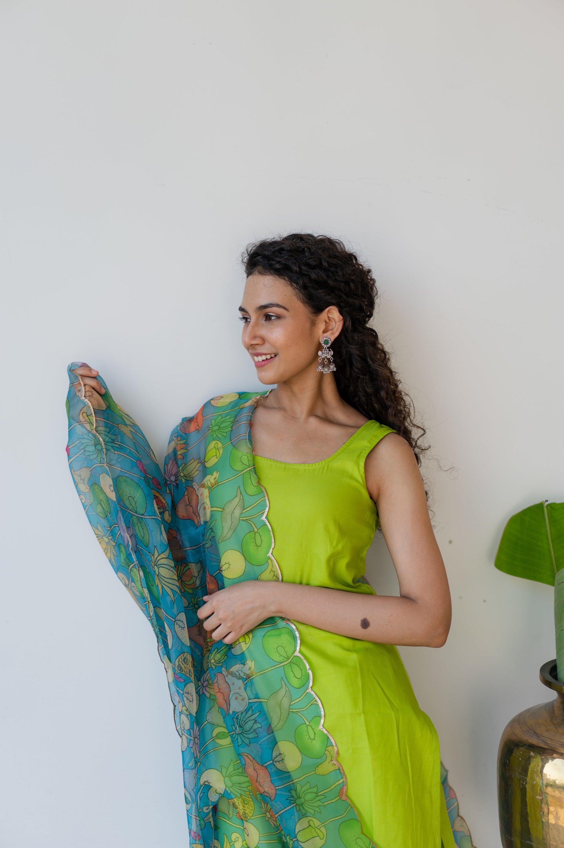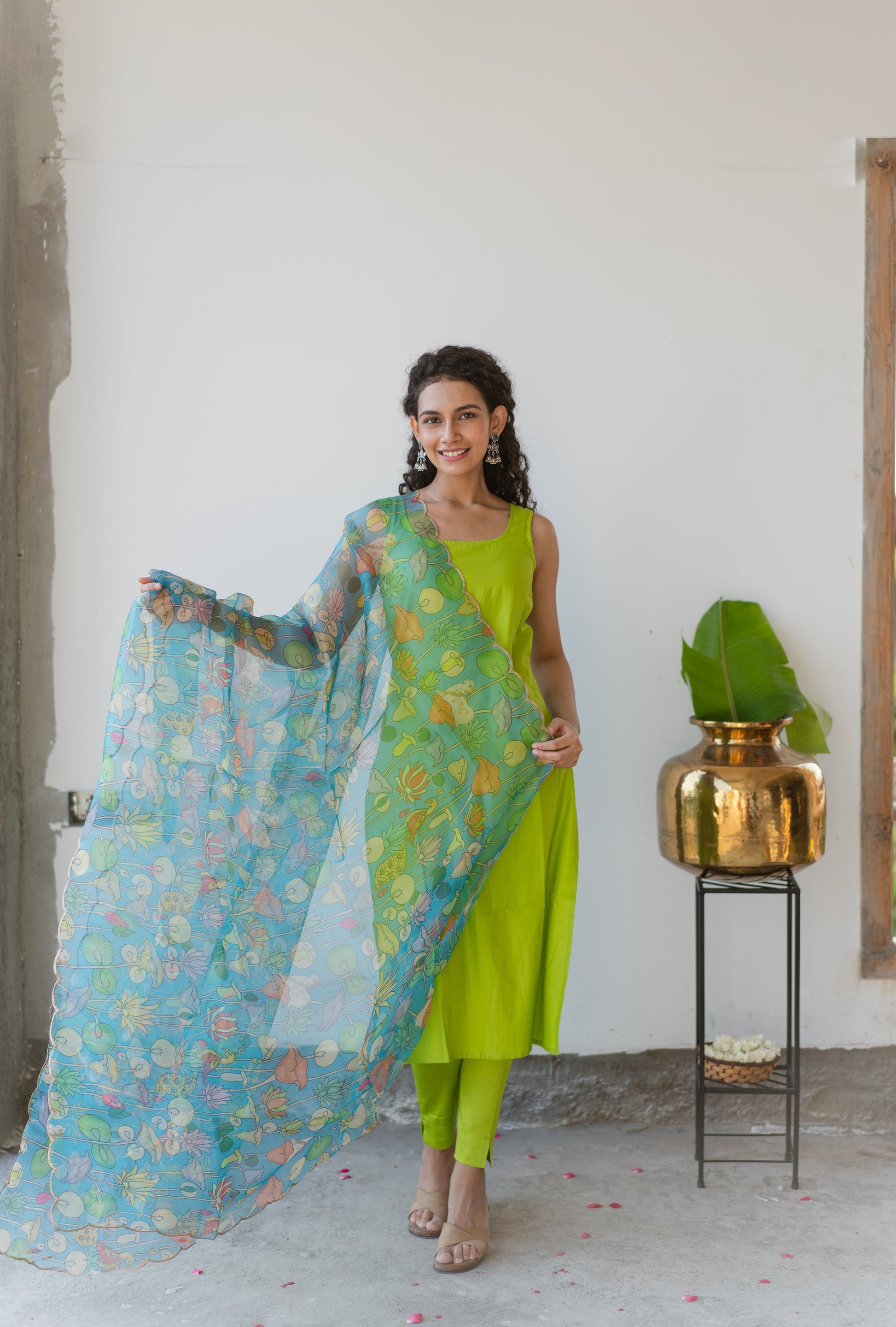 Green sleeveless kurta, straight fit pants and blue Pichwai organza cutwork dupatta. A chic and comfortable college/work wear.