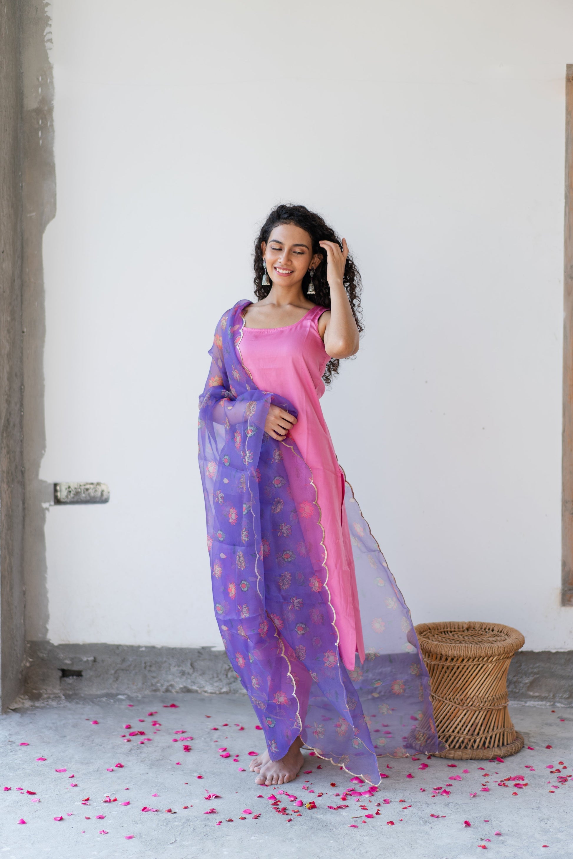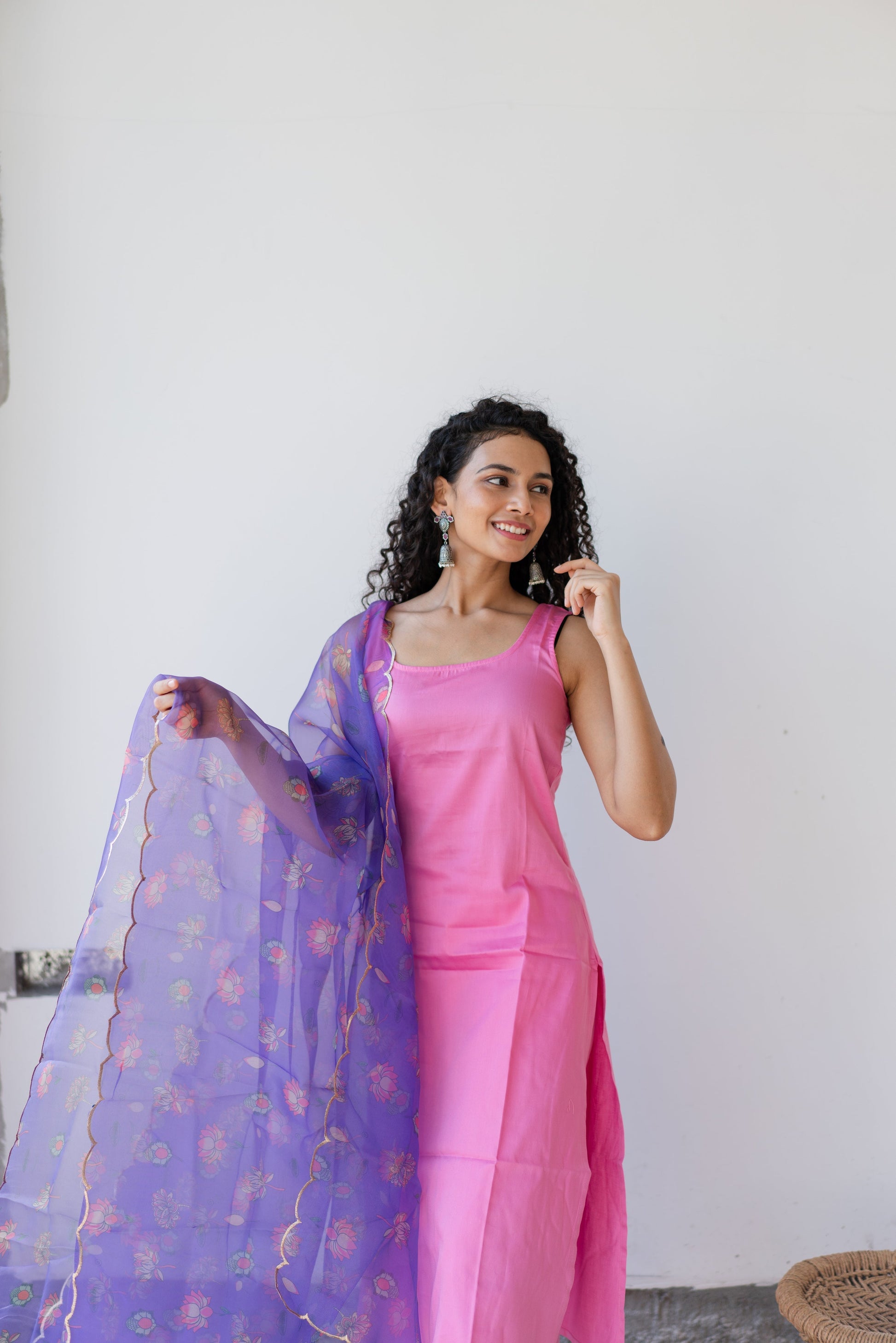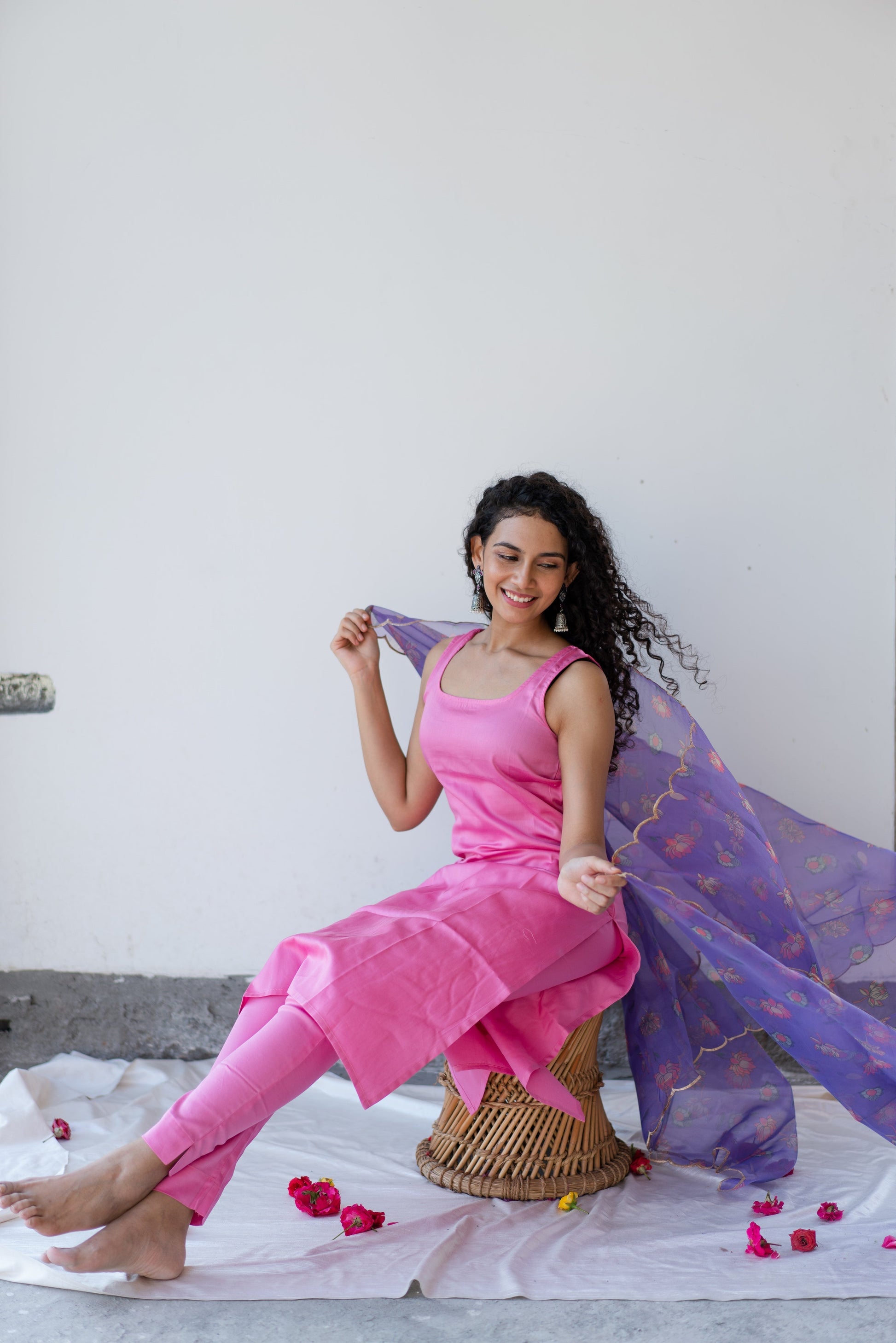 Pink sleeveless kurta, straight fit pants and violet Kalamkari organza cutwork dupatta with lotus motifs. A chic and comfortable college/work wear.