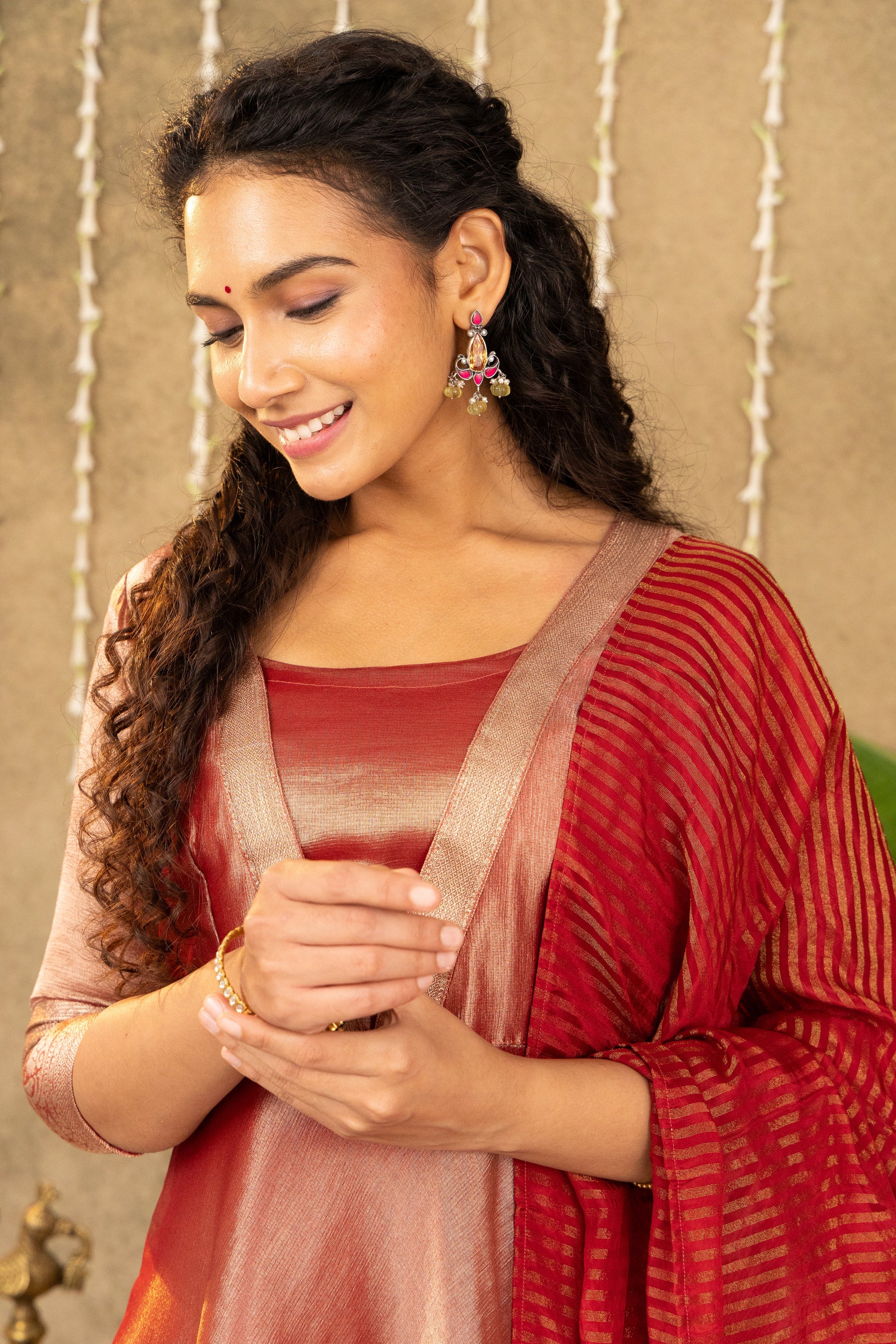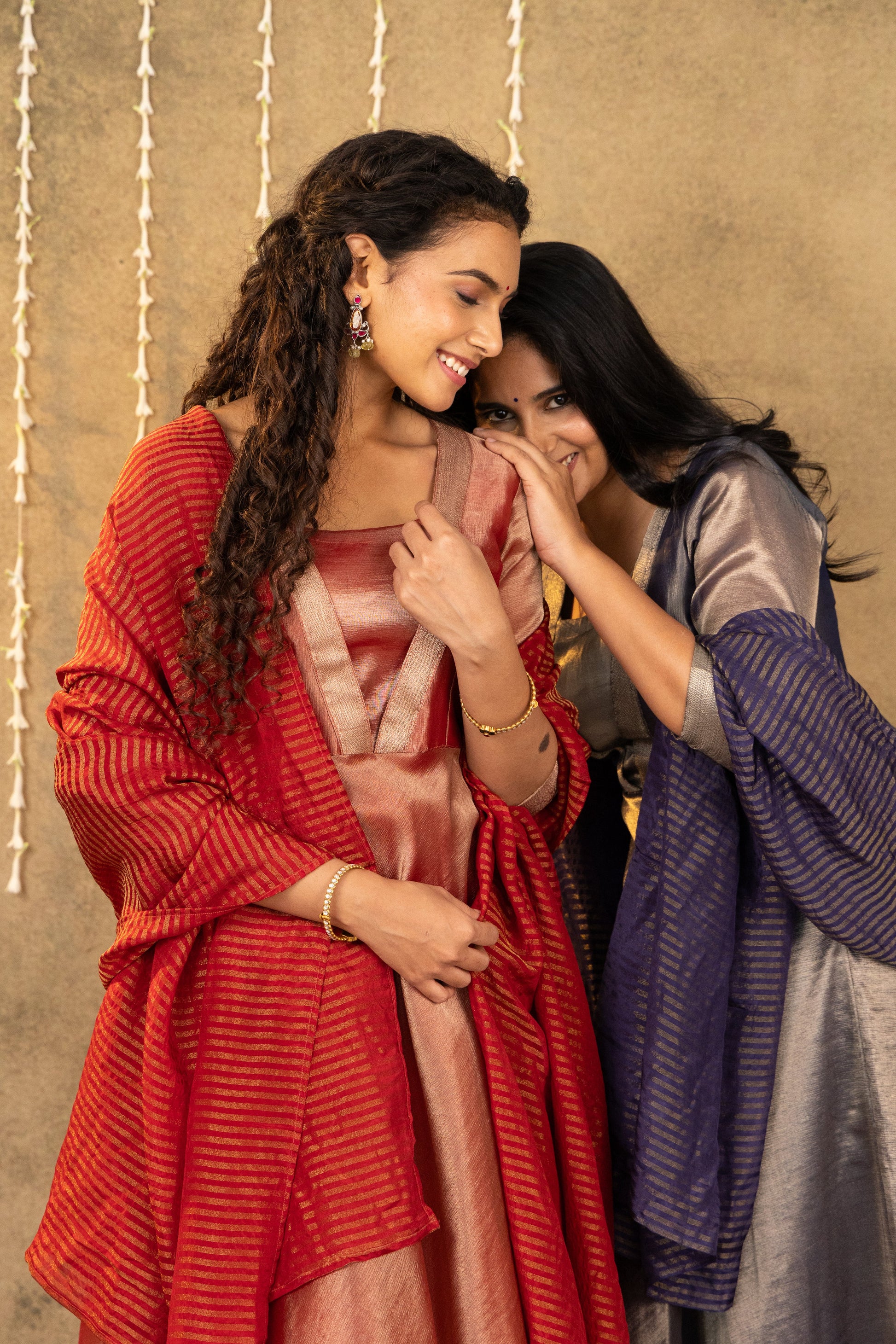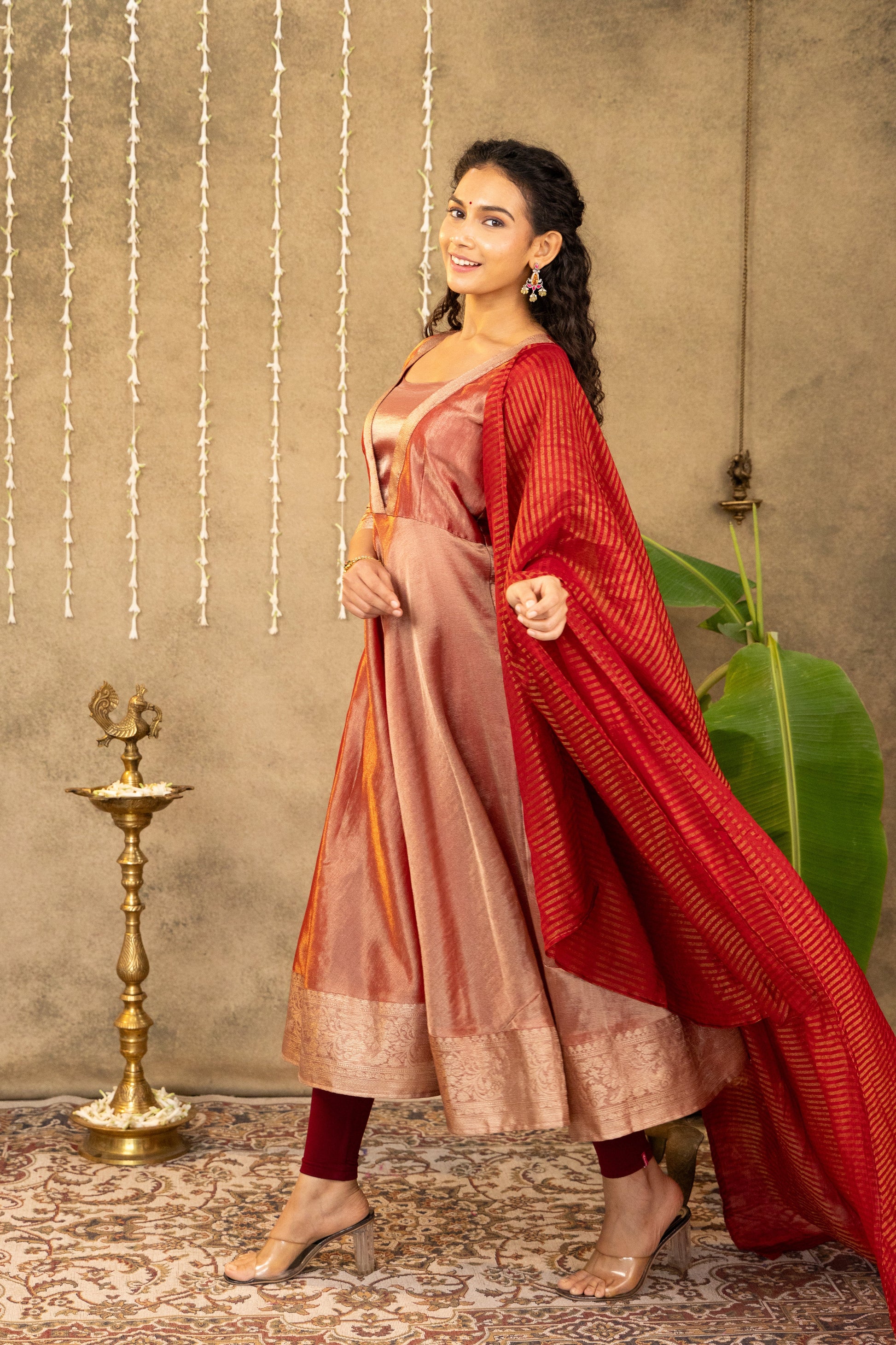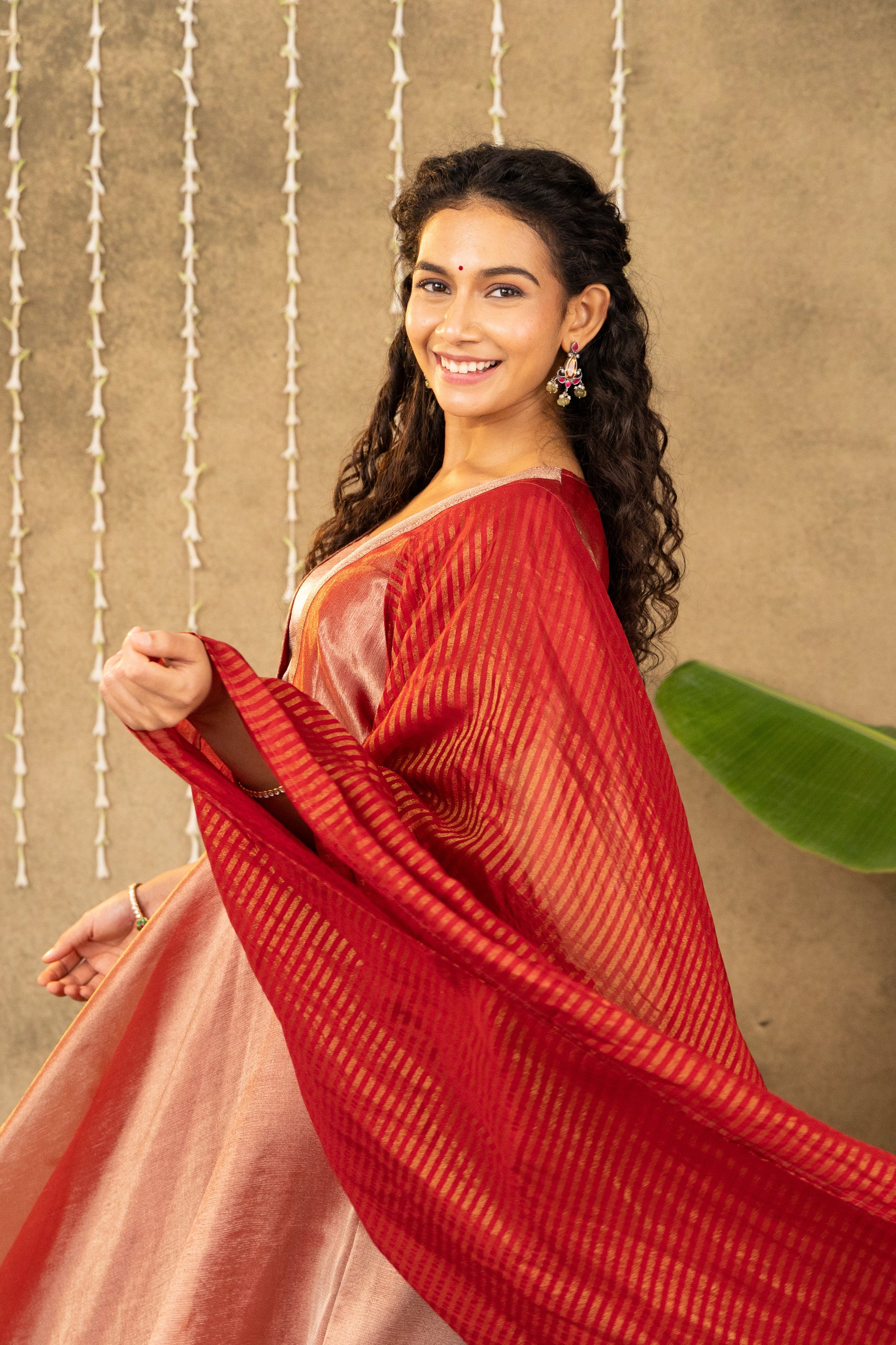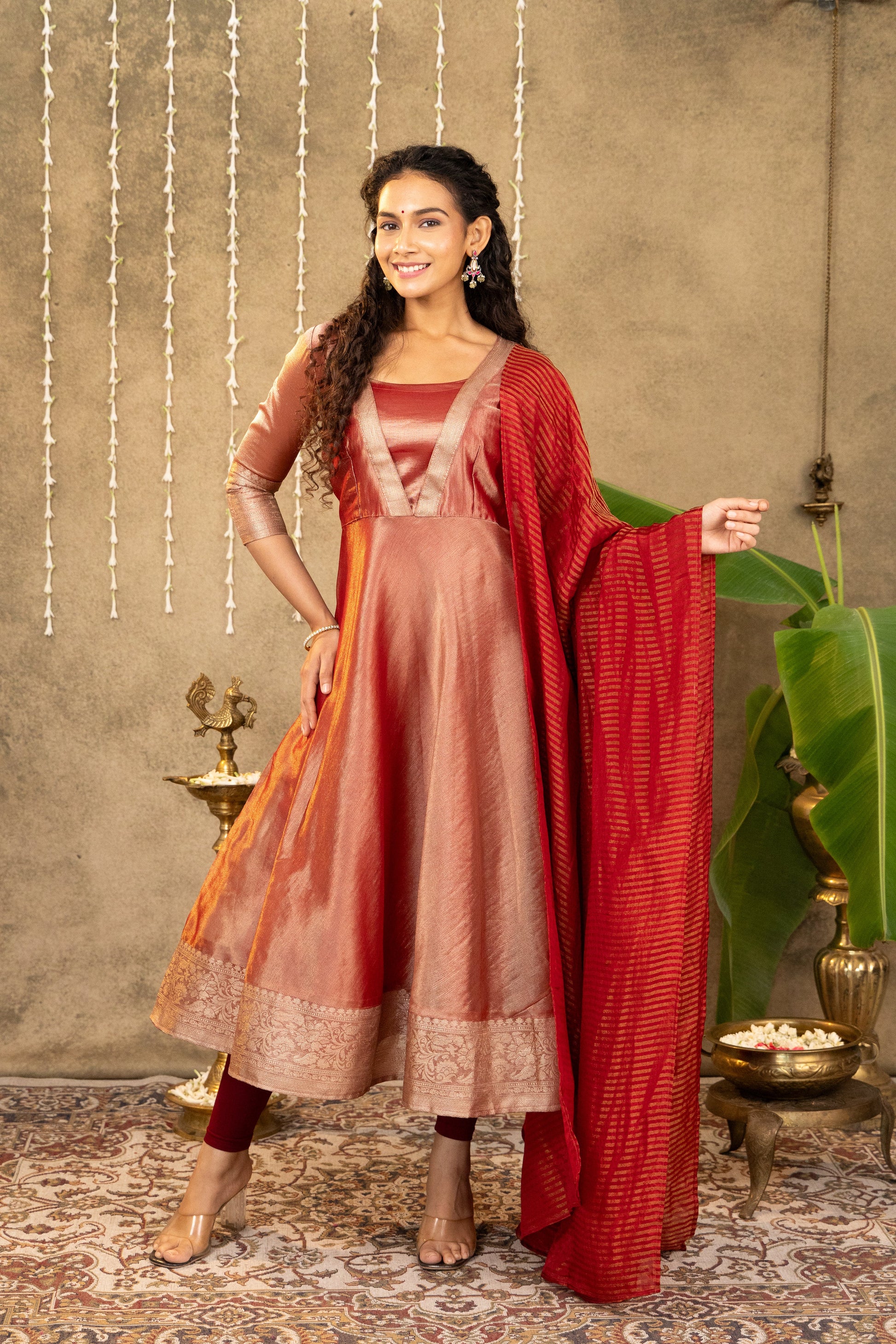 Gorgeous golden red tissue anarkali with floral zari border paired with a striped dark red organza dupatta. This contemporary and chic outfit is perfect for festive occasions! Lining provided.