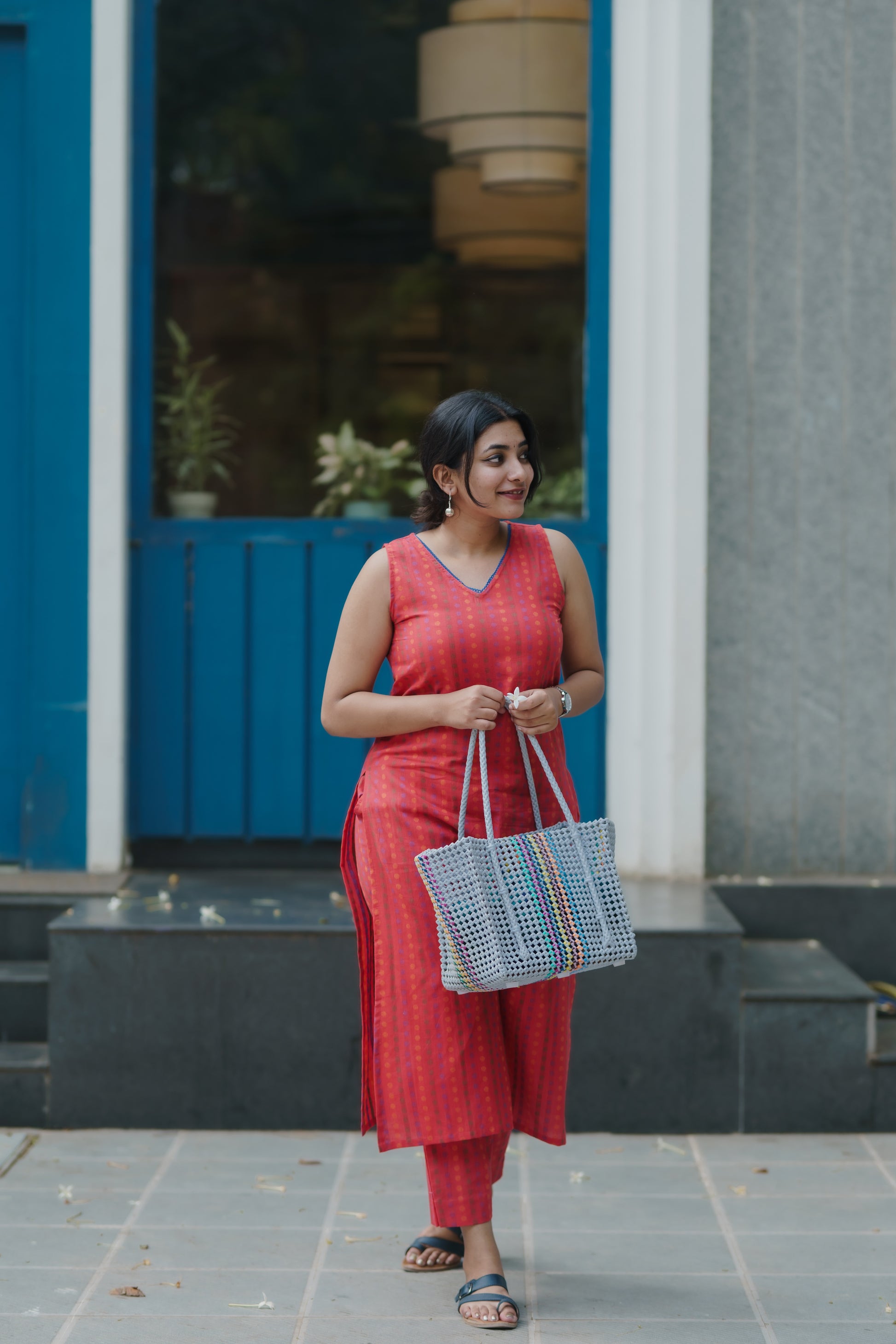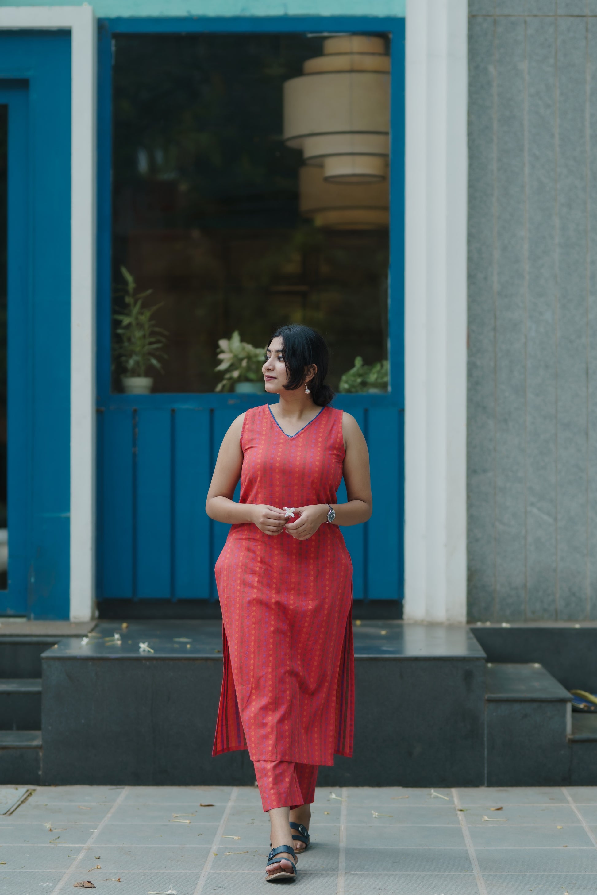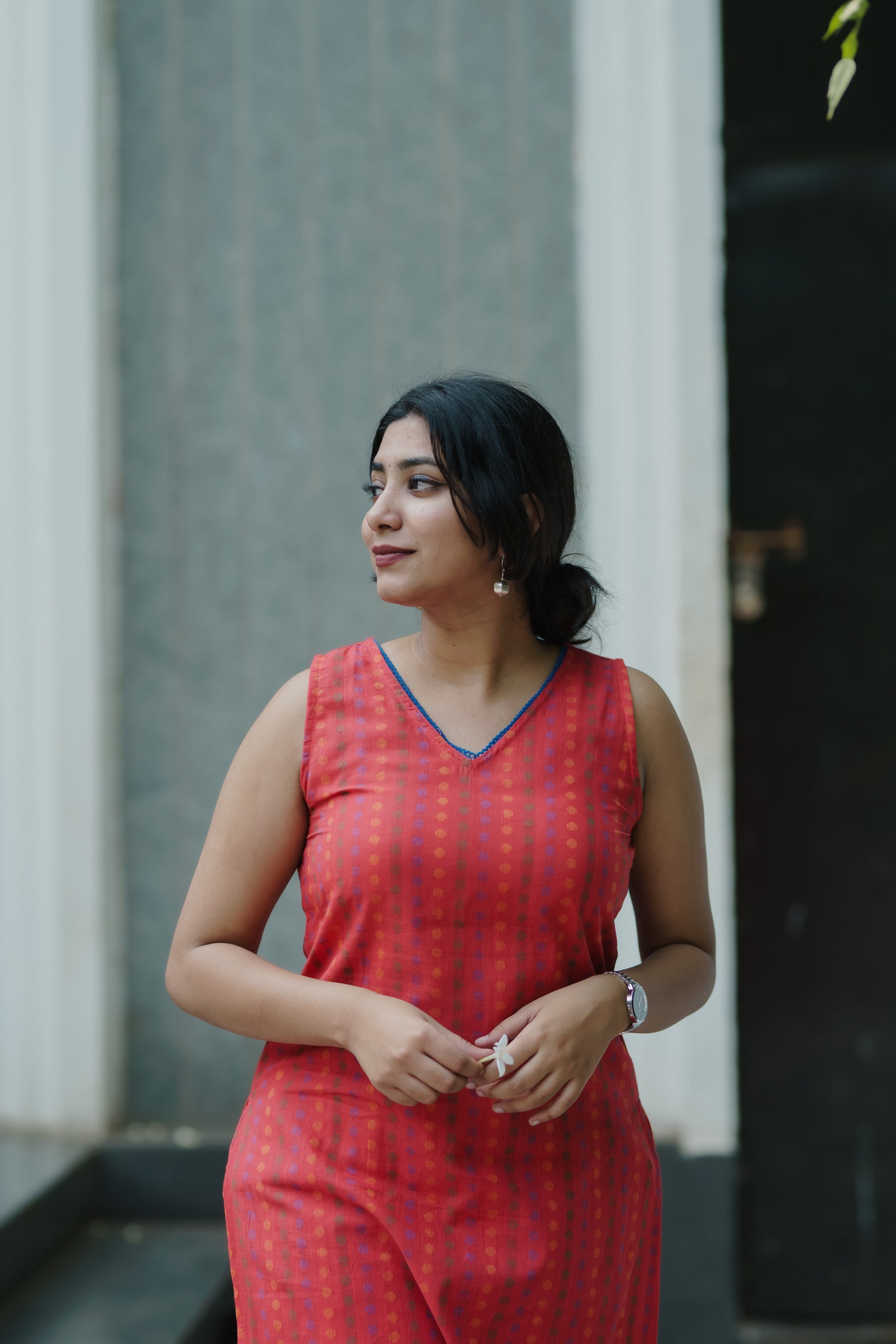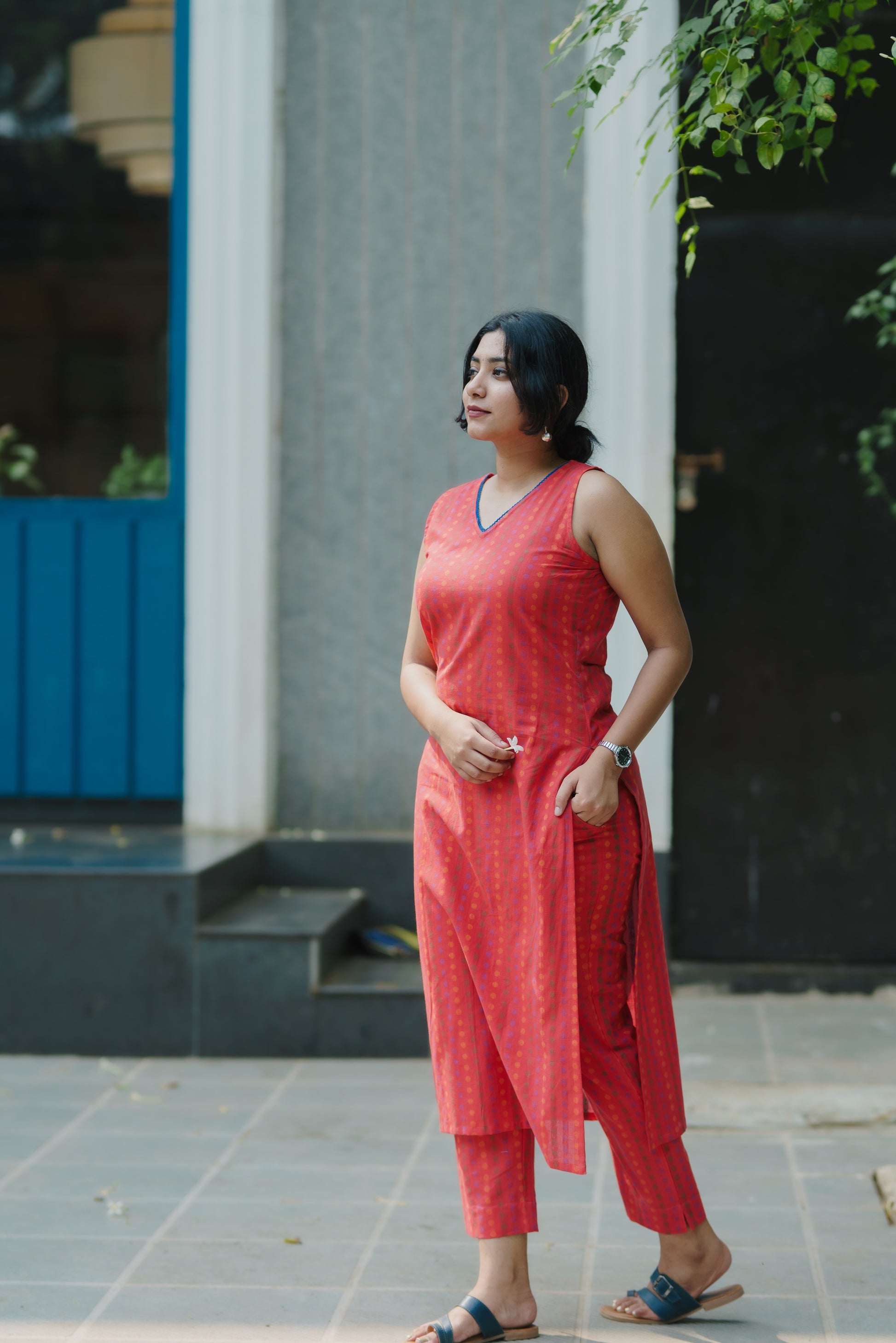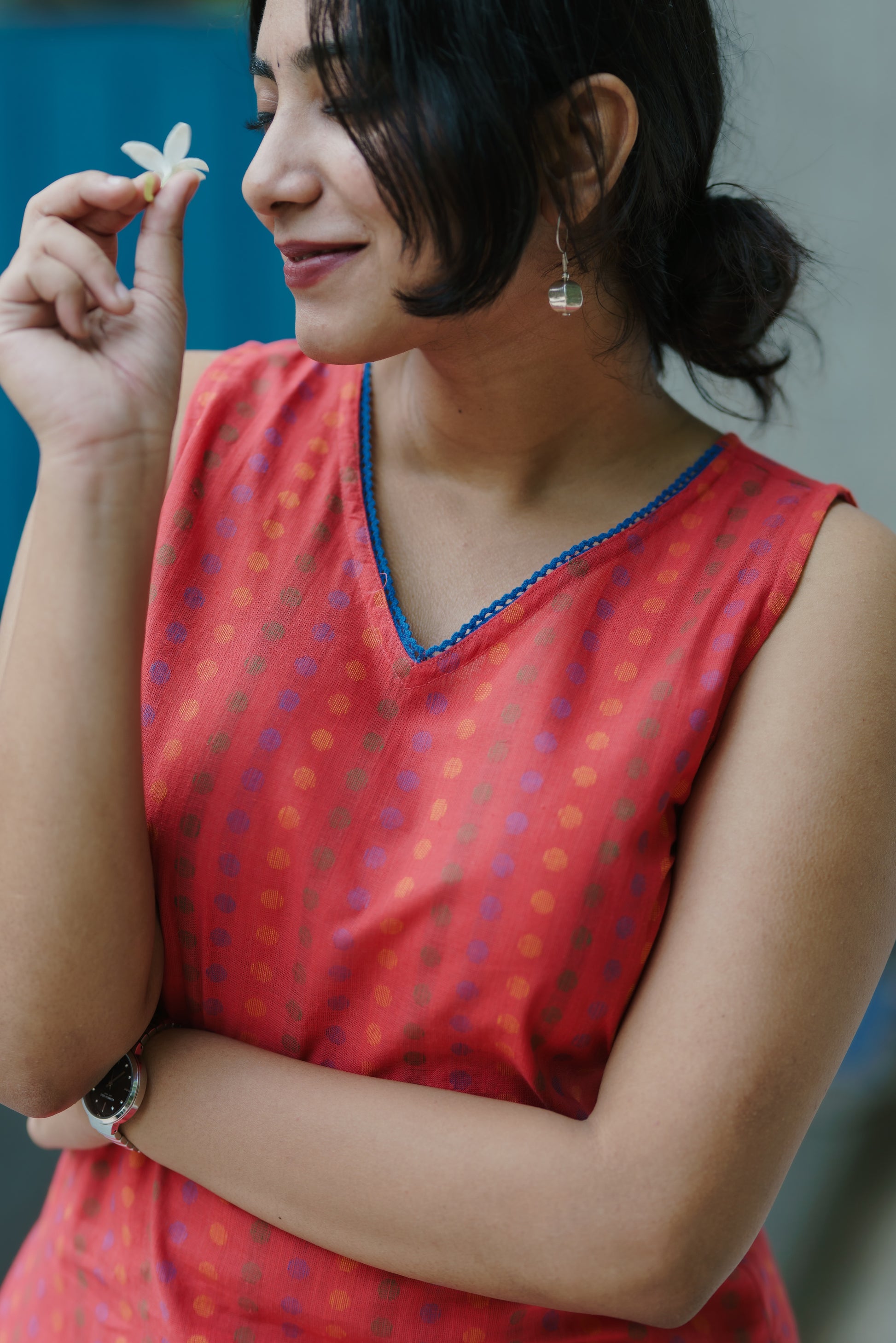 This handloom set features a reddish-orange sleeveless kurta with playful multicoloured polka dots. The contrasting blue trim at the neckline adds a pop of colour to the overall look. Perfect for both work and everyday wear.
