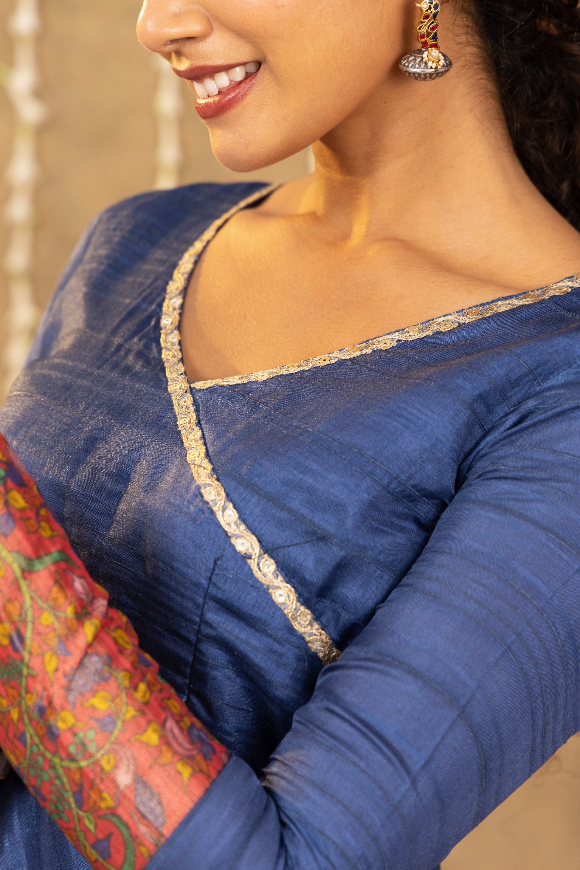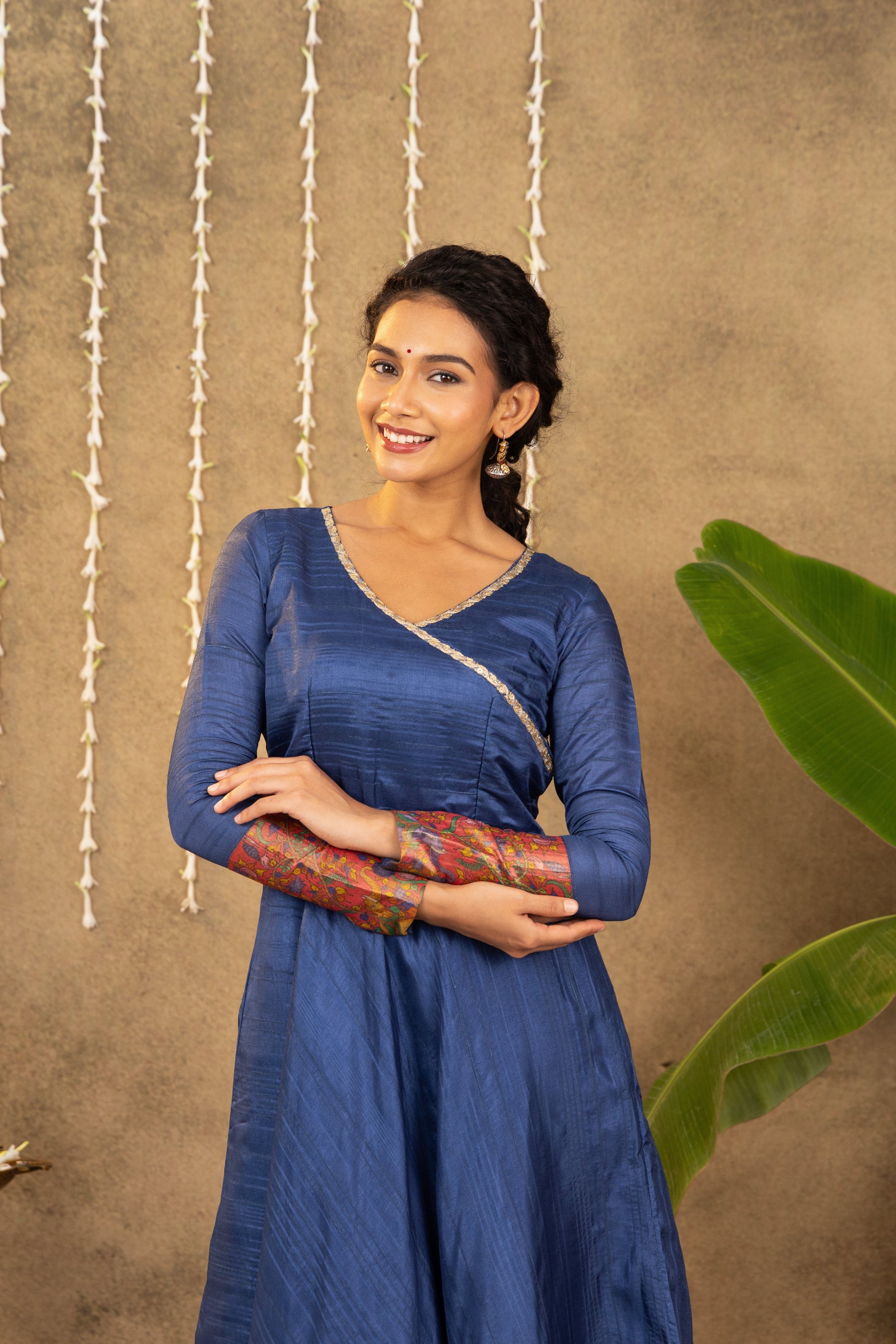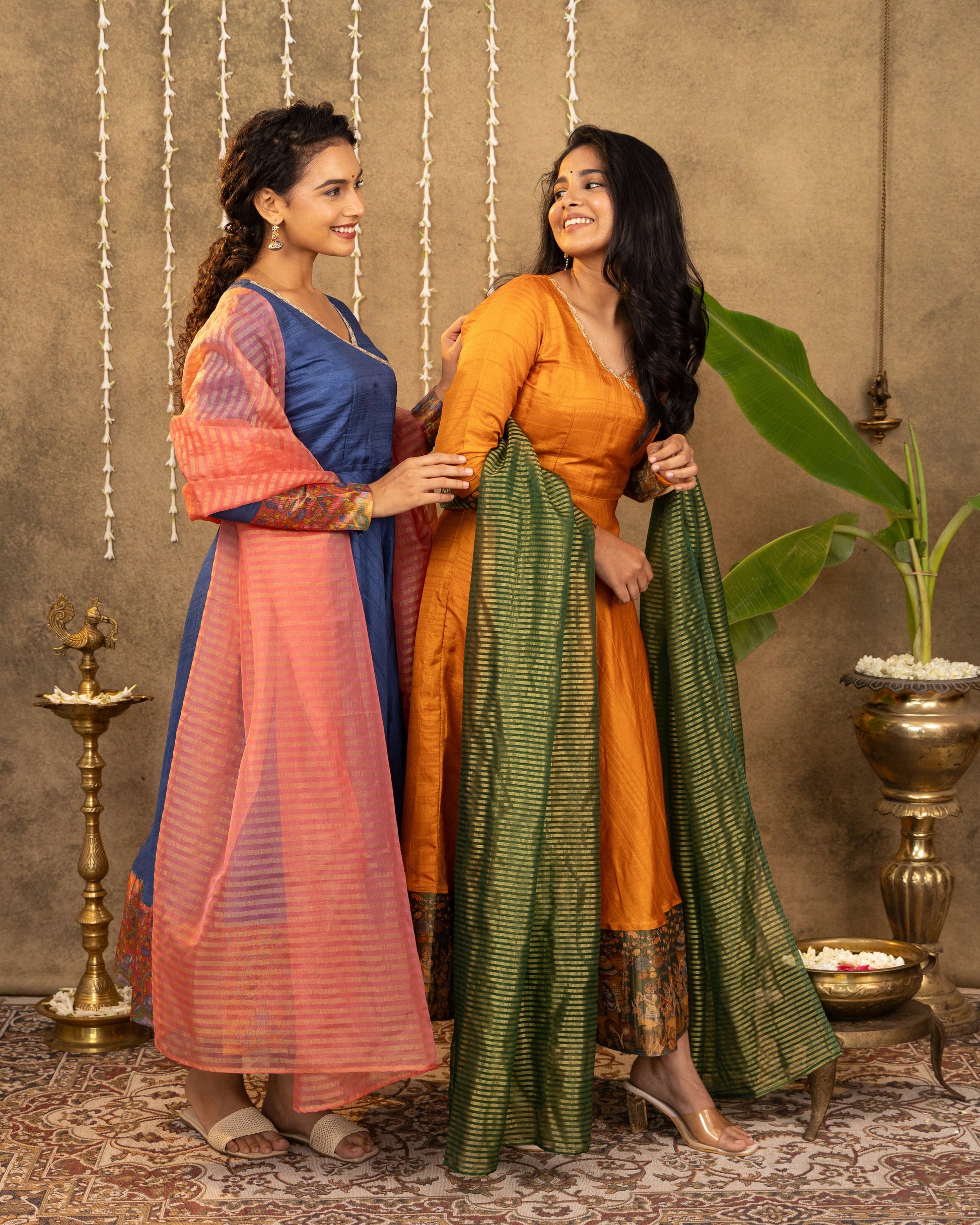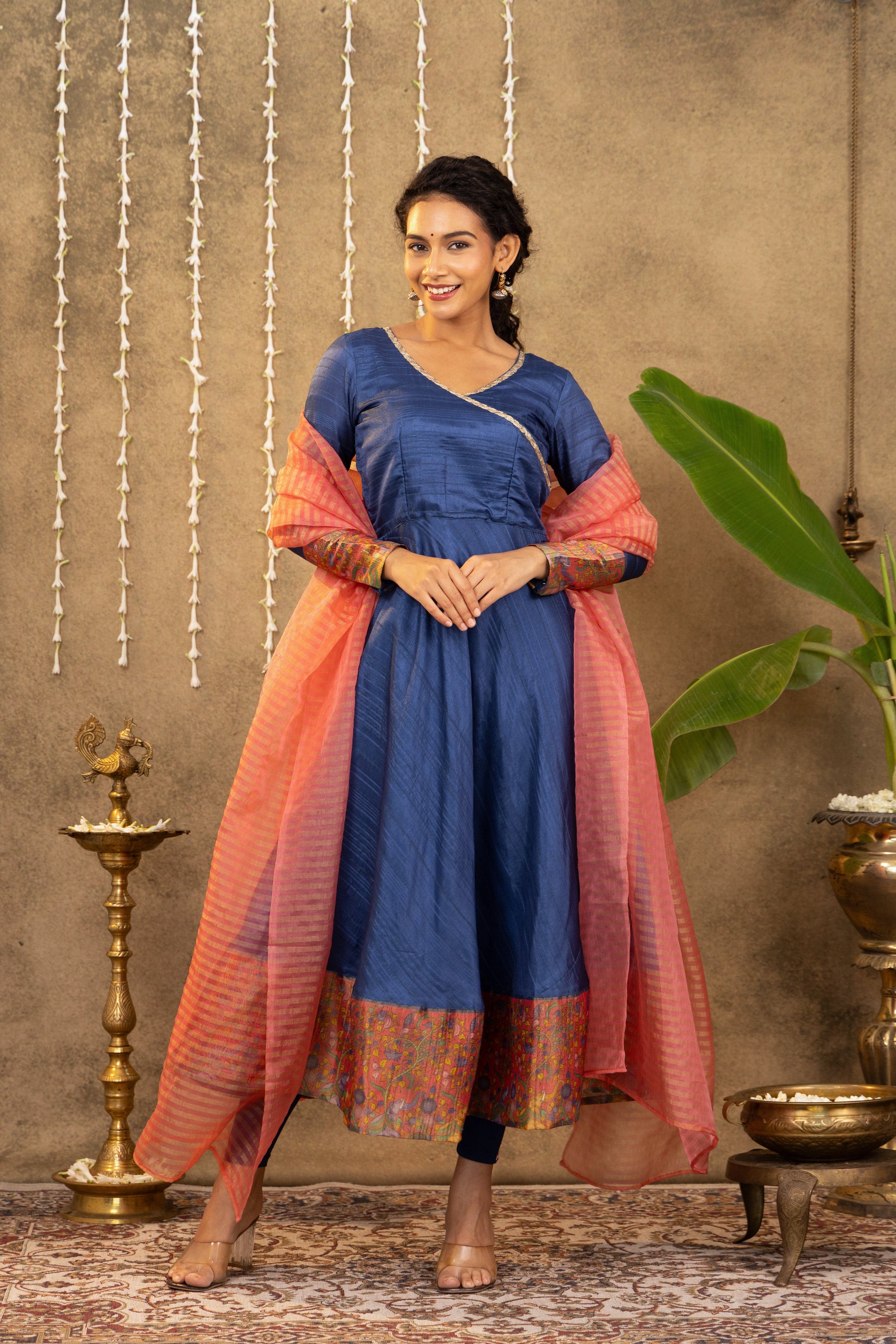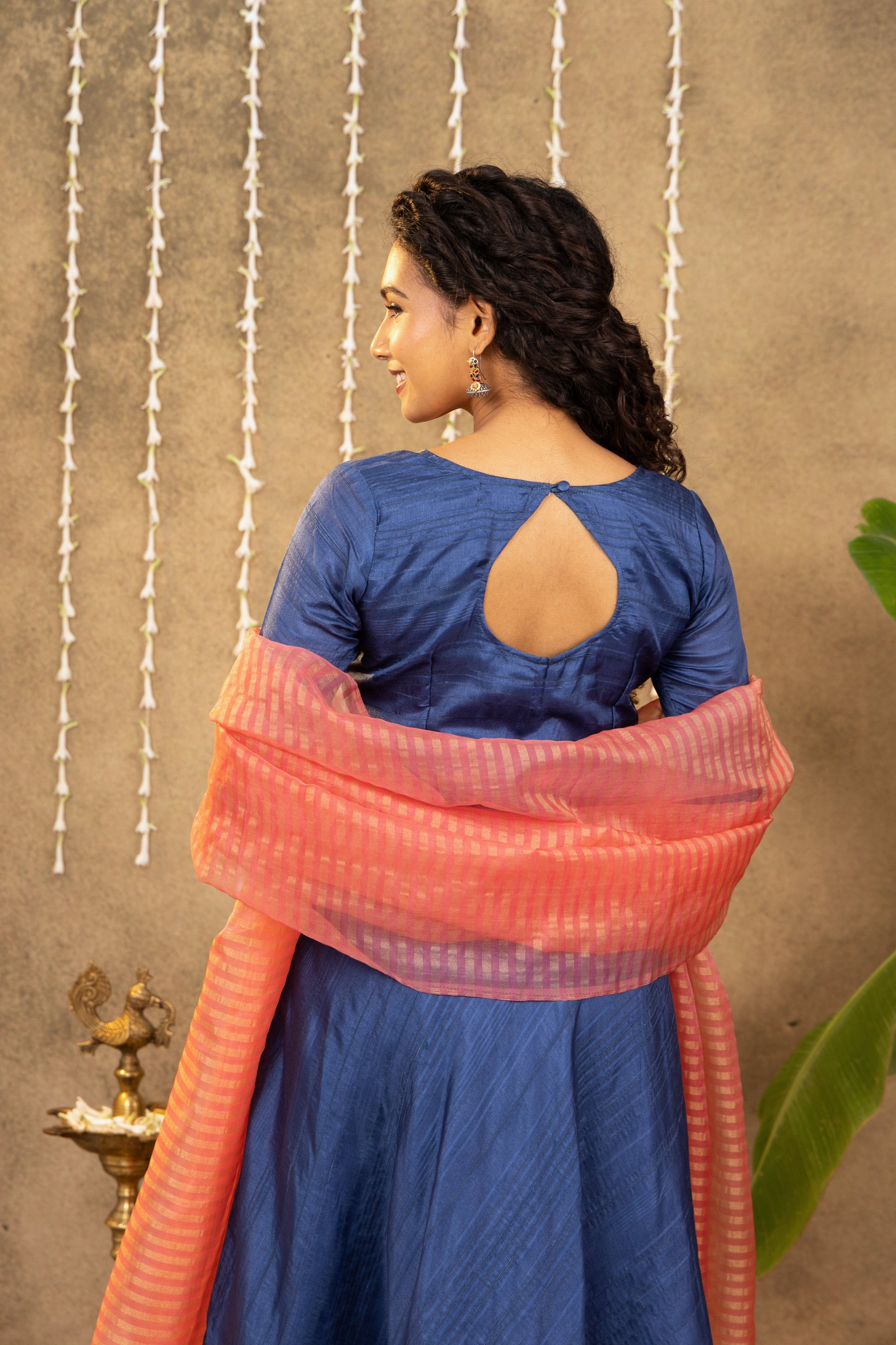 Raw silk anarkali in cobalt blue with an intricately detailed Pichwai border and sequins embroidered along the neckline. Paired with a striped salmon pink dupatta, this beautiful ensemble is perfect for festive occasions! Lining provided.