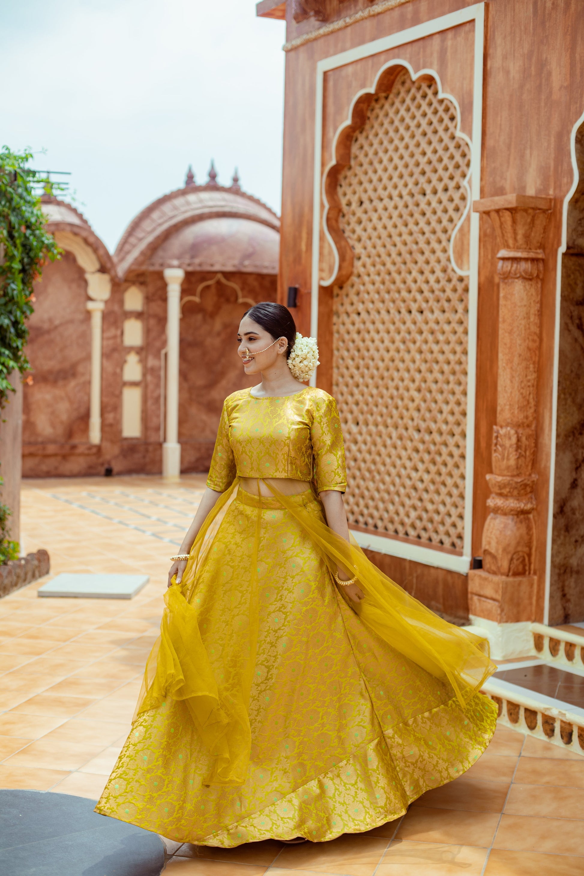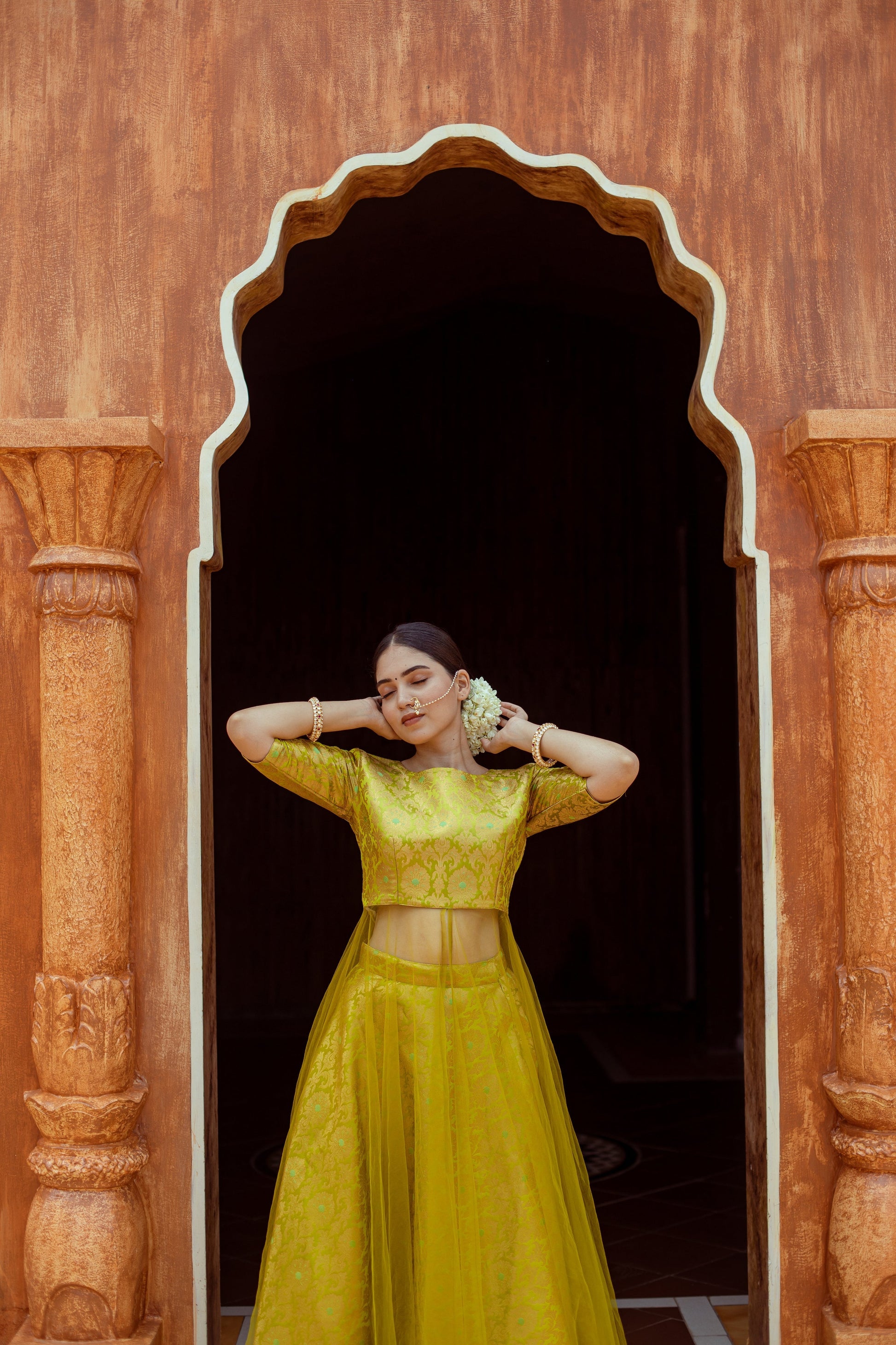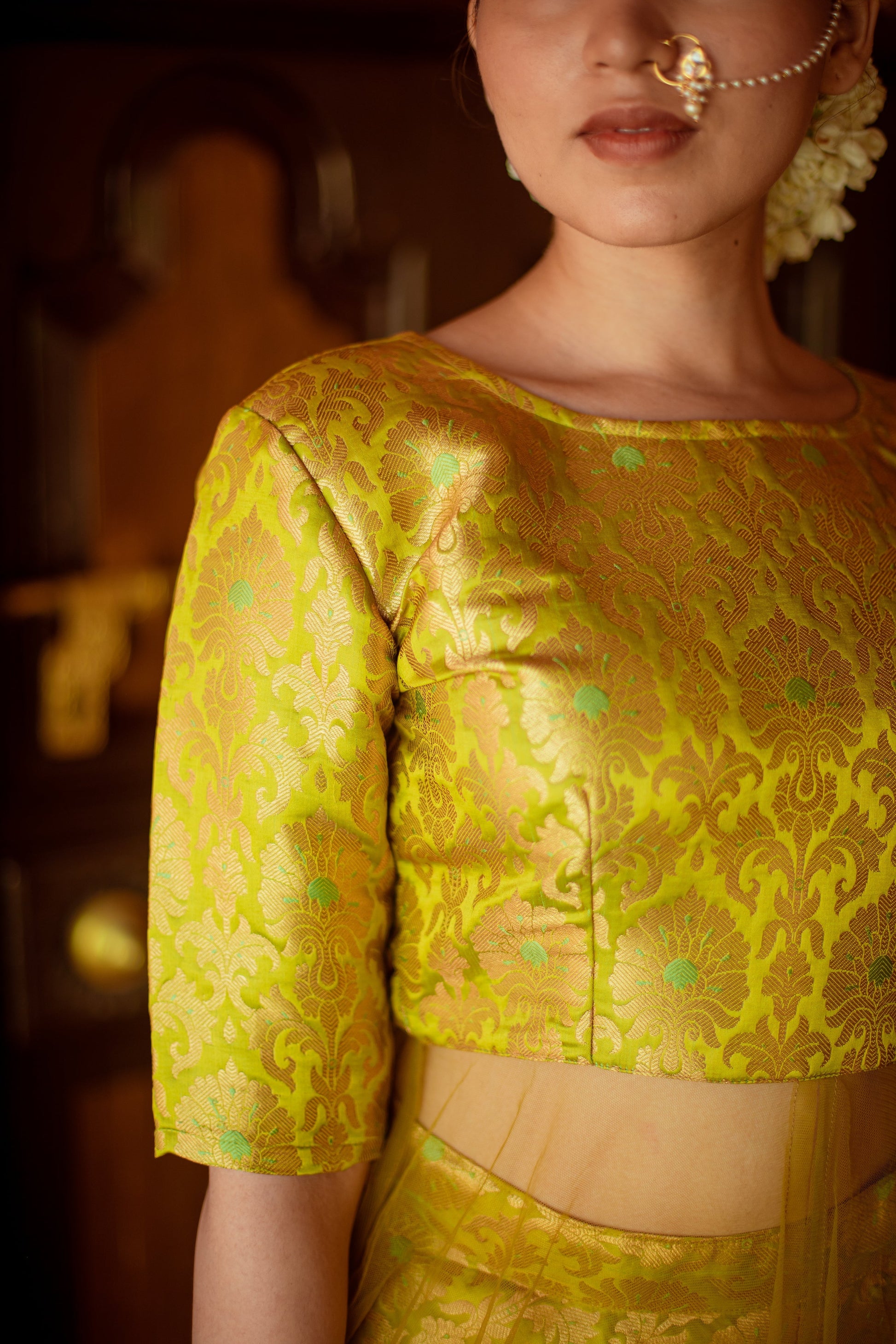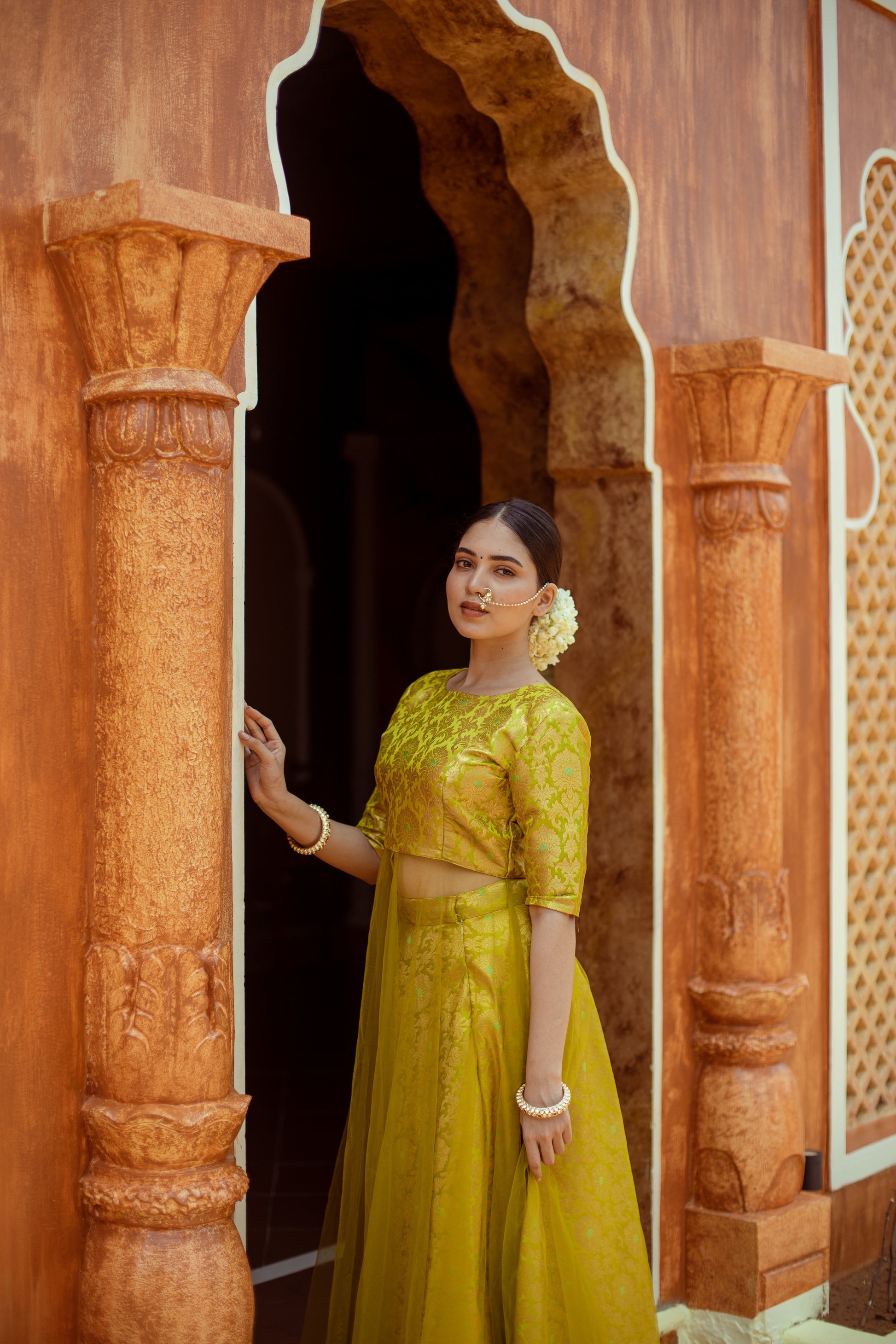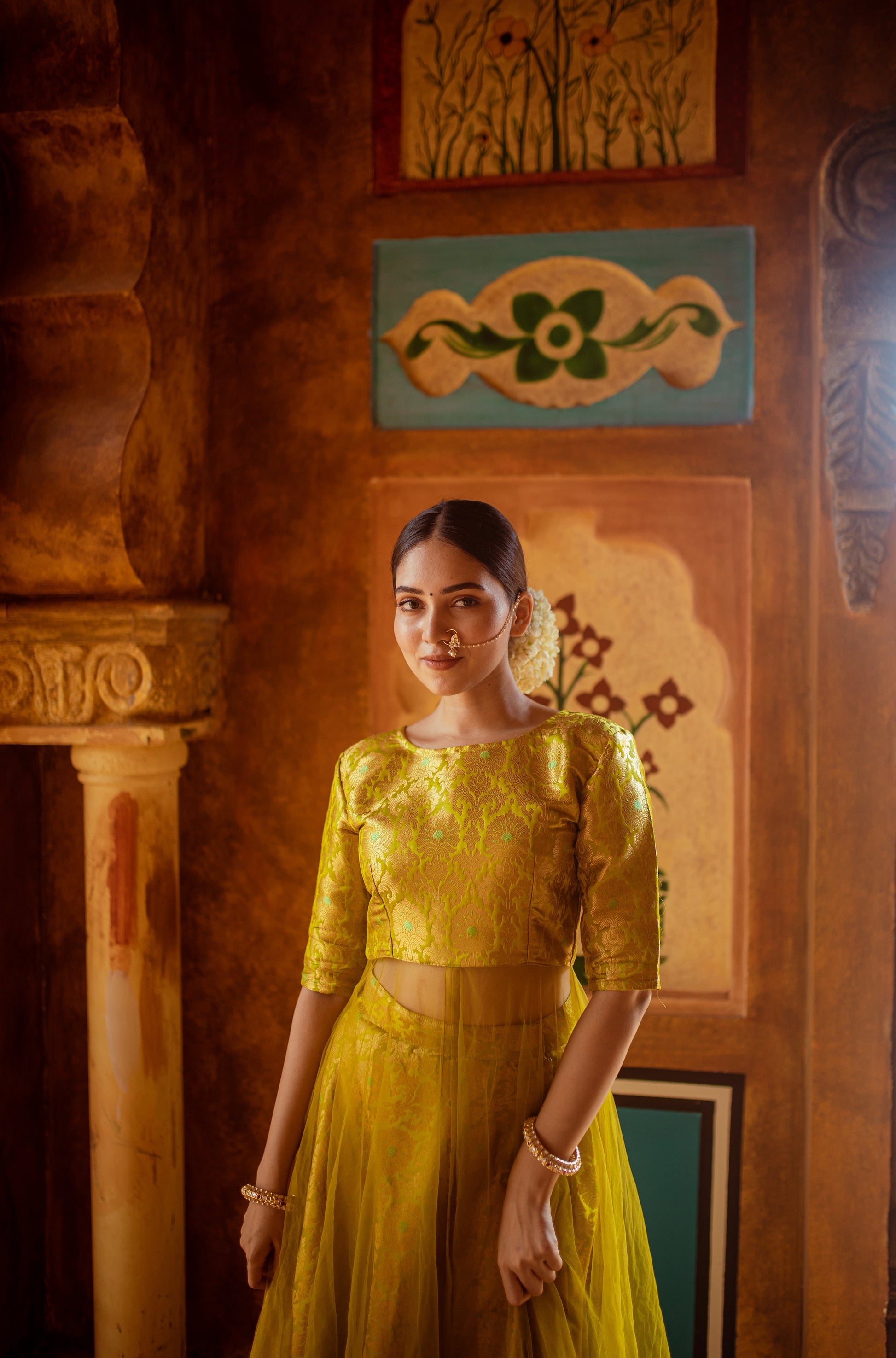Exquisite semi banaras silk crop top and skirt in vibrant lime green. The crop top comes with an attached sheer net that adds the oomph factor to the look. This royal outfit is a must-have in your wardrobe! Lining provided.