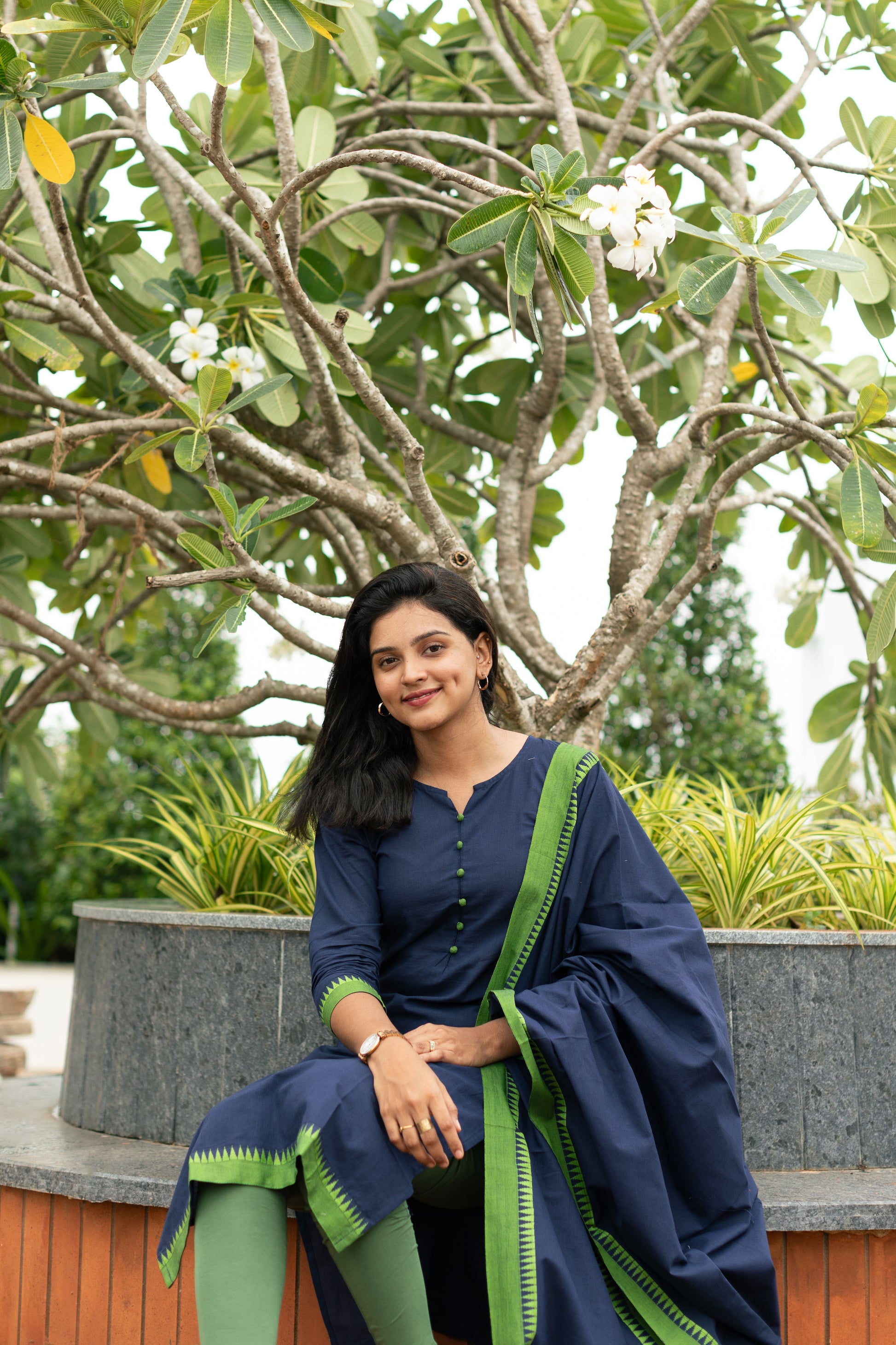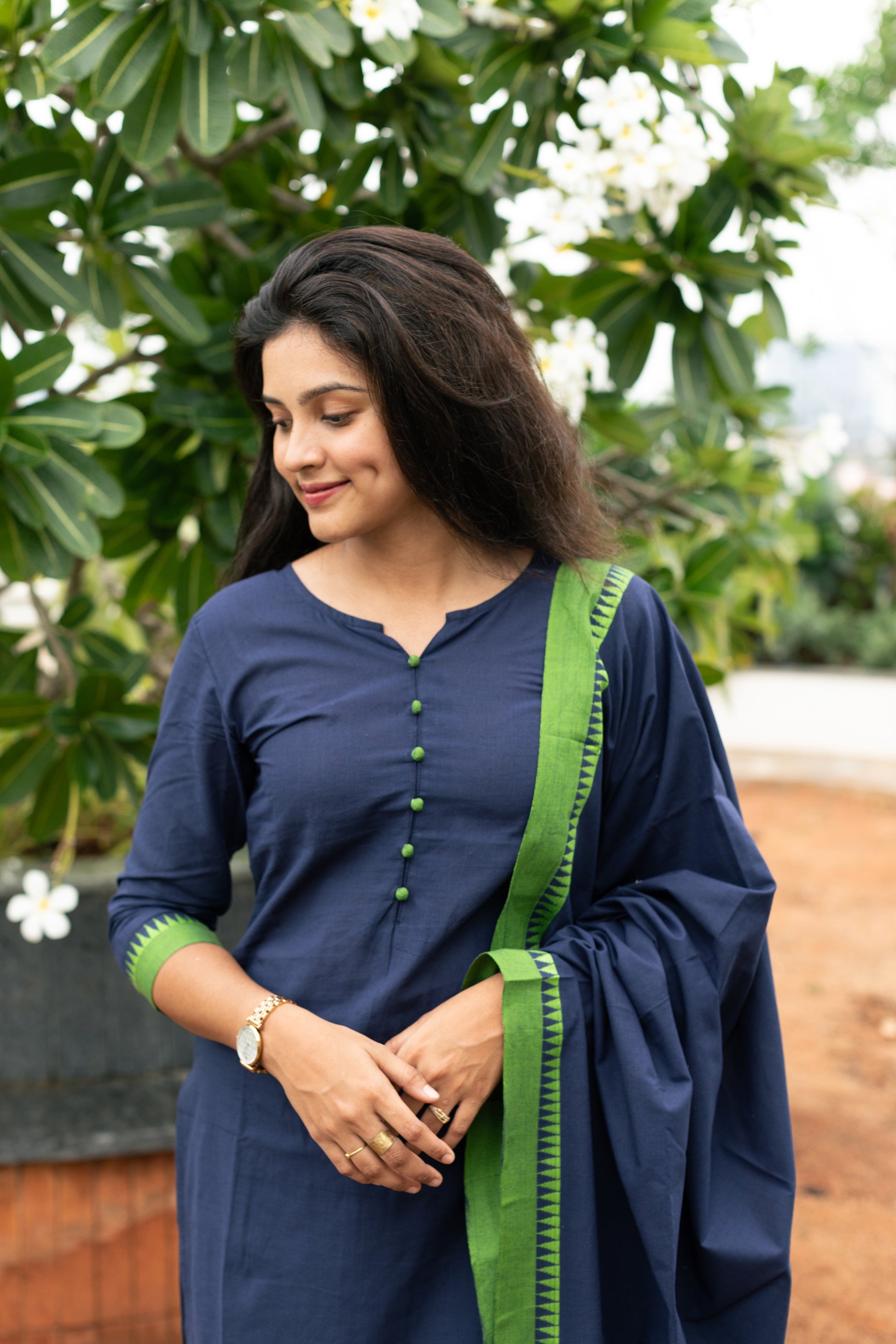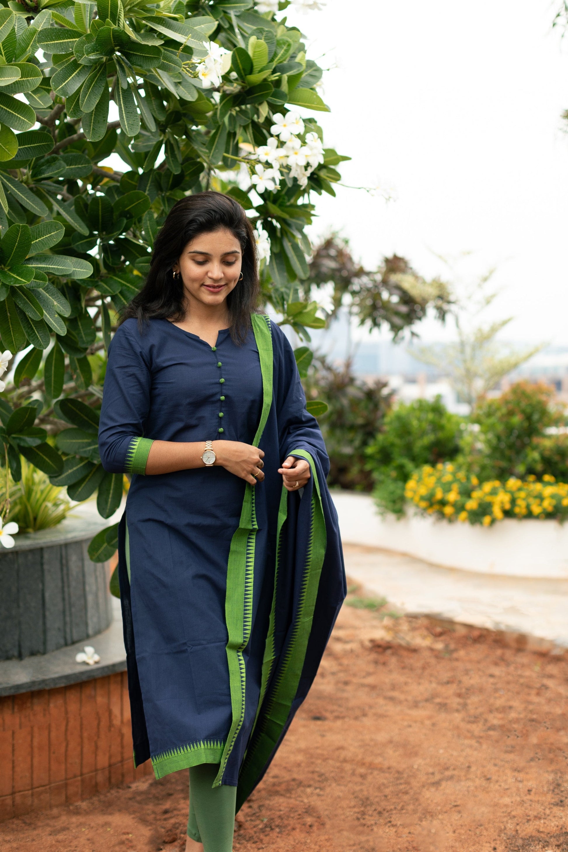 Pretty navy blue & green temple border kurta-dupatta set. A comfortable and chic college/workwear outfit.