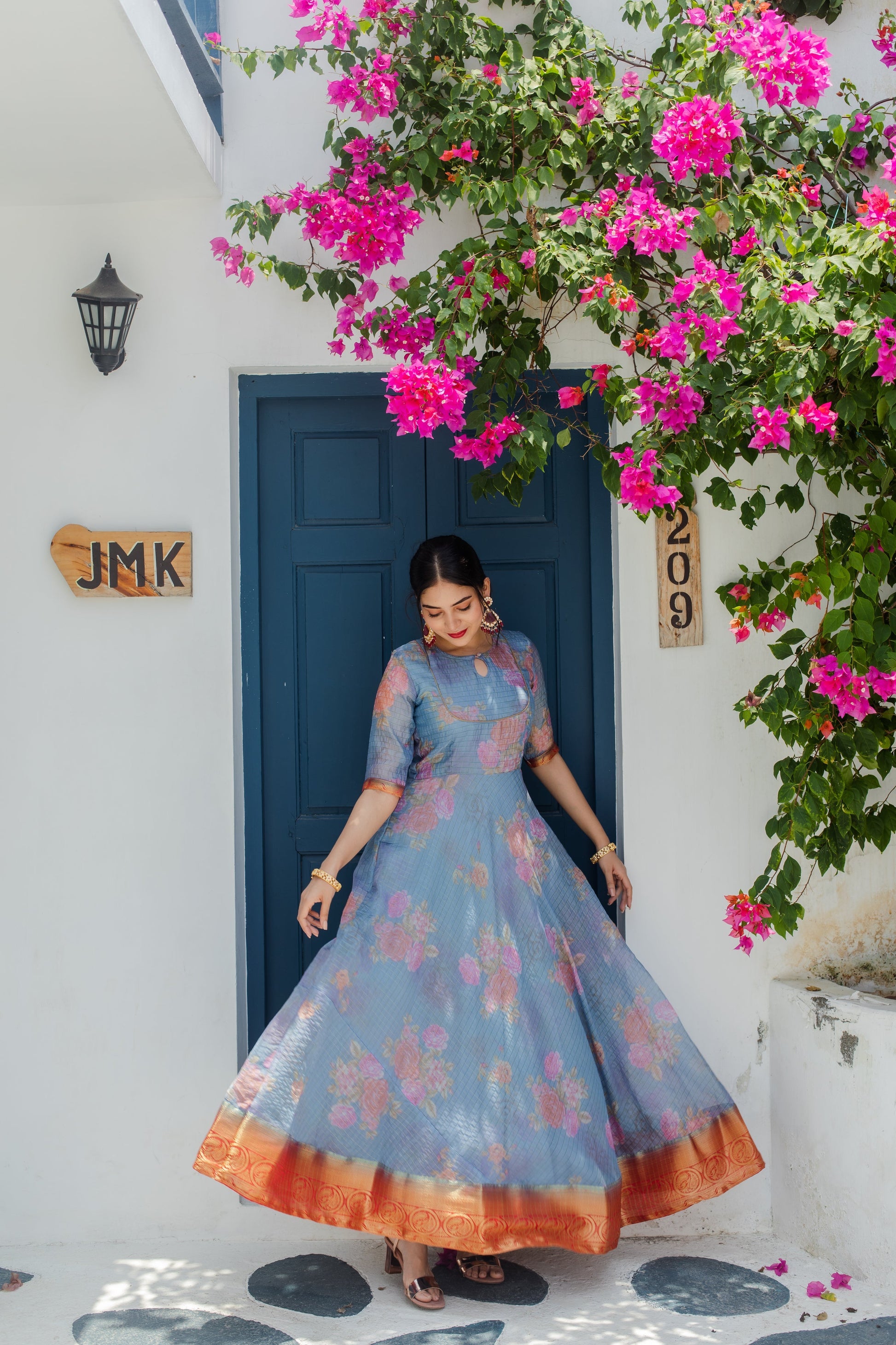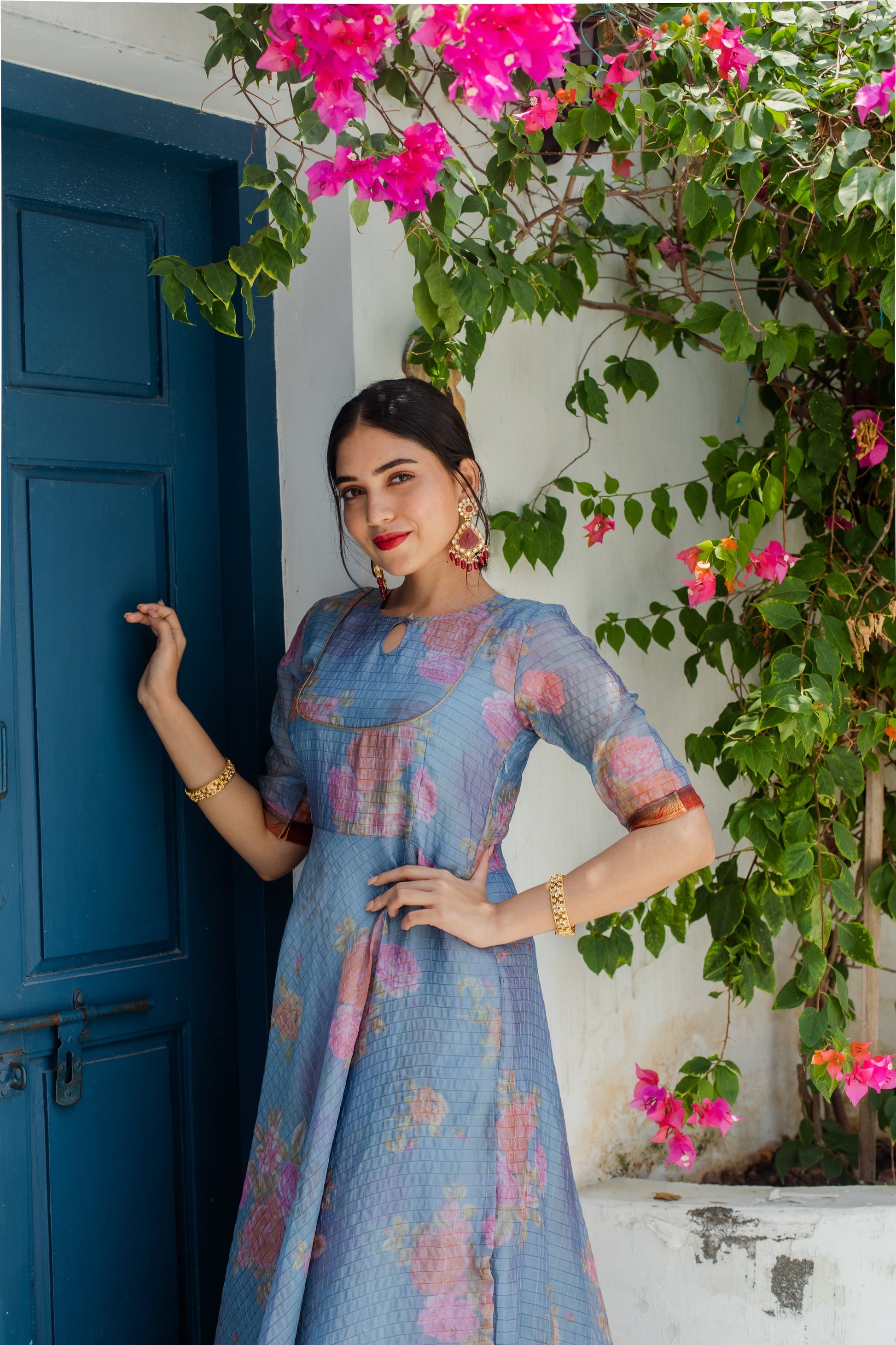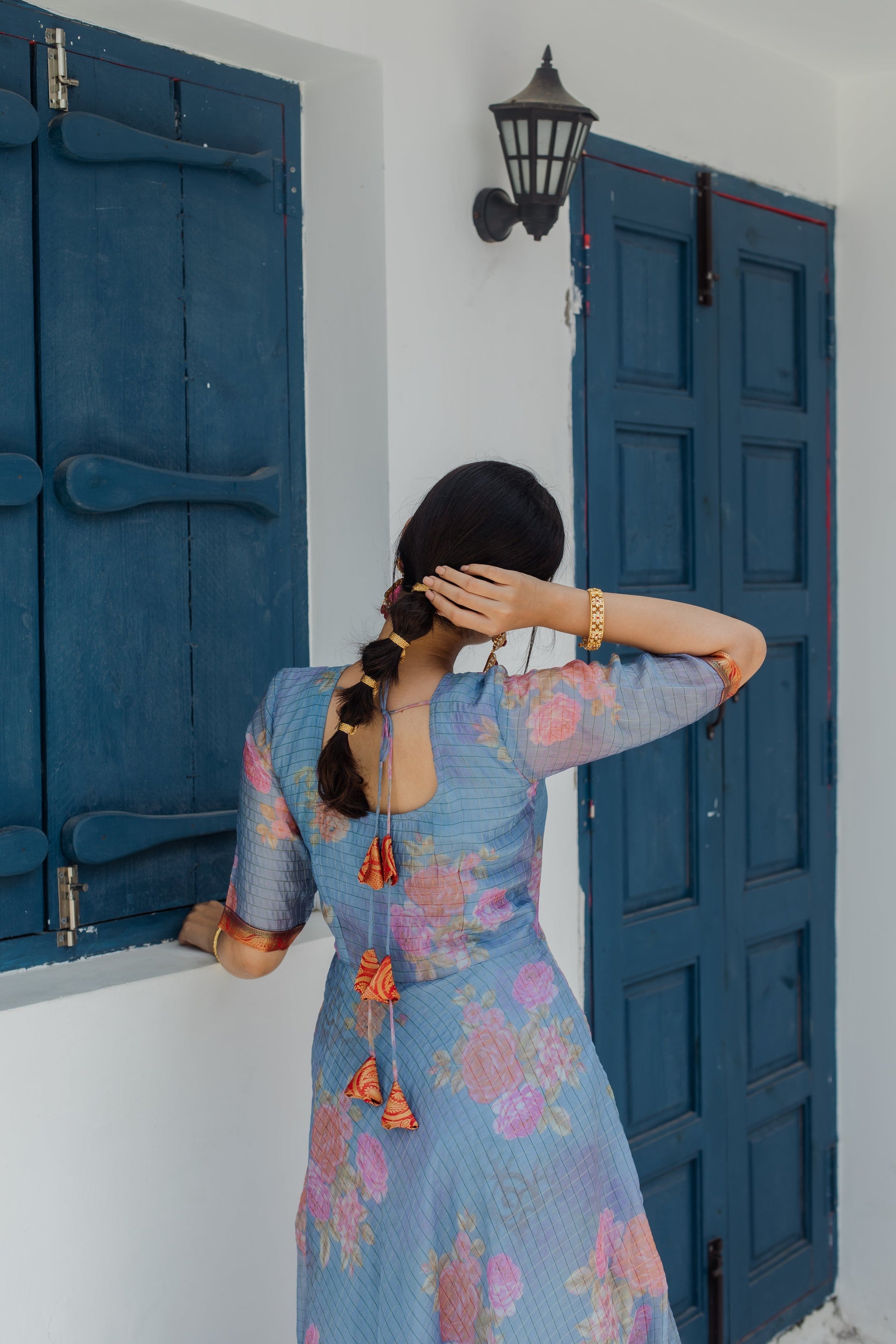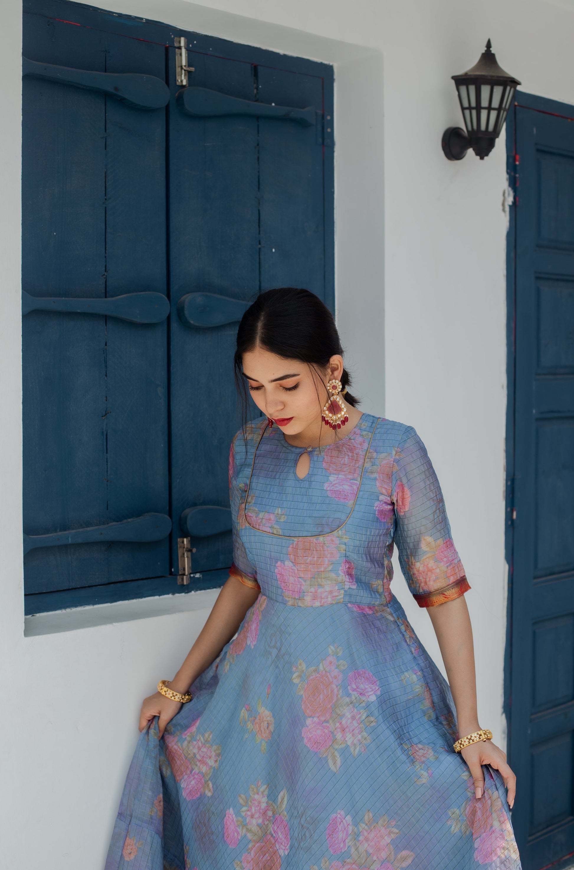 Beautiful dusty blue, gold checkered organza fit-and-flare dress with pretty floral prints all over. This simple yet stunning outfit has a red-gold zari border. Lining provided.