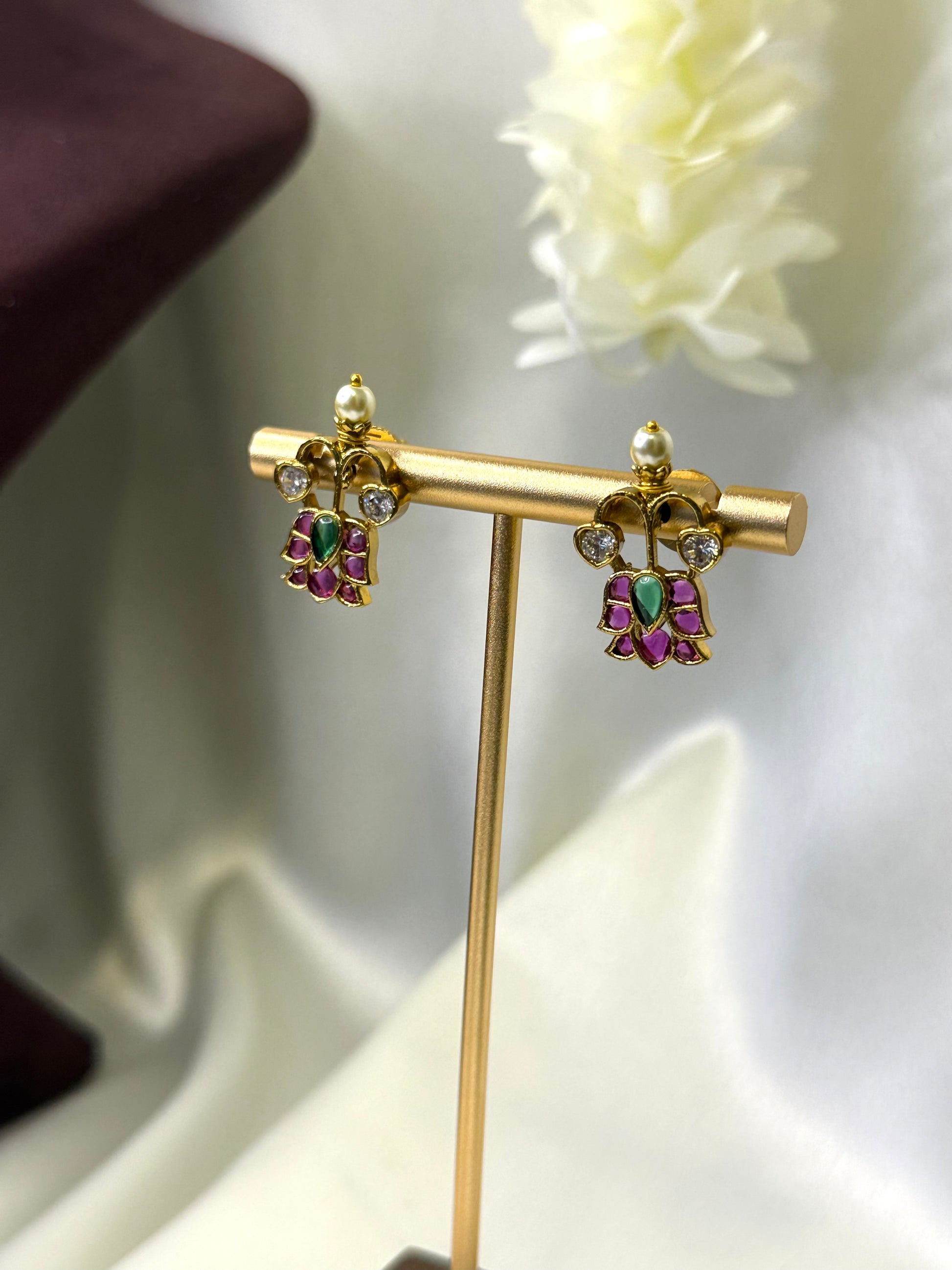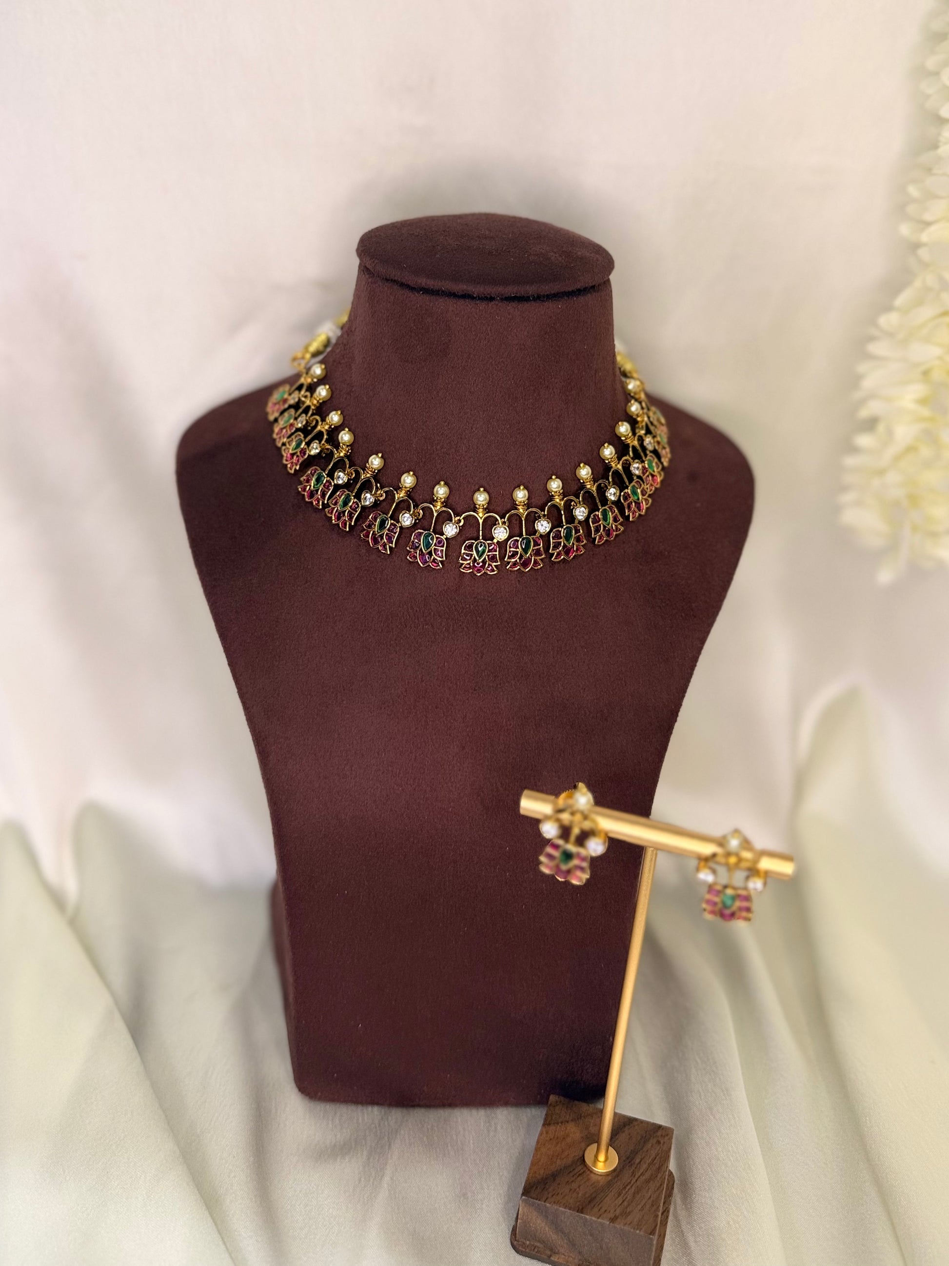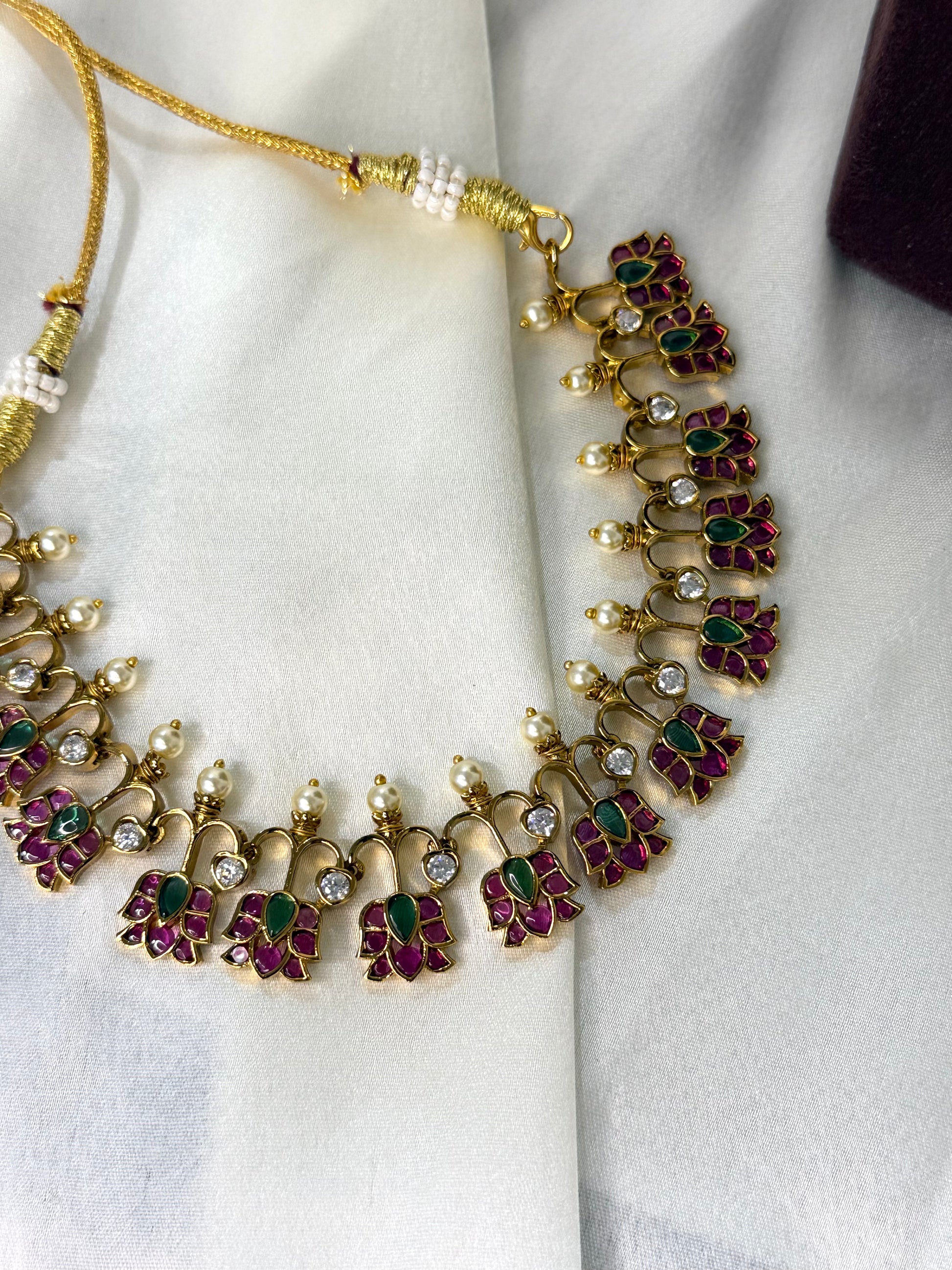 A contemporary South Indian necklace designed with alternating ruby and emerald-toned stones, finished with elegant pearl accents. The floral-inspired pattern adds a regal charm while maintaining a refined silhouette.