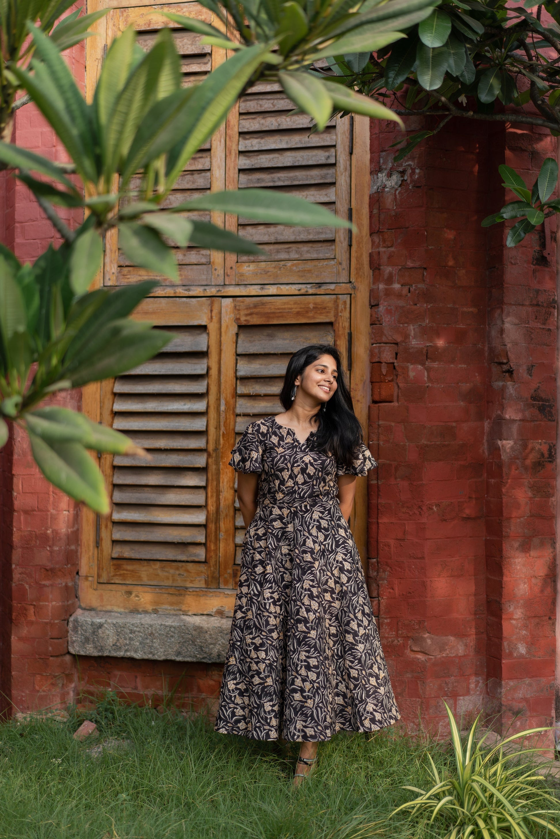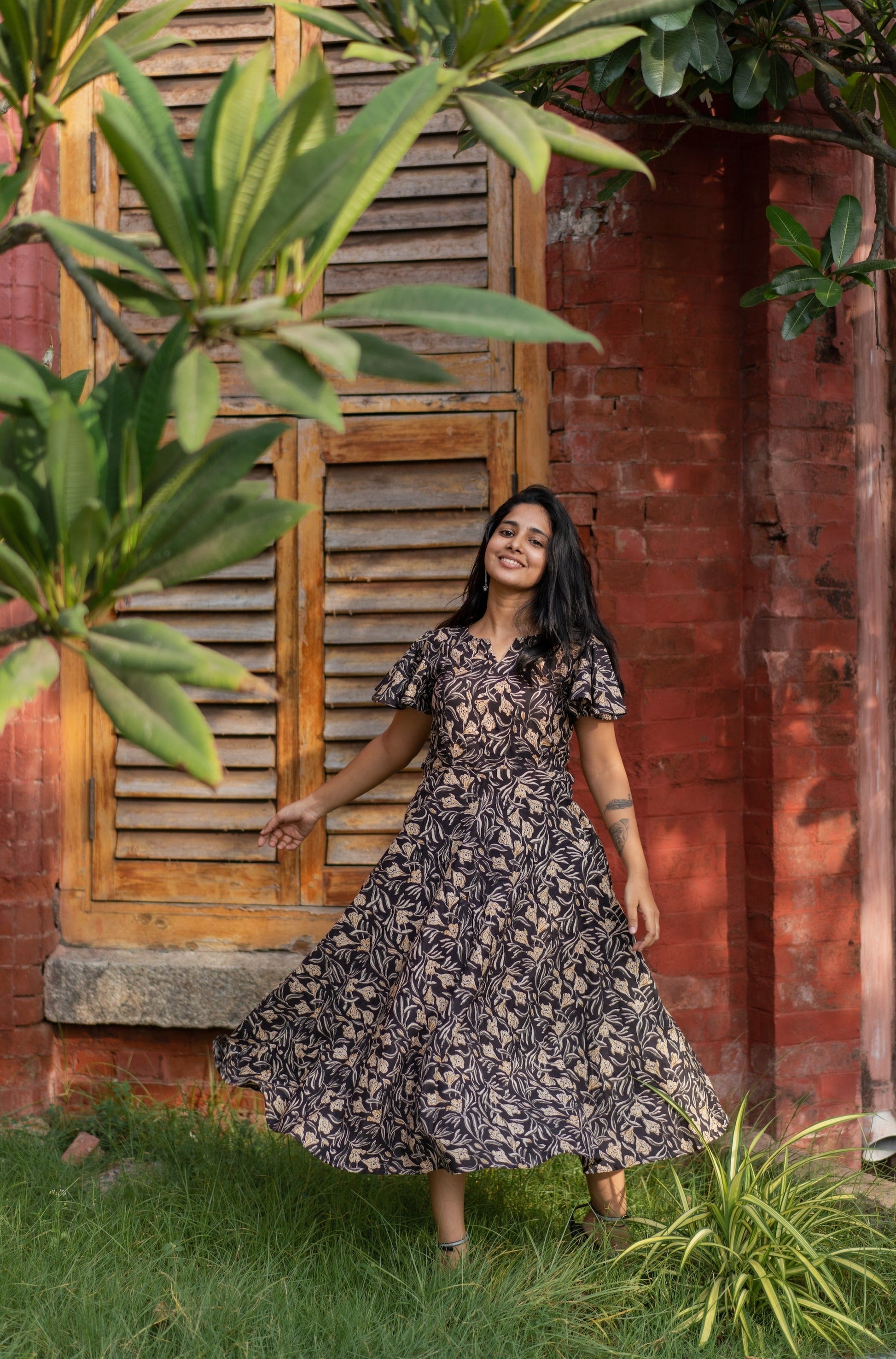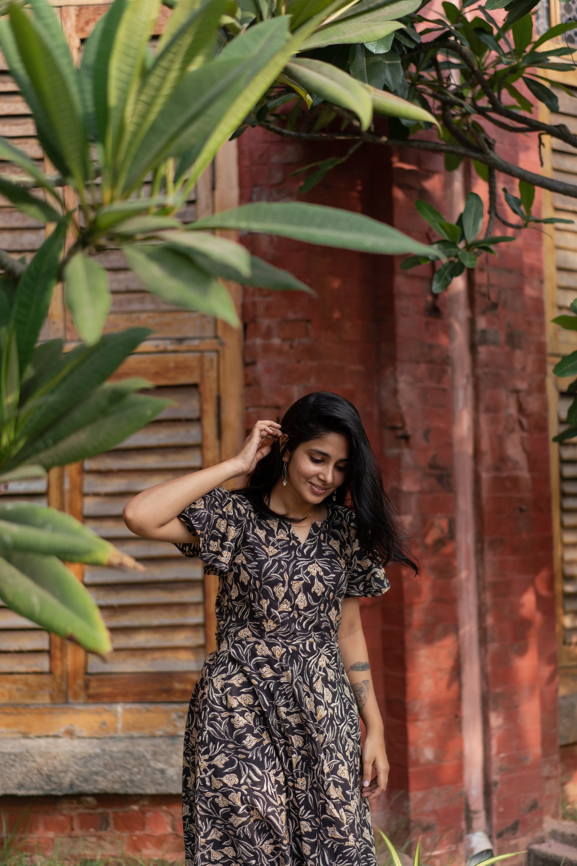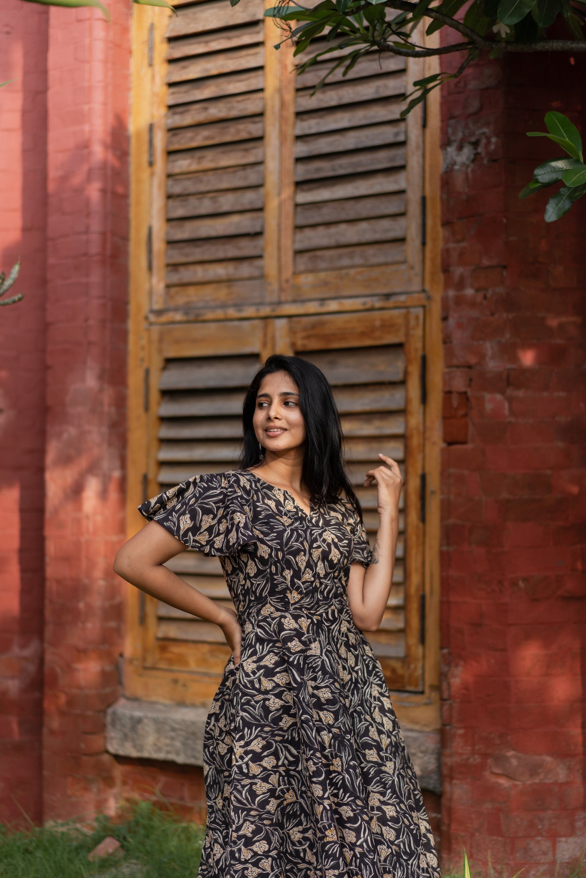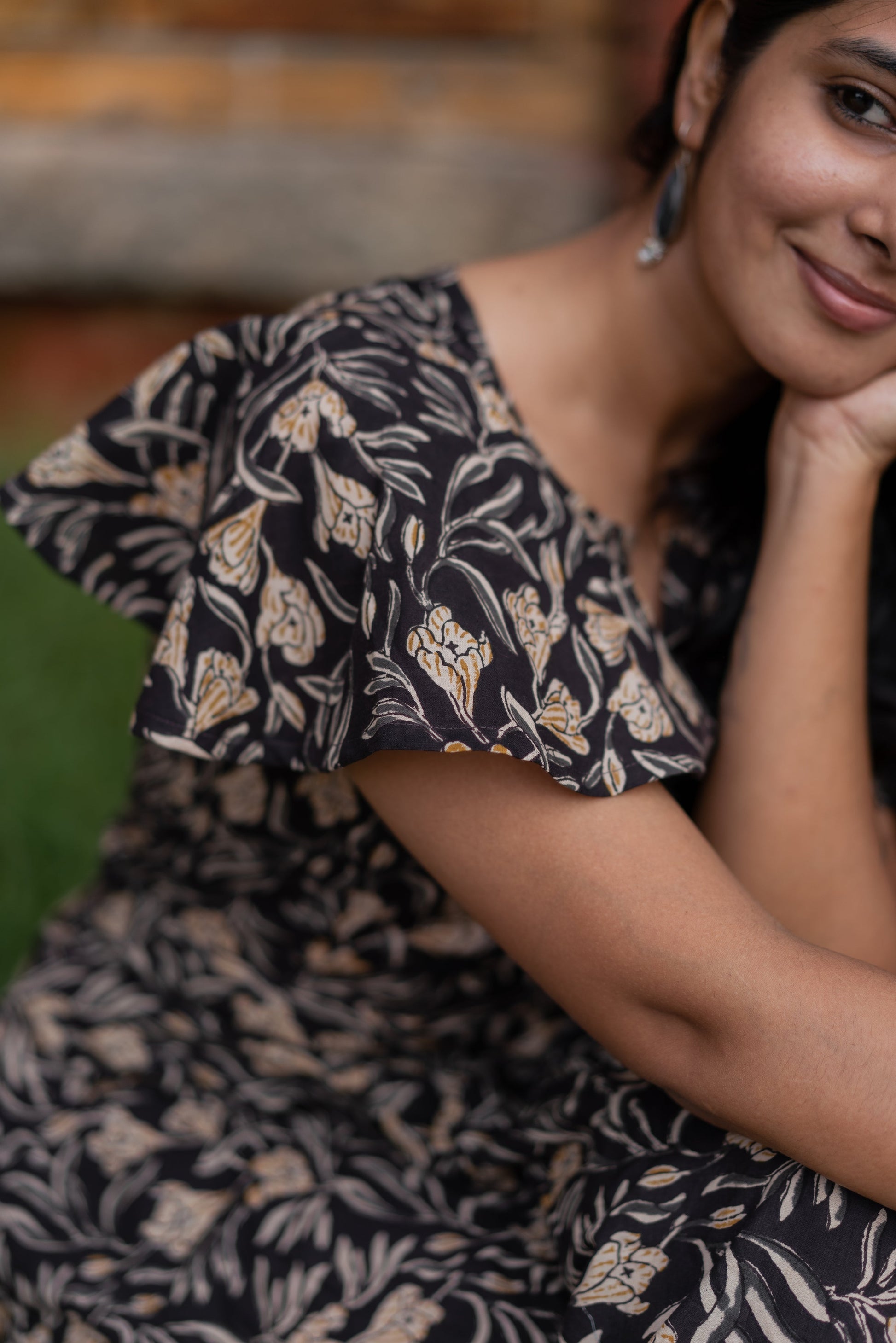 Black floral hand block printed midi dress with flutter sleeves. Made from soft, breathable cotton, this chic and comfortable outfit is a must-have! It has pockets!