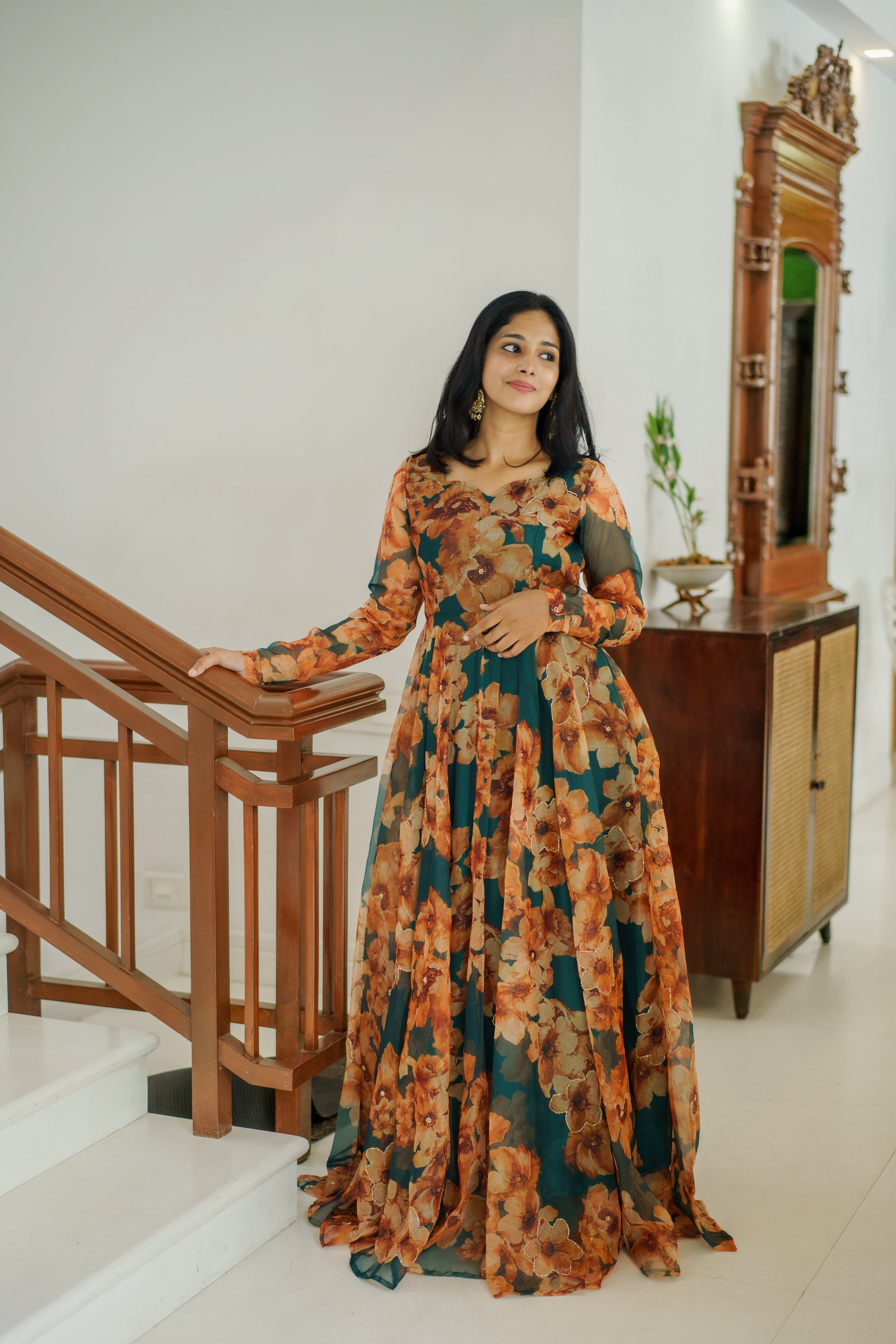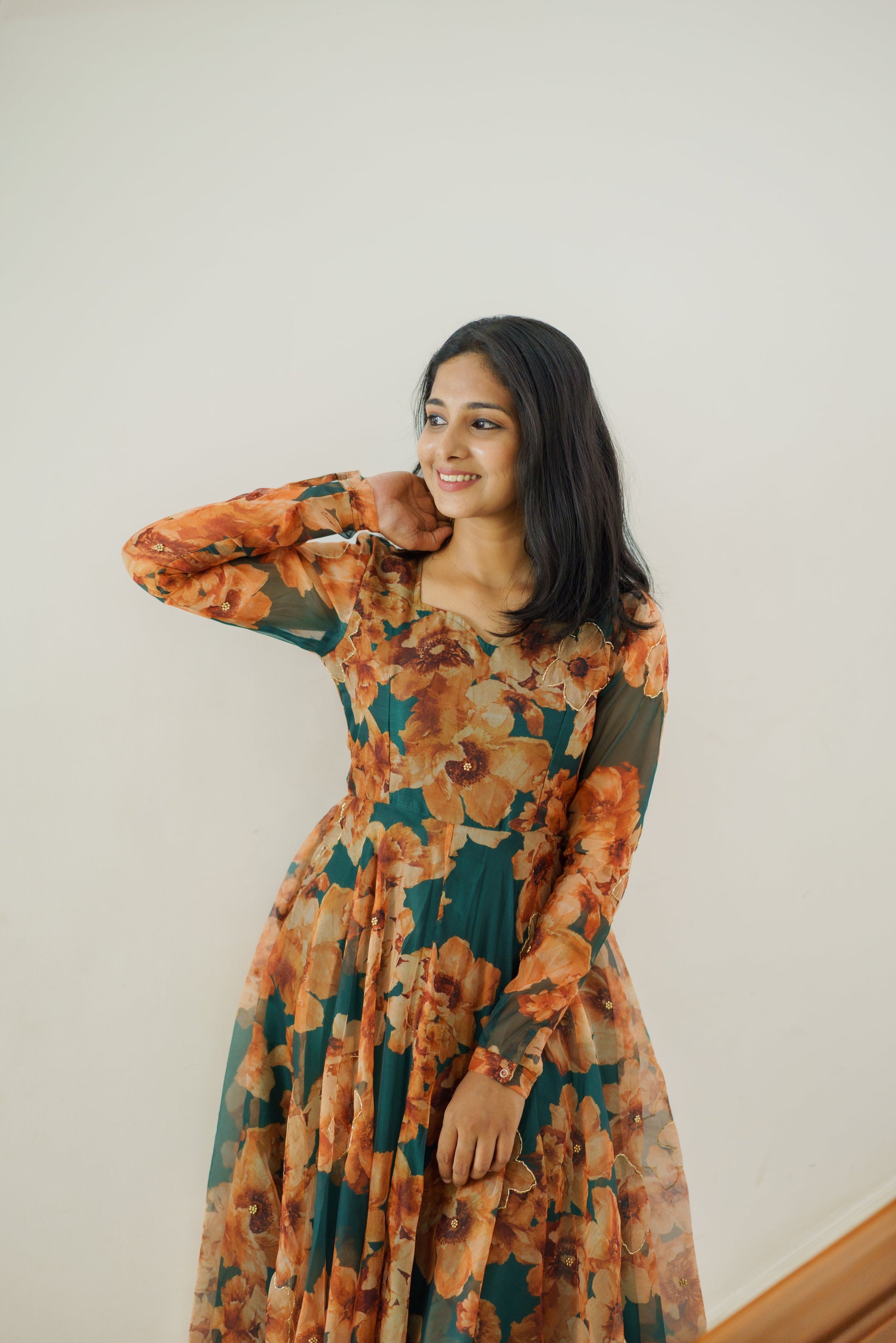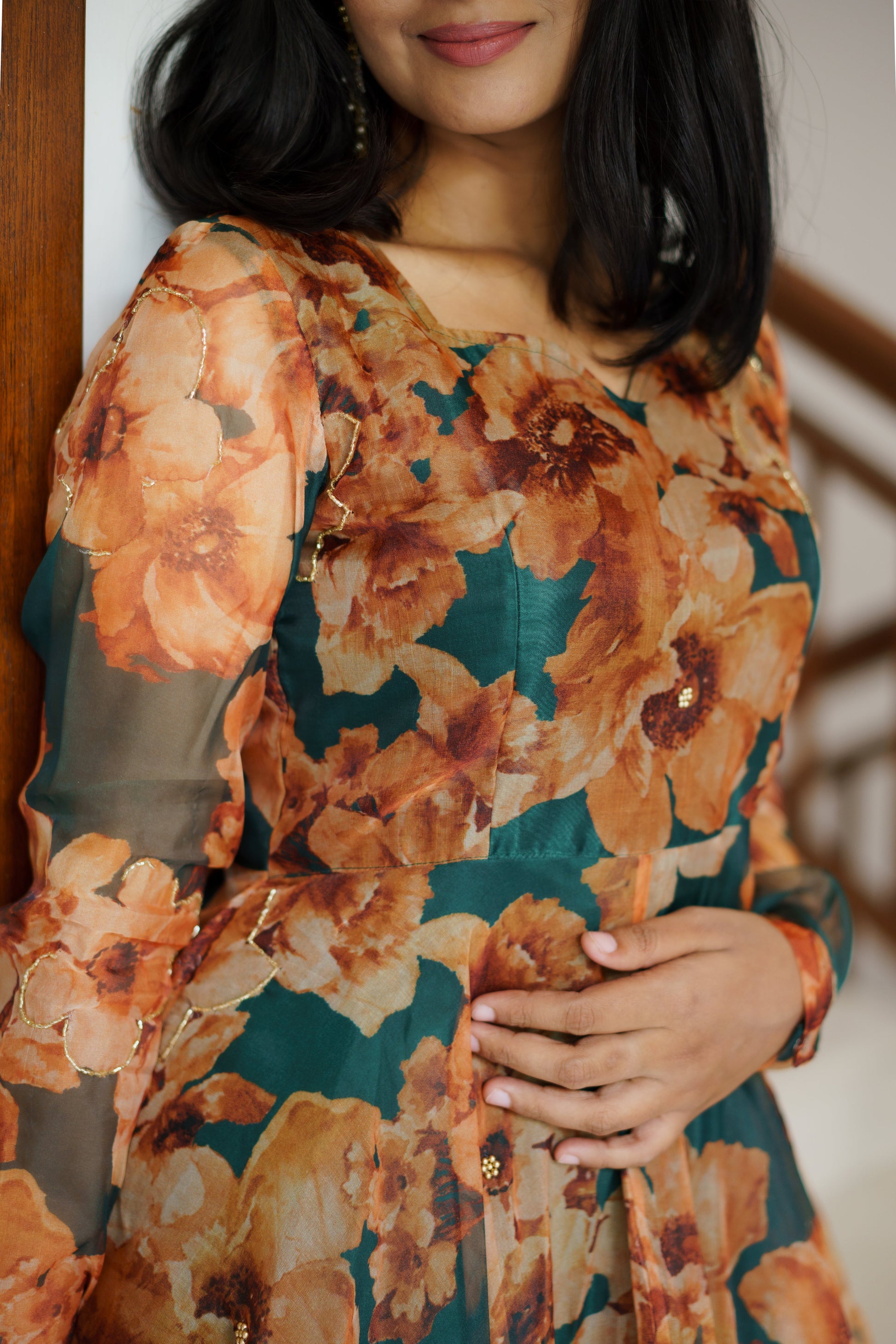 Gorgeous bold floral prints with gold embroidery on bottle green organza. This soft, flowy dress in flattering fit is a must-have! Lining provided.