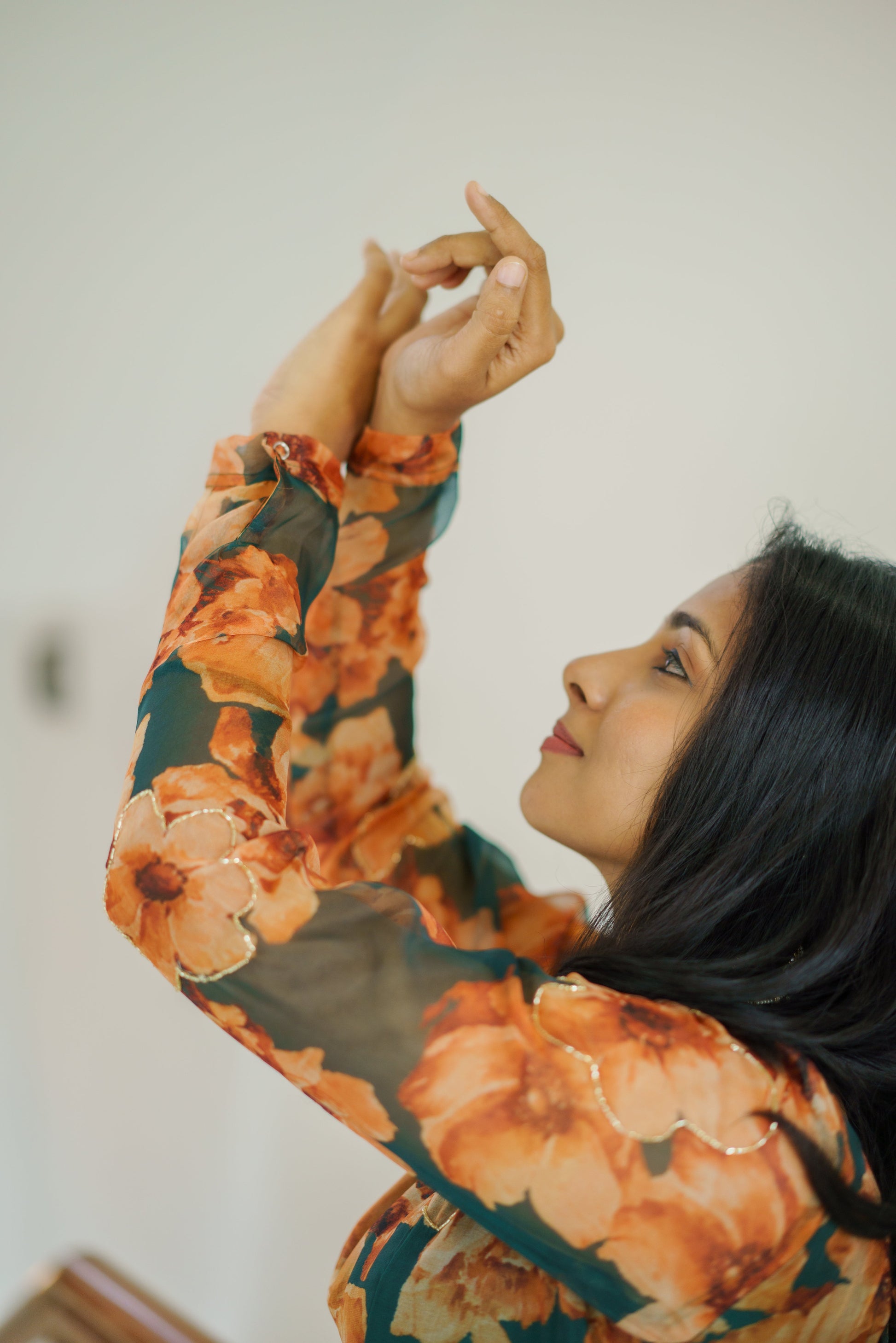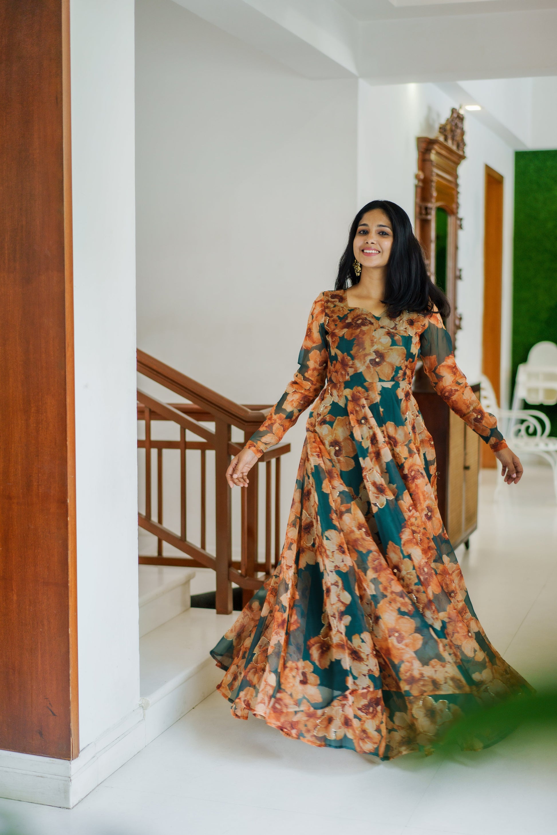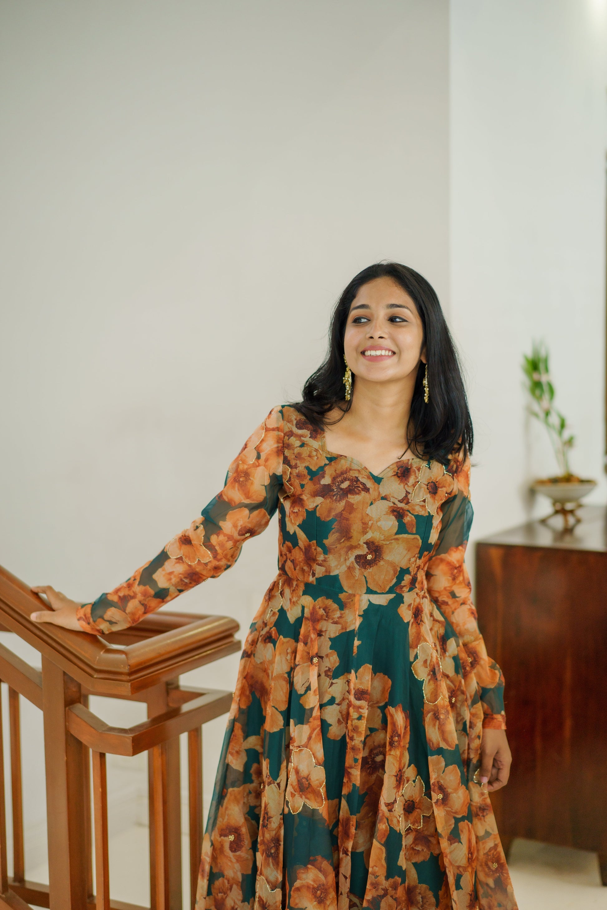 Gorgeous bold floral prints with gold embroidery on bottle green organza. This soft, flowy dress in flattering fit is a must-have! Lining provided.