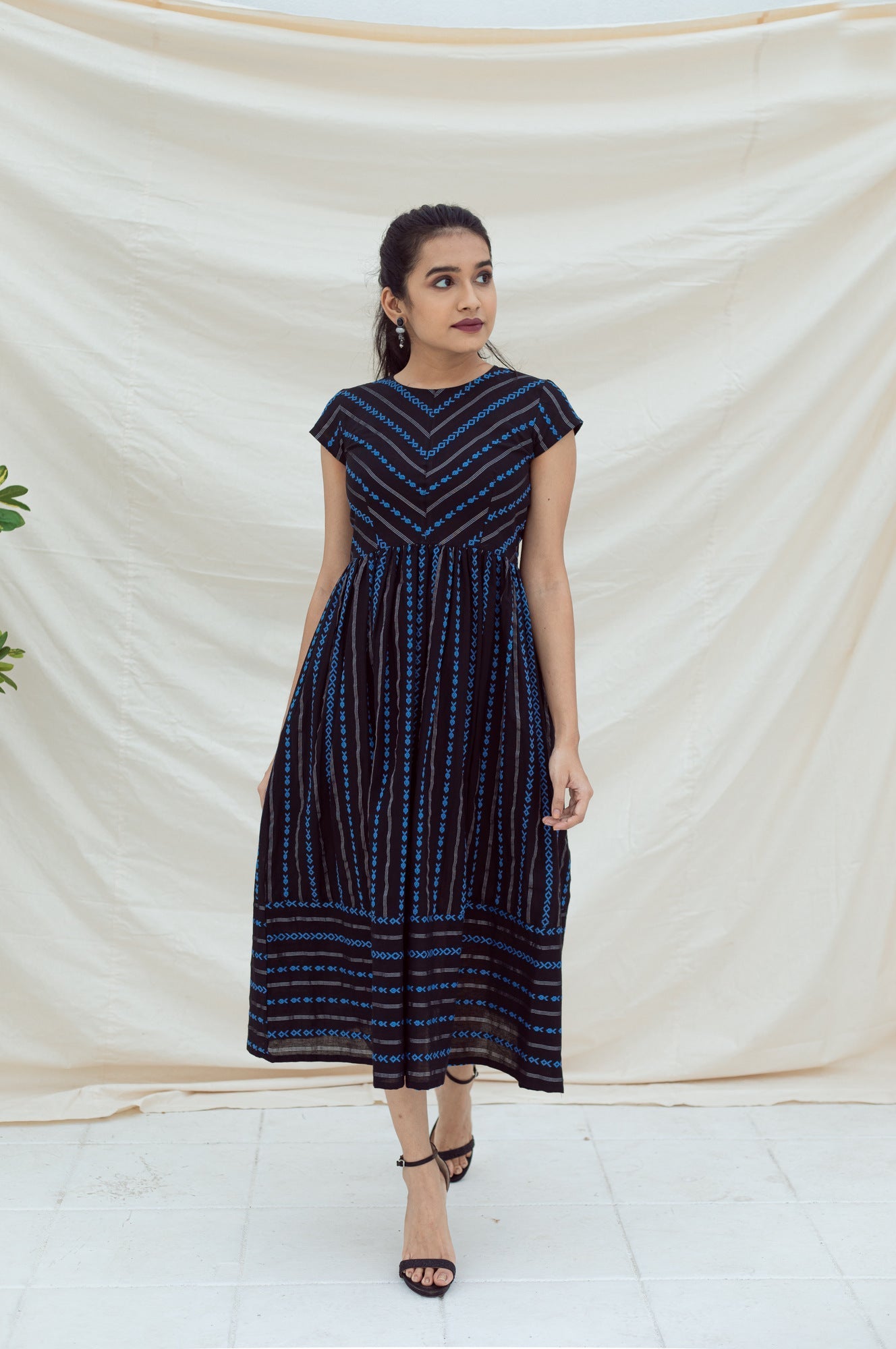 Black handloom dress with woven fish motifs in blue. A super comfortable, smart, and casual outfit.