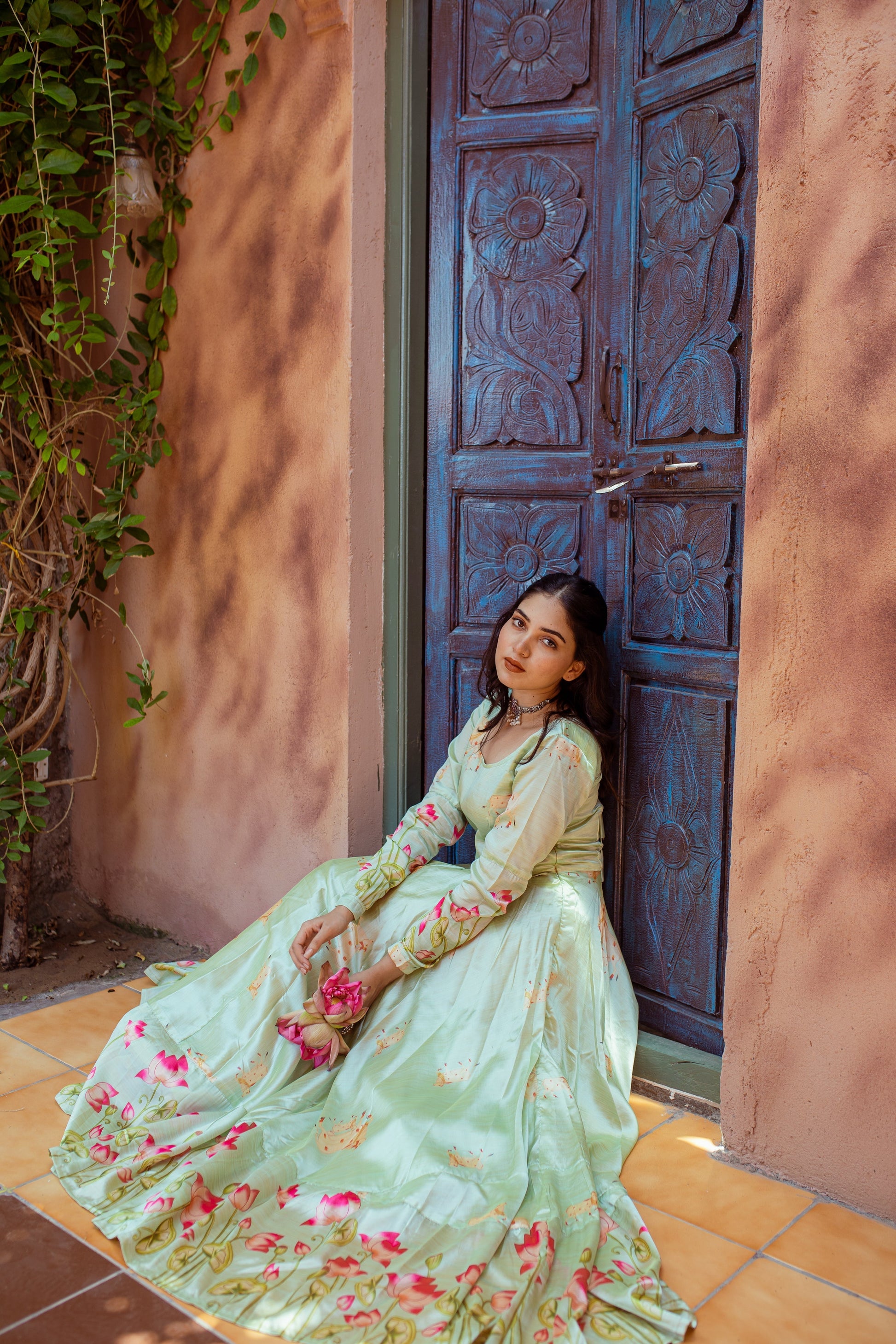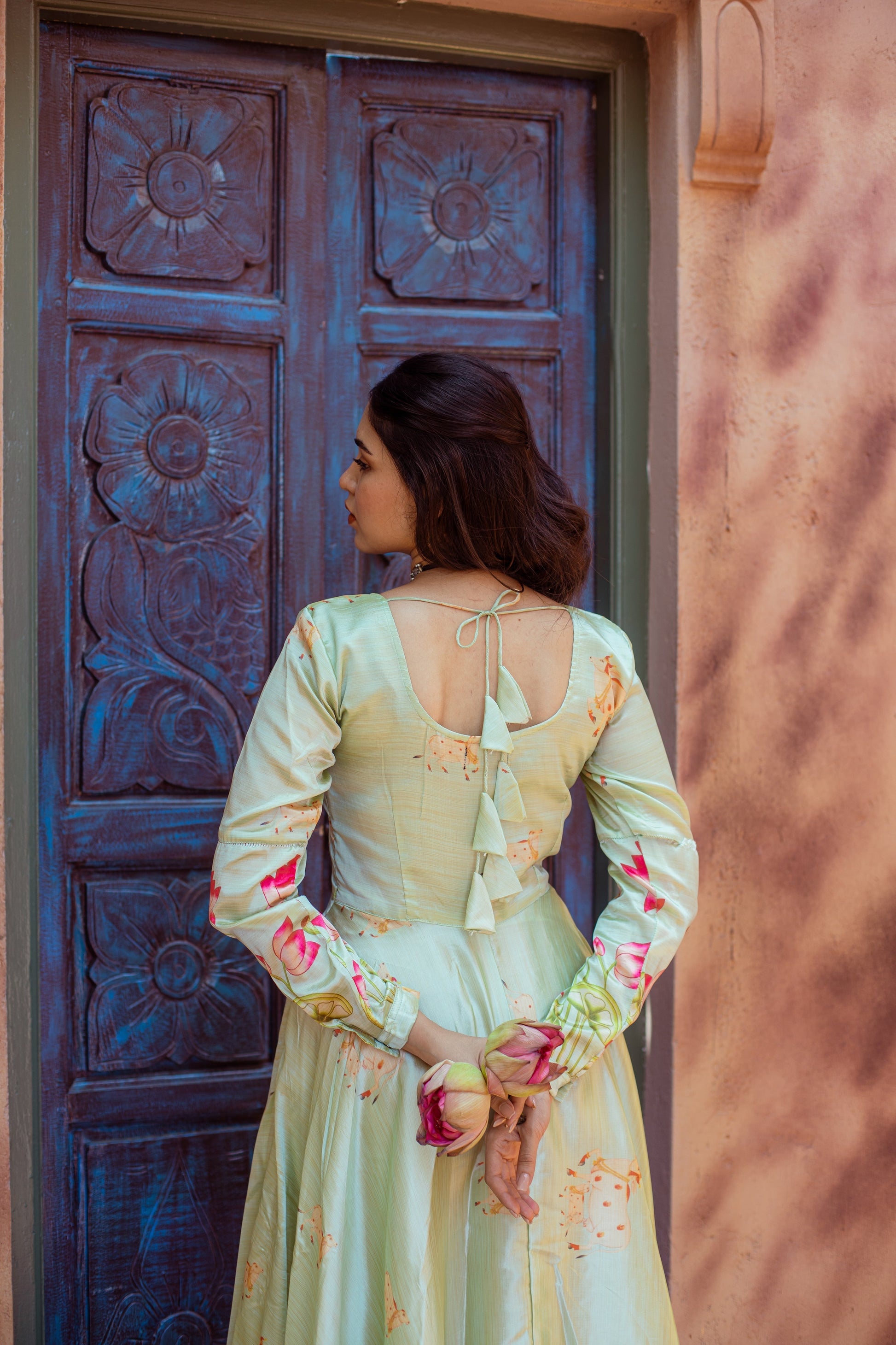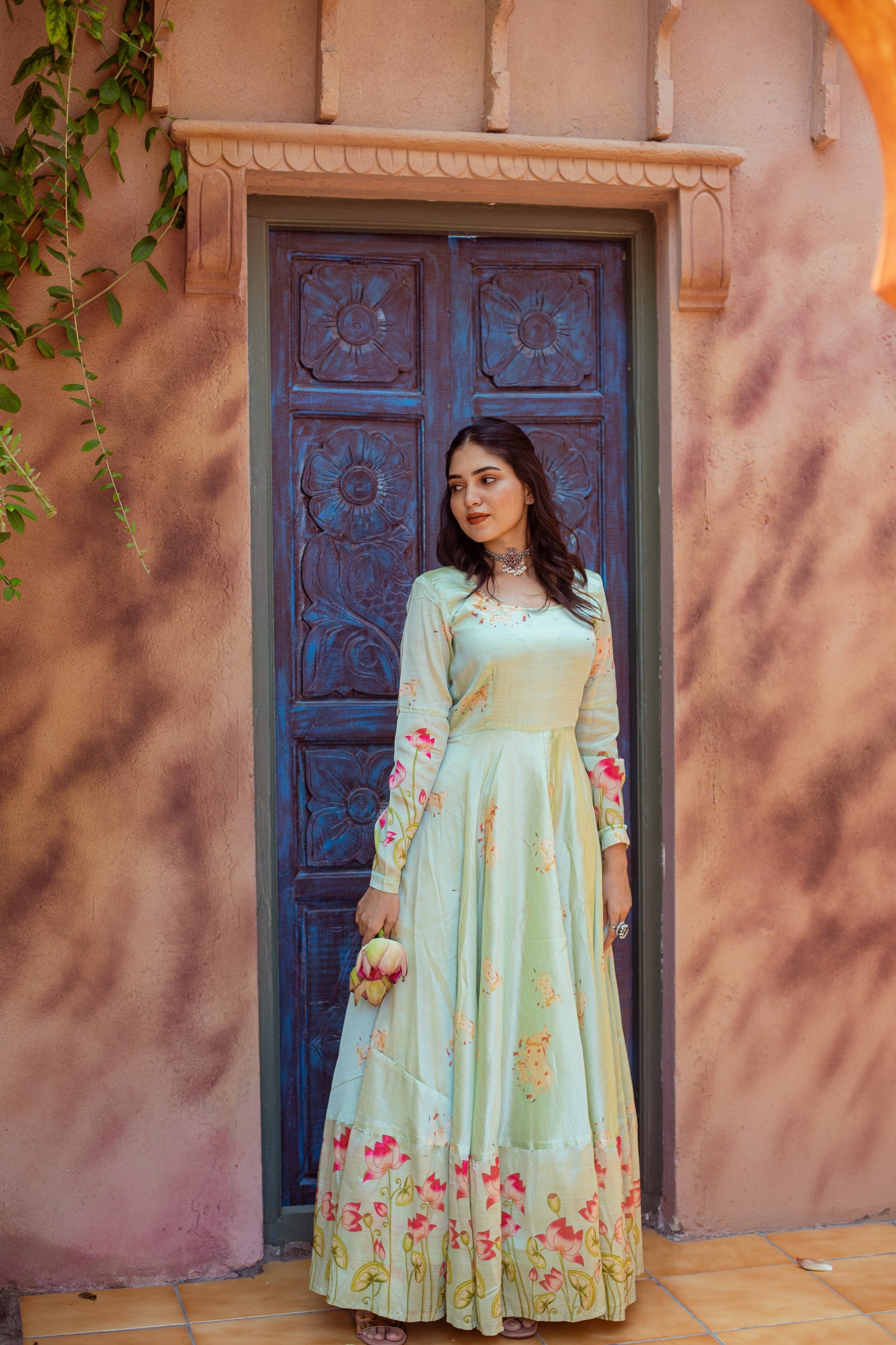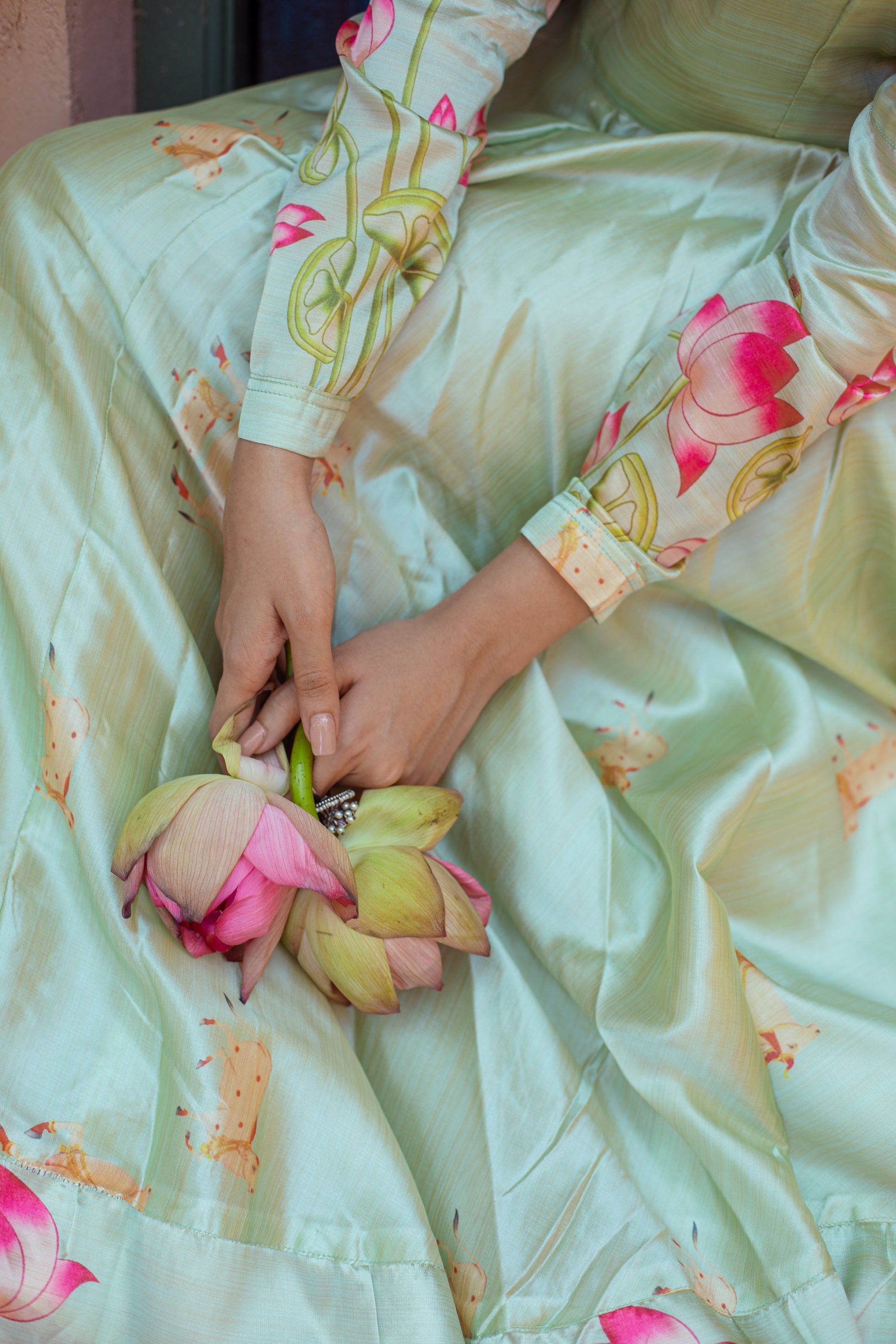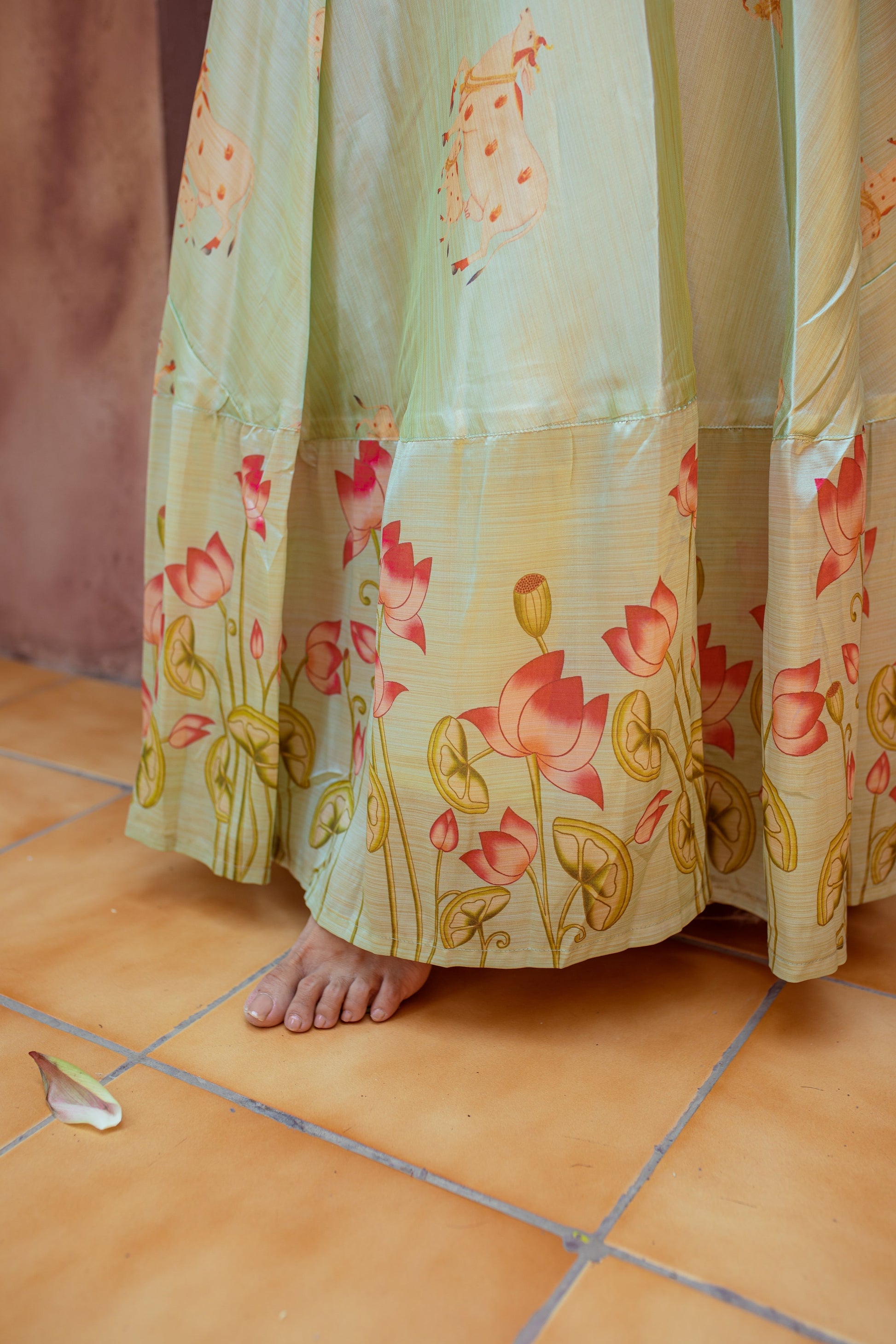 Beautiful pastel green fit-and-flare silk dress with exquisite Pichwai cow and lotus motifs. This simple yet stunning outfit is a must-have in your wardrobe! Lining provided.