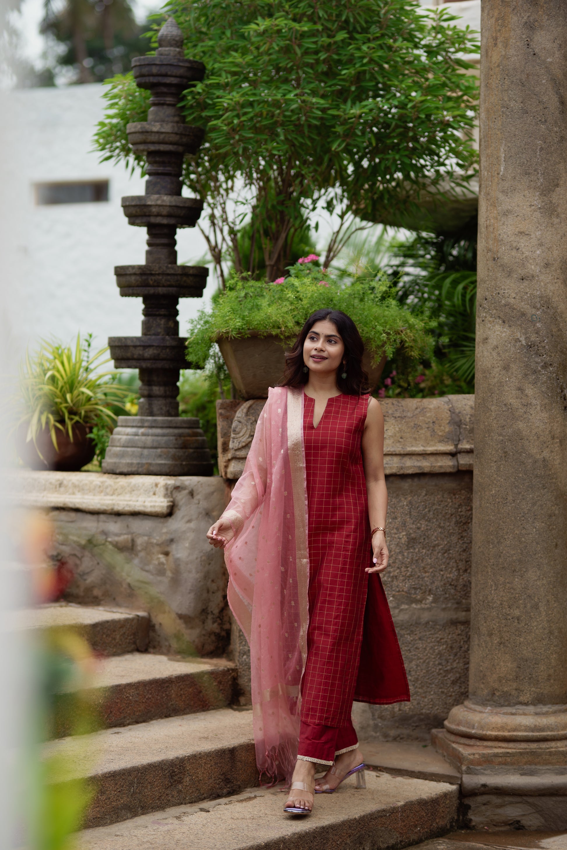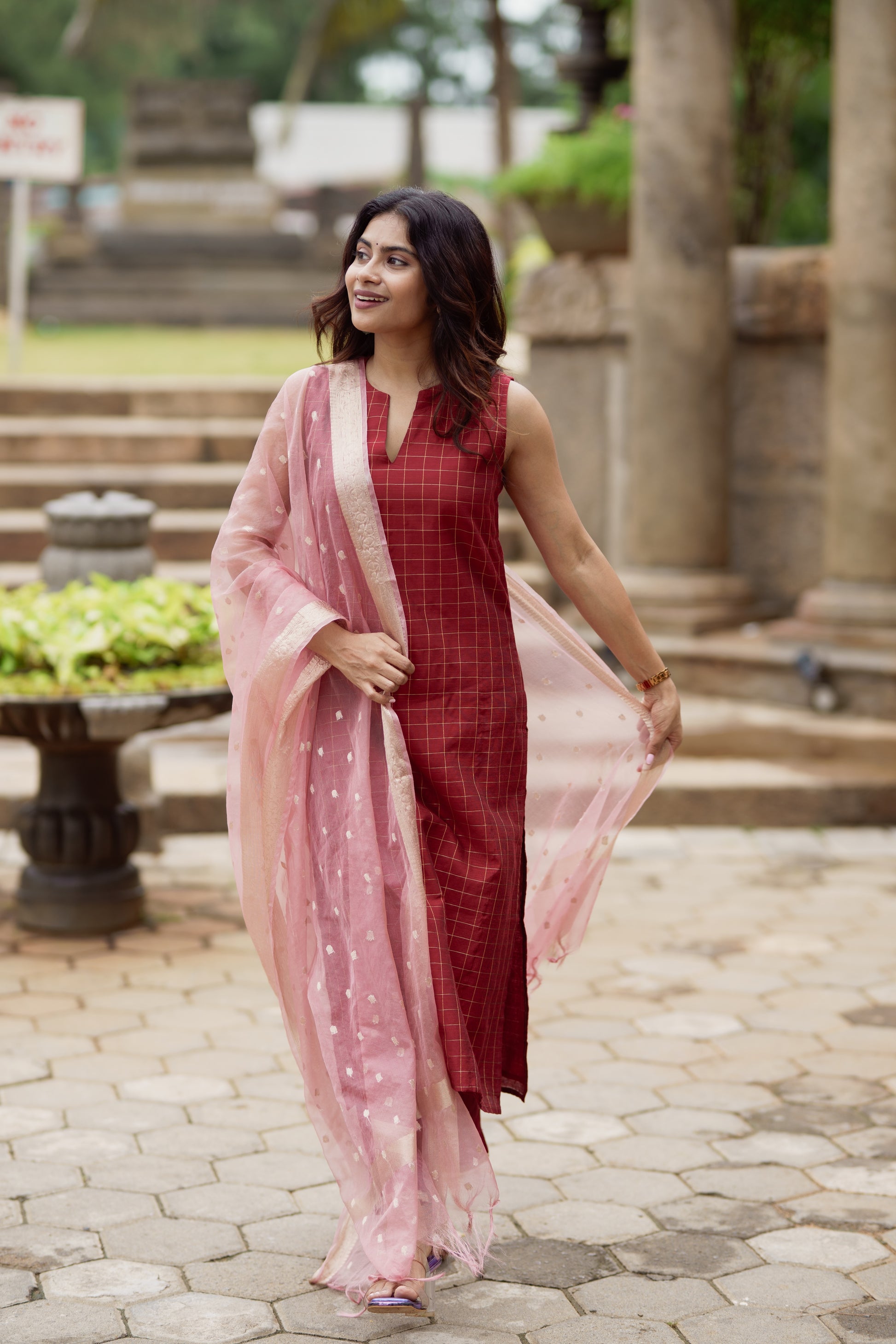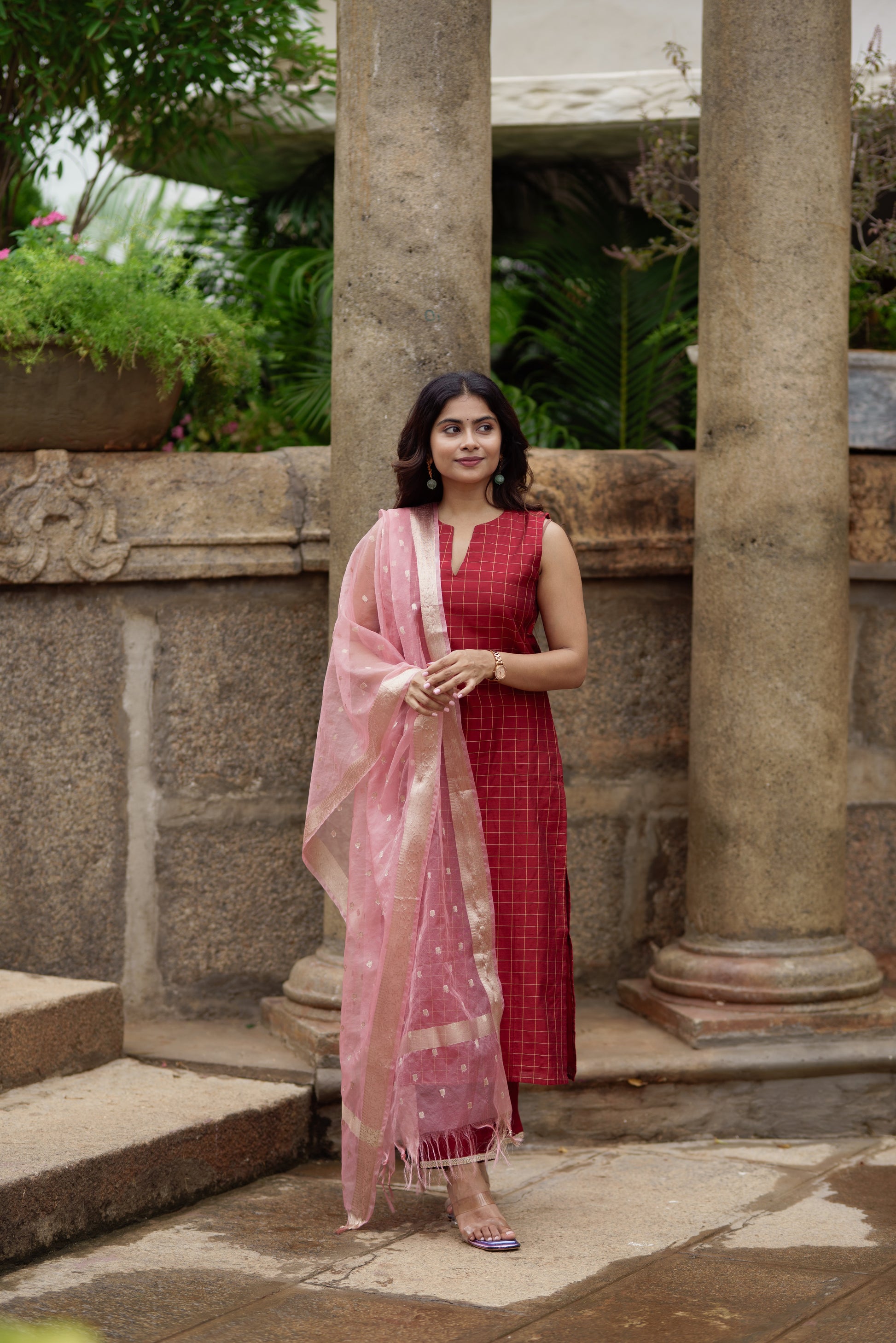 A beautiful maroon checkered kurta set in dupion silk, paired with matching pants. The sleeveless kurta features a classic grid weave design with a subtle V-slit neckline, and pants detailed at the hem. Adding a delicate contrast is the soft blush pink organza dupatta, highlighted with dainty gold buttas and a shimmering zari border. Ideal for festive gatherings, this set combines the richness of silk with the lightness of organza.