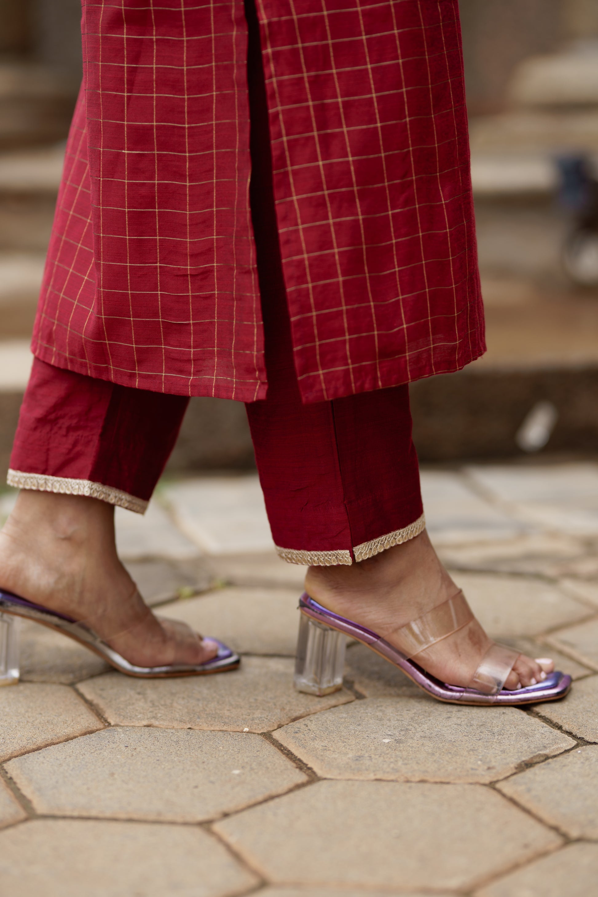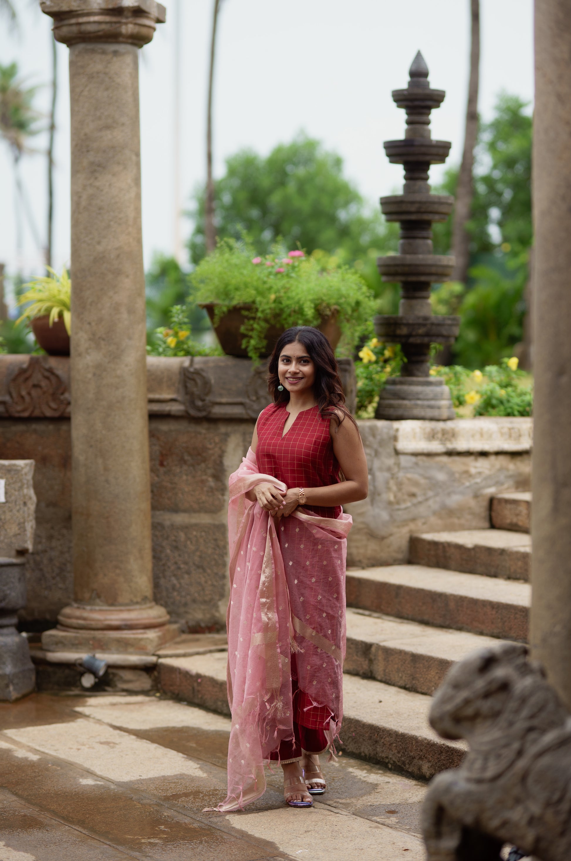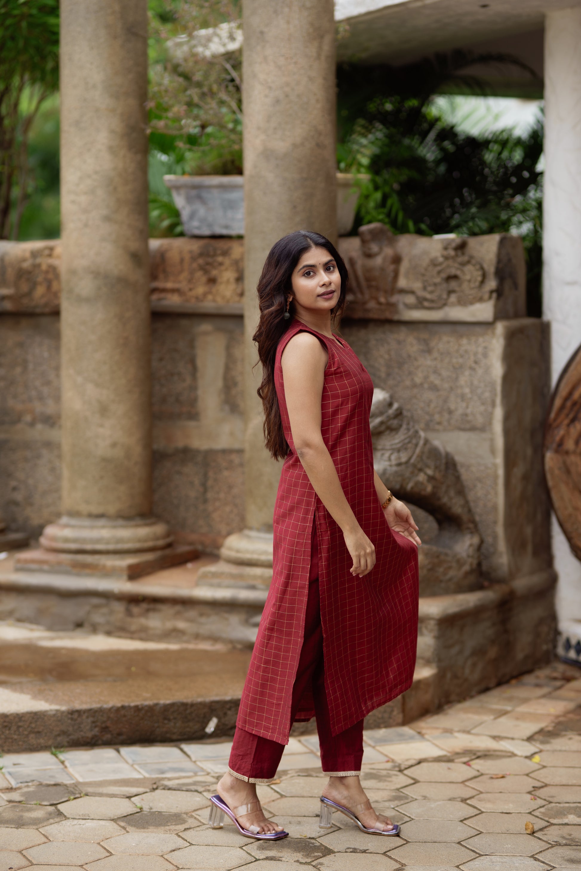 A beautiful maroon checkered kurta set in dupion silk, paired with matching pants. The sleeveless kurta features a classic grid weave design with a subtle V-slit neckline, and pants detailed at the hem. Adding a delicate contrast is the soft blush pink organza dupatta, highlighted with dainty gold buttas and a shimmering zari border. Ideal for festive gatherings, this set combines the richness of silk with the lightness of organza.