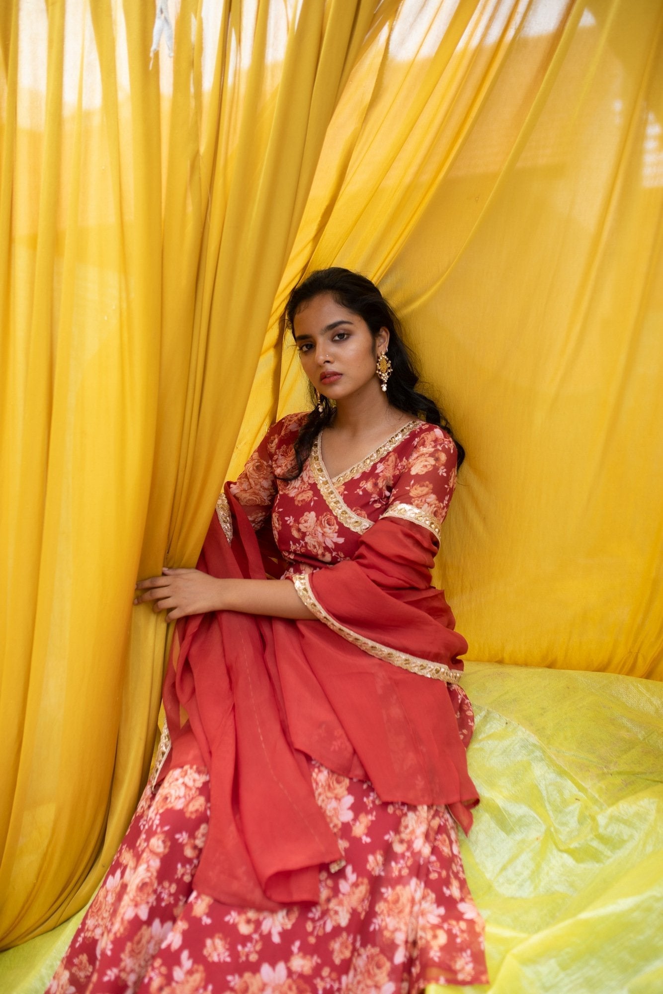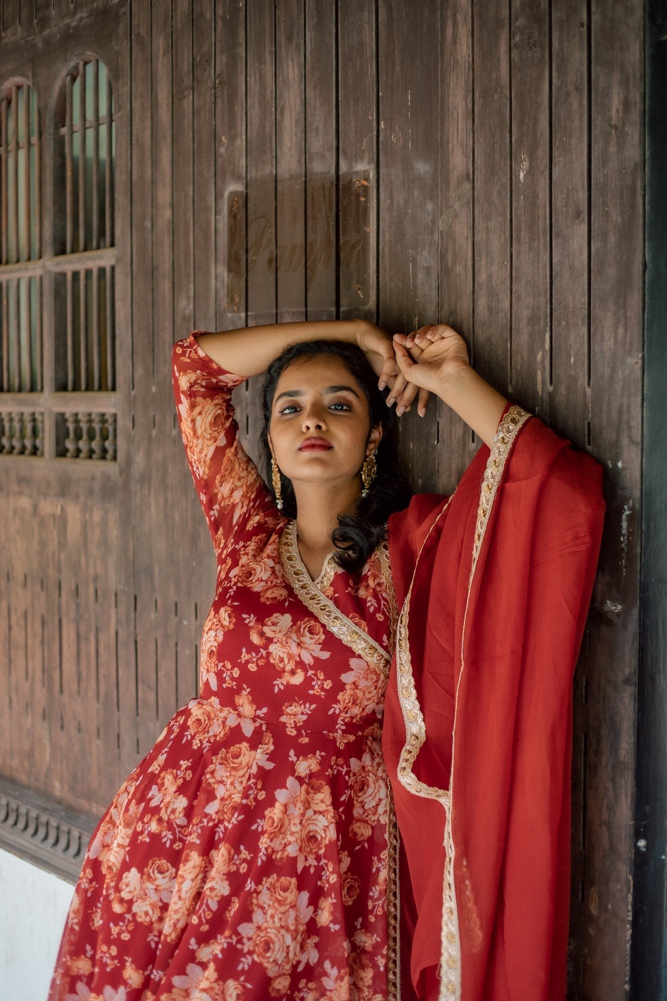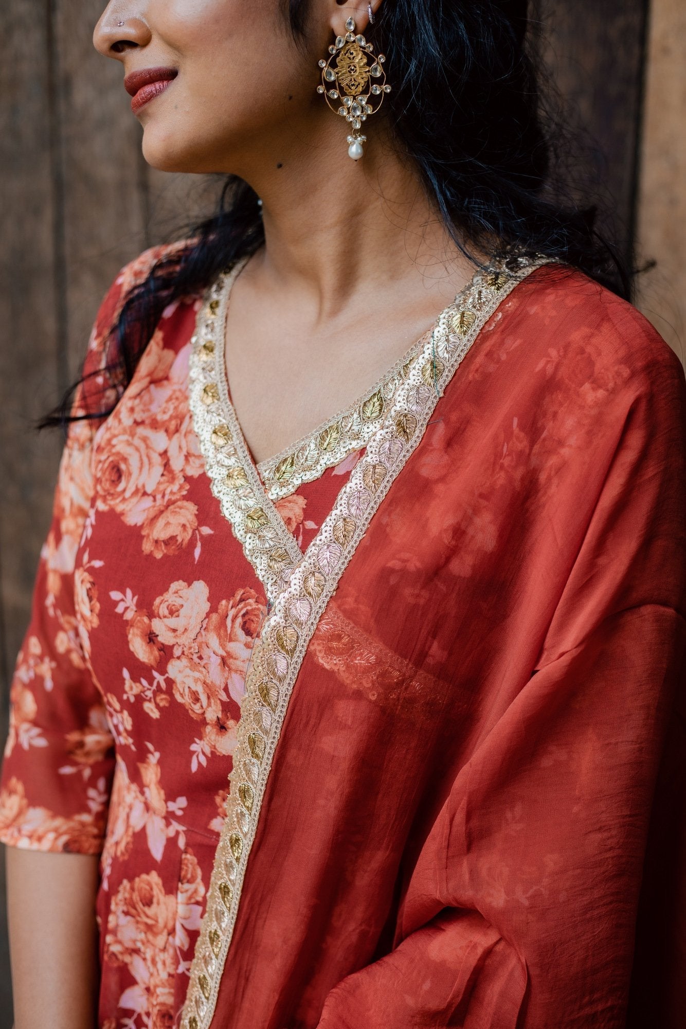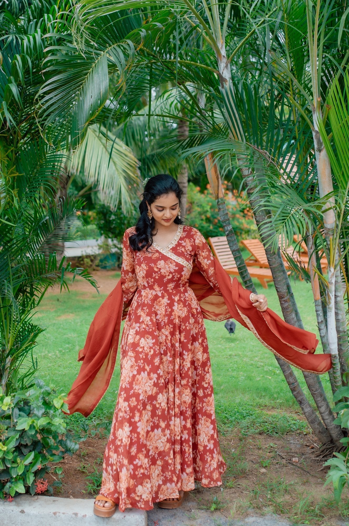 Pretty floral georgette fit-and-flare dress in brick red with gold lace detail along the angrakha neckline. A throw-on-and-go outfit that can be styled up or down. Comes with a matching organza dupatta with gold lace for a complete look. Lining provided.